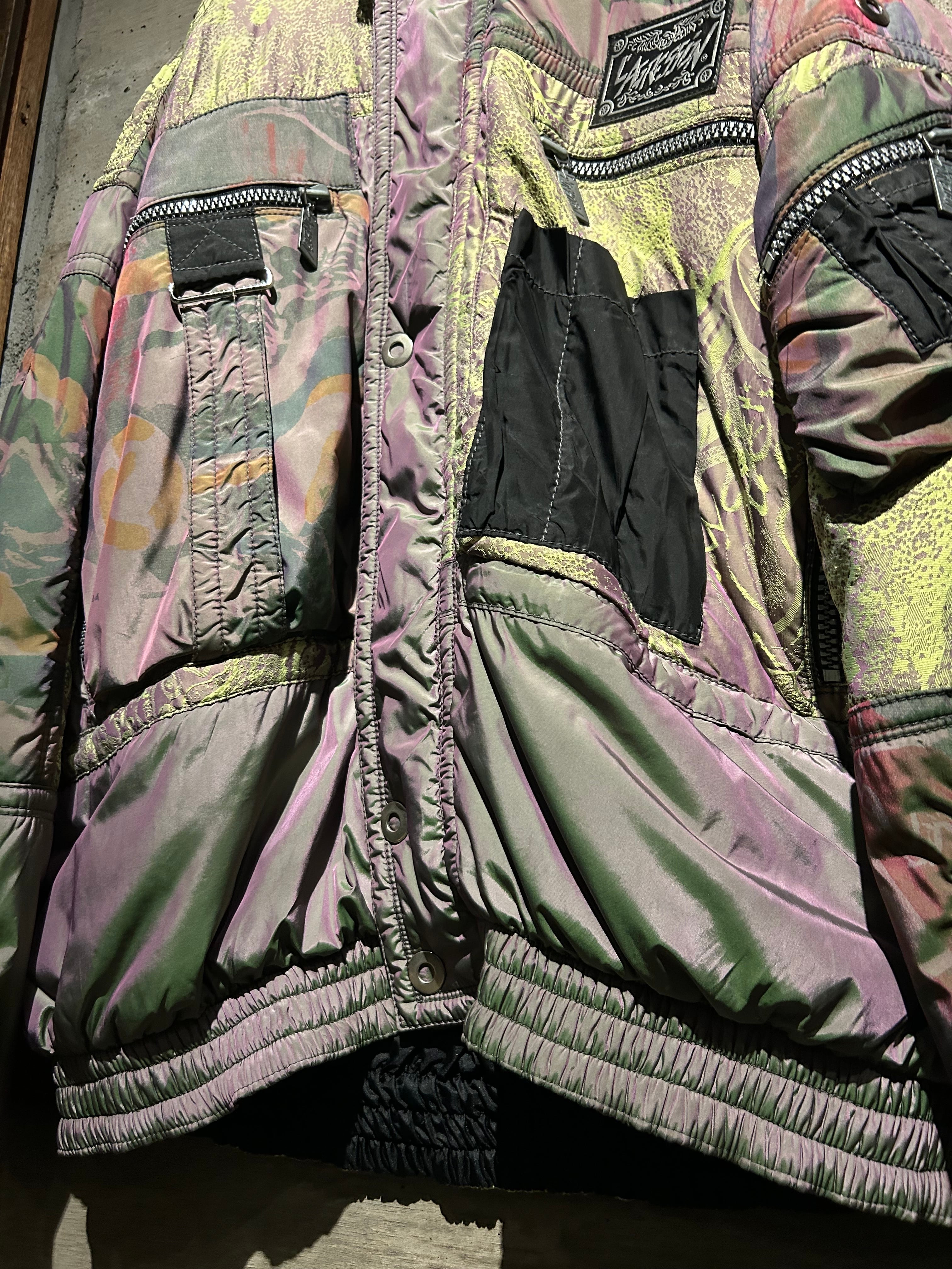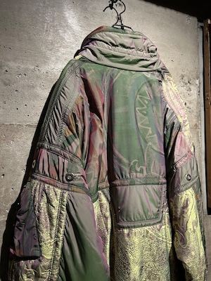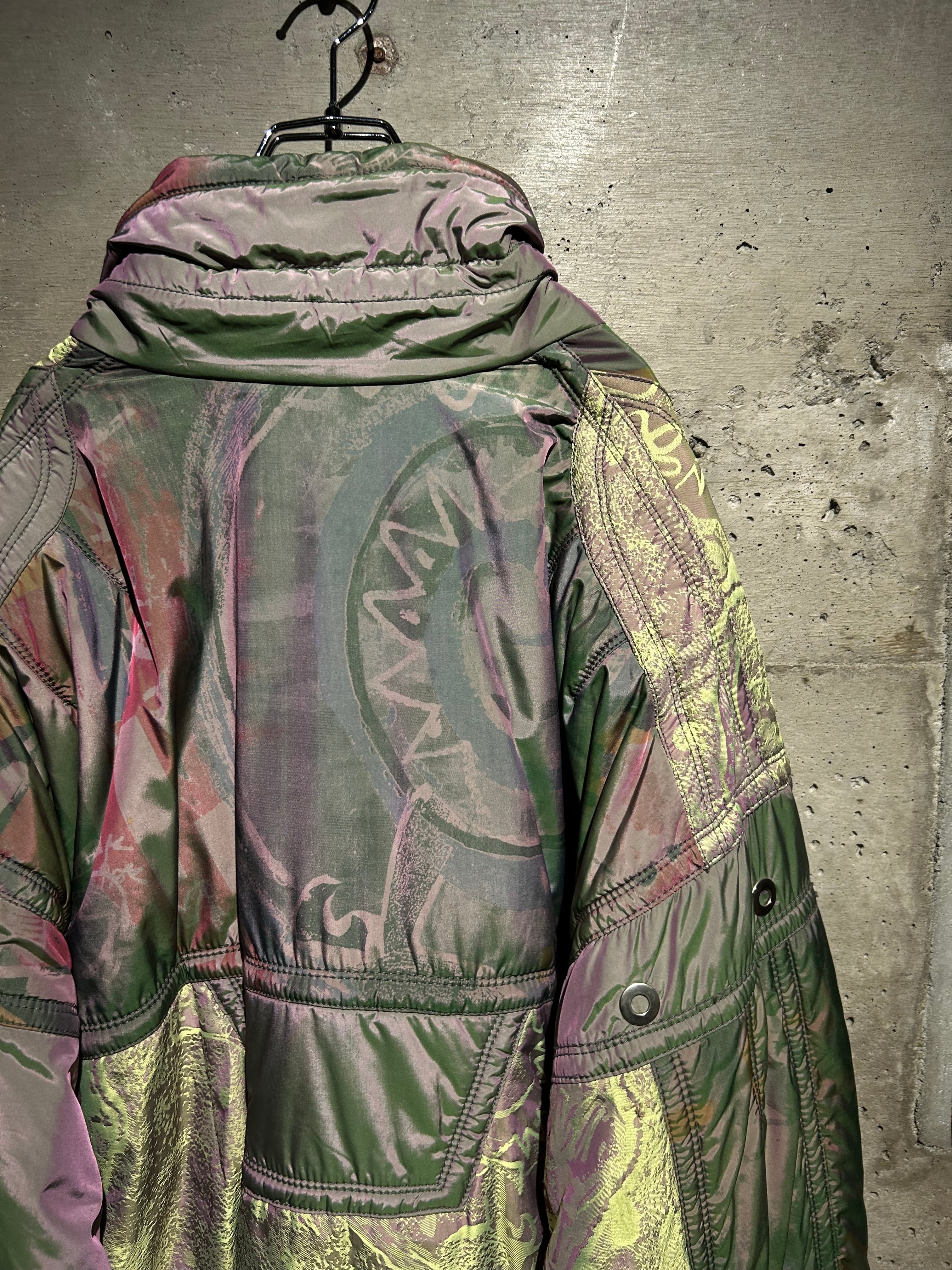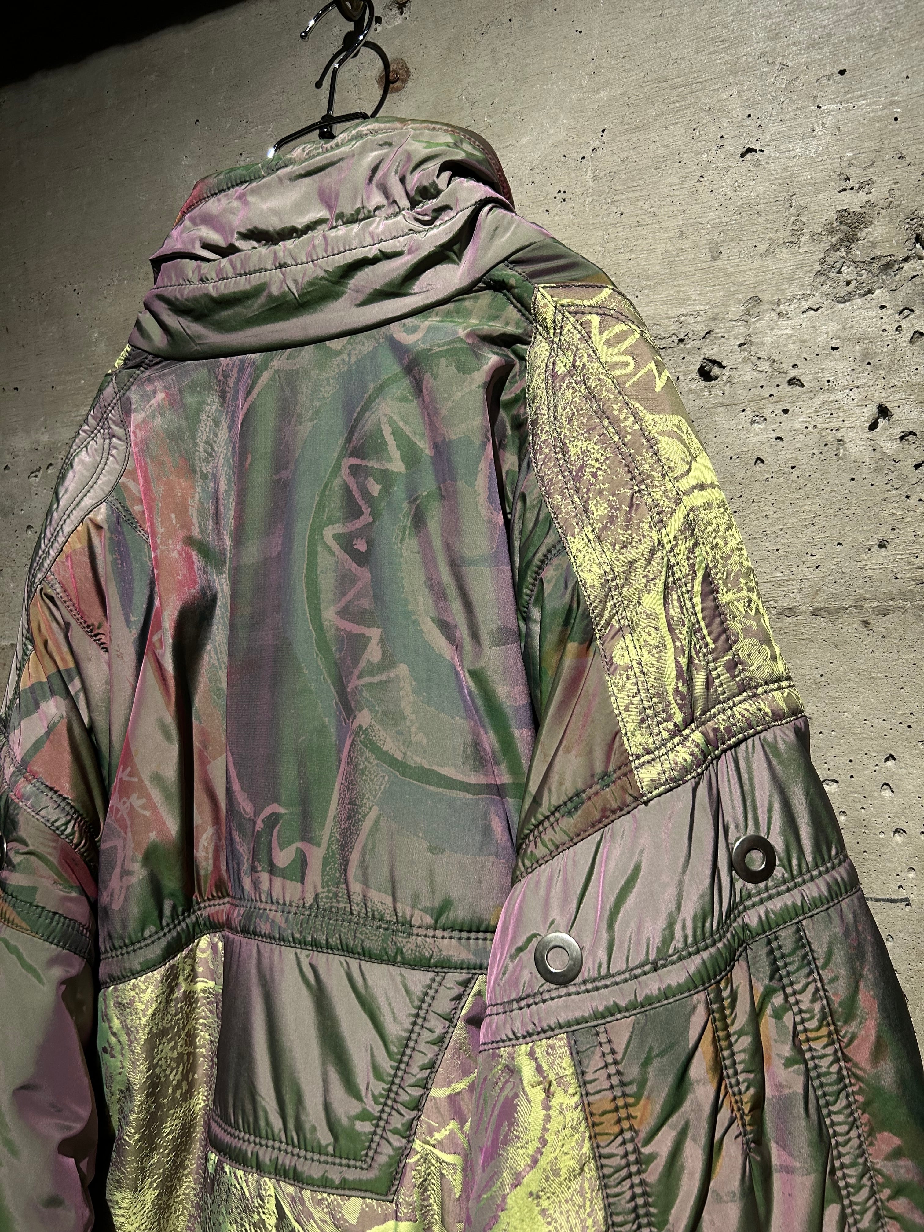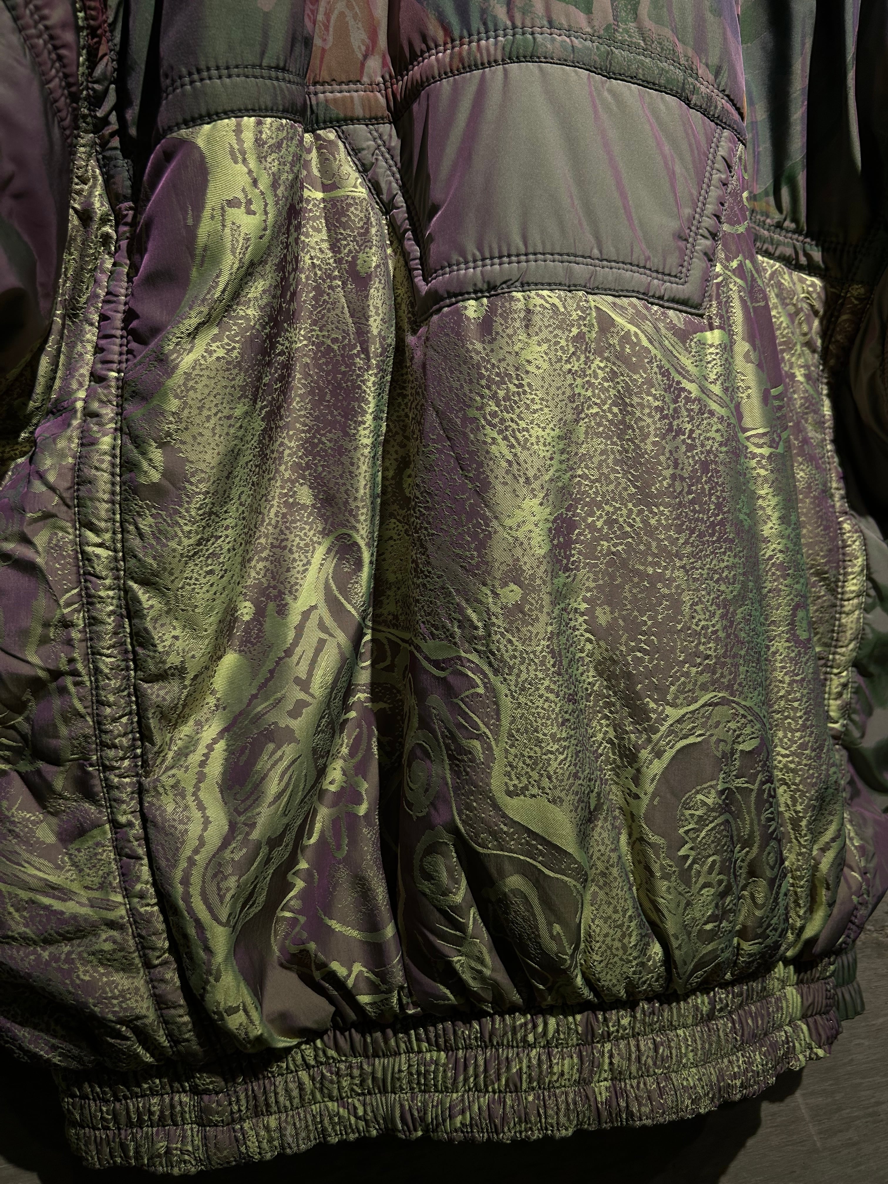 パープル、グリーン、イエローが角度によって滑らかに移ろい行く妖しい光沢に、ボディの抽象柄も相まって、唯一無二のデザイン性と抜群の存在感を見せる1着。