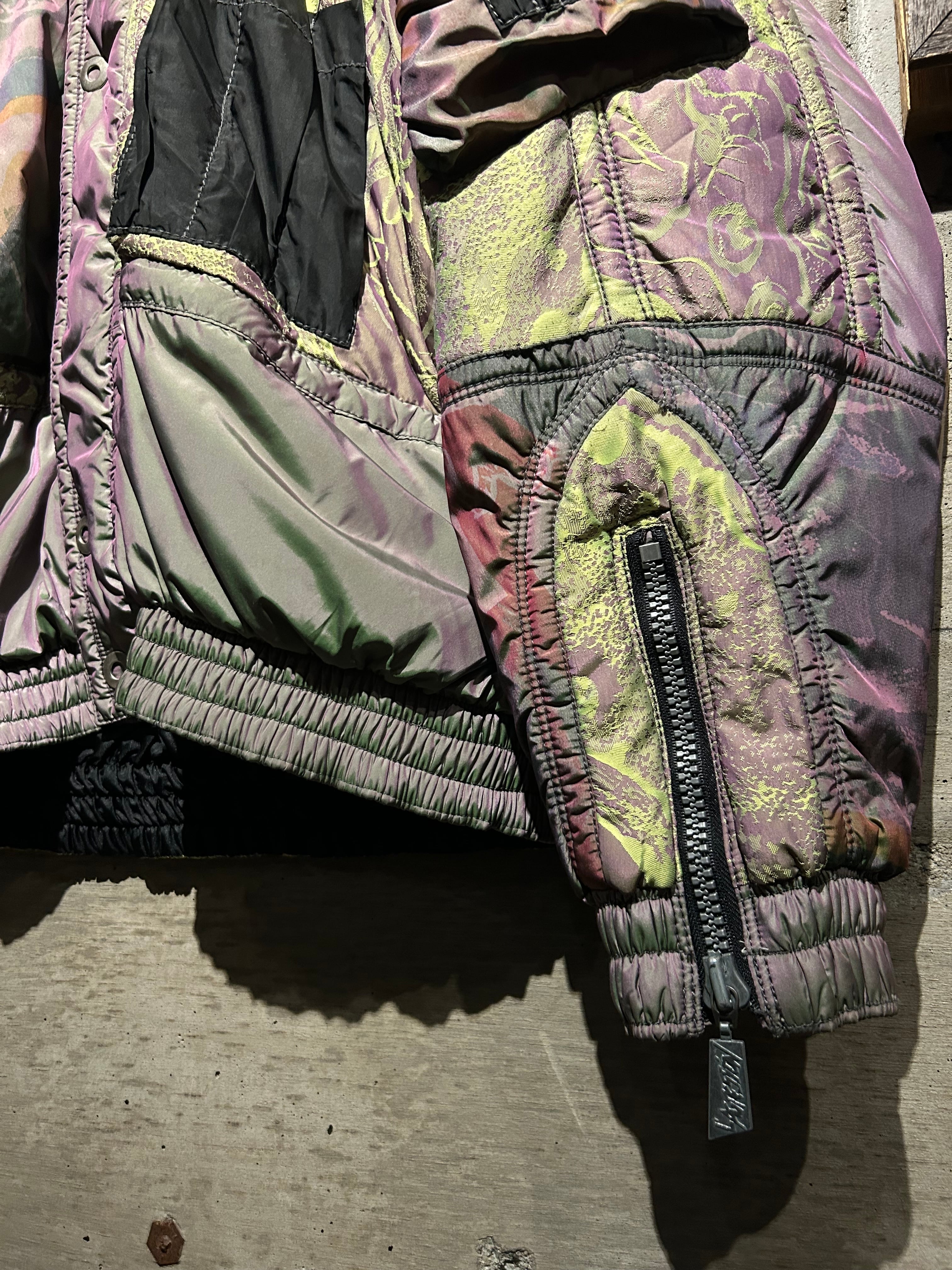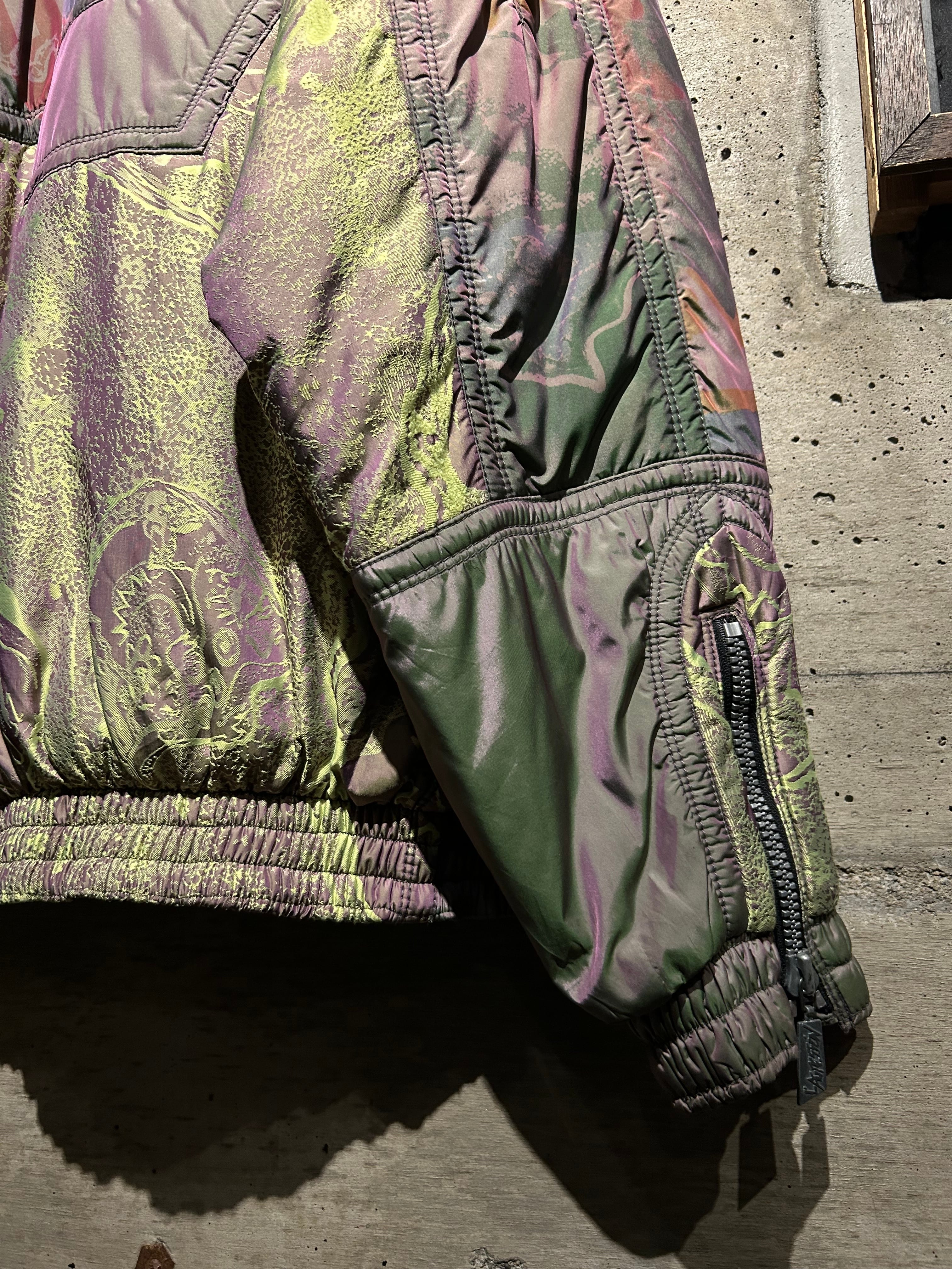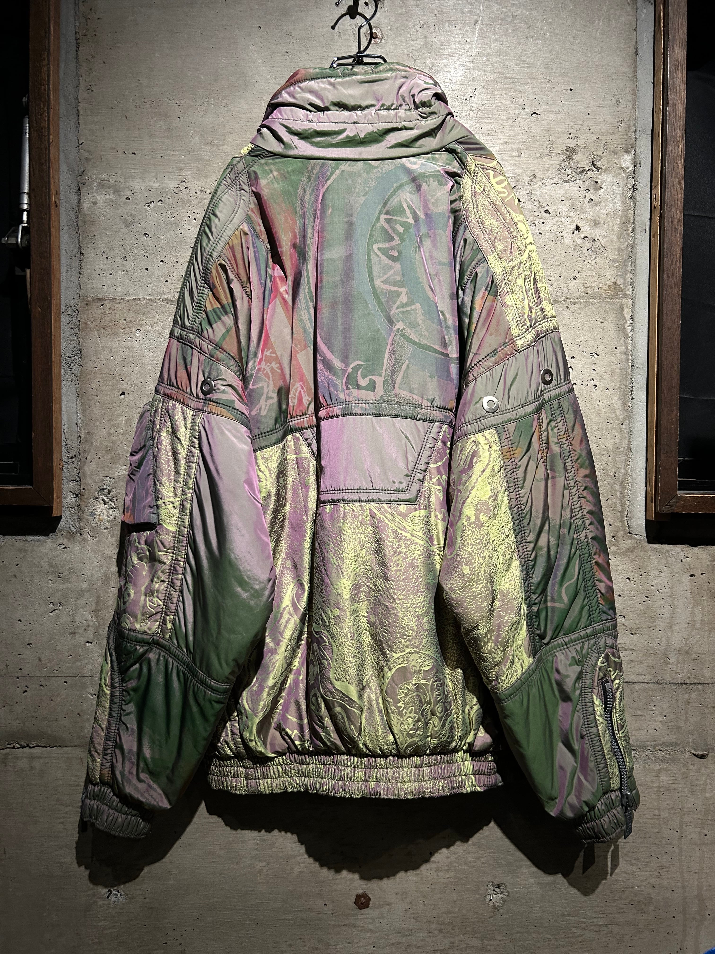 パープル、グリーン、イエローが角度によって滑らかに移ろい行く妖しい光沢に、ボディの抽象柄も相まって、唯一無二のデザイン性と抜群の存在感を見せる1着。