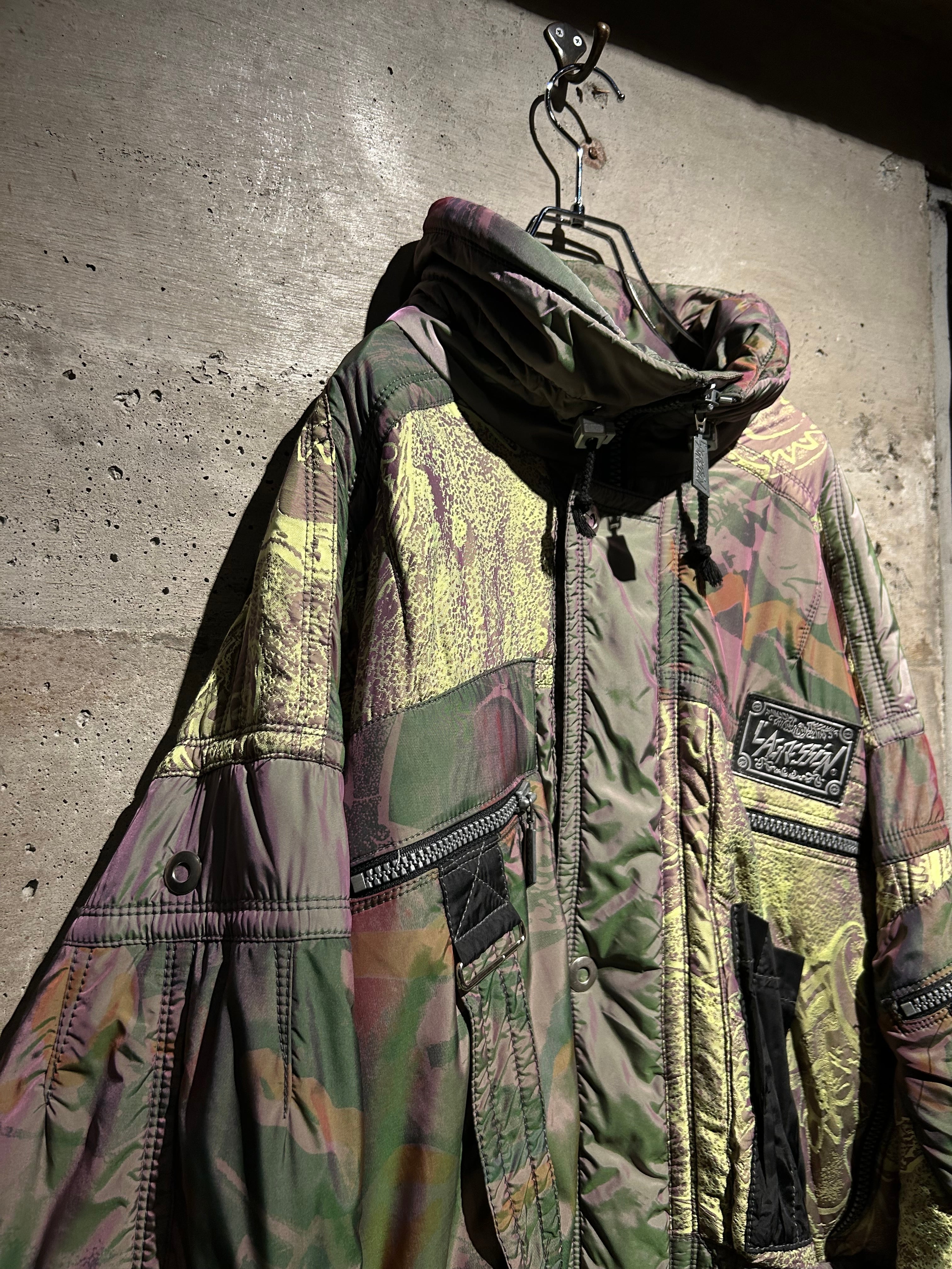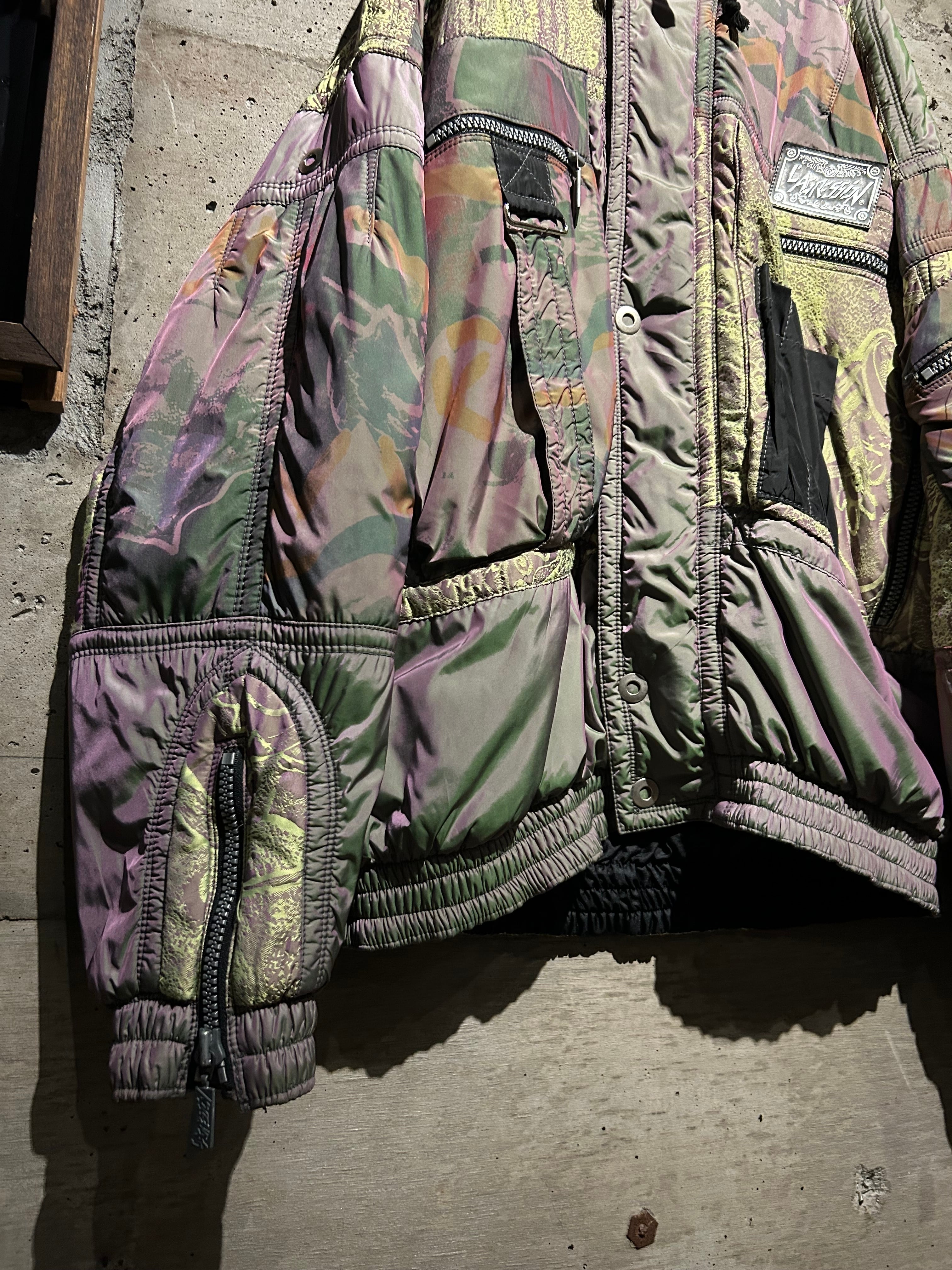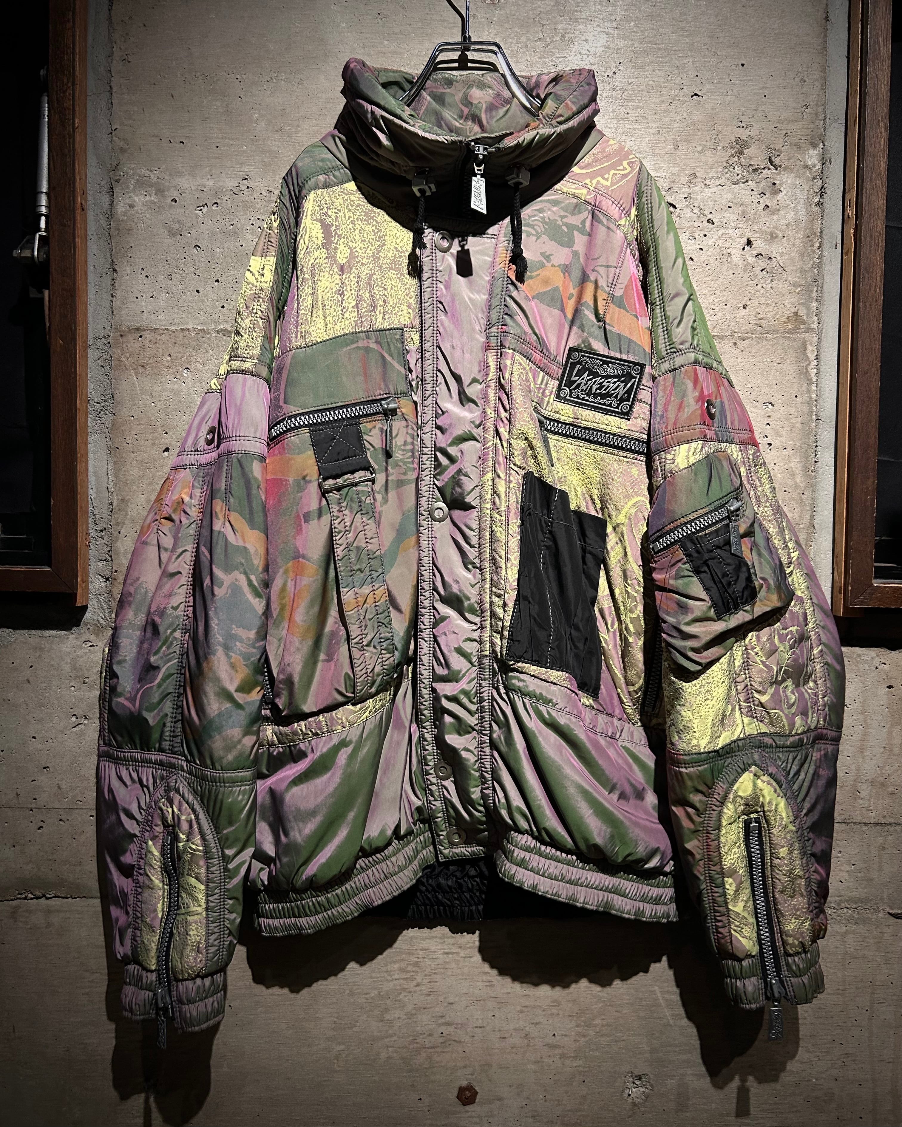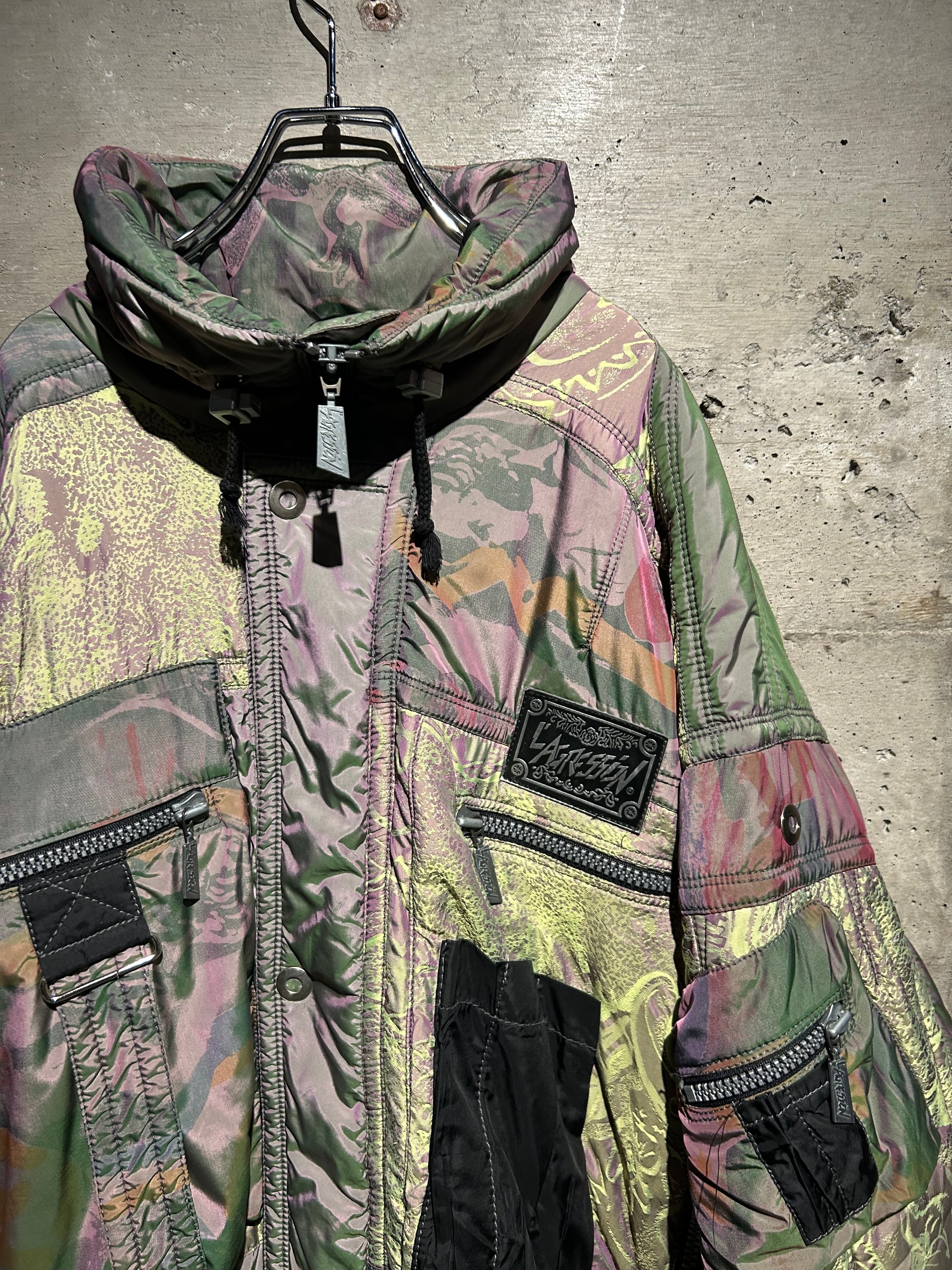 パープル、グリーン、イエローが角度によって滑らかに移ろい行く妖しい光沢に、ボディの抽象柄も相まって、唯一無二のデザイン性と抜群の存在感を見せる1着。