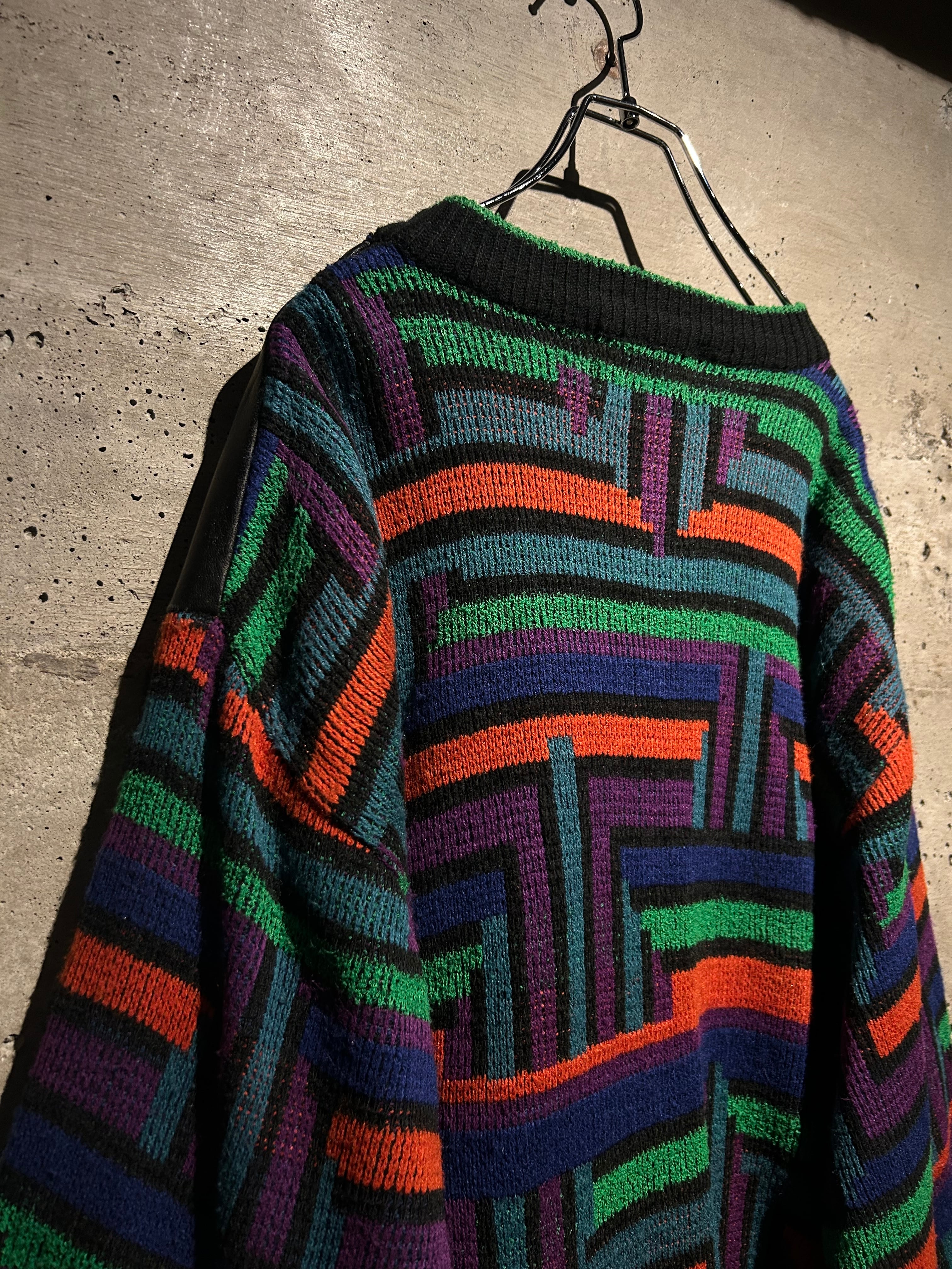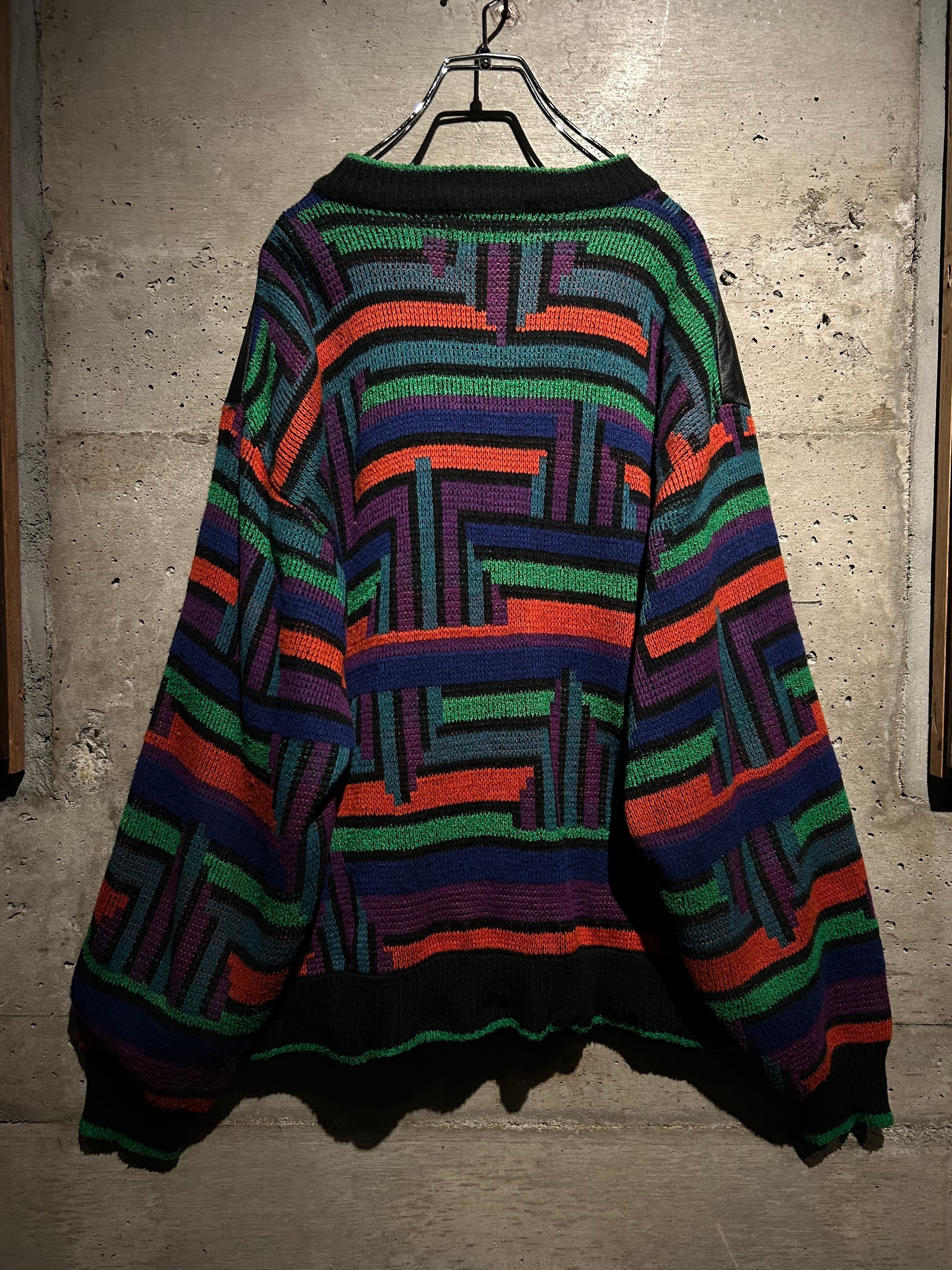 赤、緑、紫、青などのマルチなカラーリングで幾何学柄を表現したニットのボディに、鈍い光沢を帯びた柔らかなスムースレザーと、しっとりとしたスエードレザーの2種のレザーを贅沢に切り替えた逸品。