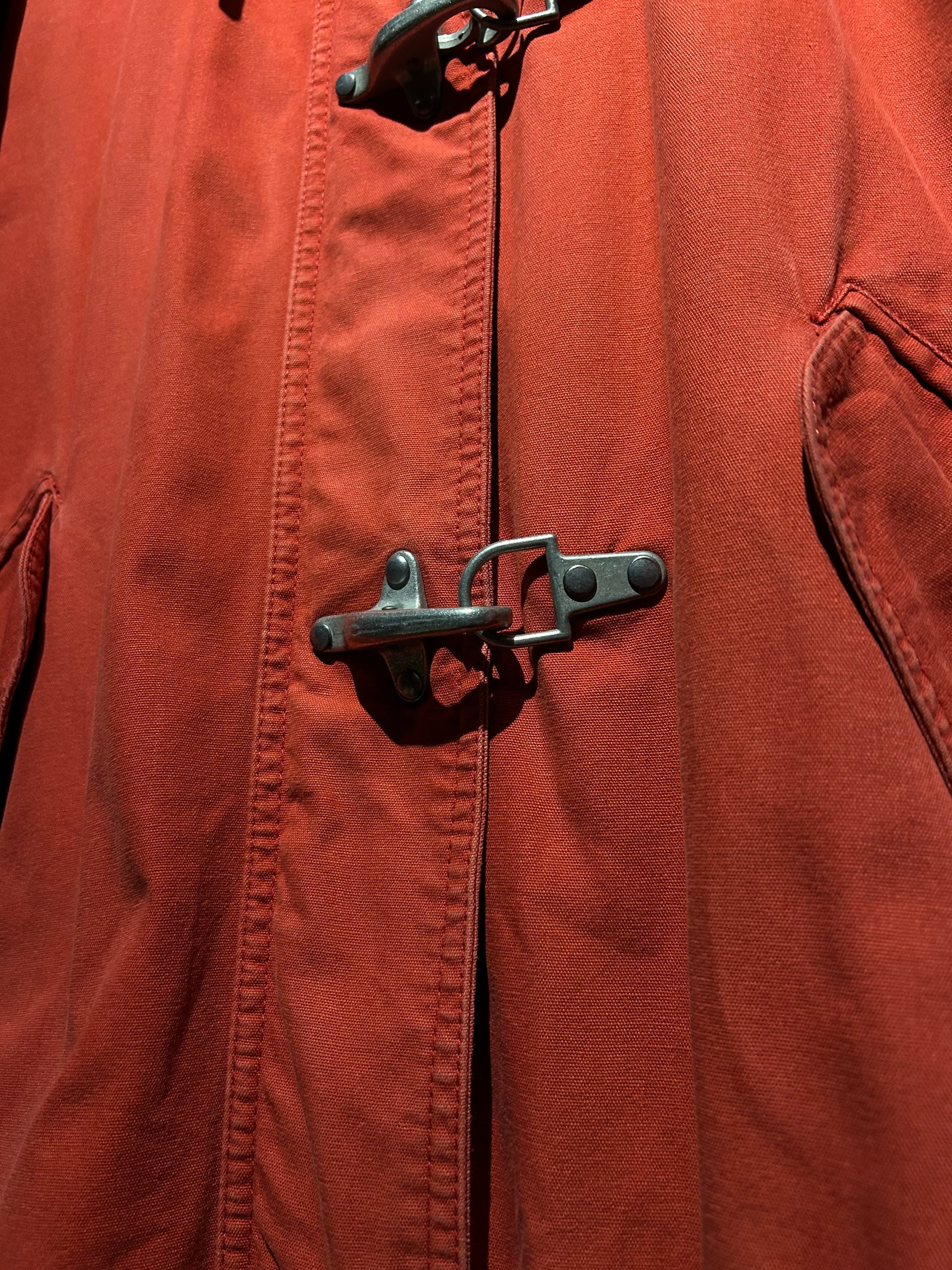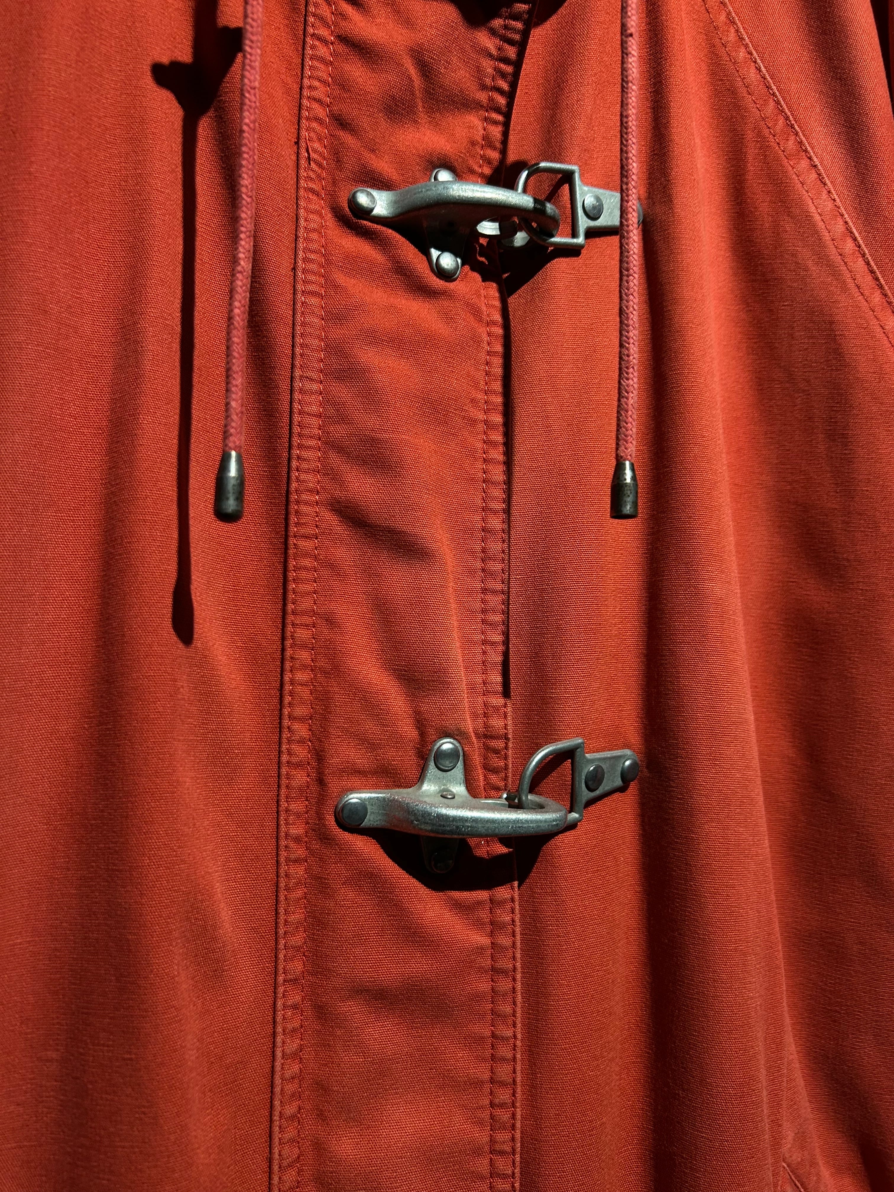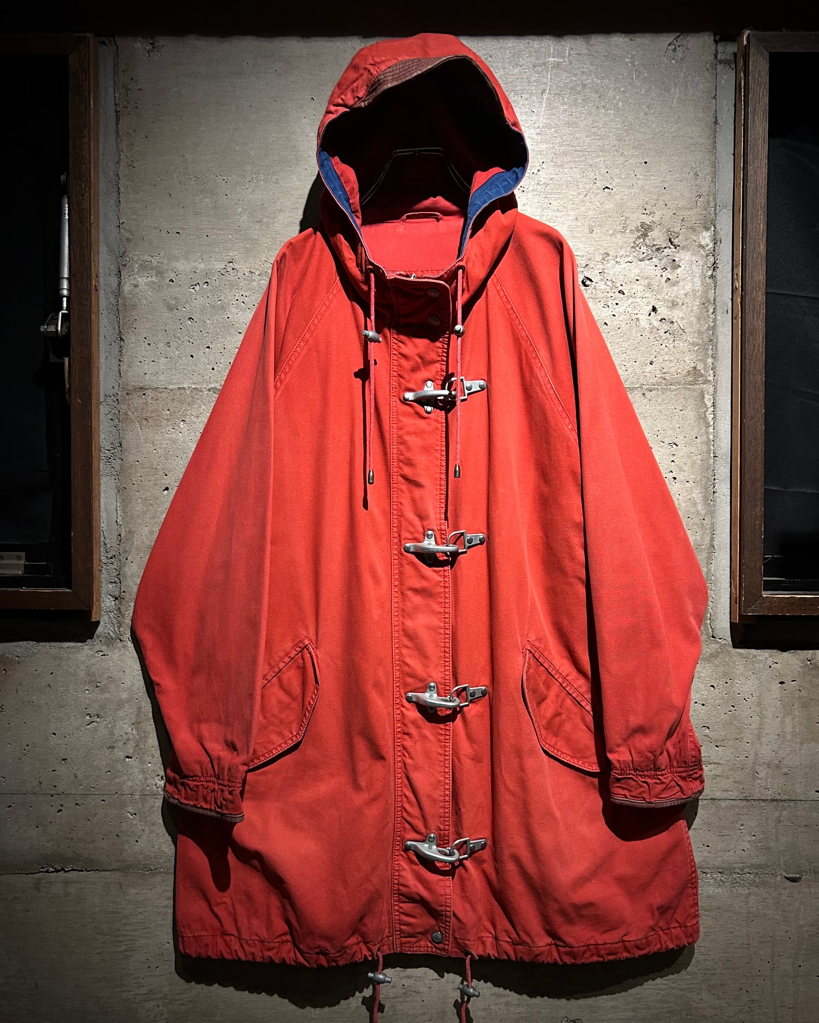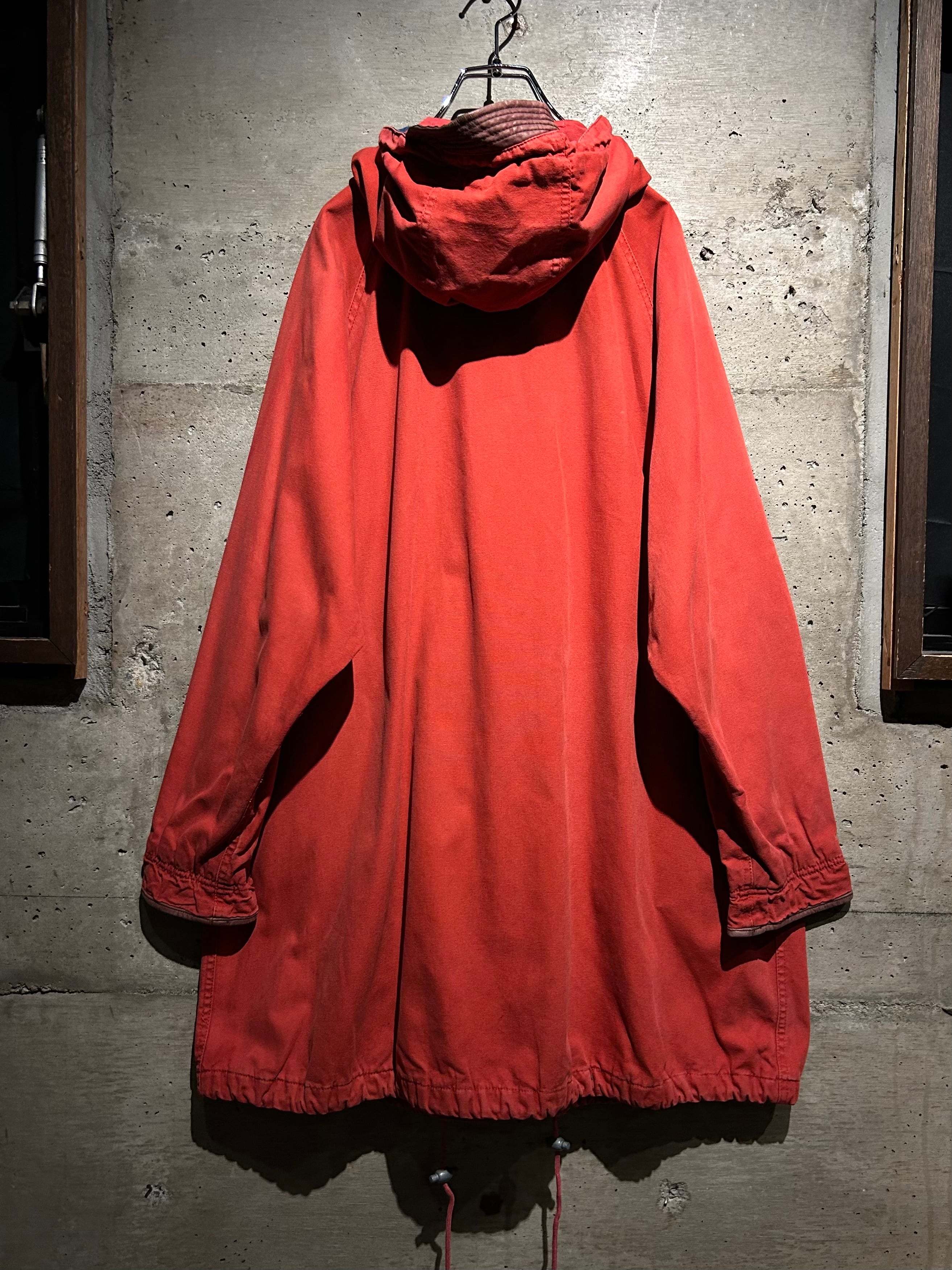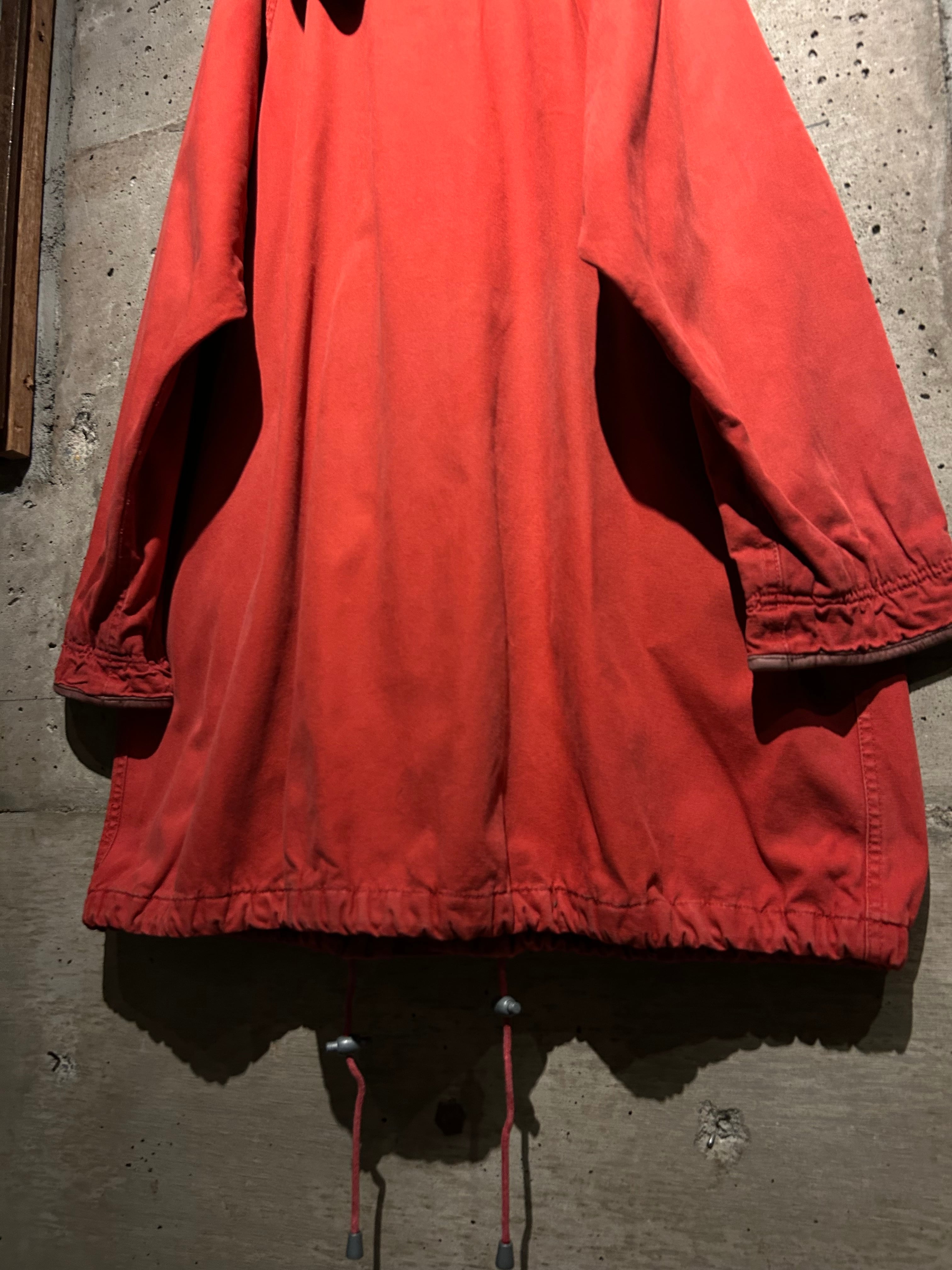 鮮やかなレッドボディに、フード裏のブルーが効いた絶妙なカラーコントラストを演出。程よく着用を重ねた素材特有のムードが加わることで、USEDらしい温度感を纏った1着に育っています。