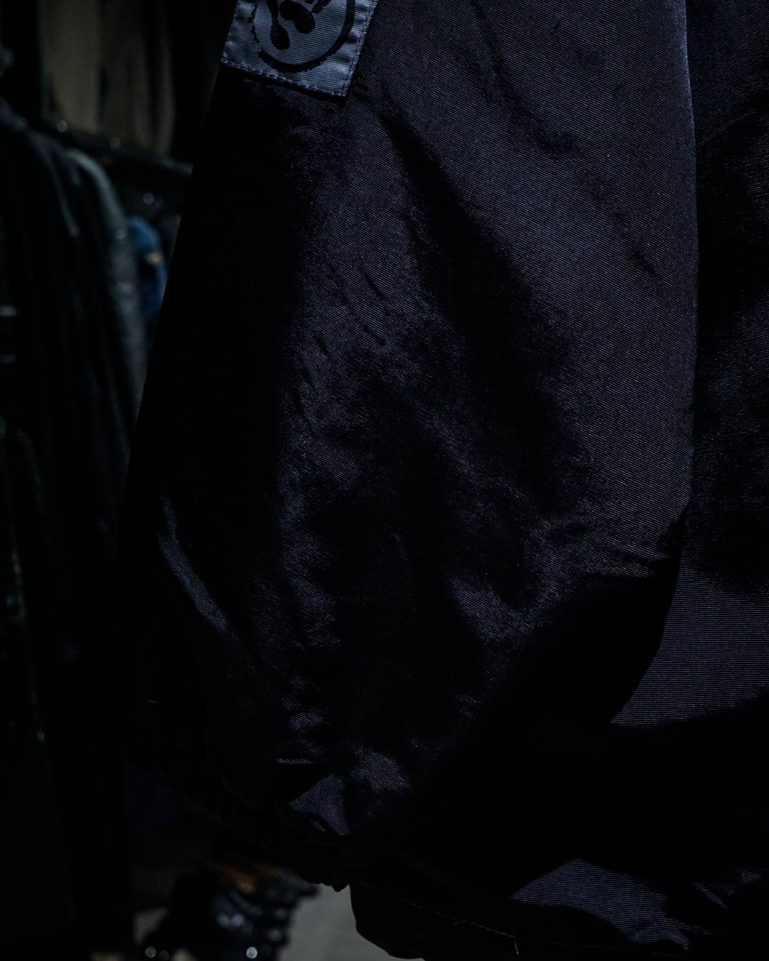 マットな質感のナイロンに、シルバーカラーのロゴを退廃的に削ったようなダメージ加工でオン。当時のレイブ/クラブシーンの空気をしっかり纏った、グラフィックのムードが最高◎