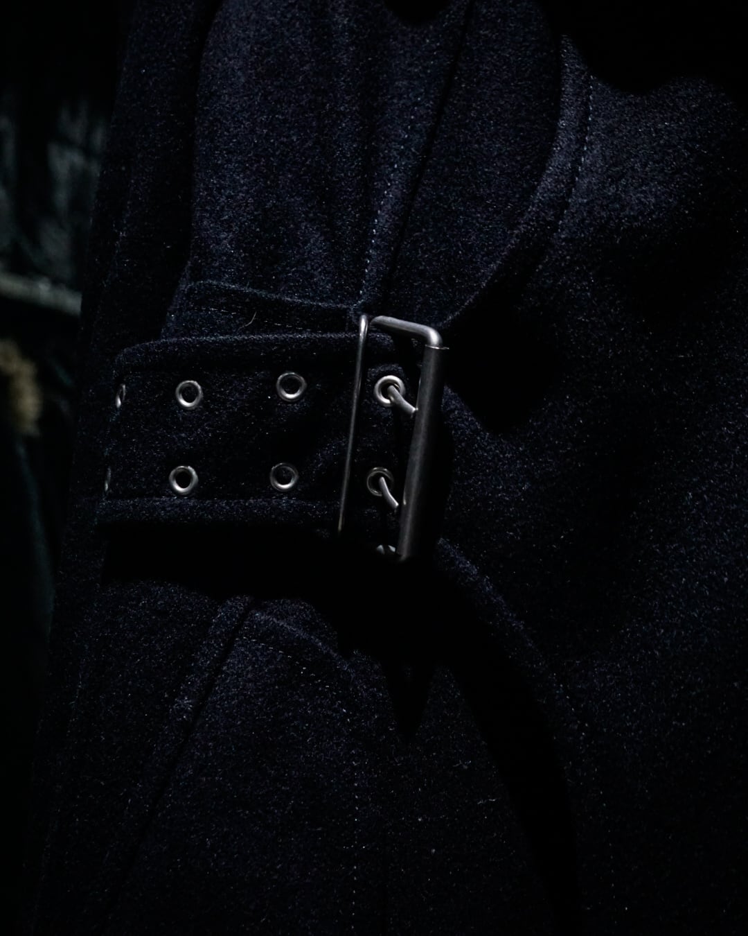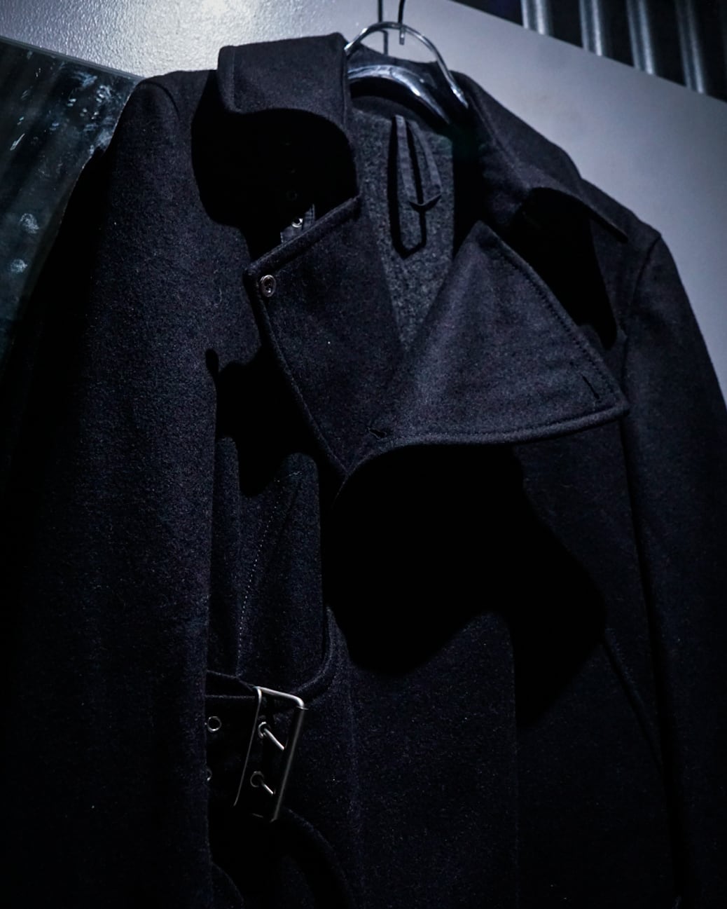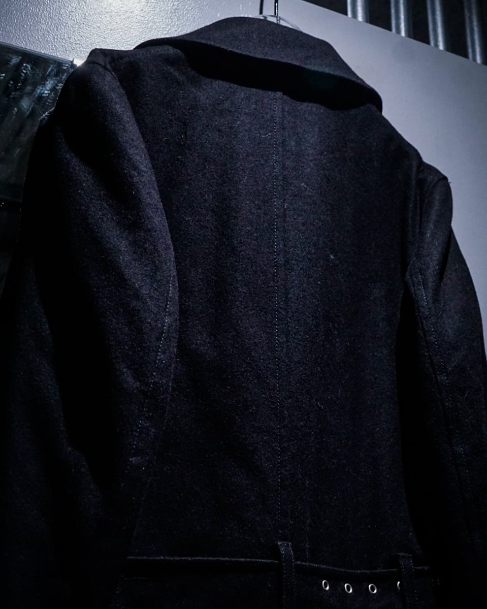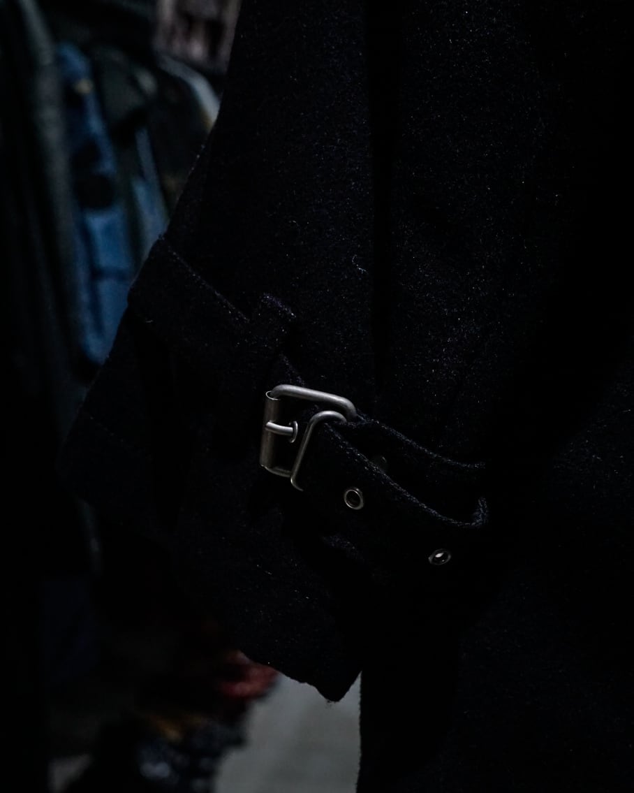 たっぷりとした身幅とロングレングスが描く落ち感のあるシルエットは、歩くたび揺れ、黒の深さと素材の重量がより立体的に際立ち、コーディネートの主役は確定。