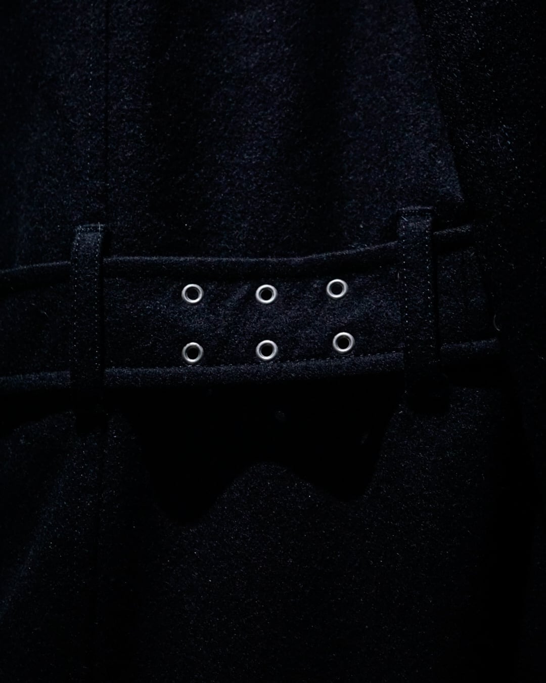 ベルトにはハトメを打ち込みデザインのアクセントに。留め方や垂らし方でムードを自在に変えられ、シルエットでも遊びを効かせられるかと。