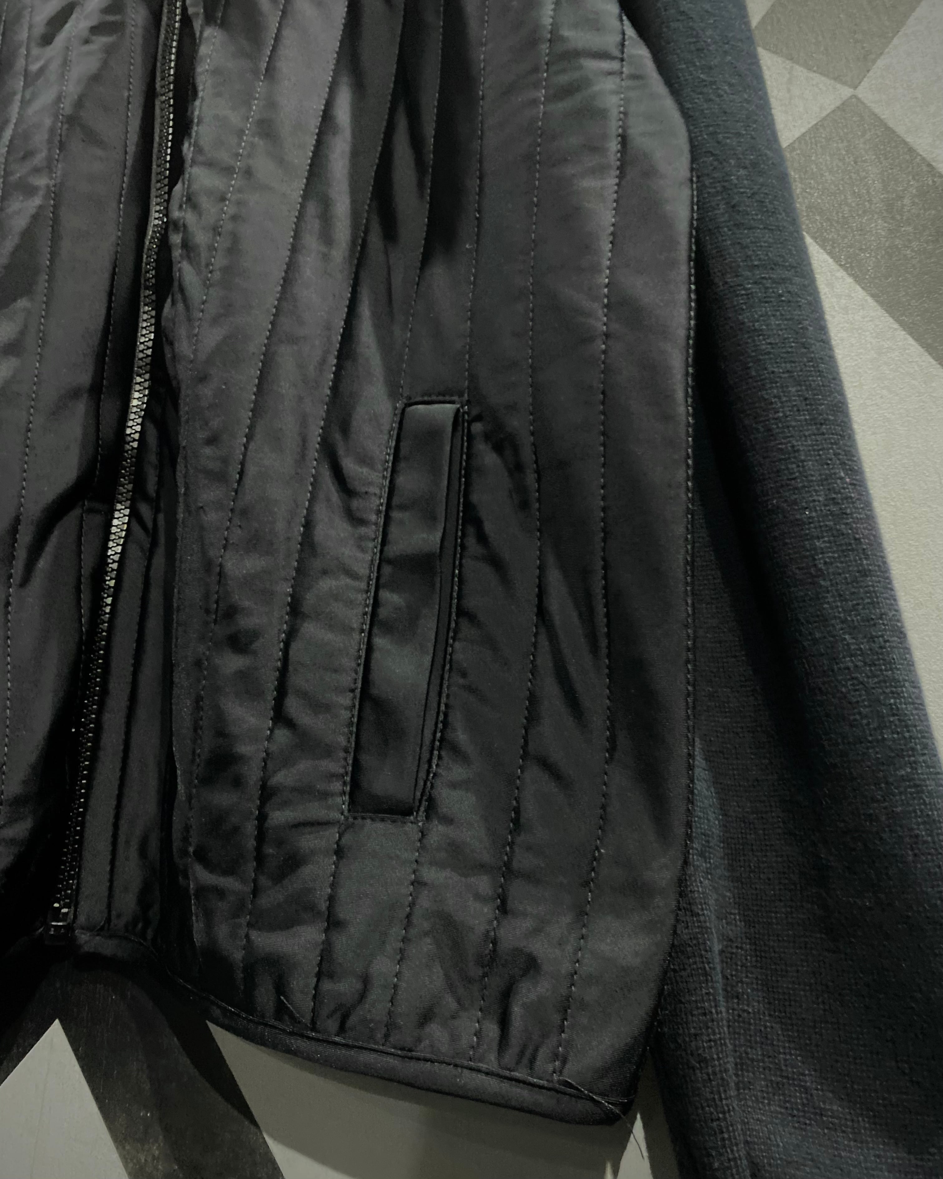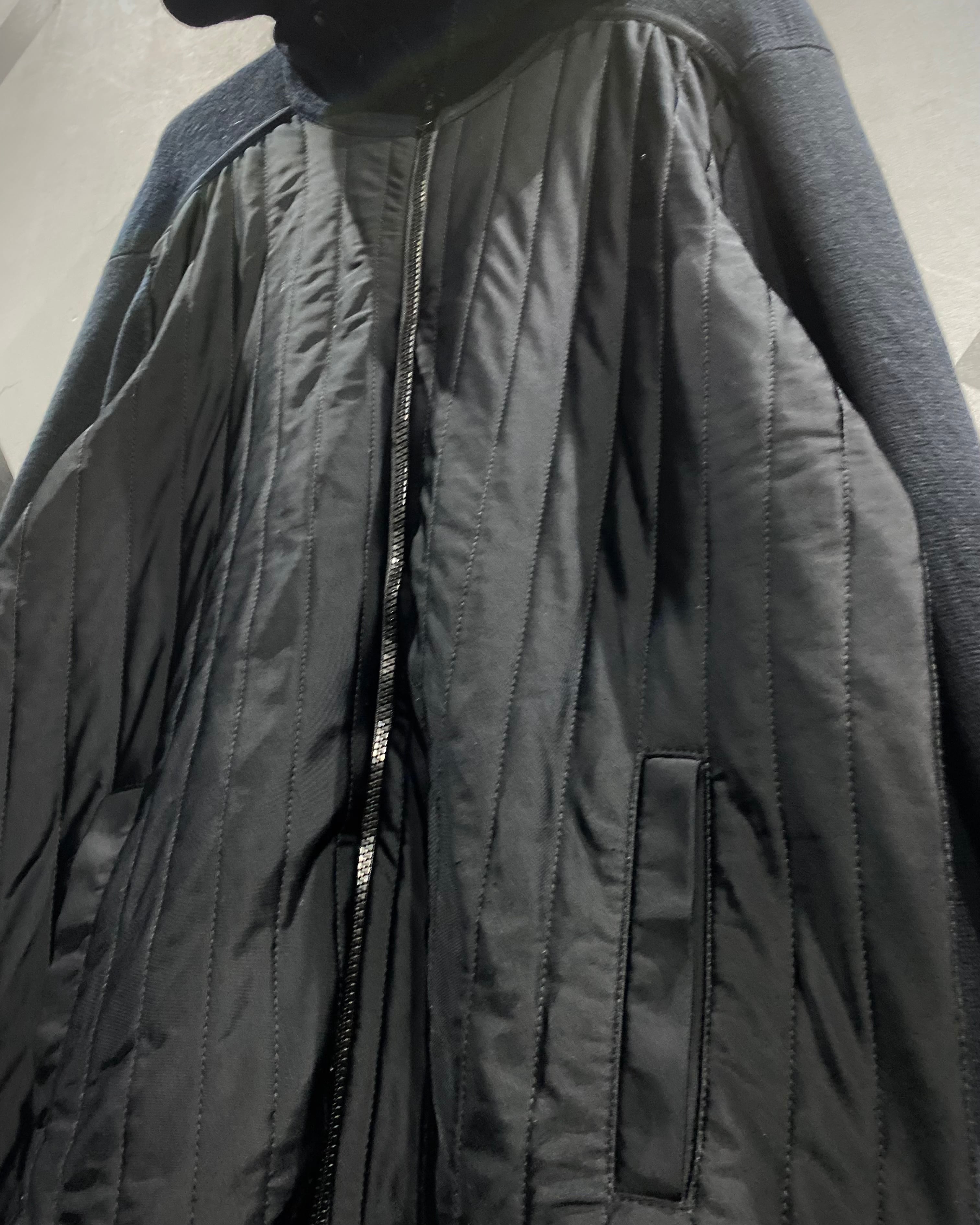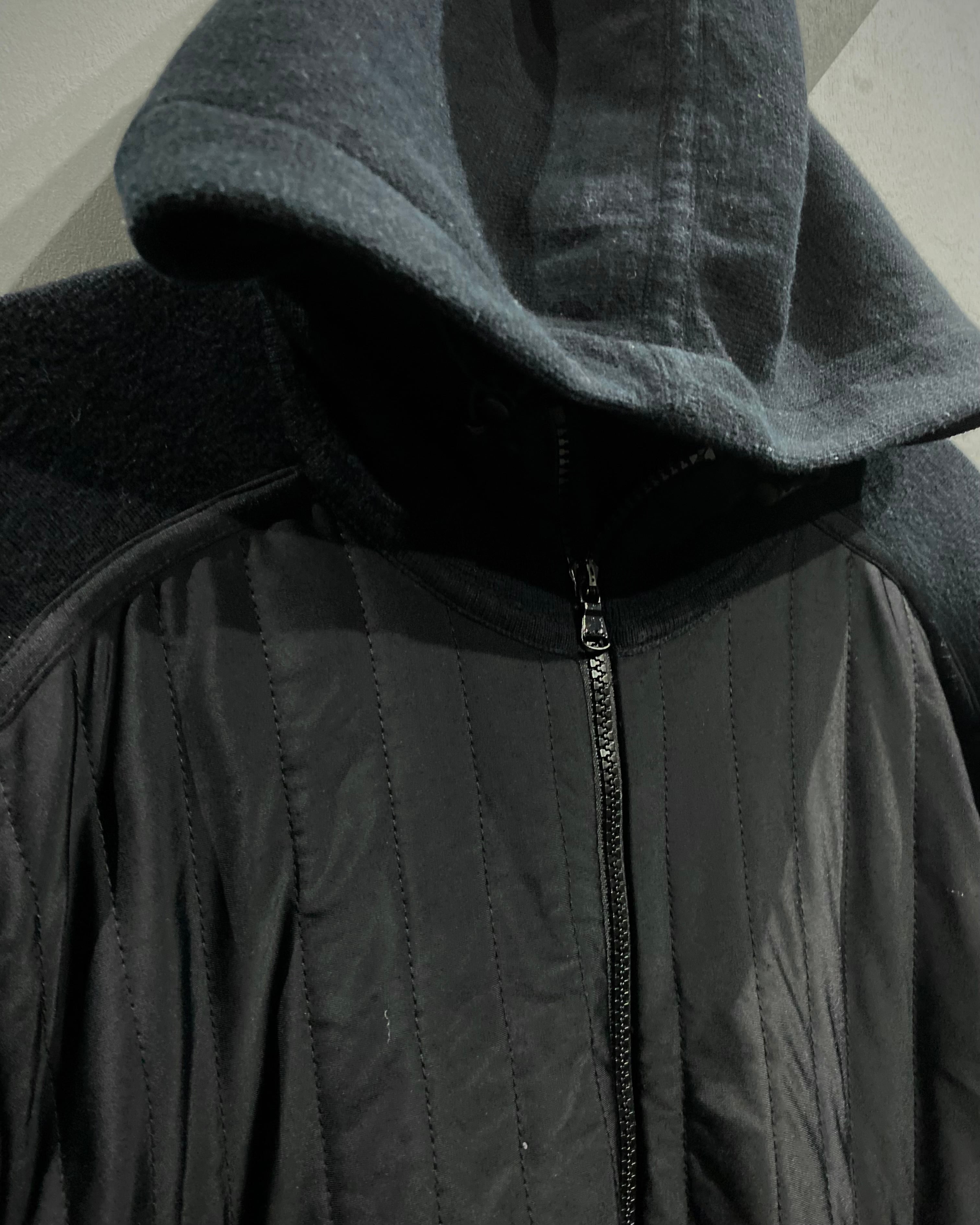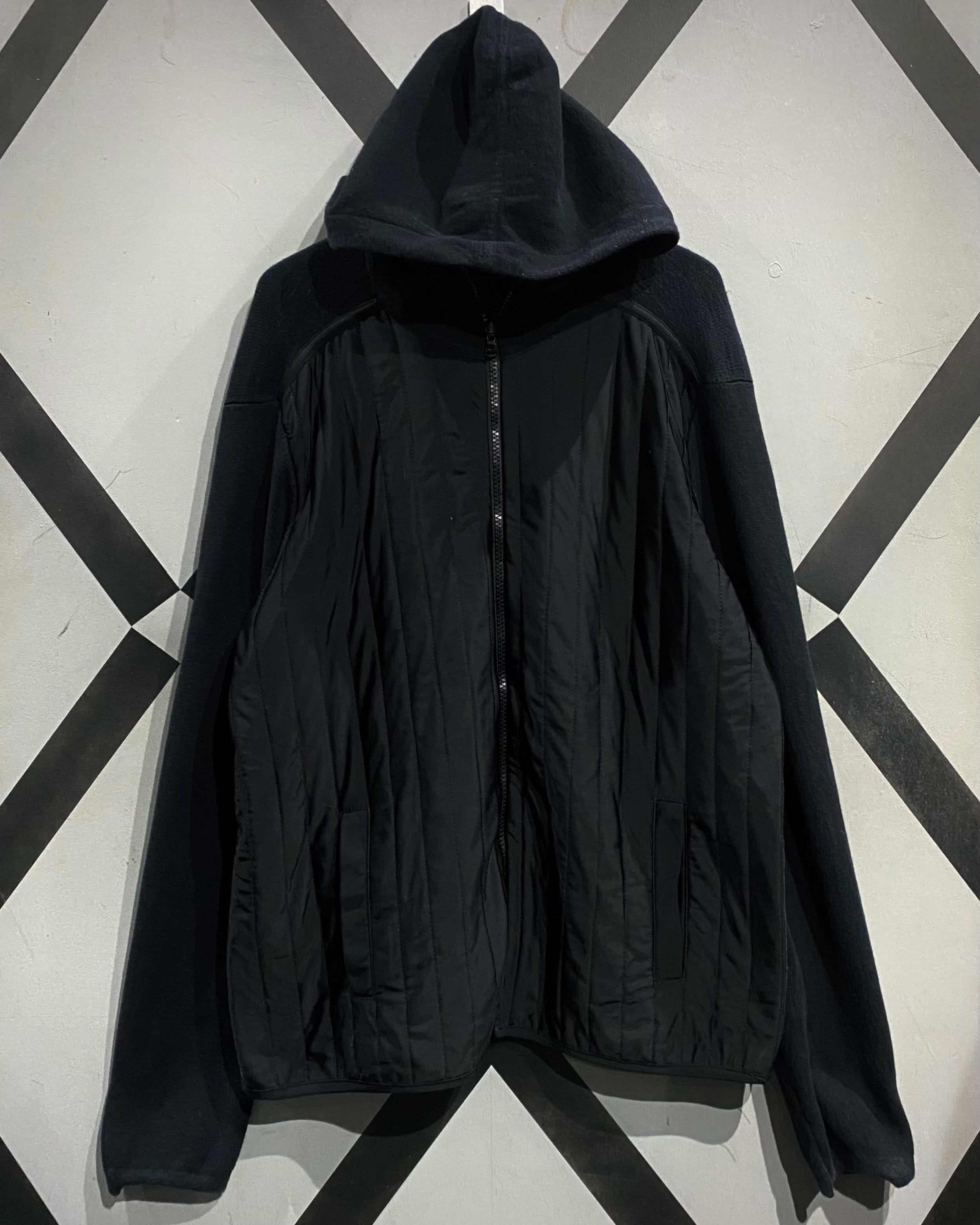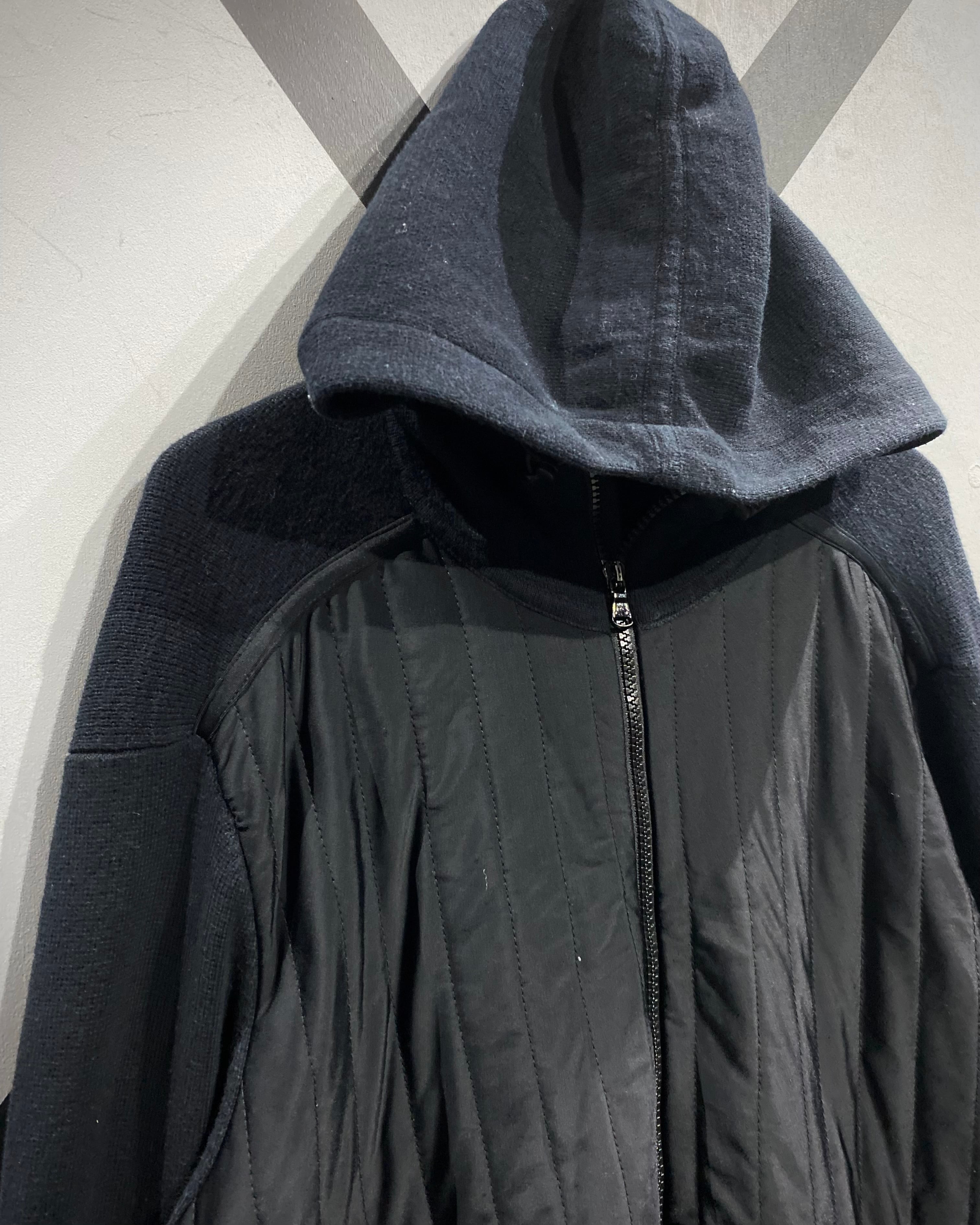 前身頃は軽量ナイロン×ステッチで立体感を作り、袖、フード、背面は柔らかなコットンニット。異素材のコントラストが抜群で、スポーティなのにどこかモードな雰囲気を漂わせています。