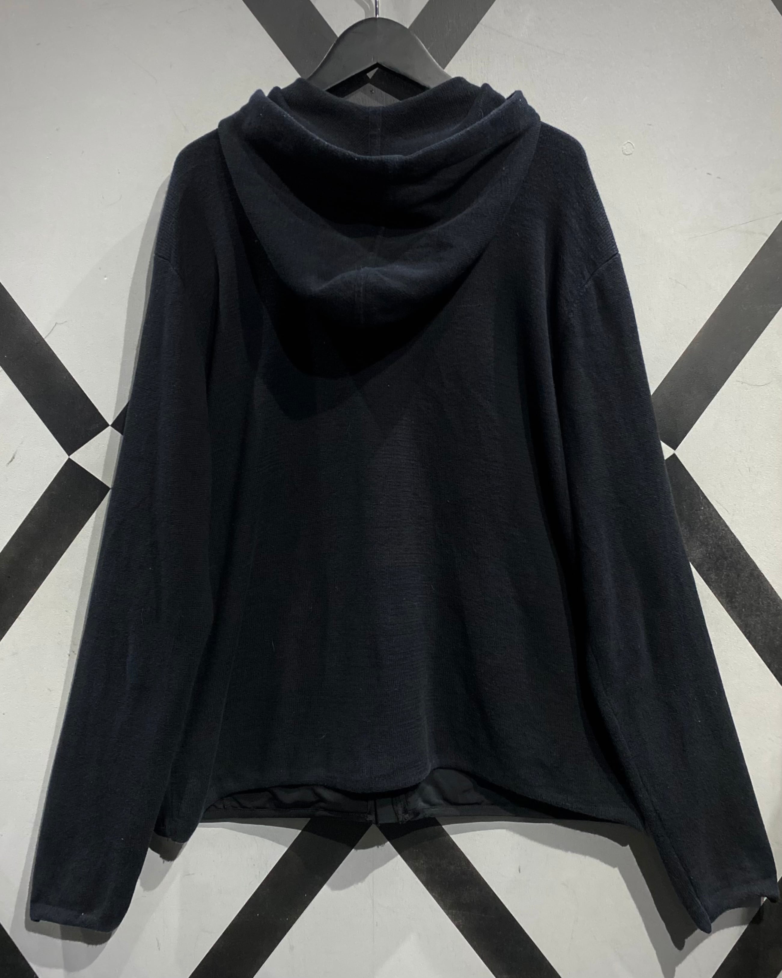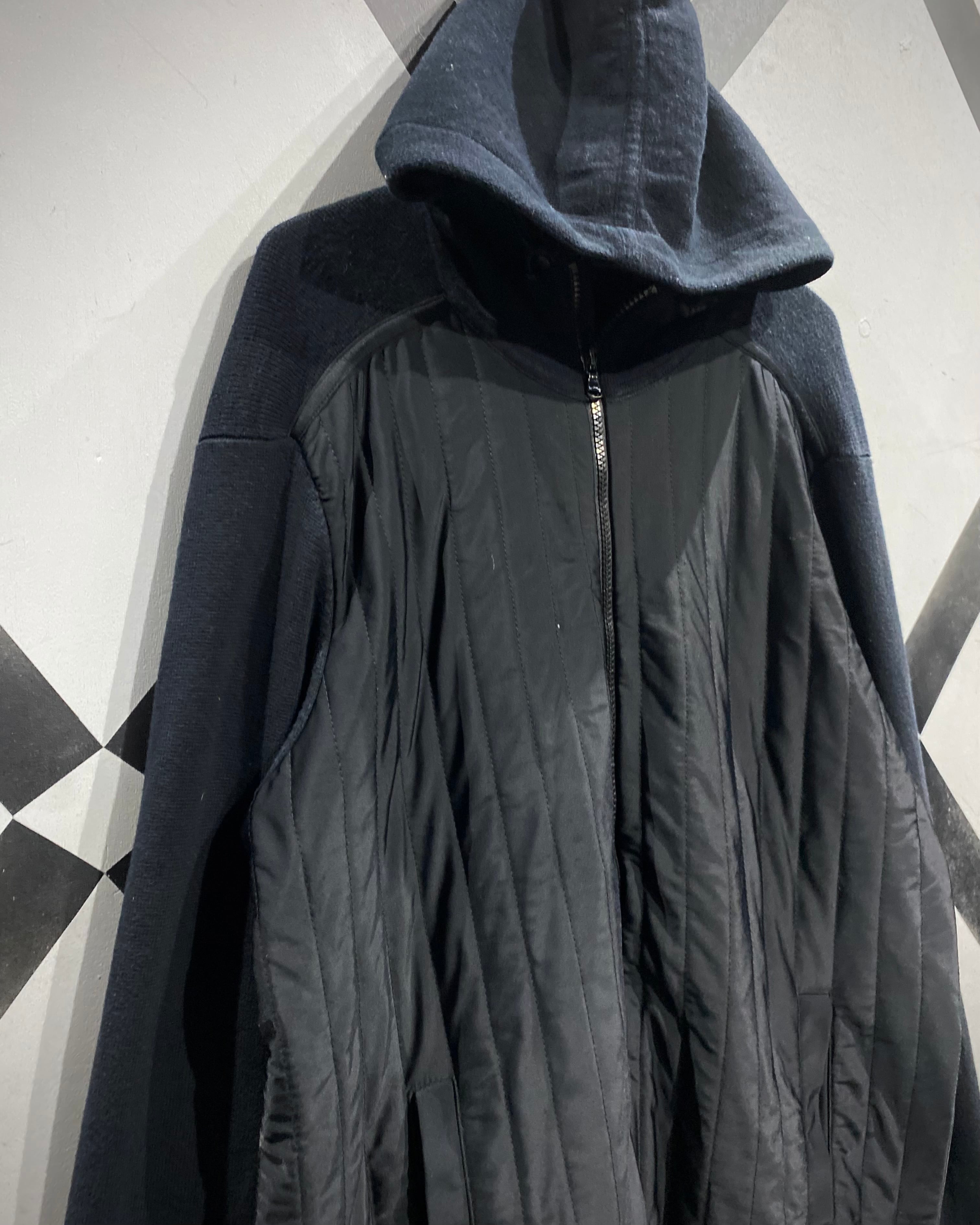 フロントにナイロンを切り替えたジップアップニットフーディ。