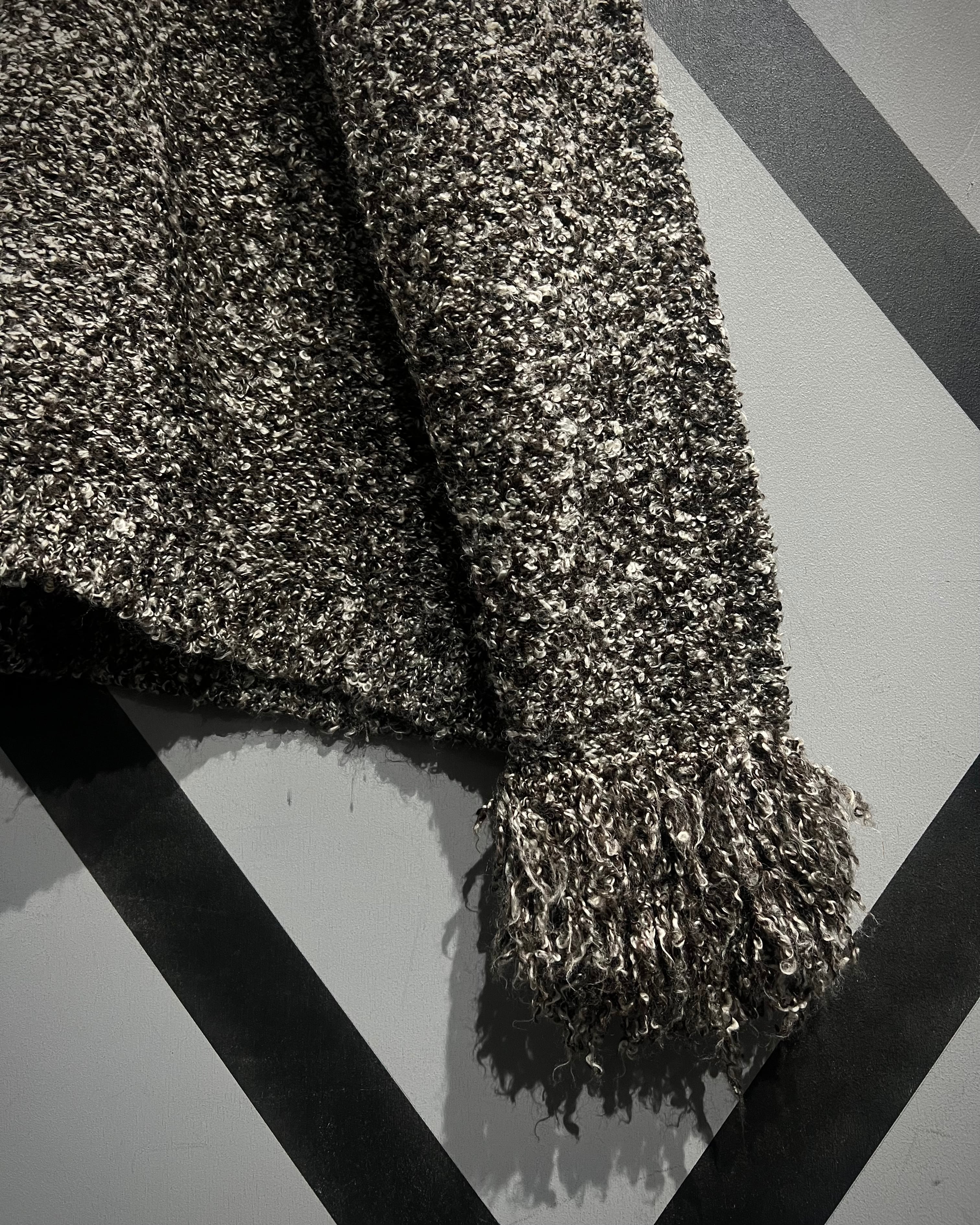 襟、袖口はフリンジ状にデザインが成され、パイル地とはまた異なった表情でシンプルながらデザインのアクセントに。フロントのマーブルのボタン使いも◎