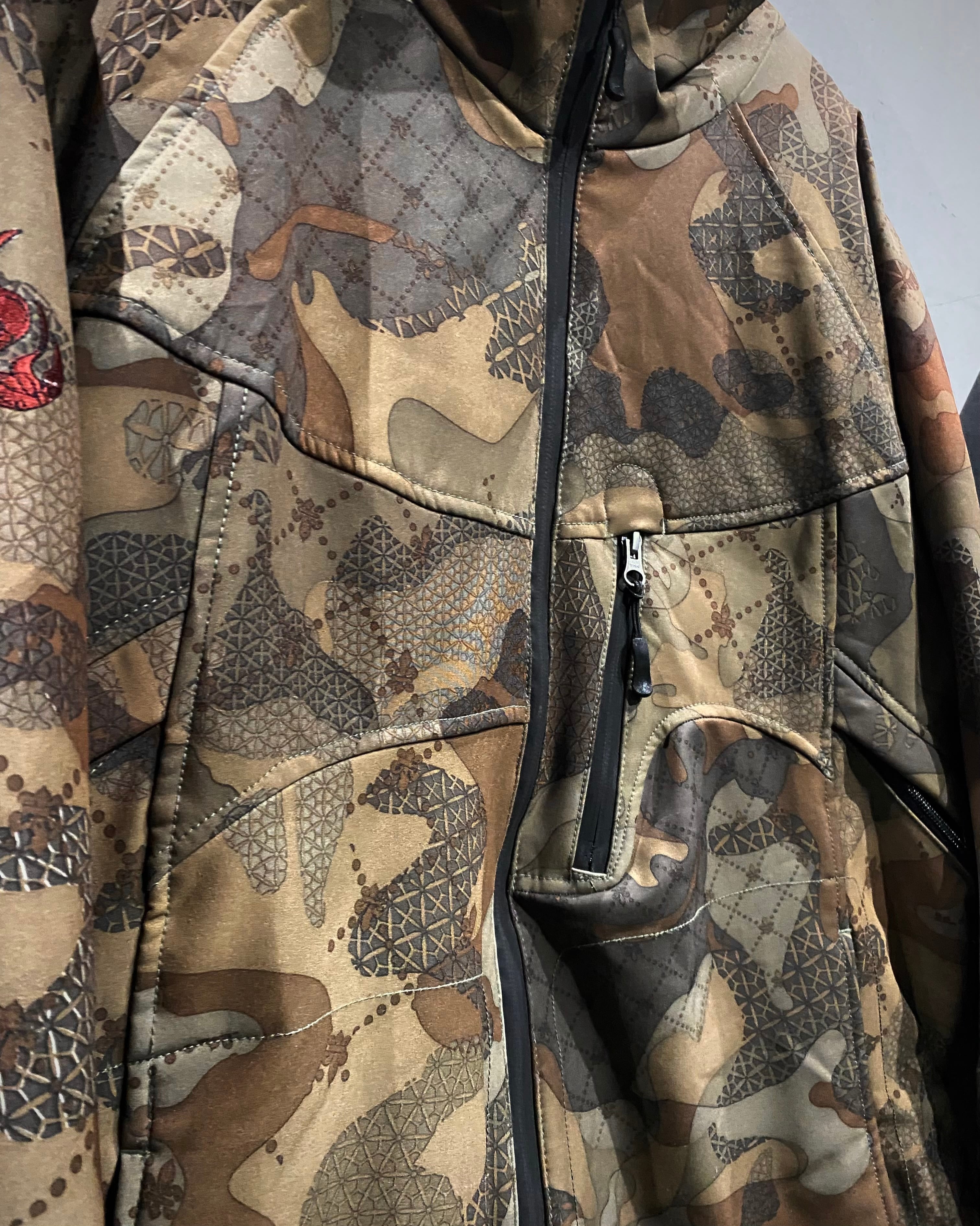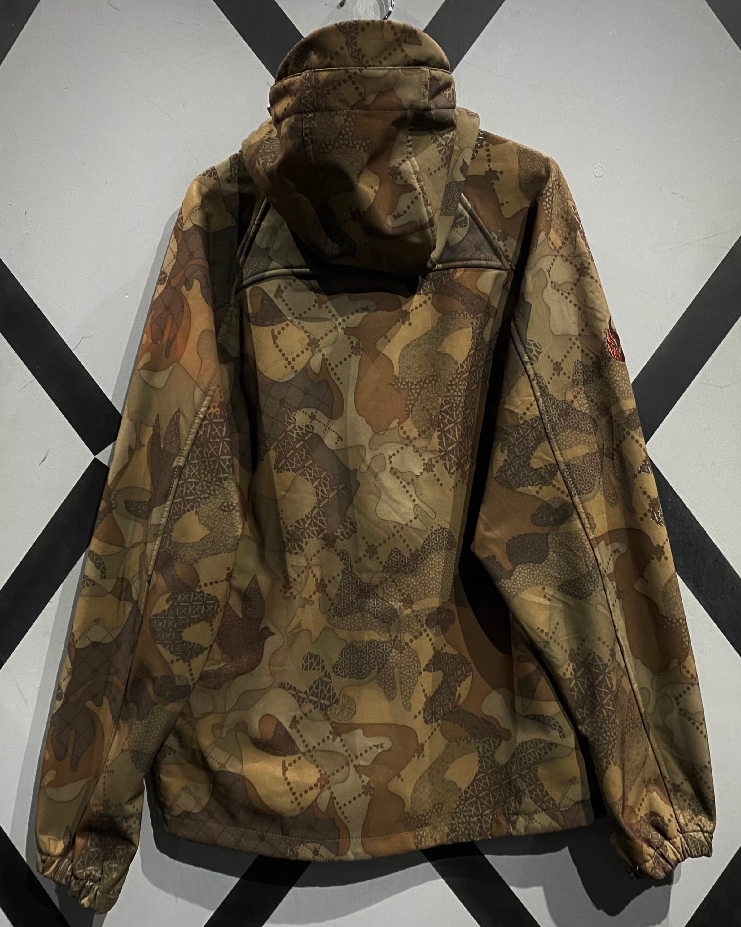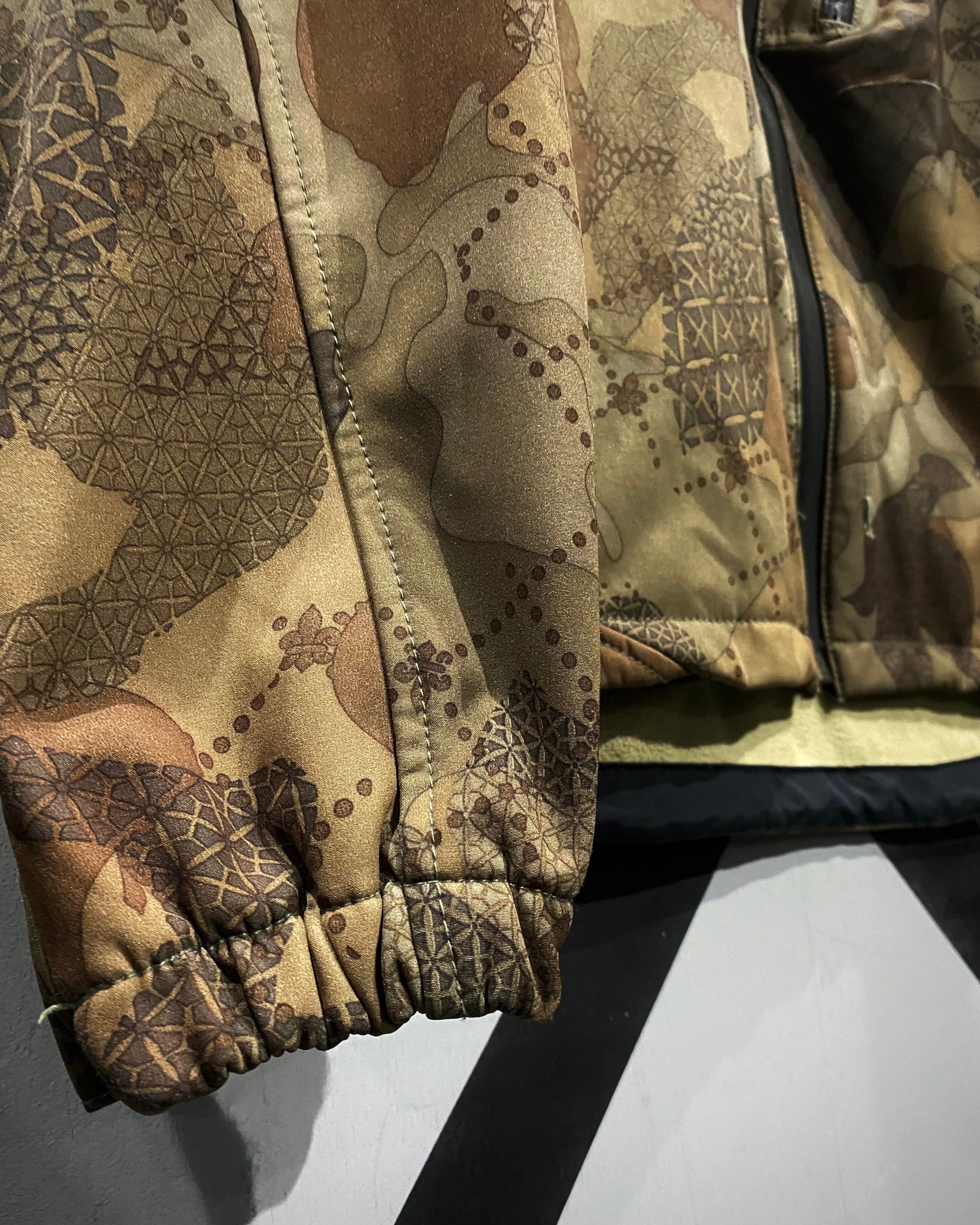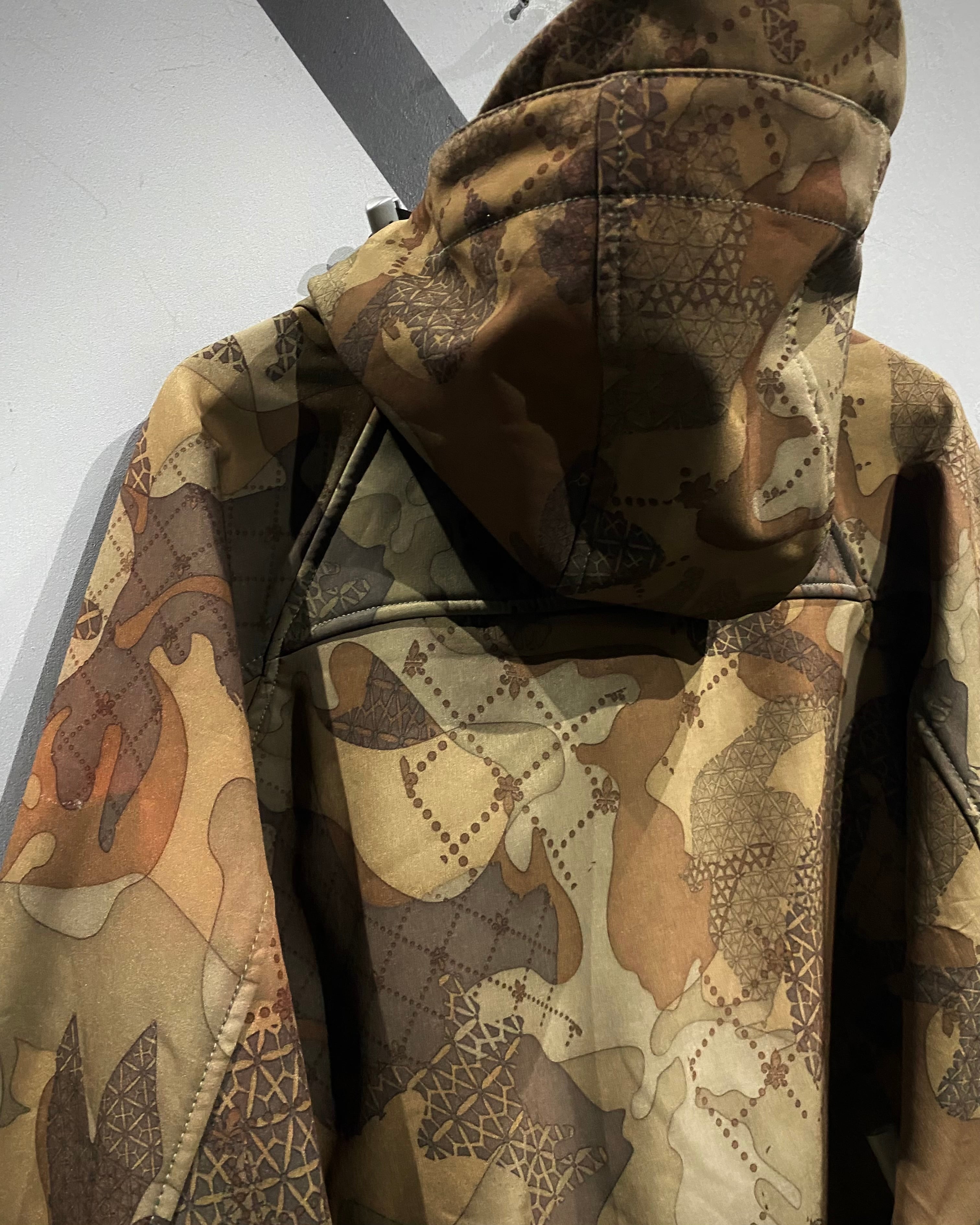 幾何学柄とカモ柄をミックスした独自の総柄が存在感を放つジャケット。