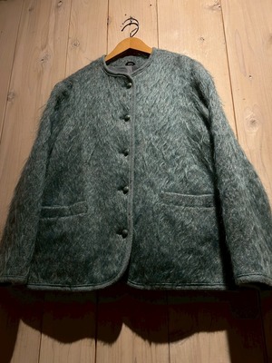 美しいライトブルーをベースに、フワッと柔らかく毛足の長いモヘアミックスのシャギーを載せたノーカラージャケット。