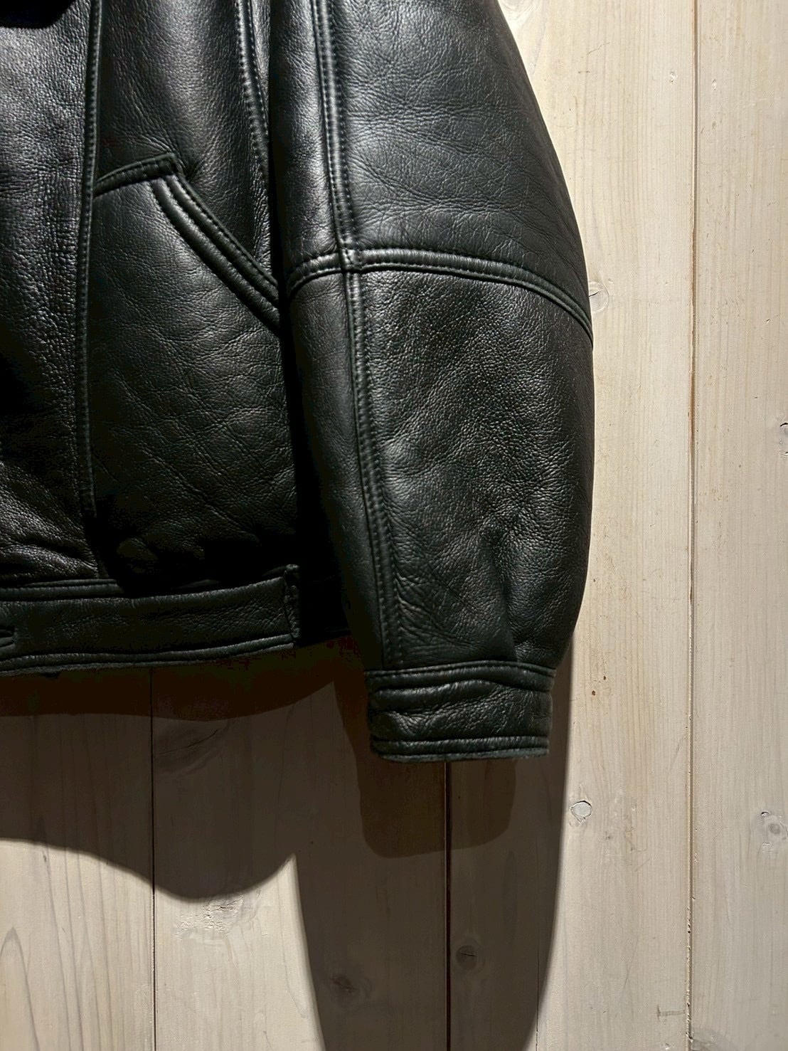 身幅も広く程よくゆったりとしたルーズなサイジングながらも、ムートンレザージャケットでは非常に珍しい短くスッキリとした着丈。稀少性に加えてスタイルアップに繋がるのも嬉しいポイント。