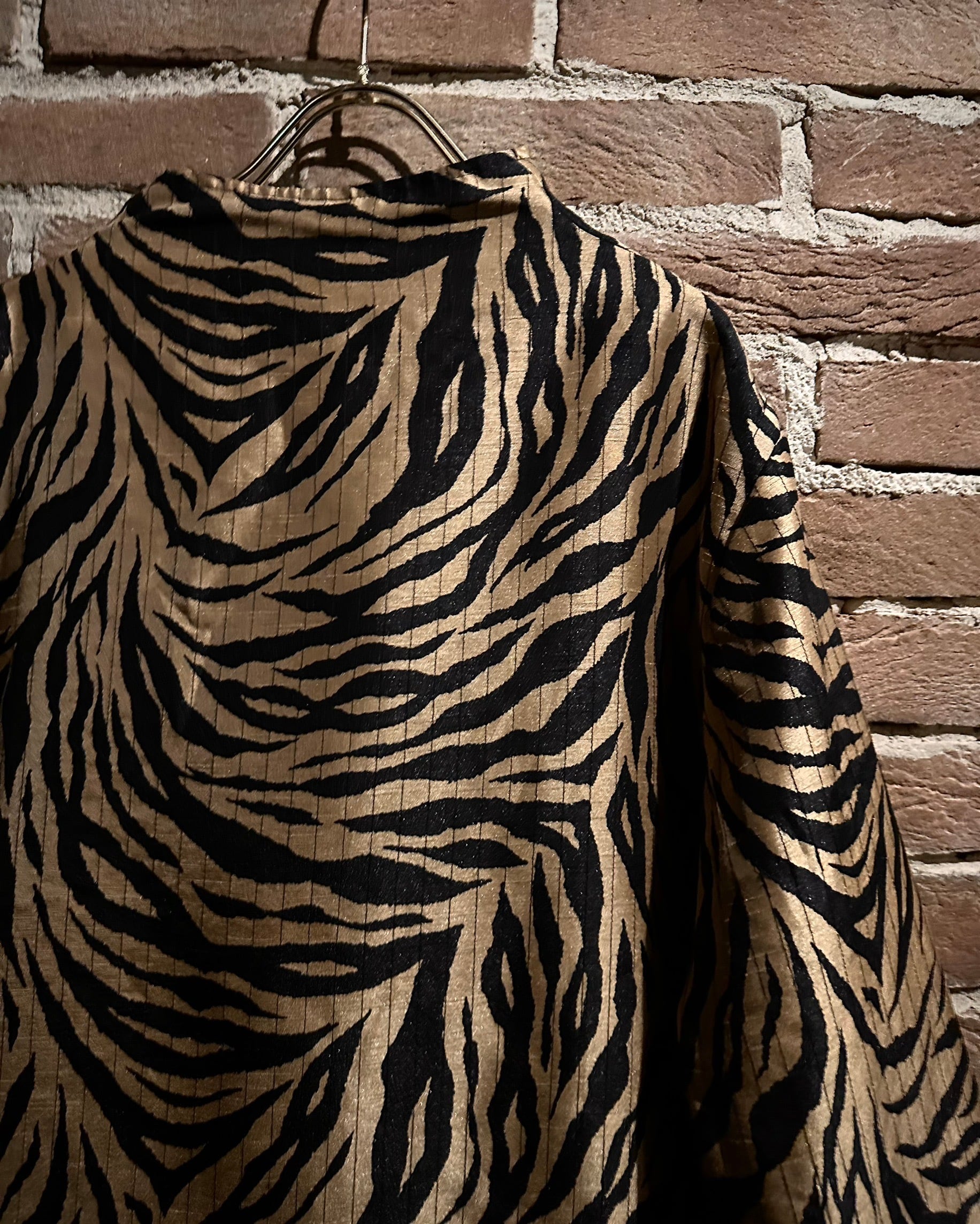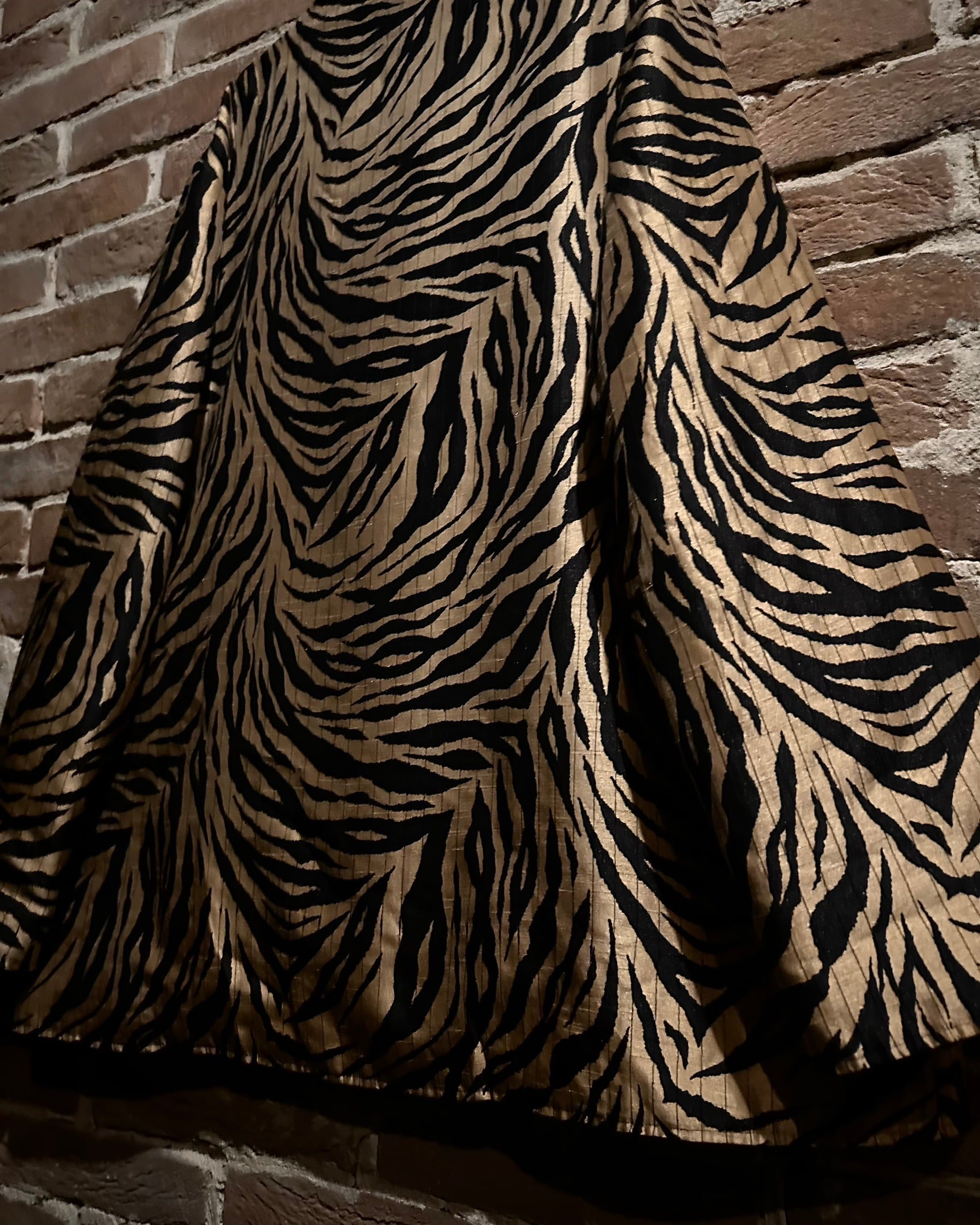 ゴールドの光沢をまとった生地に深いブラックステッチが走り、タイガーパターンと相まって動きに合わせて陰影を生み出します。