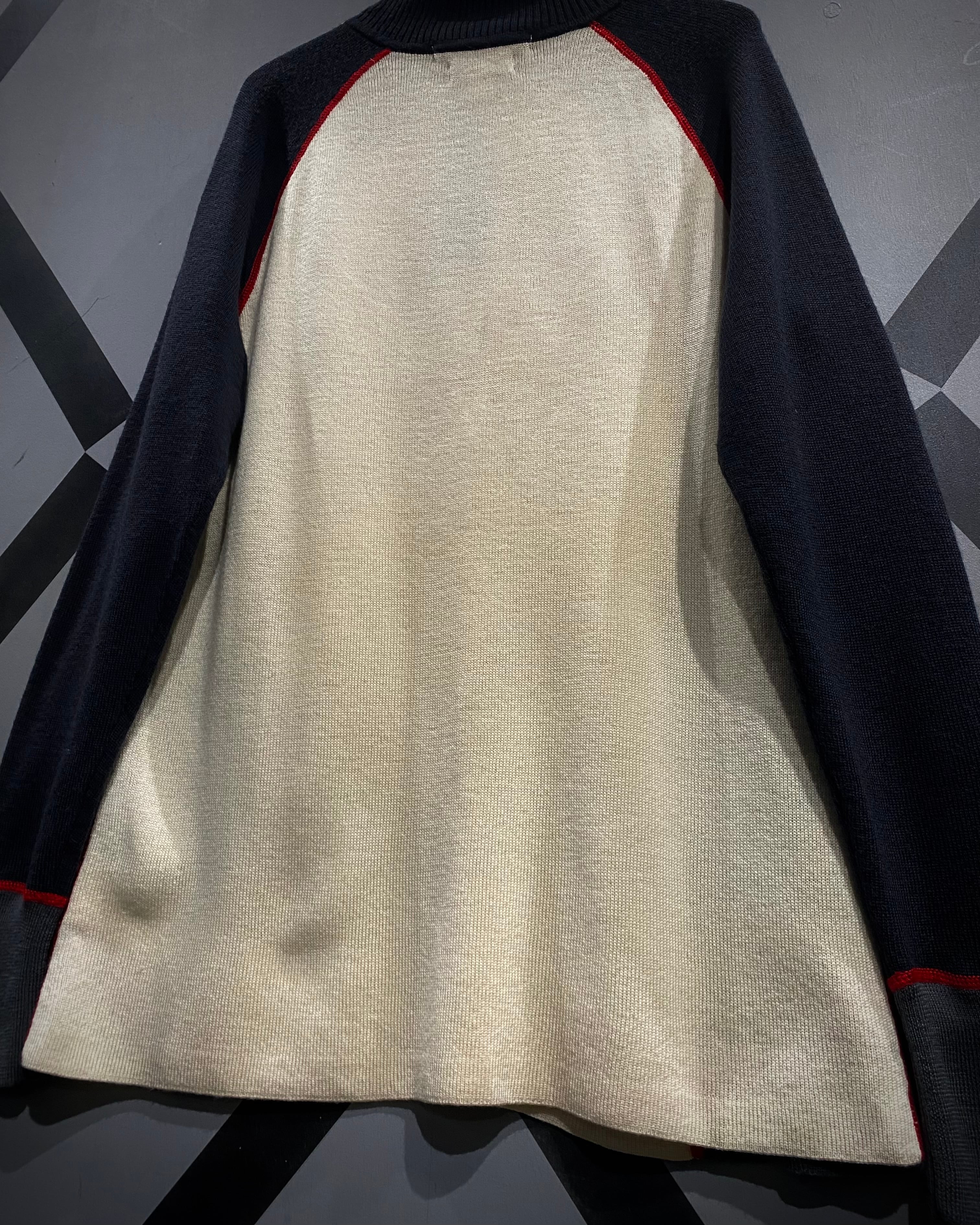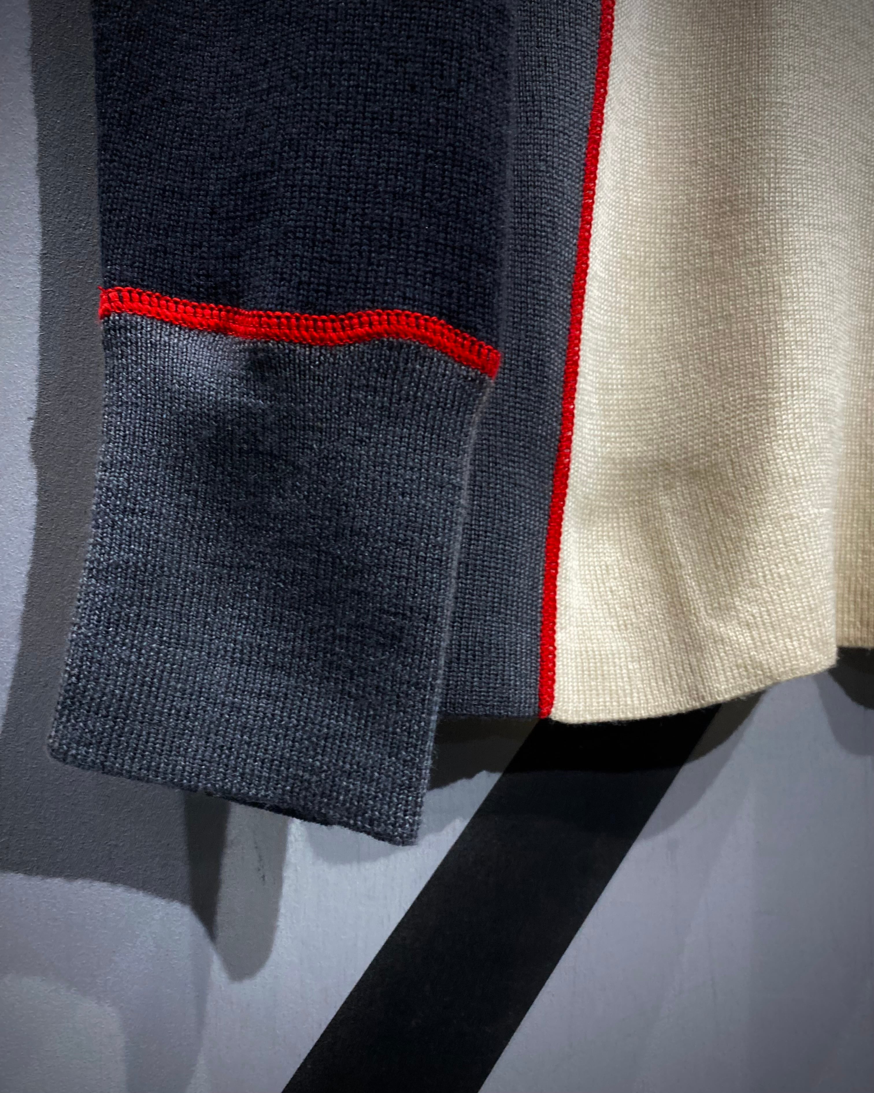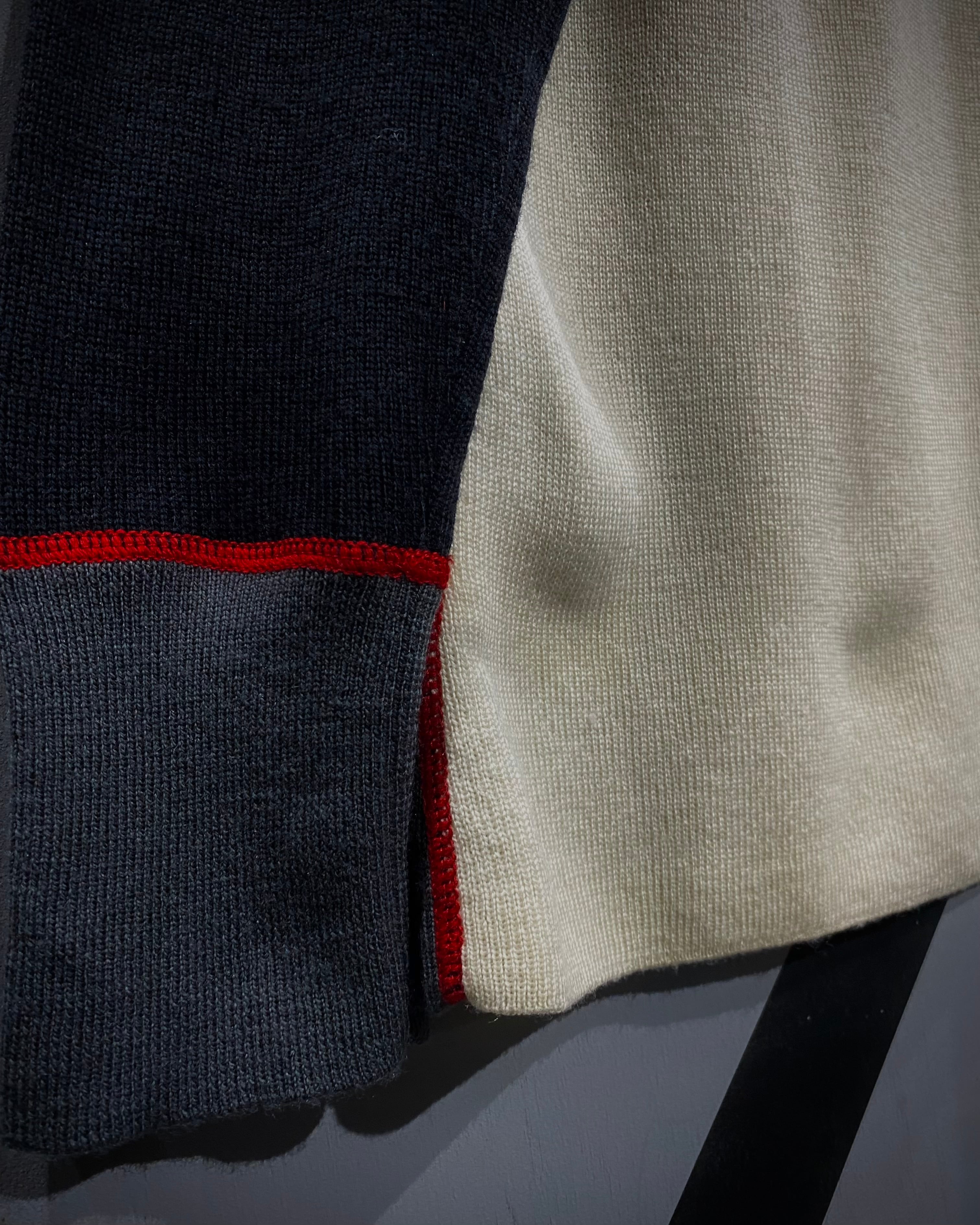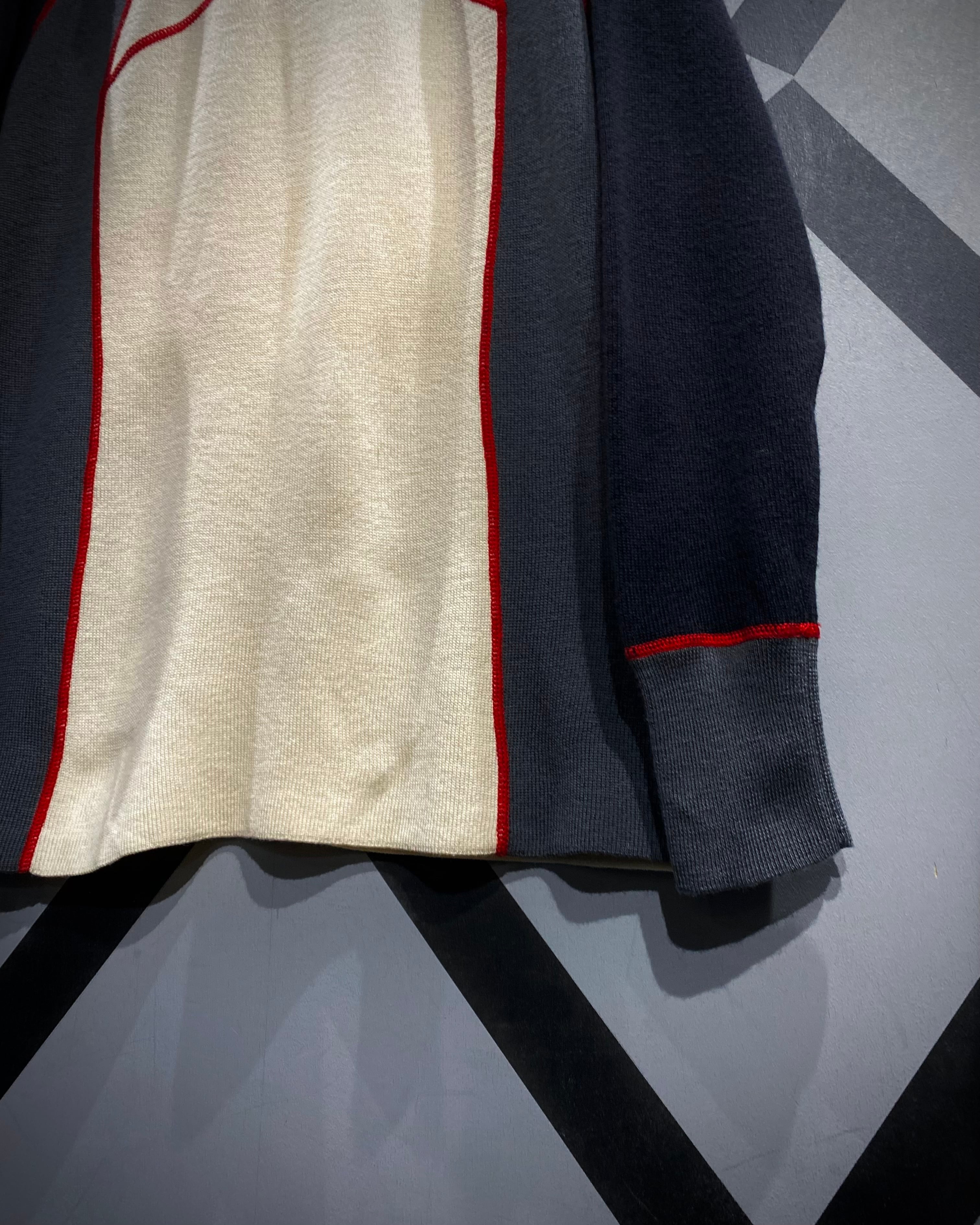 フロントのアイボリーを軸に、ネイビー×グレーの切り替え、そして赤のロックミシンステッチが走る立体的なデザイン。アウトドアブランドの枠を越えたモード寄りの印象に仕上がっています。