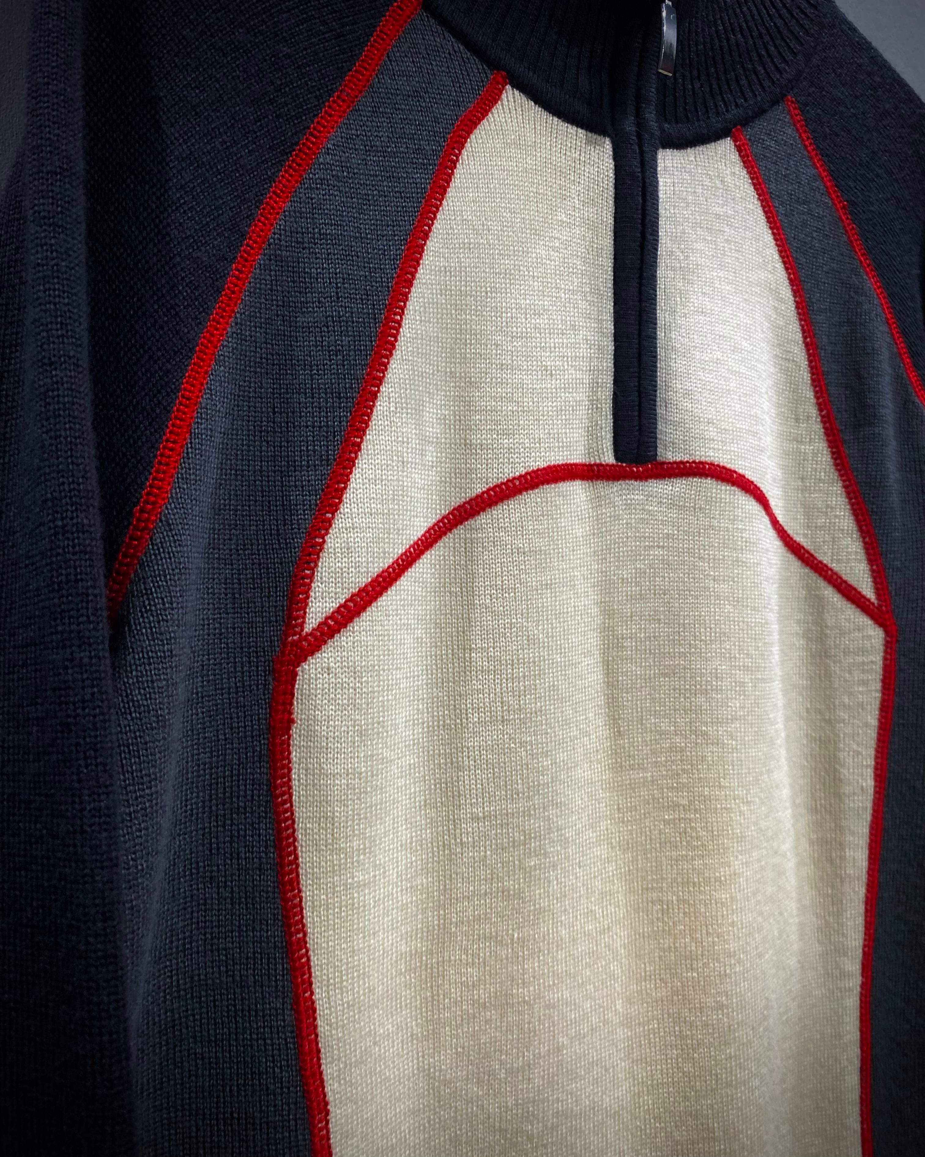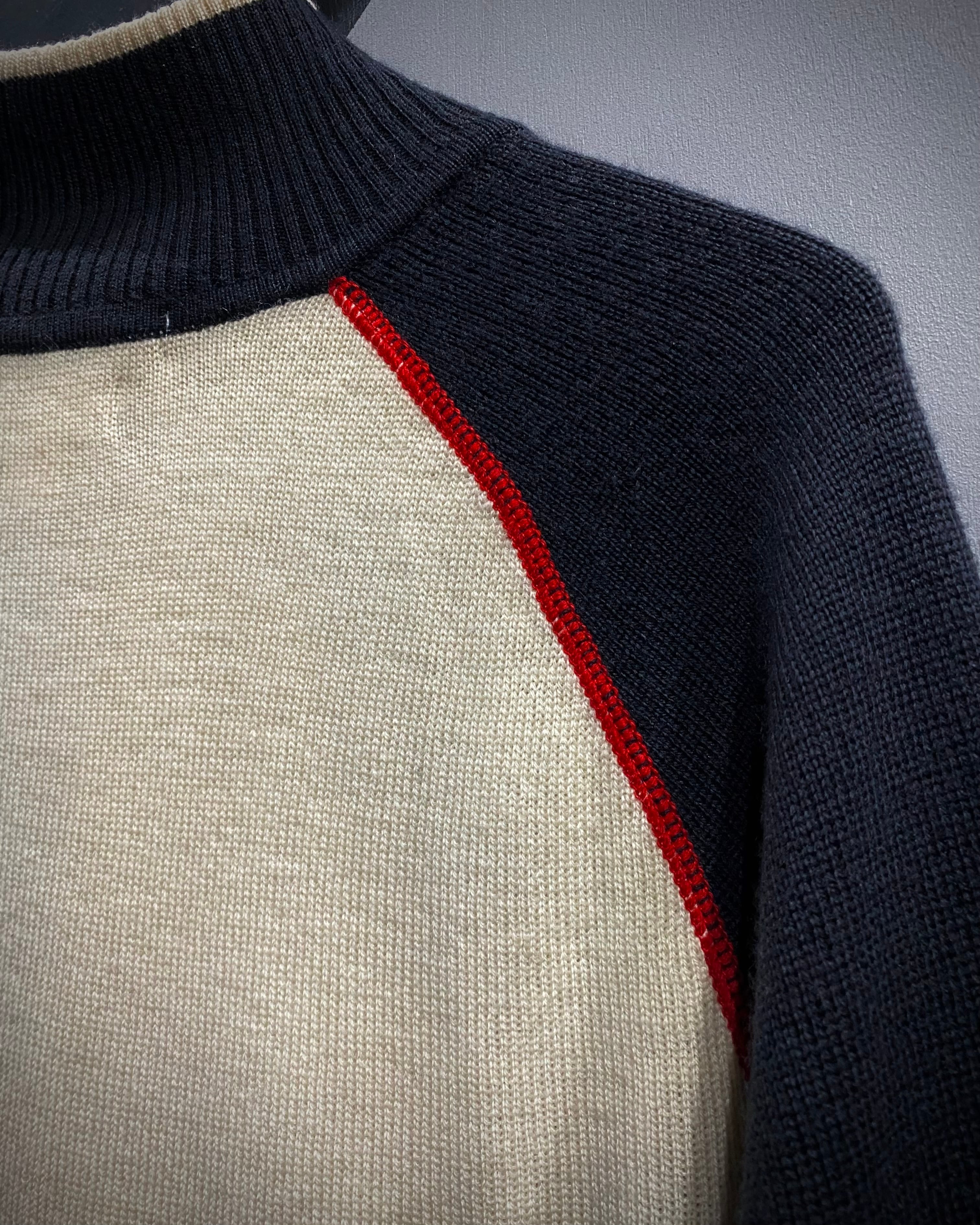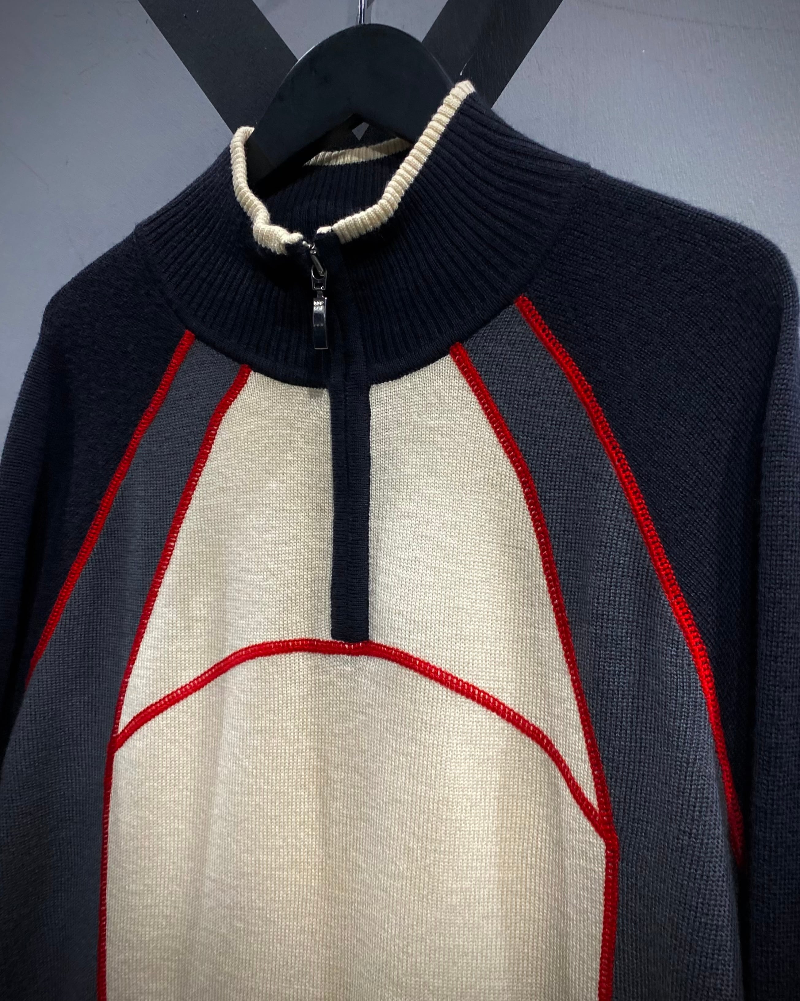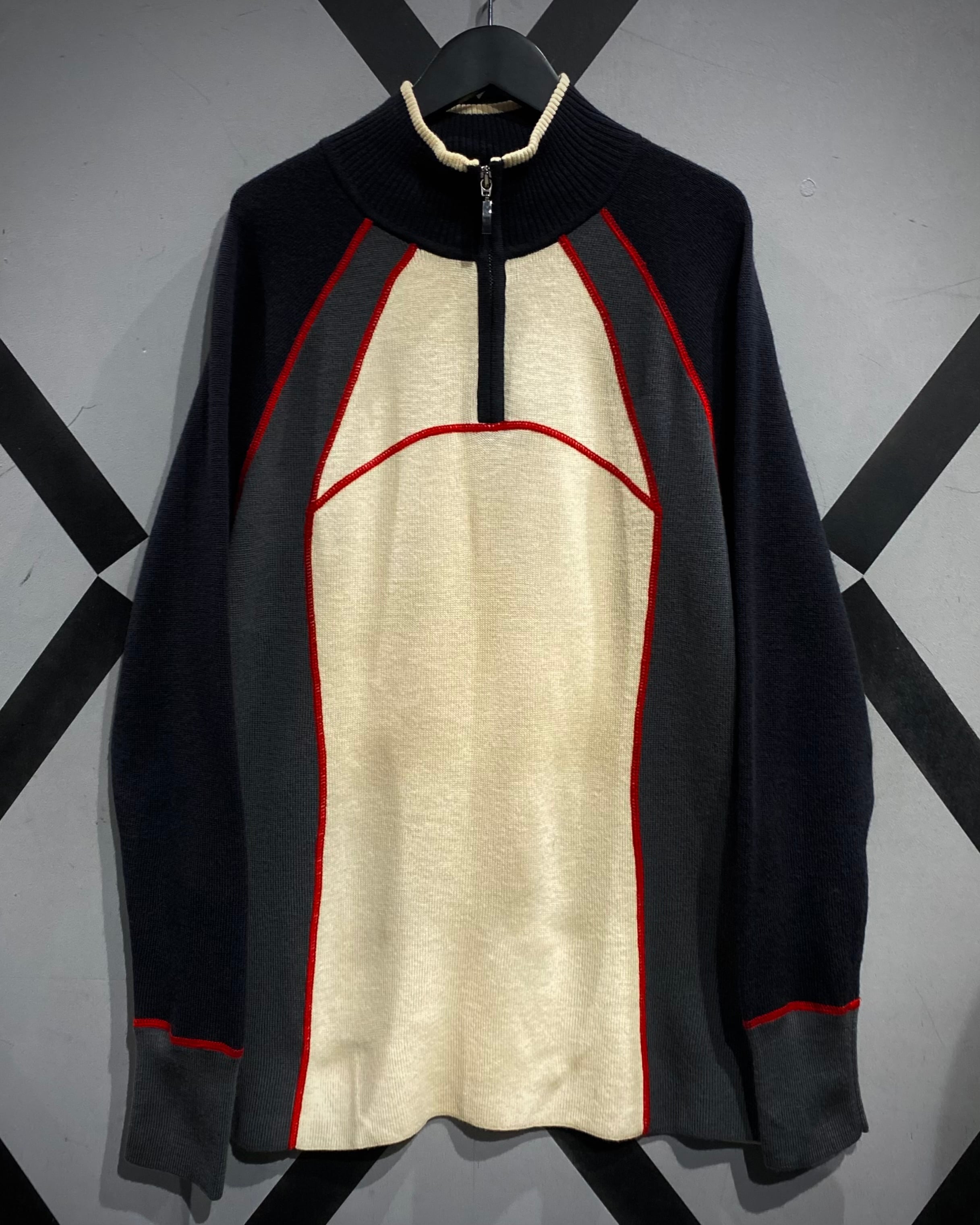 フロントのアイボリーを軸に、ネイビー×グレーの切り替え、そして赤のロックミシンステッチが走る立体的なデザイン。アウトドアブランドの枠を越えたモード寄りの印象に仕上がっています。