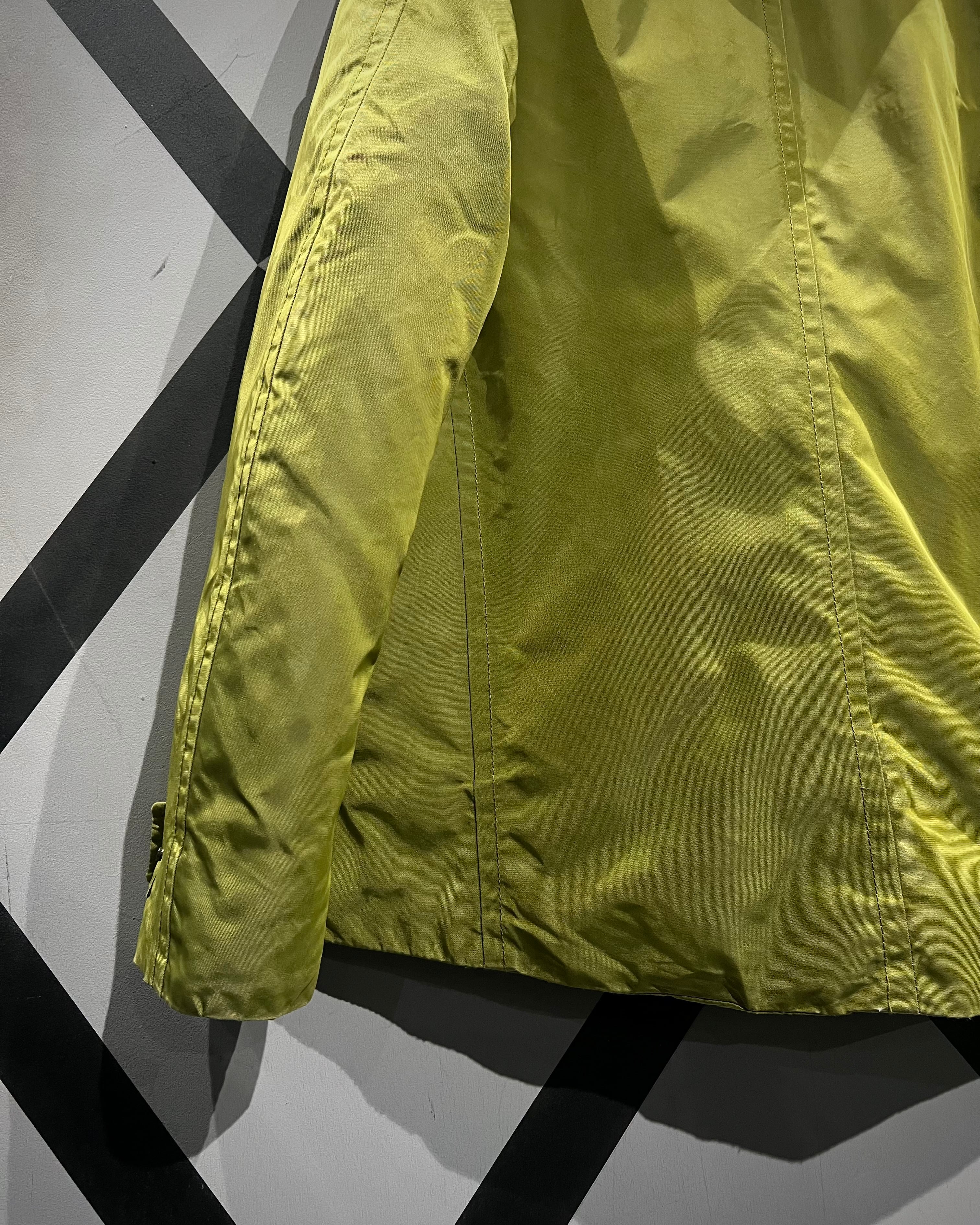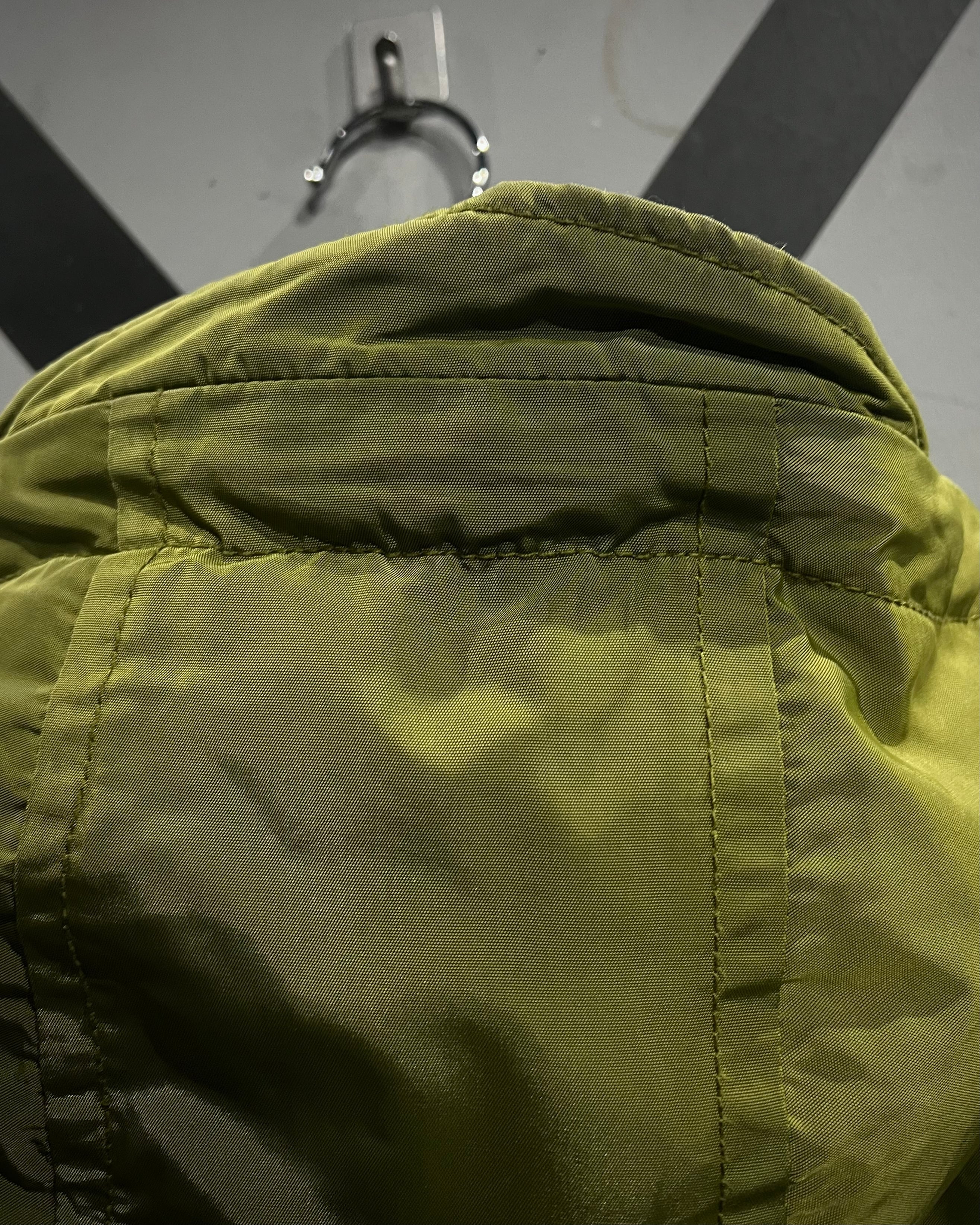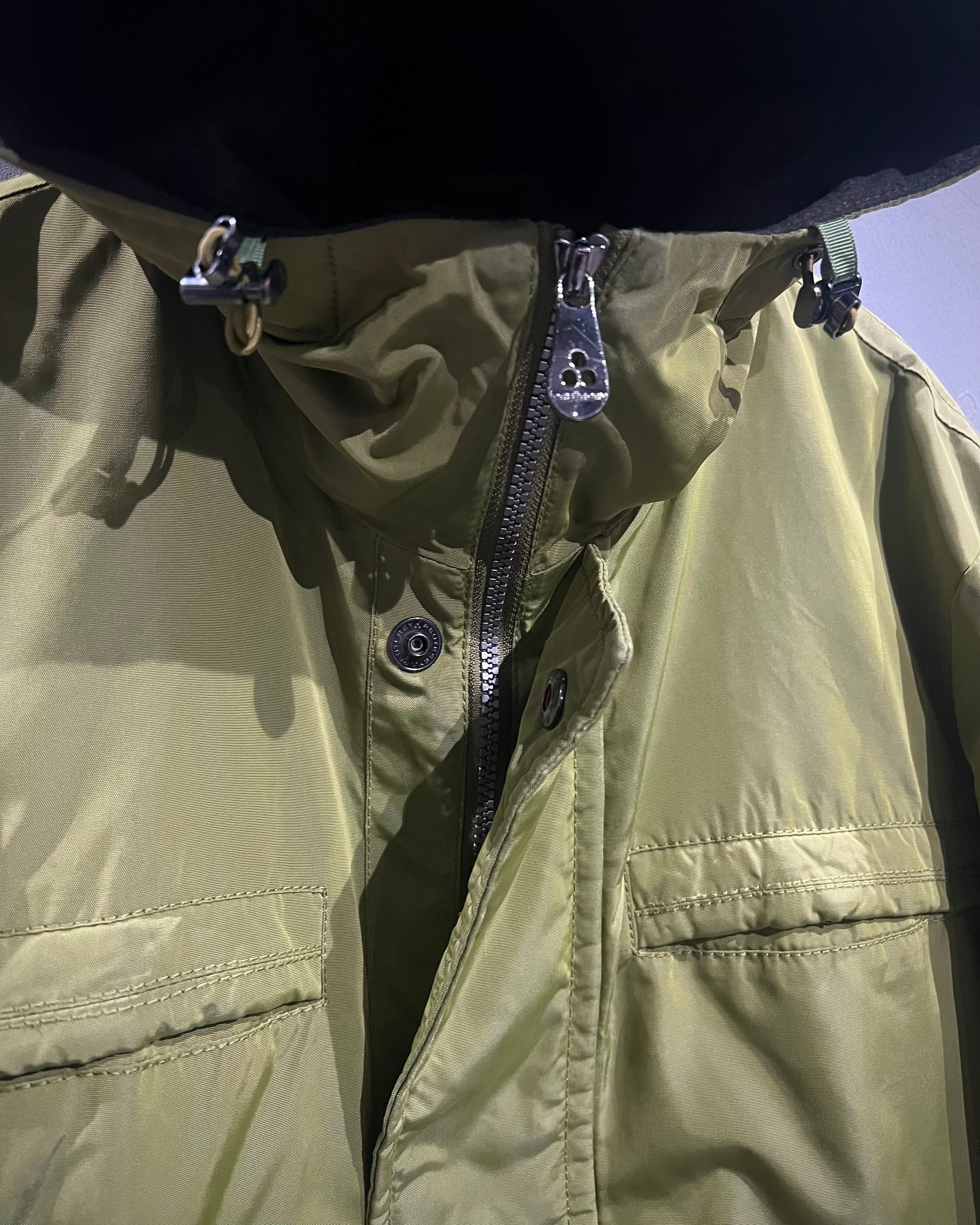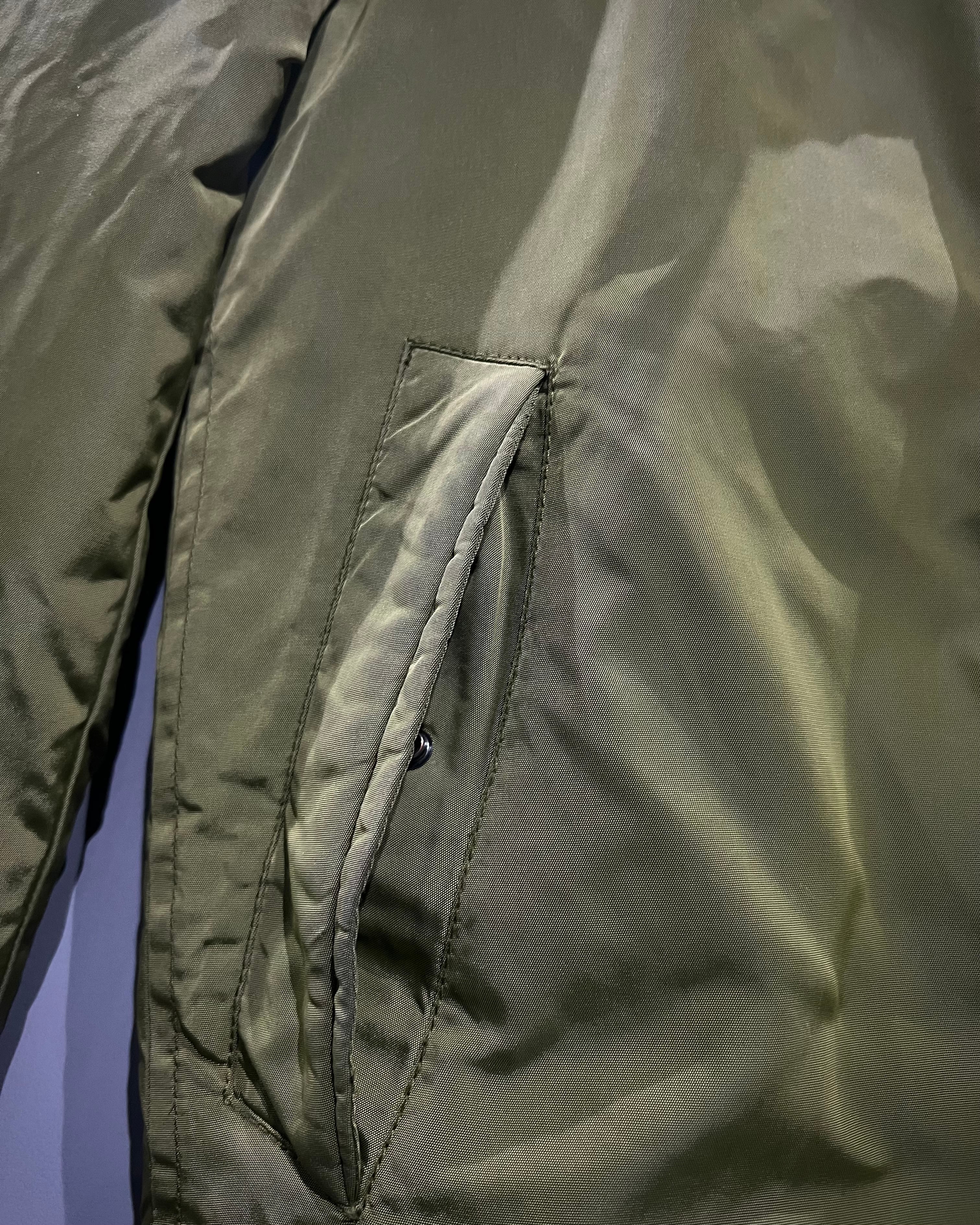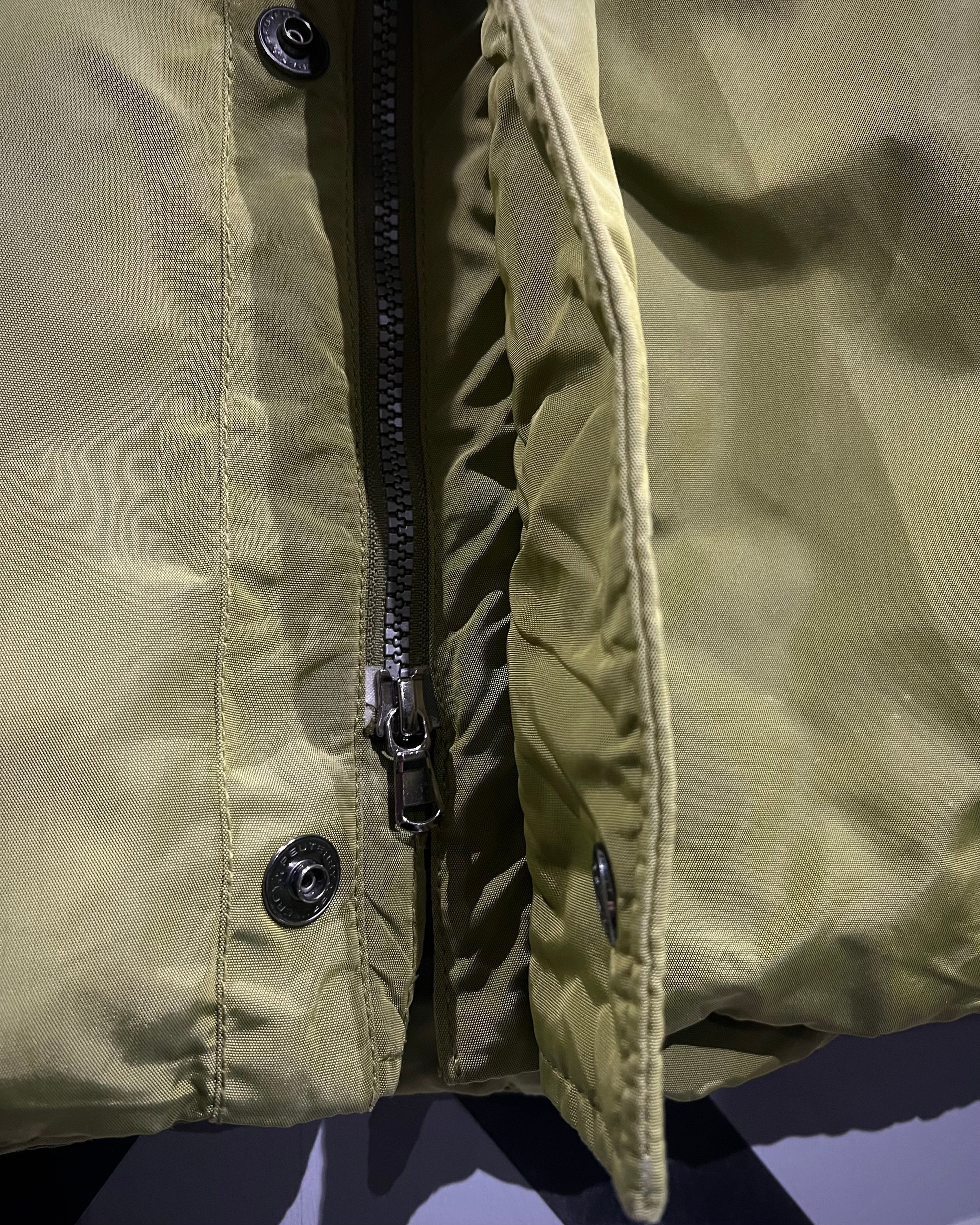 表地はナイロン、中綿はダウンを使用し、袖にはブランドタグをワンポイントで配置。比翼仕立てのフロントはジップ+スナップの二重構造で、風をしっかり止める本格的な作り。ジップのプルなど、細やかな作り込みも◎