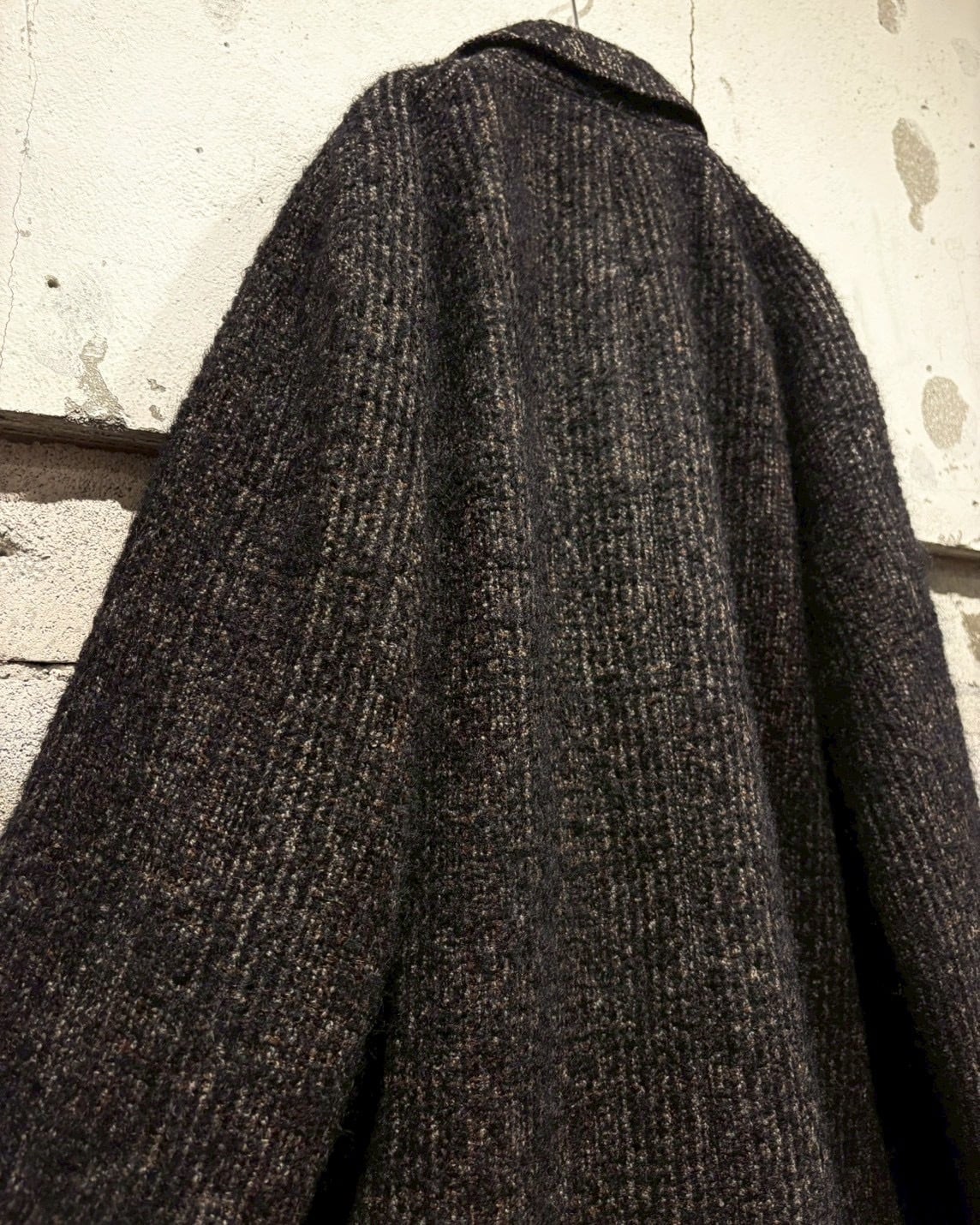ダークトーンの糸を複雑に織り込んだ表情は、無地とはまったく違う重さと深みを纏った仕上がり。光の当たり方で陰影が変わるため、シンプルながら存在感は抜群です。
