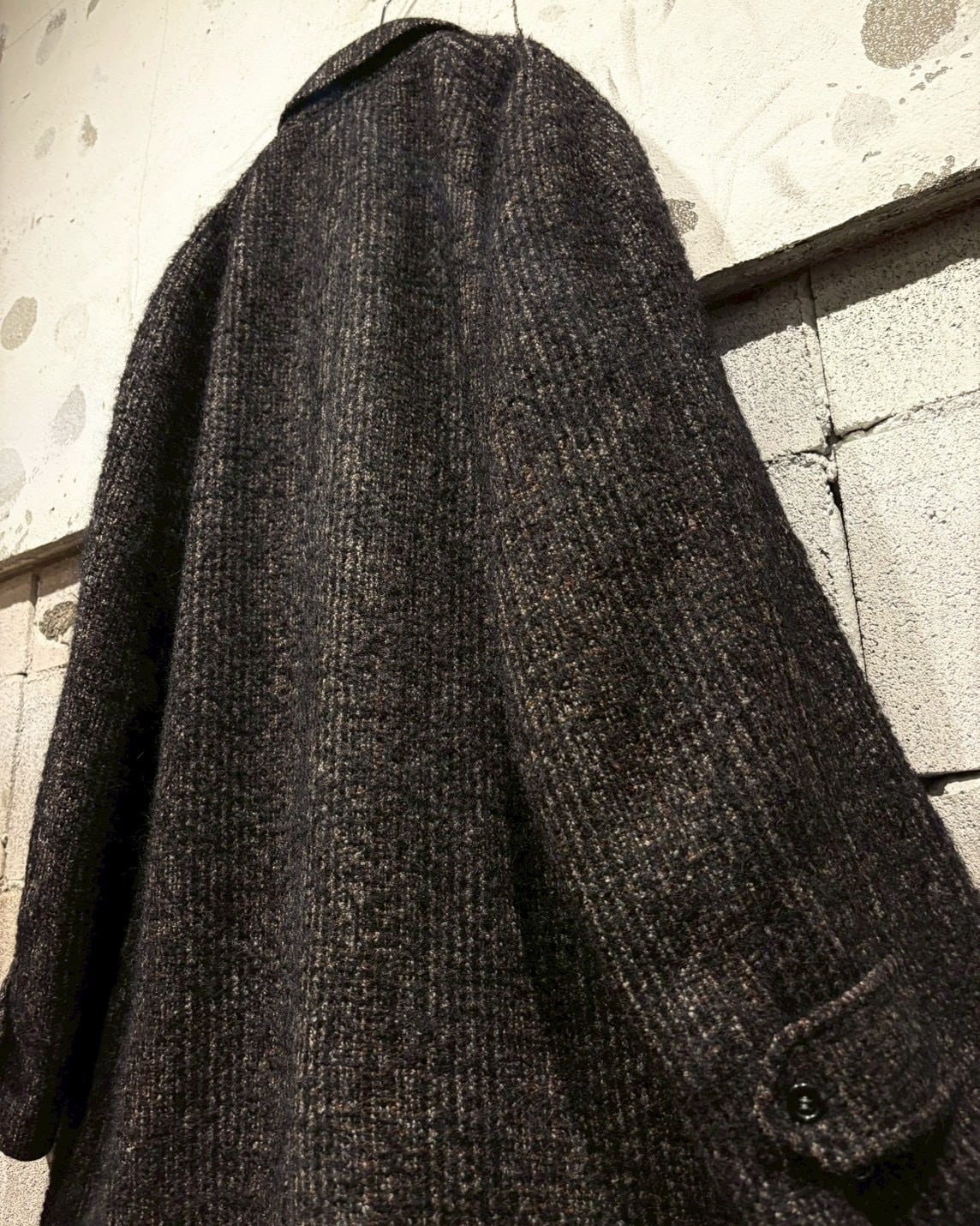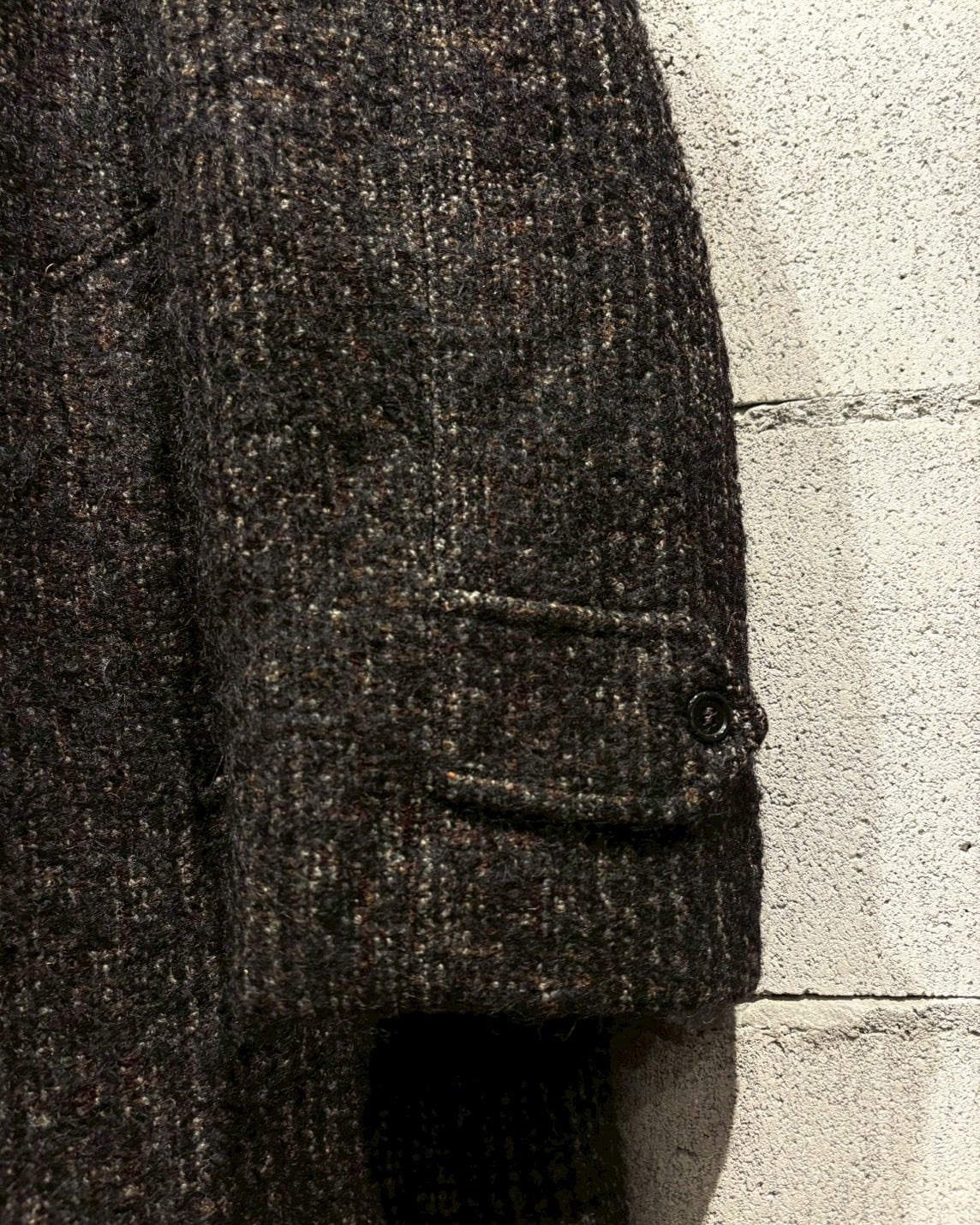ミニマルなボタンワーク、絶妙に落ちる肩線、縦に流れるラインがつくる綺麗な縦長シルエットがとにかく上品。古い年代特有のツイードの粗野さと、洗練された雰囲気がちょうど良いバランスでマッチしています。