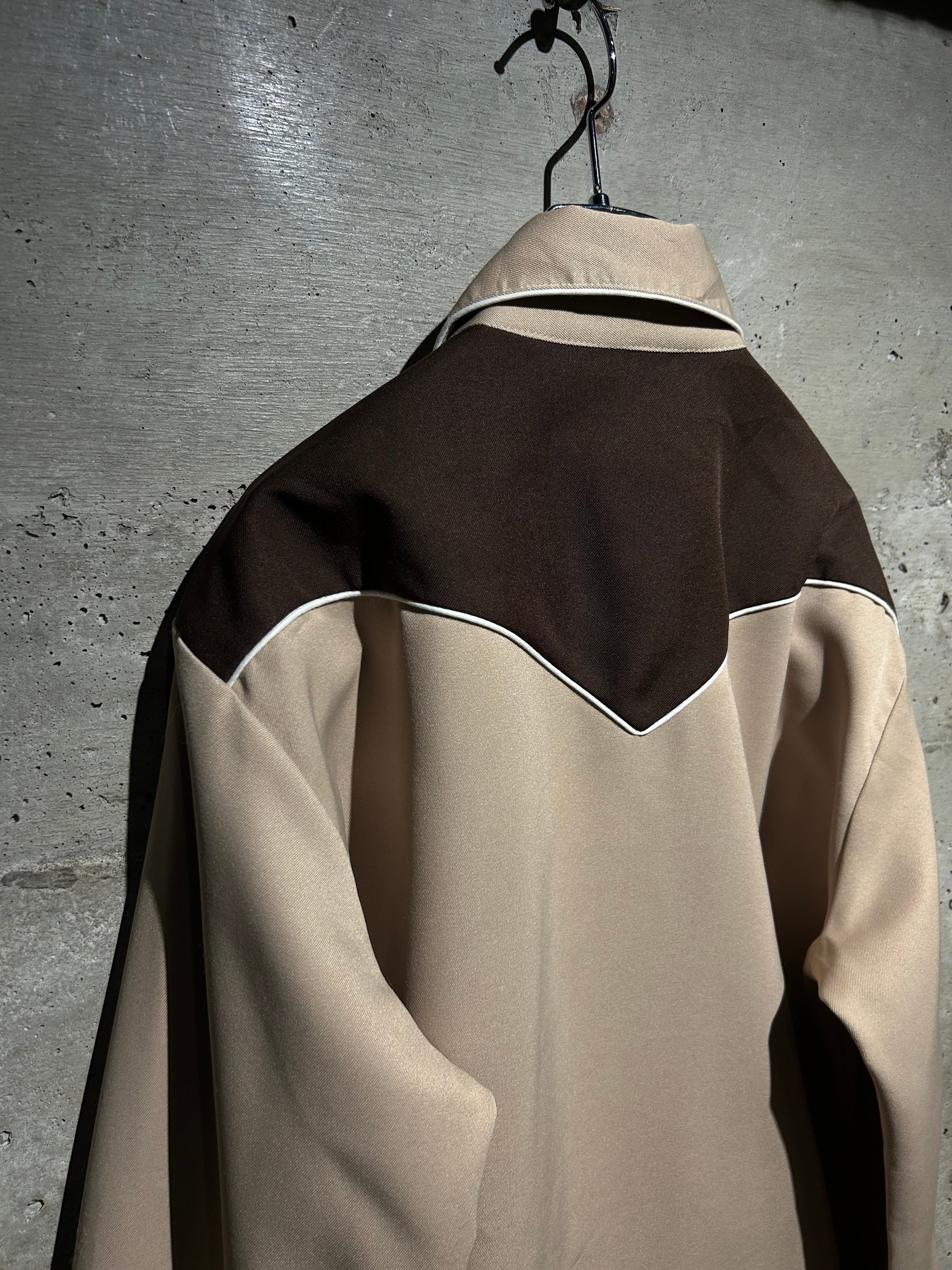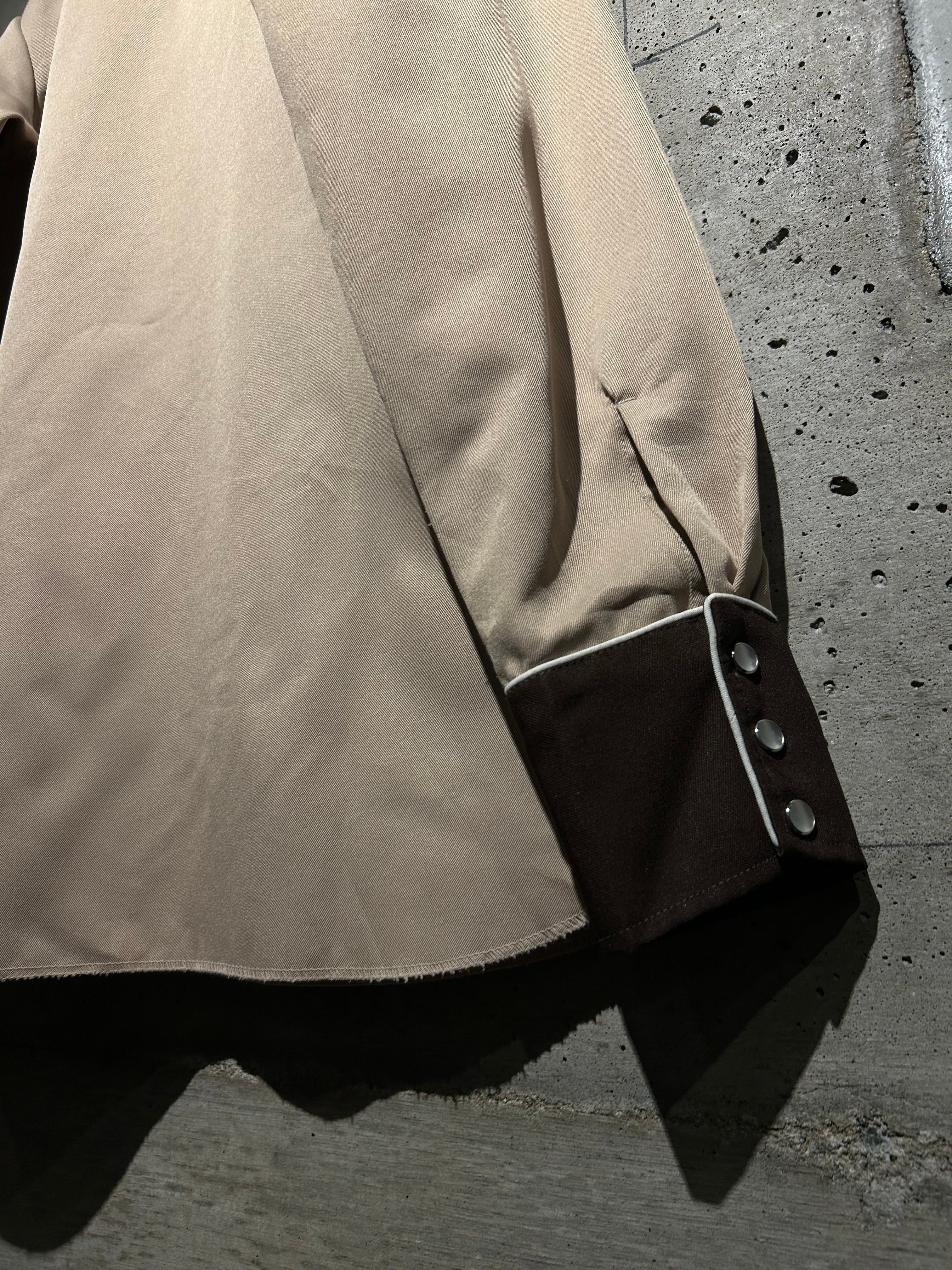 ベージュ×ブラウンの2トーンで切り替え、ホワイトのパイピングを走らせた、この手のアイテムでは珍しいミニマルな仕上がりを見せる1着。