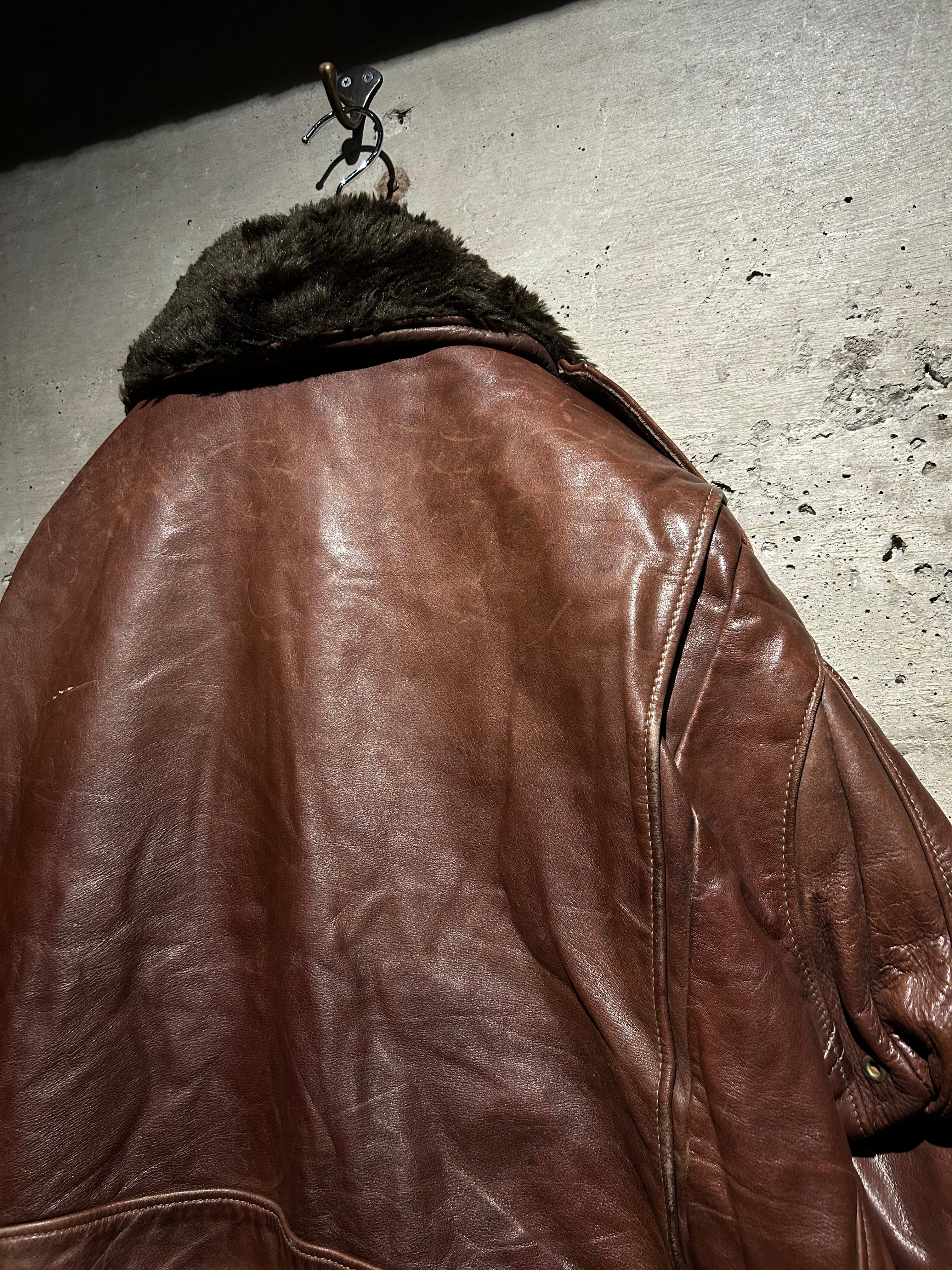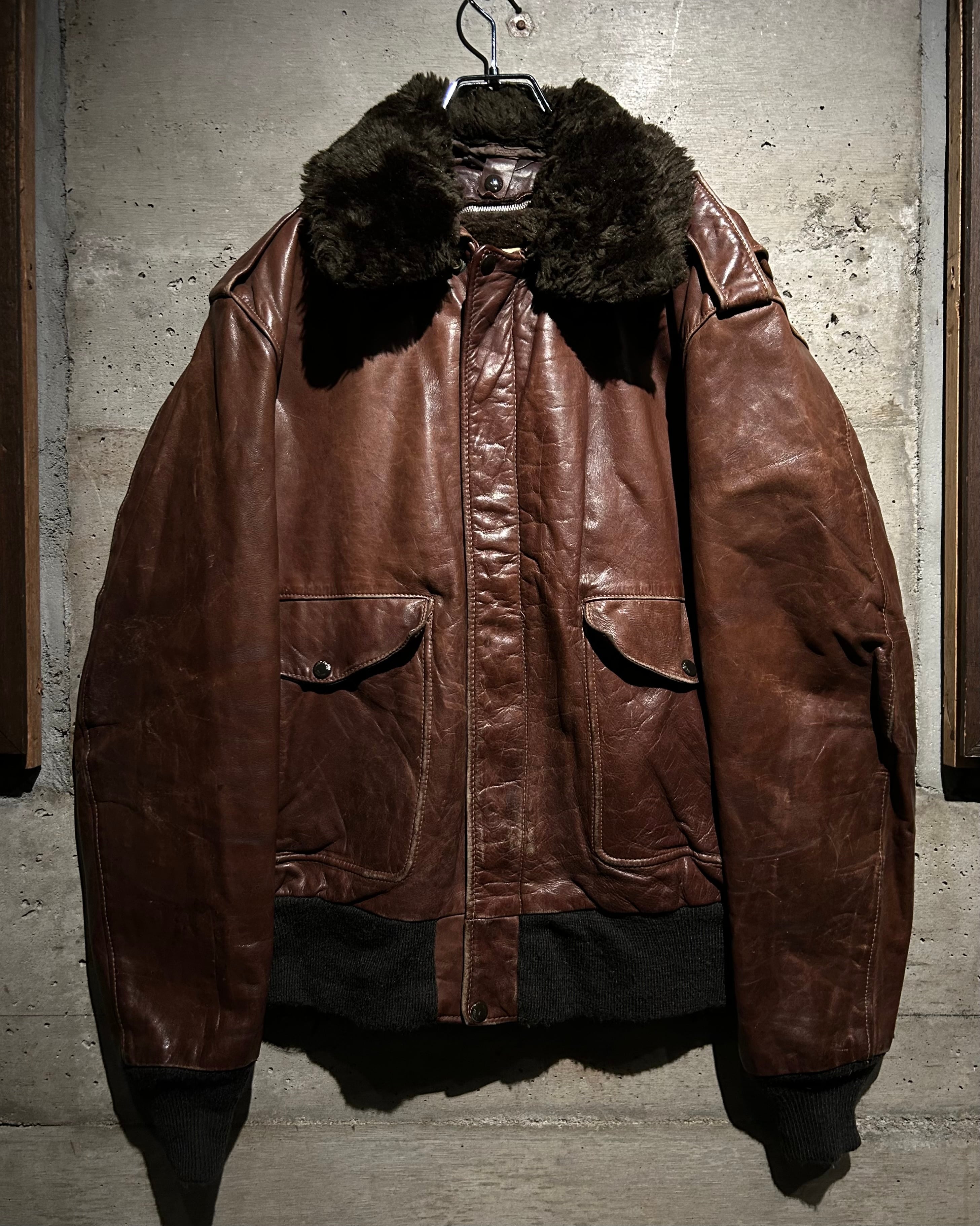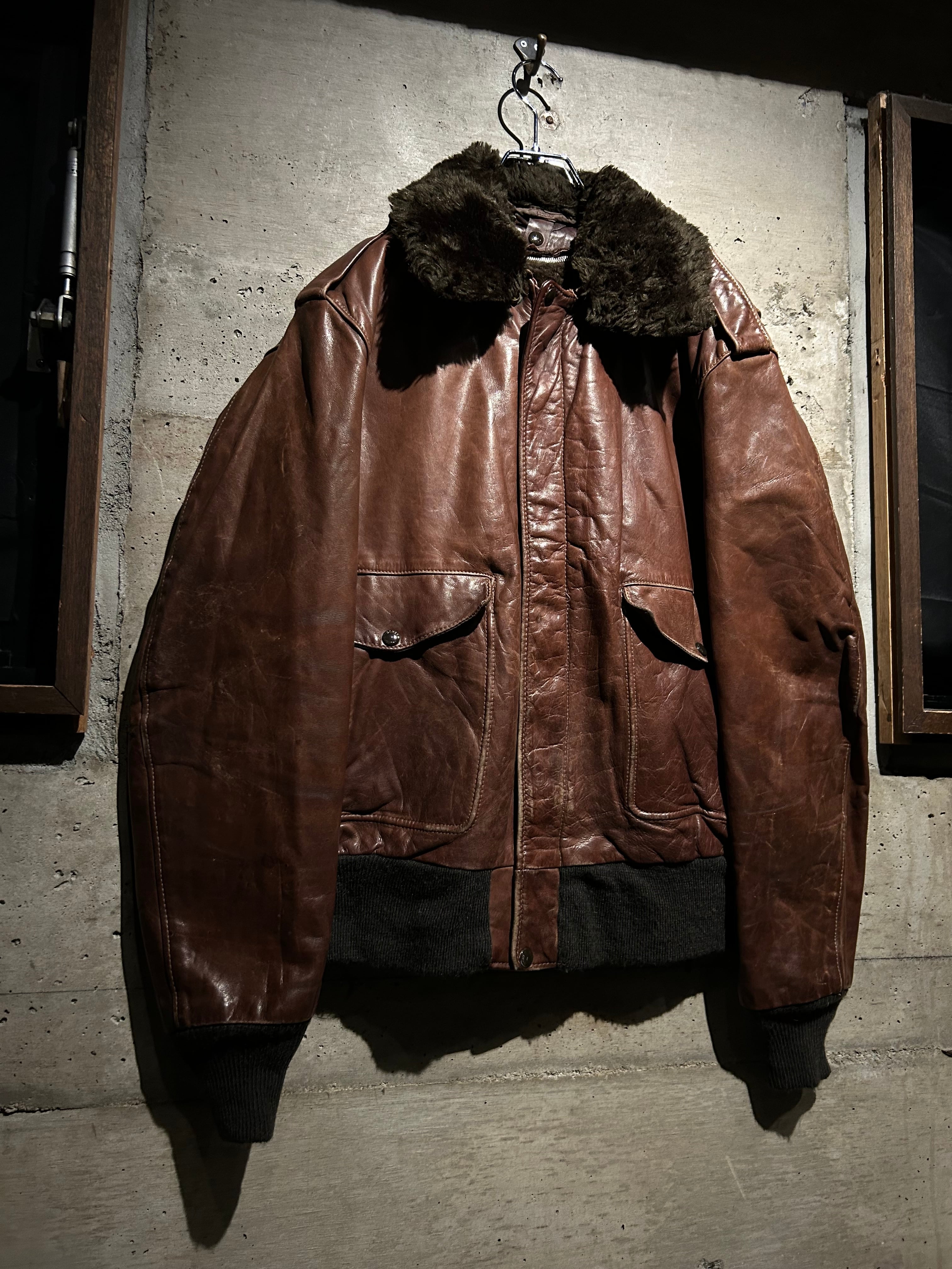 重厚なレザーの質感とミリタリー由来の洗練されたシルエットが際立つ、G-1タイプのレザーフライトジャケット。