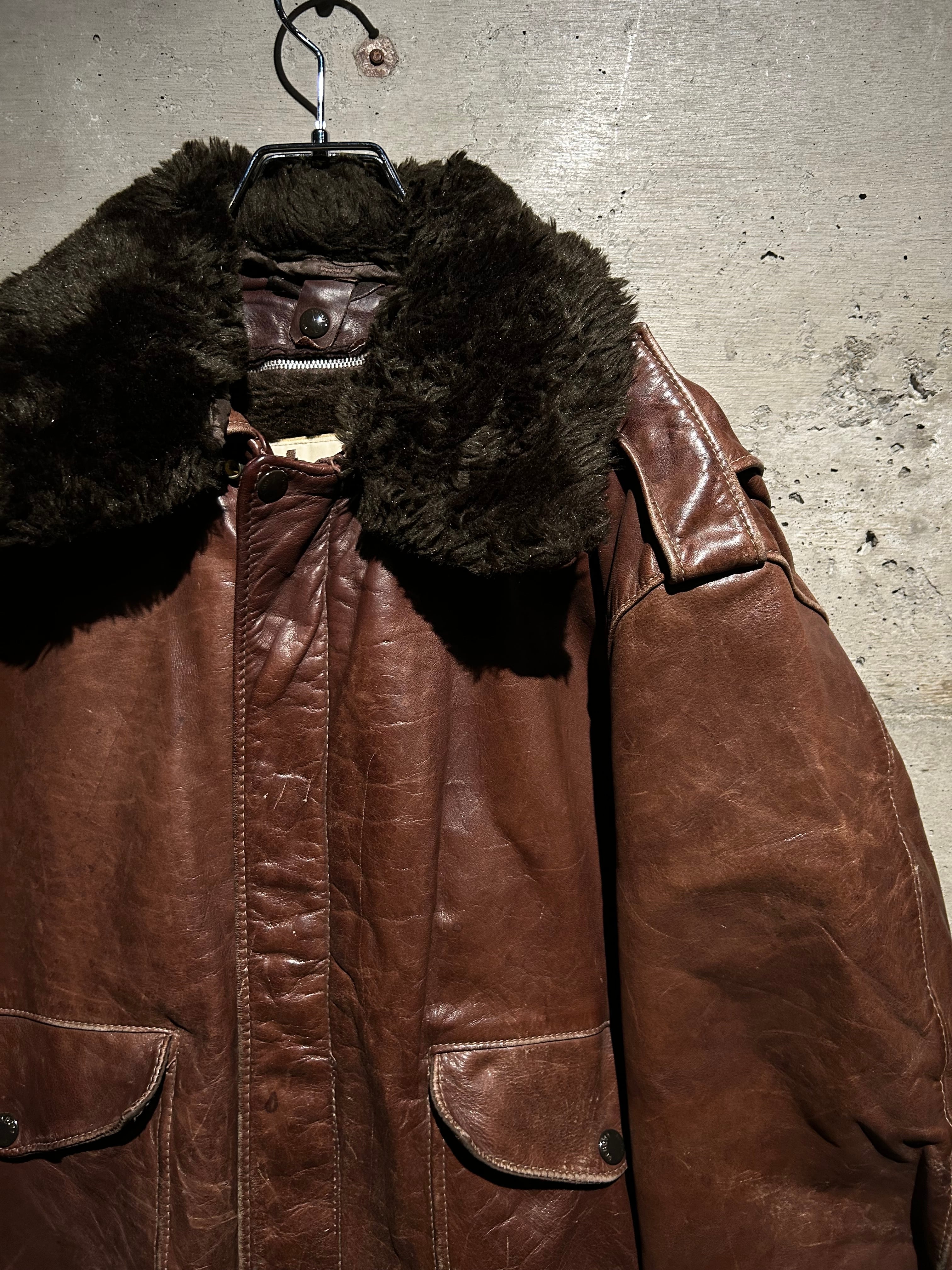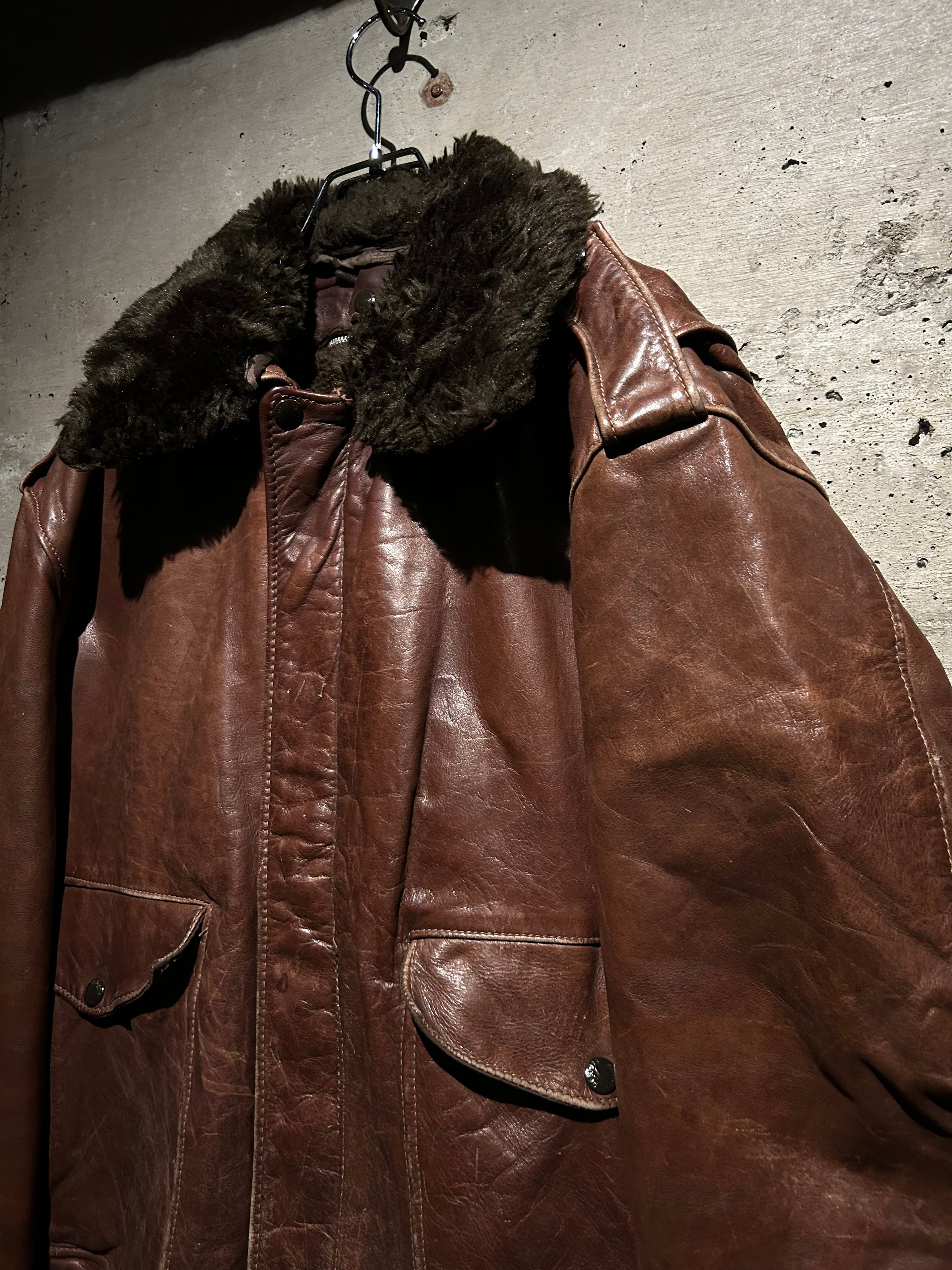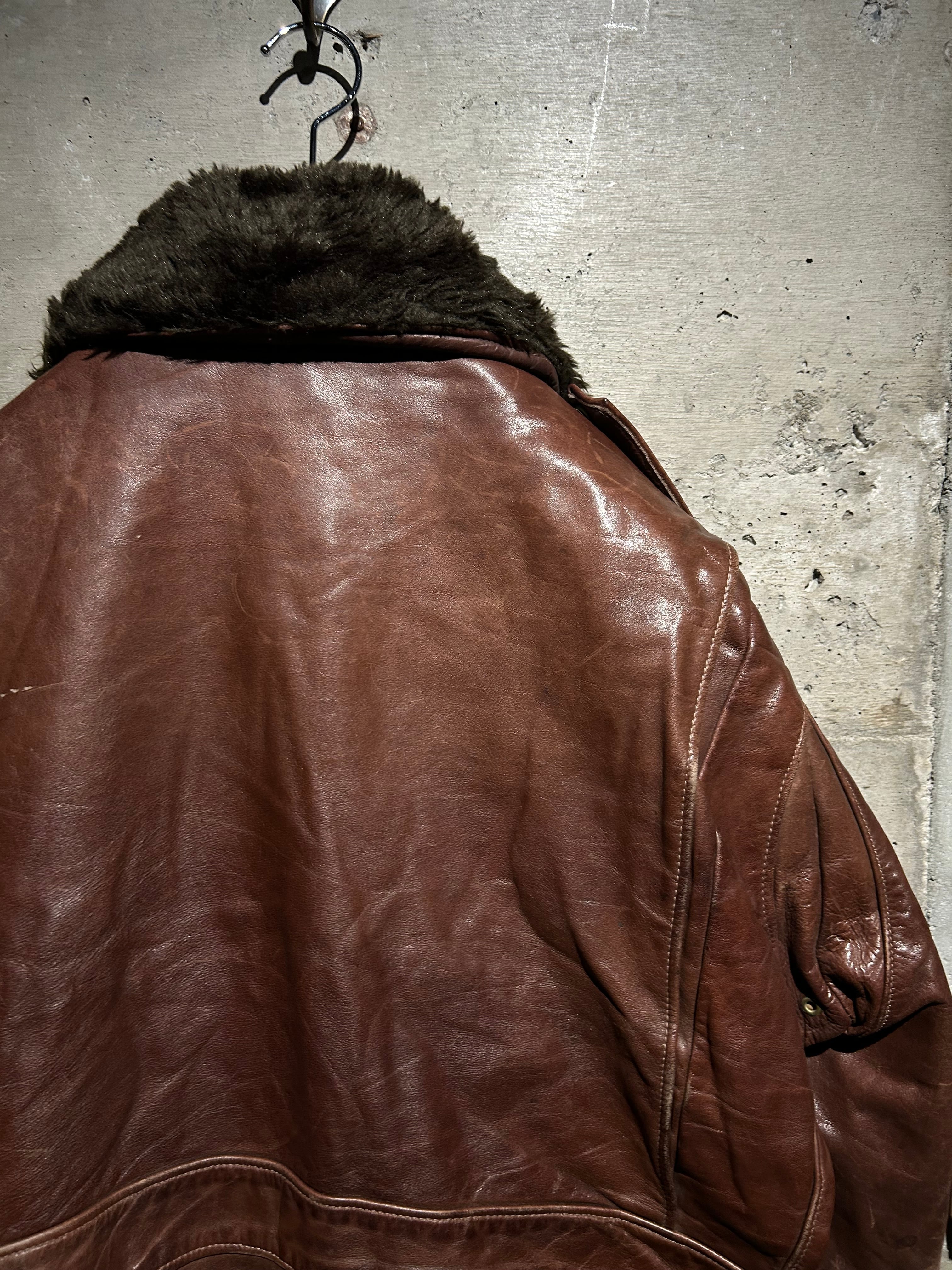 重厚なレザーの質感とミリタリー由来の洗練されたシルエットが際立つ、G-1タイプのレザーフライトジャケット。