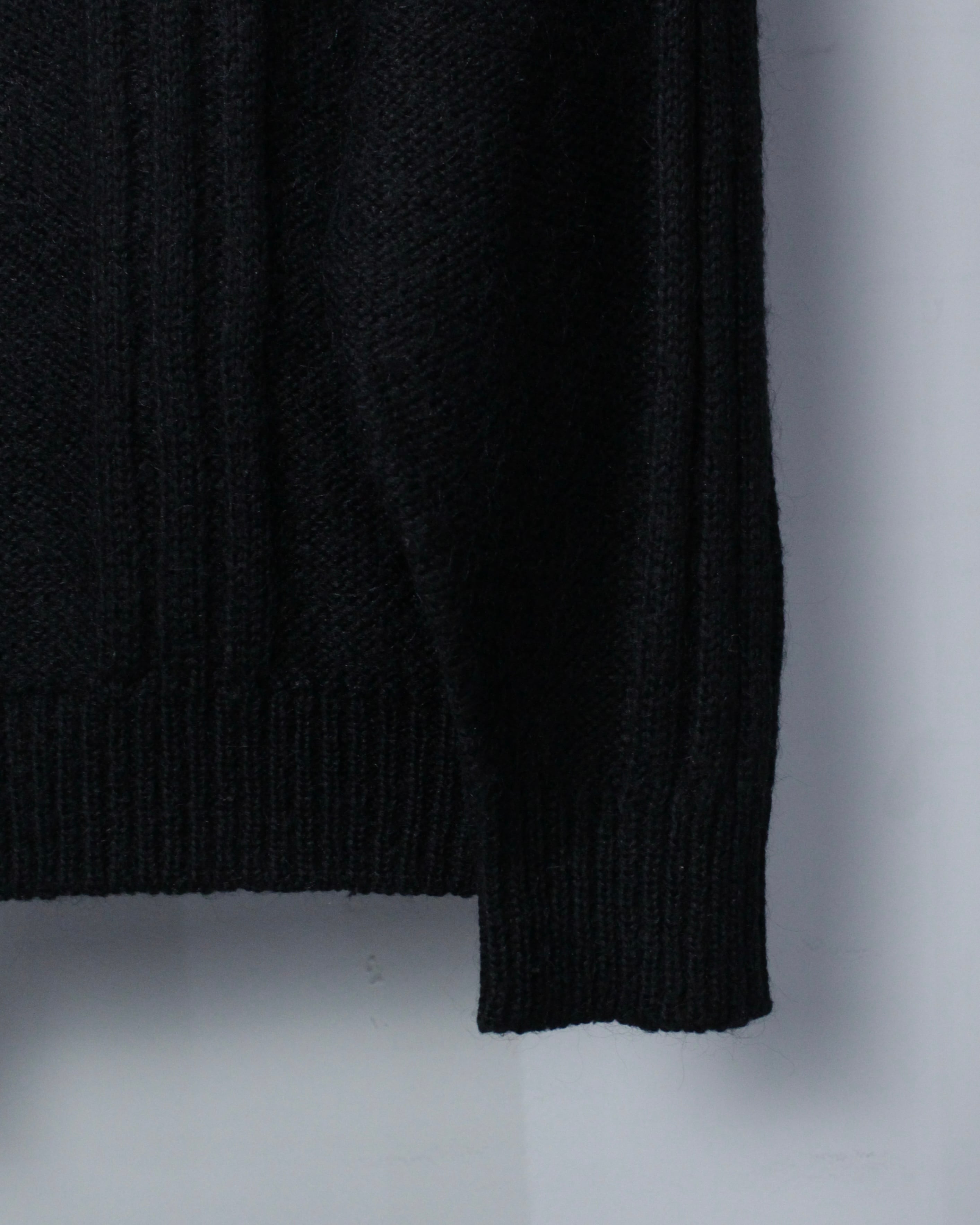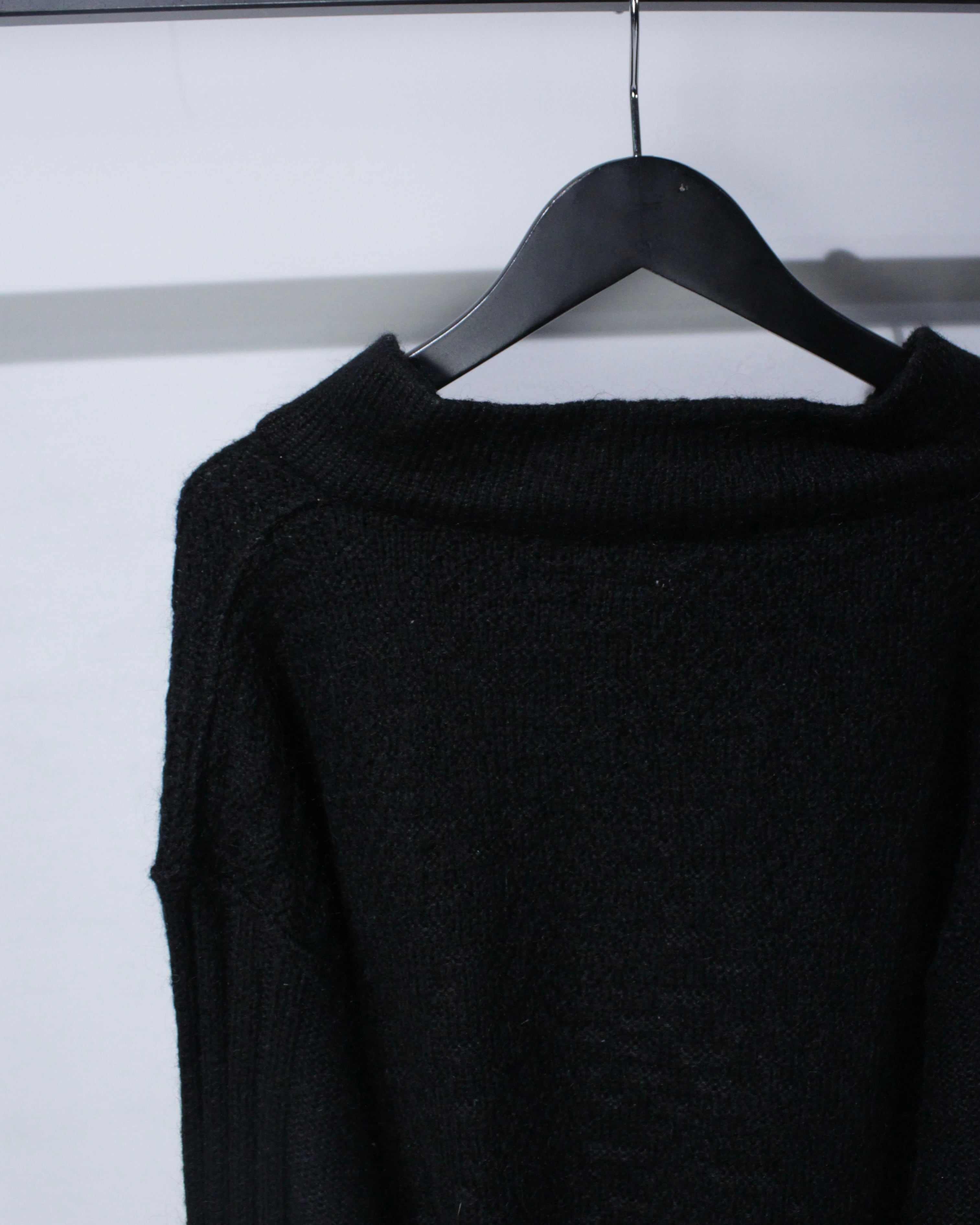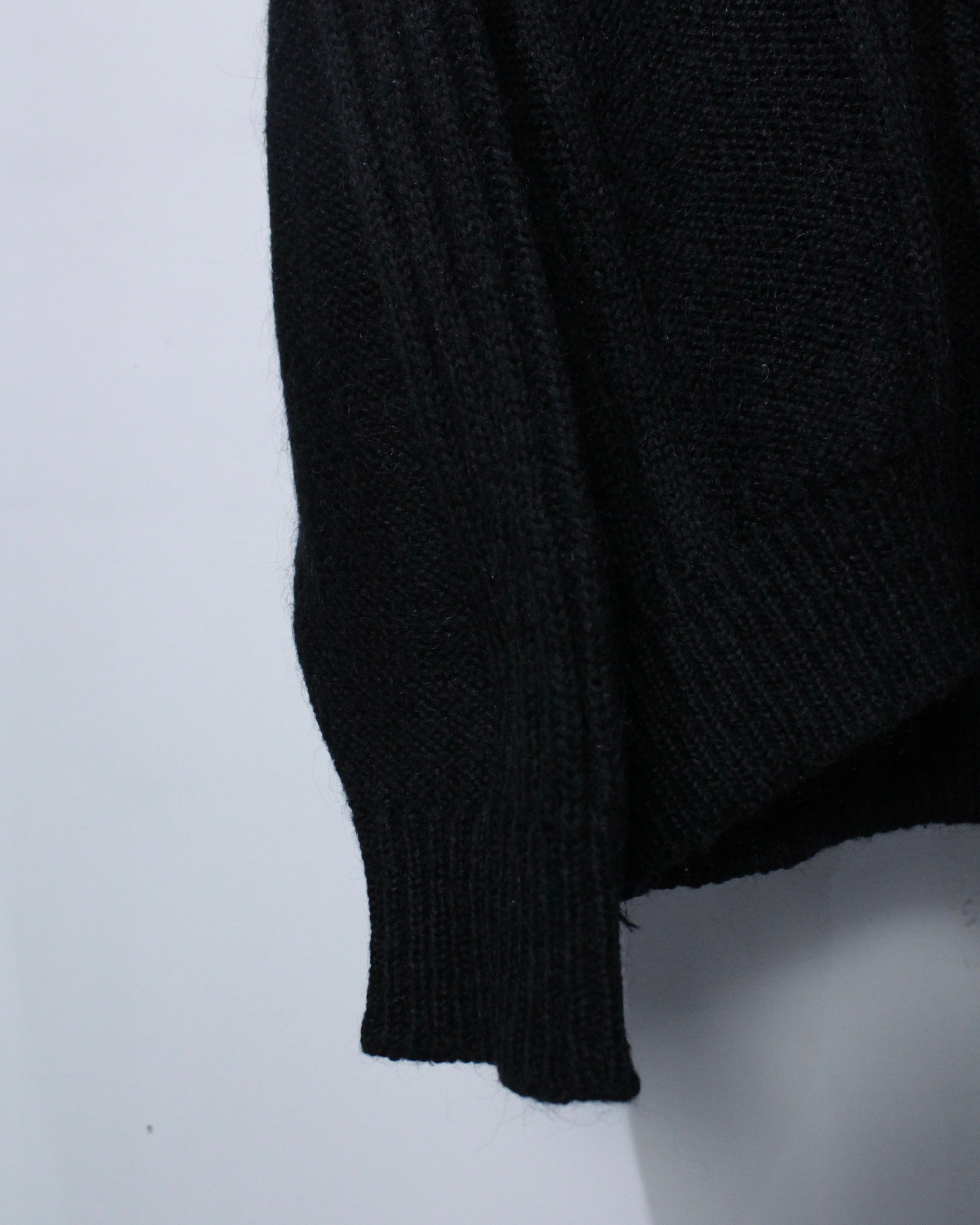 オールブラックながら動きと陰影がしっかり出る表情豊かな編み地で、シンプルになりすぎないのも魅力。ジャケットやブルゾンのインナーとしてはもちろん、一枚で着ても存在感があります。