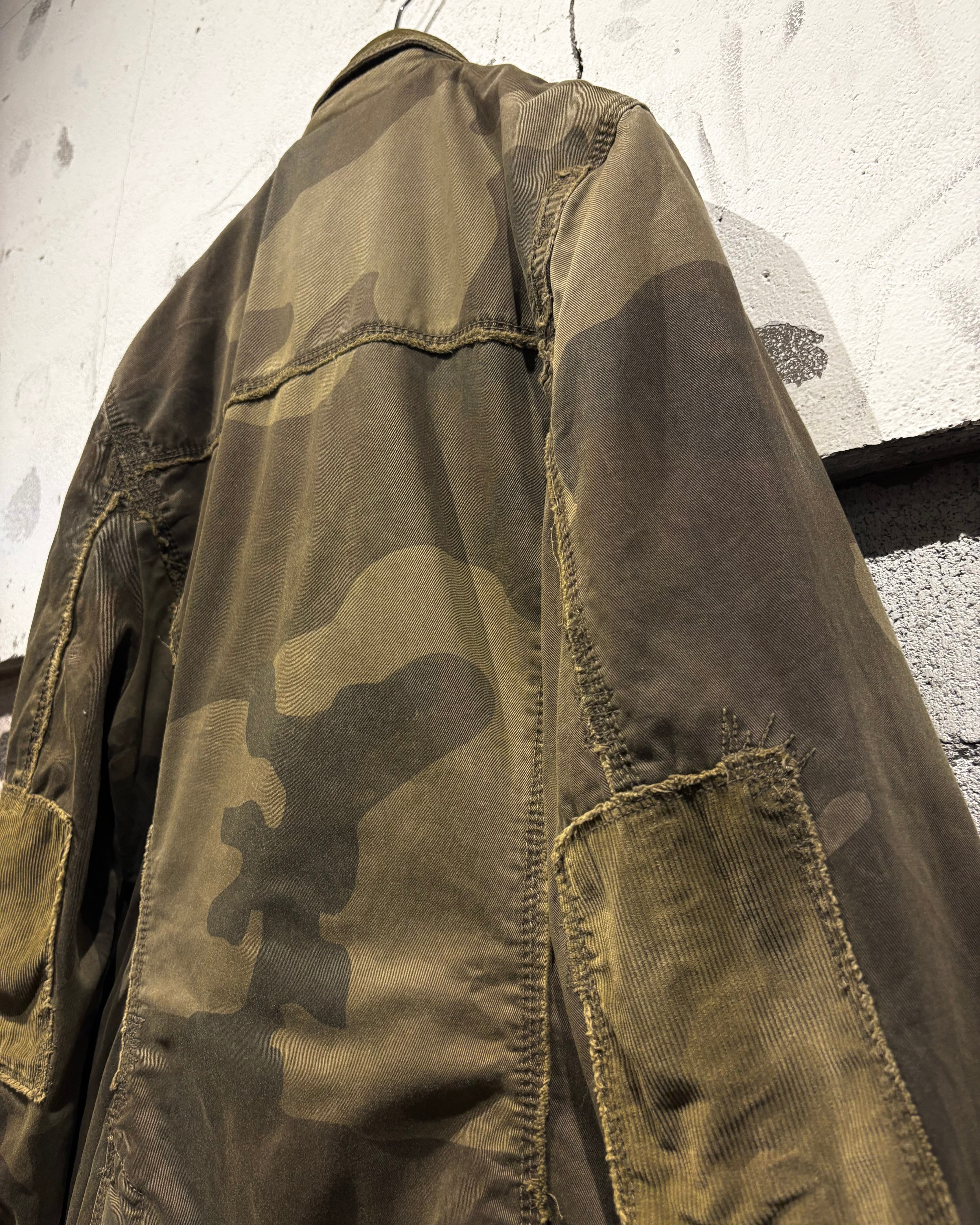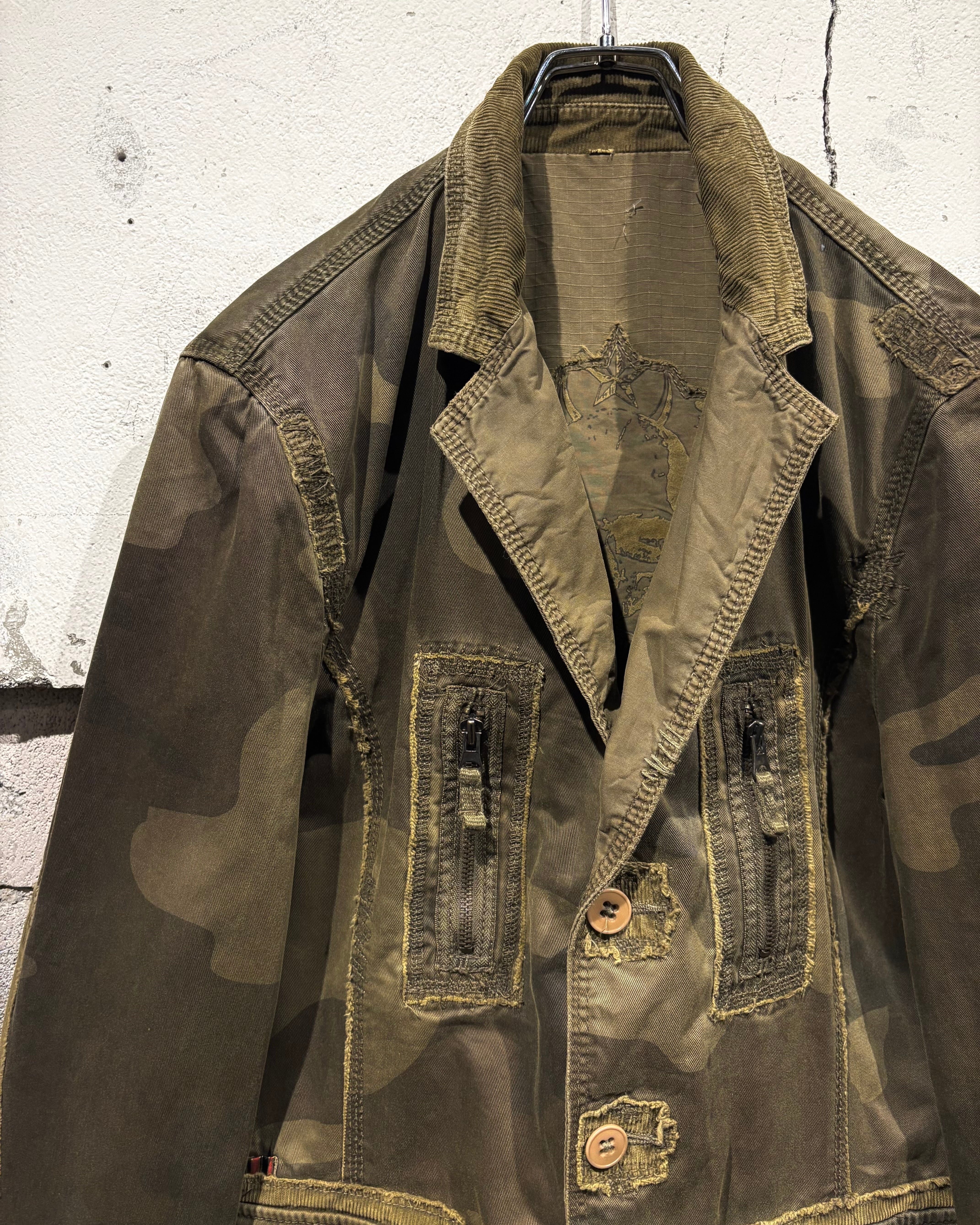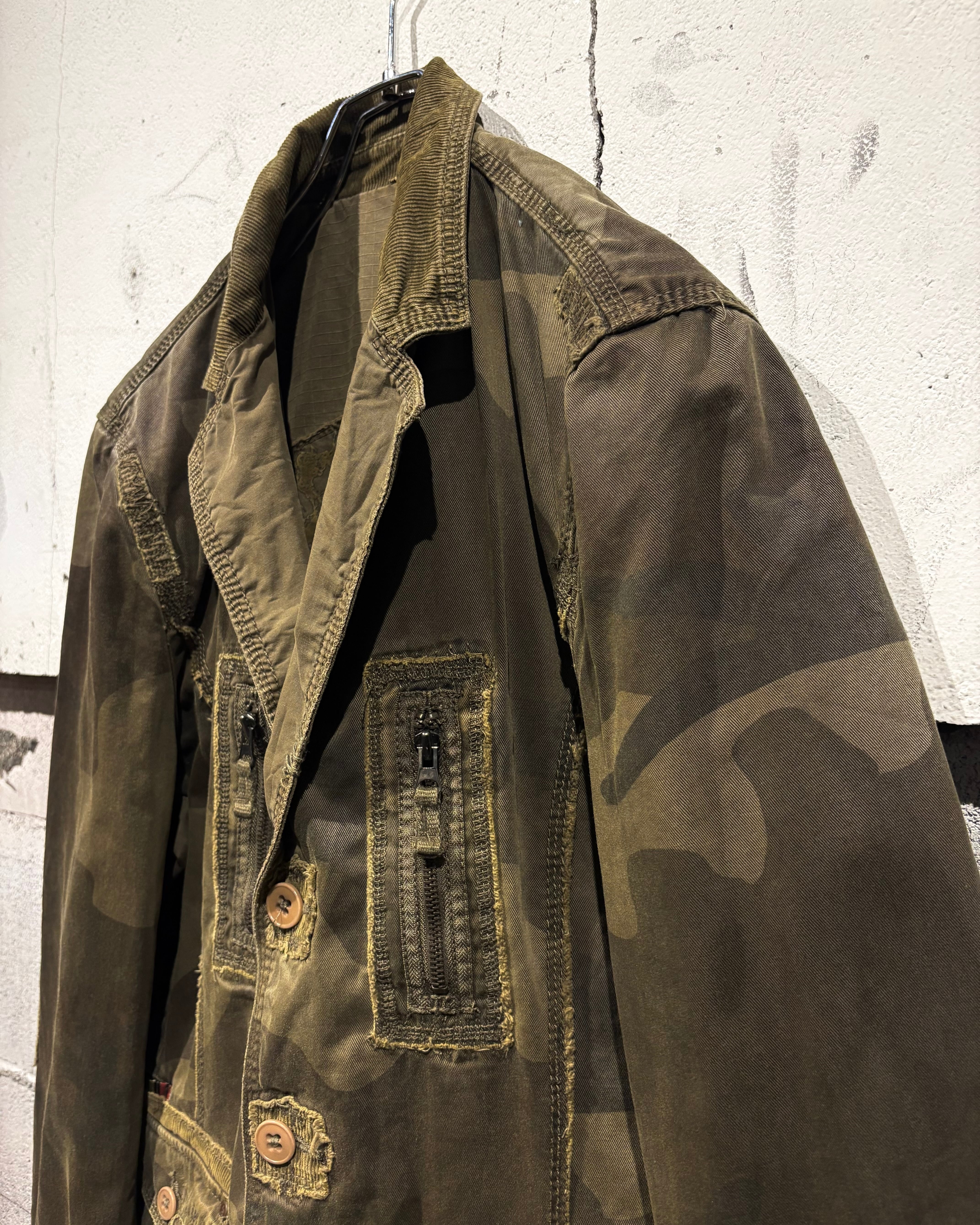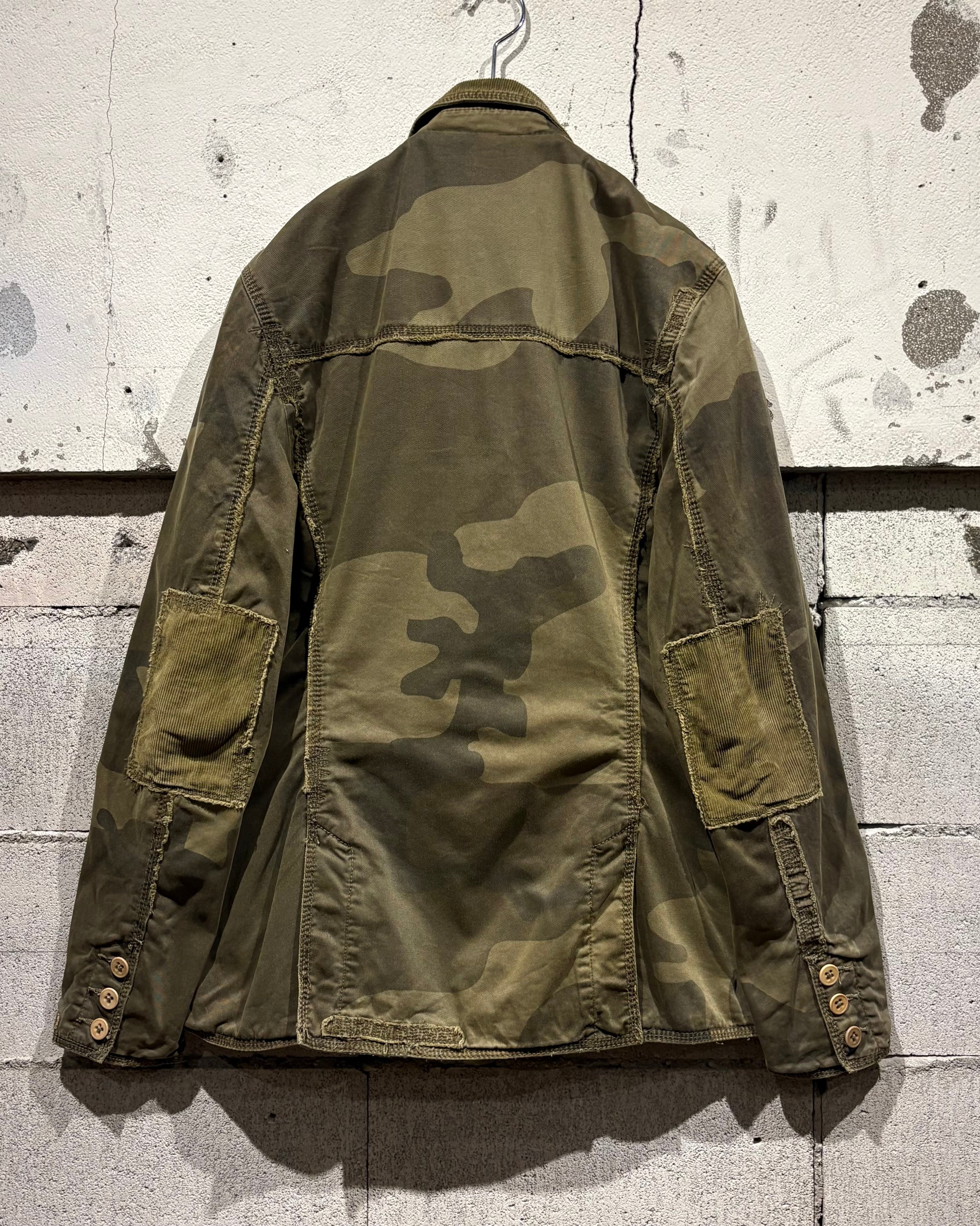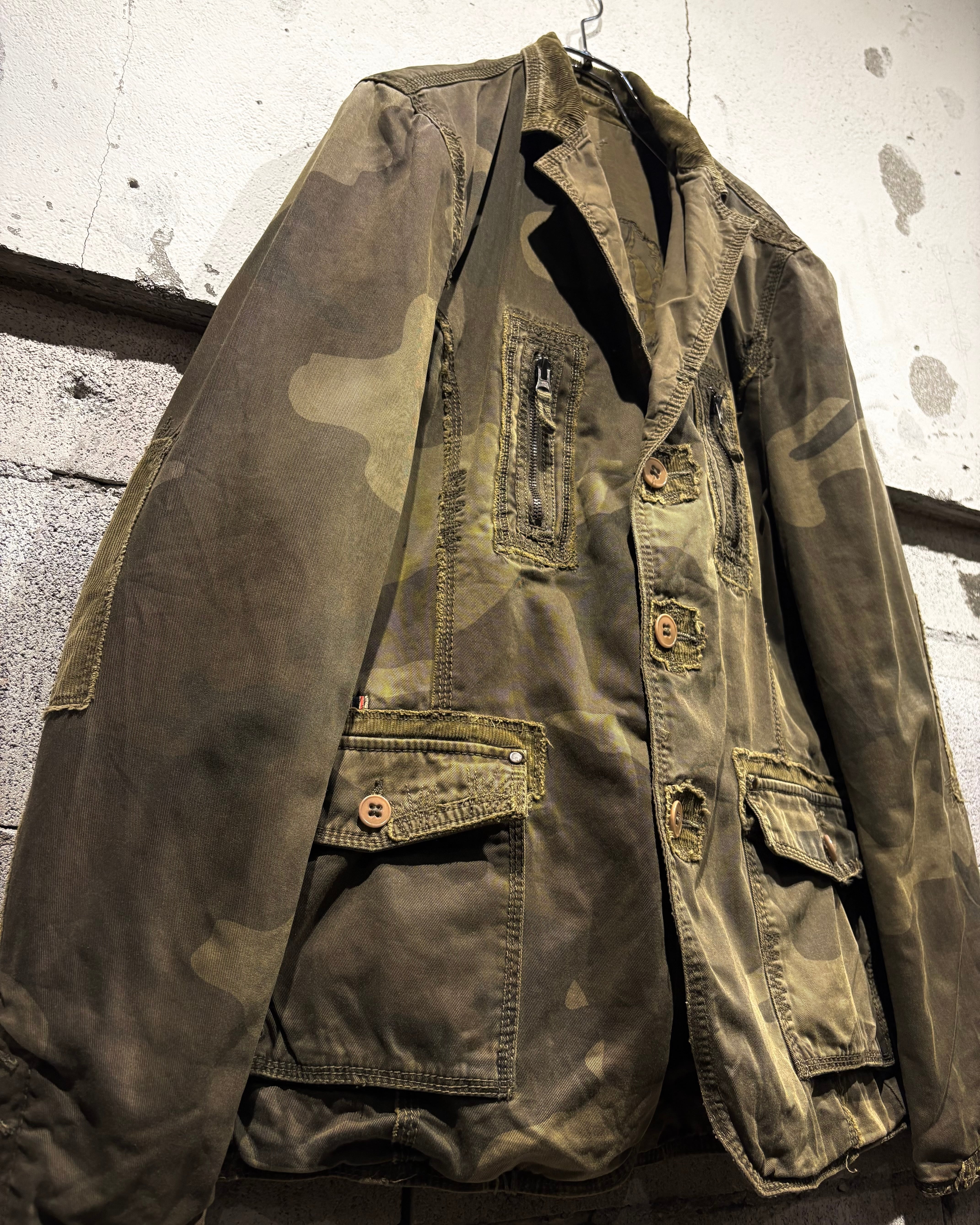 コシとしなやかさを併せ持ったコットンツイルのボディに、カモフラージュパターンを載せたテーラードジャケット。