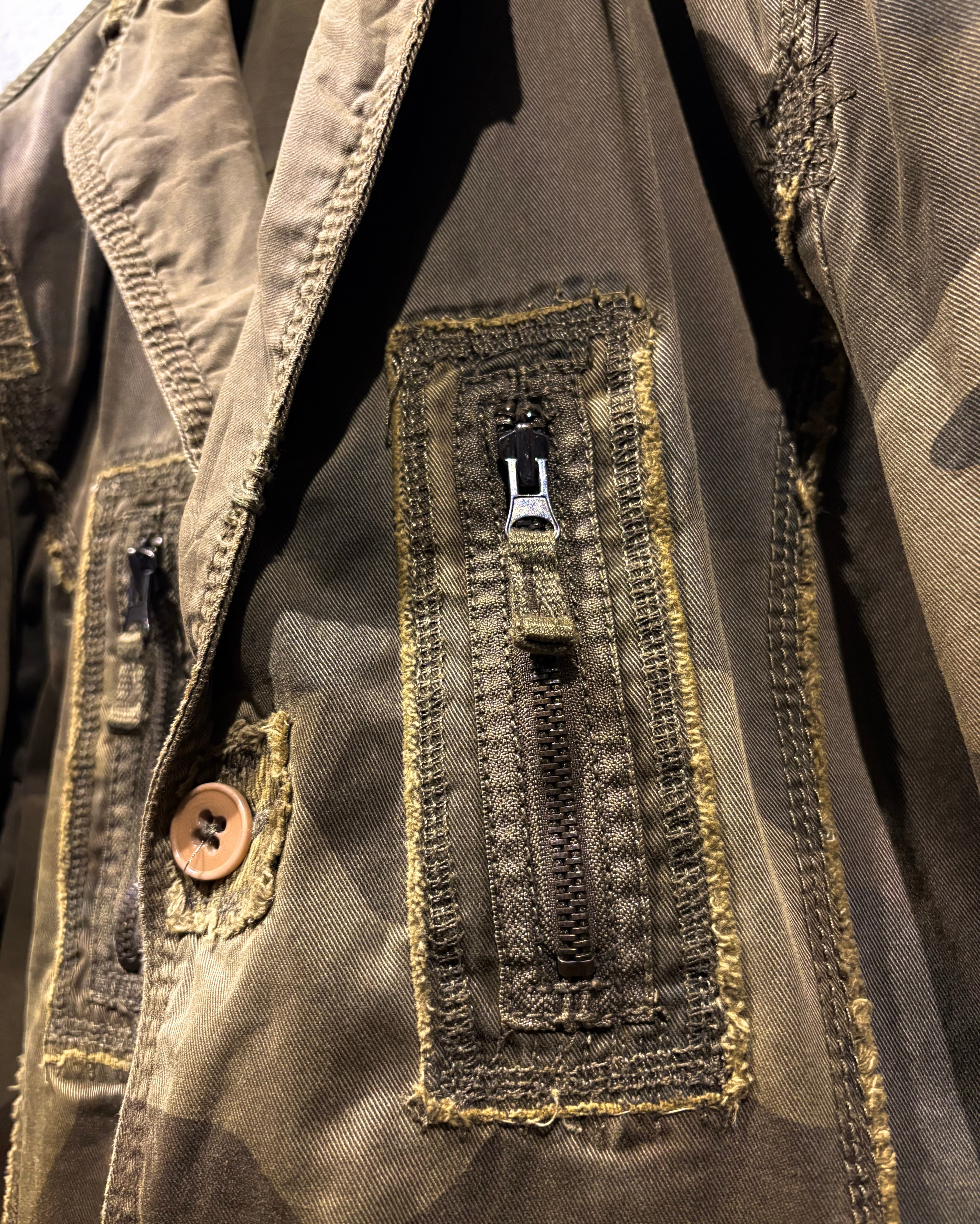 胸元に走るジップポケット、ラフに叩き付けたステッチワーク、インサドアウトのデザインなど、退廃的な要素も絶妙で、現代のファッションシーンでも色褪せません。