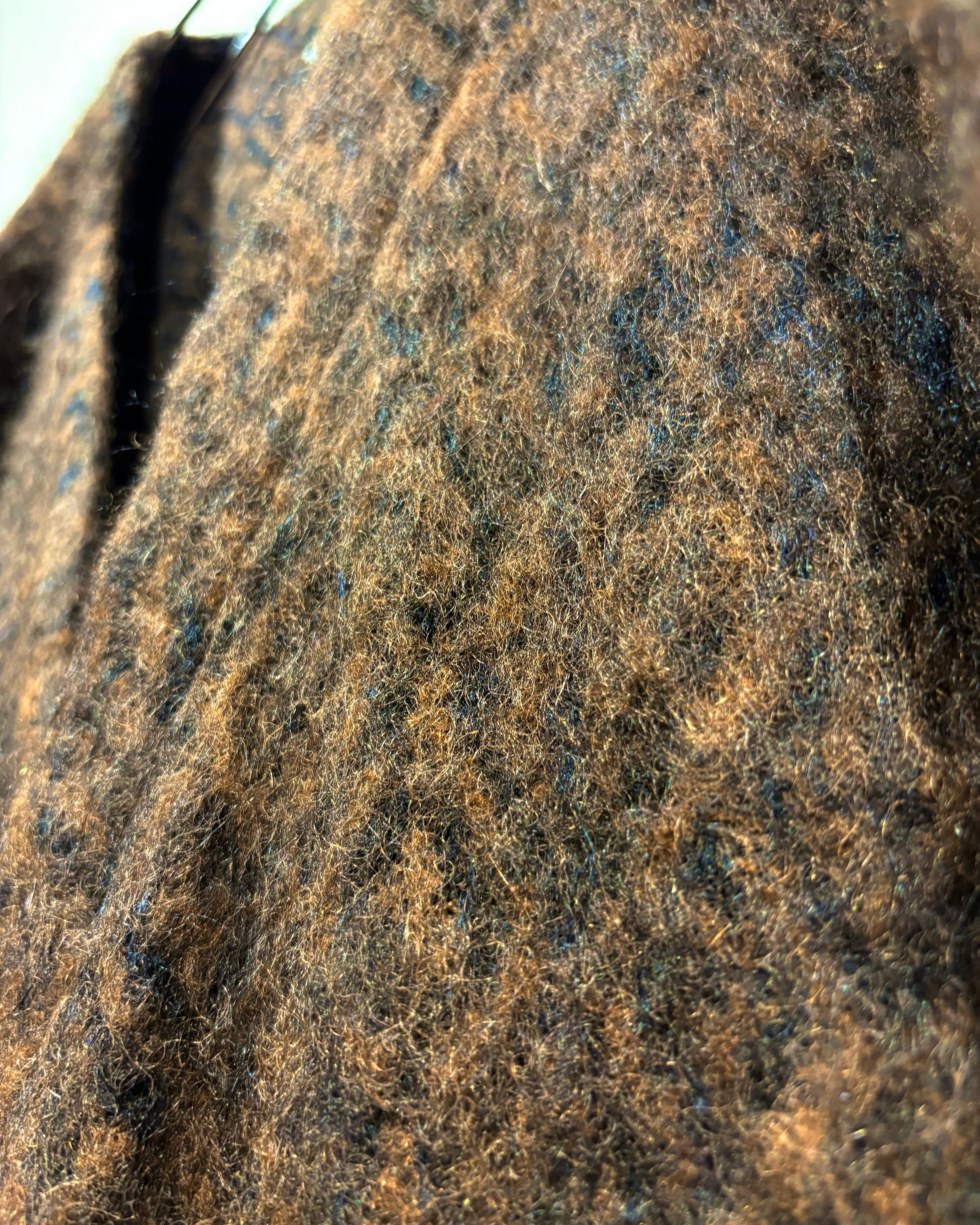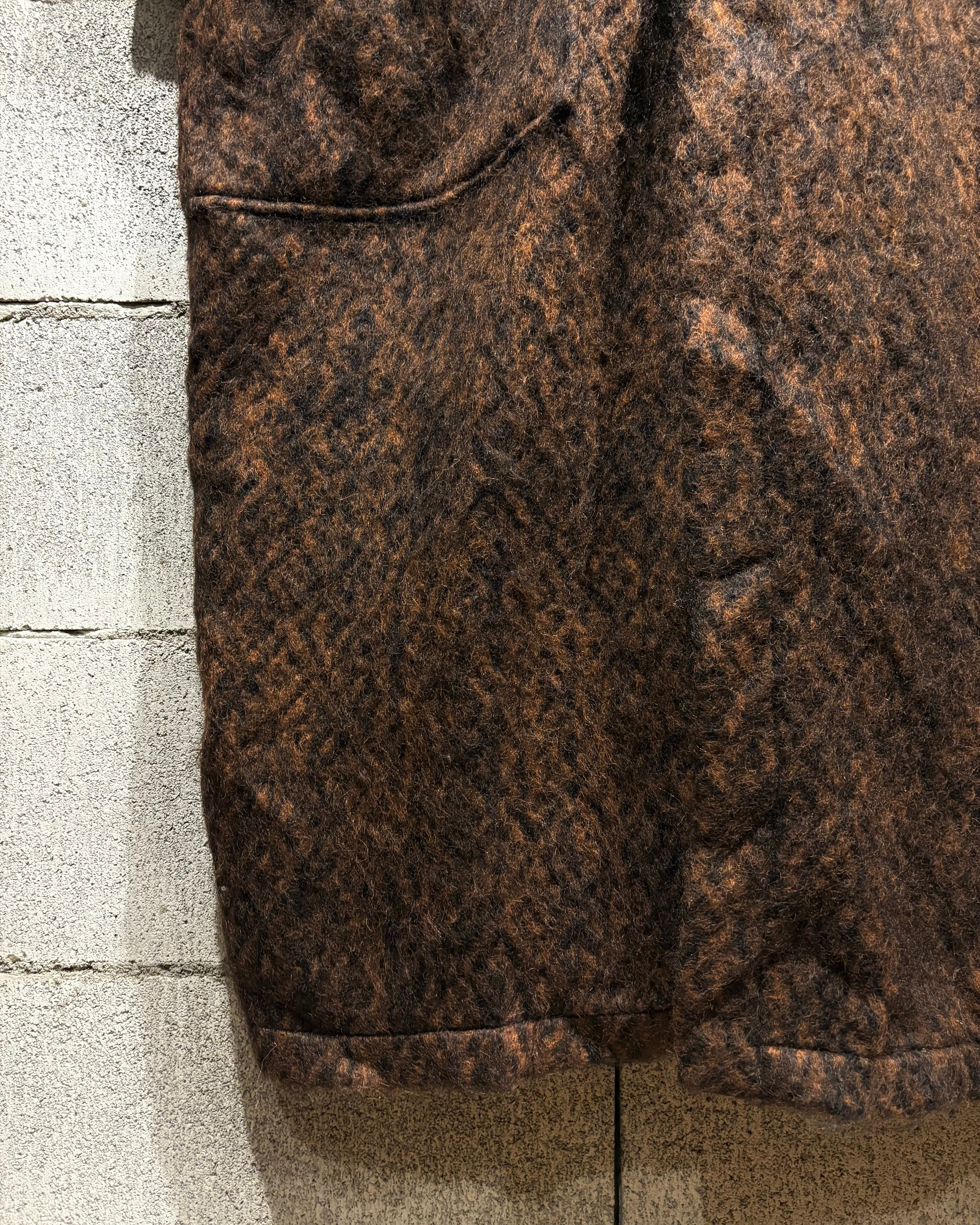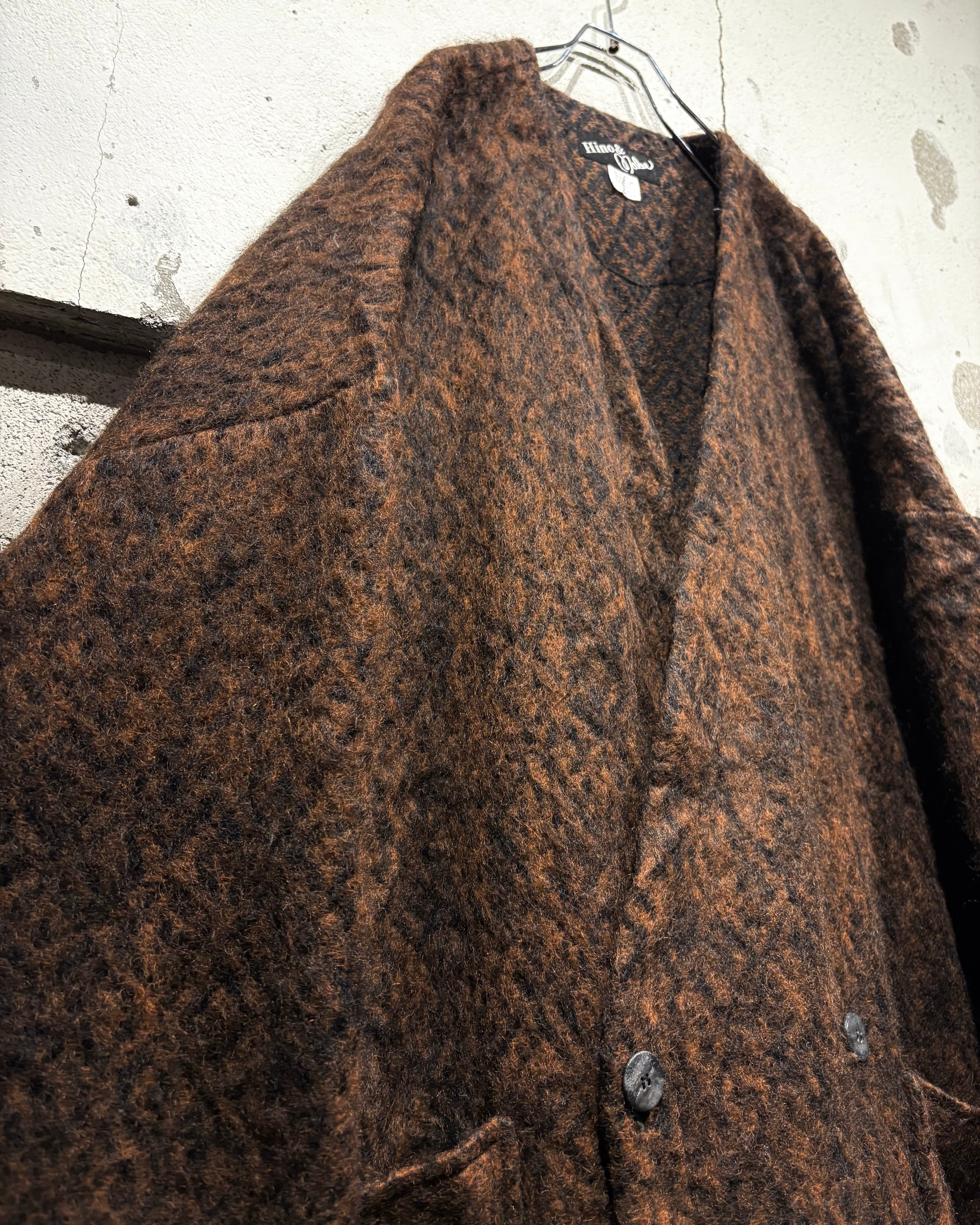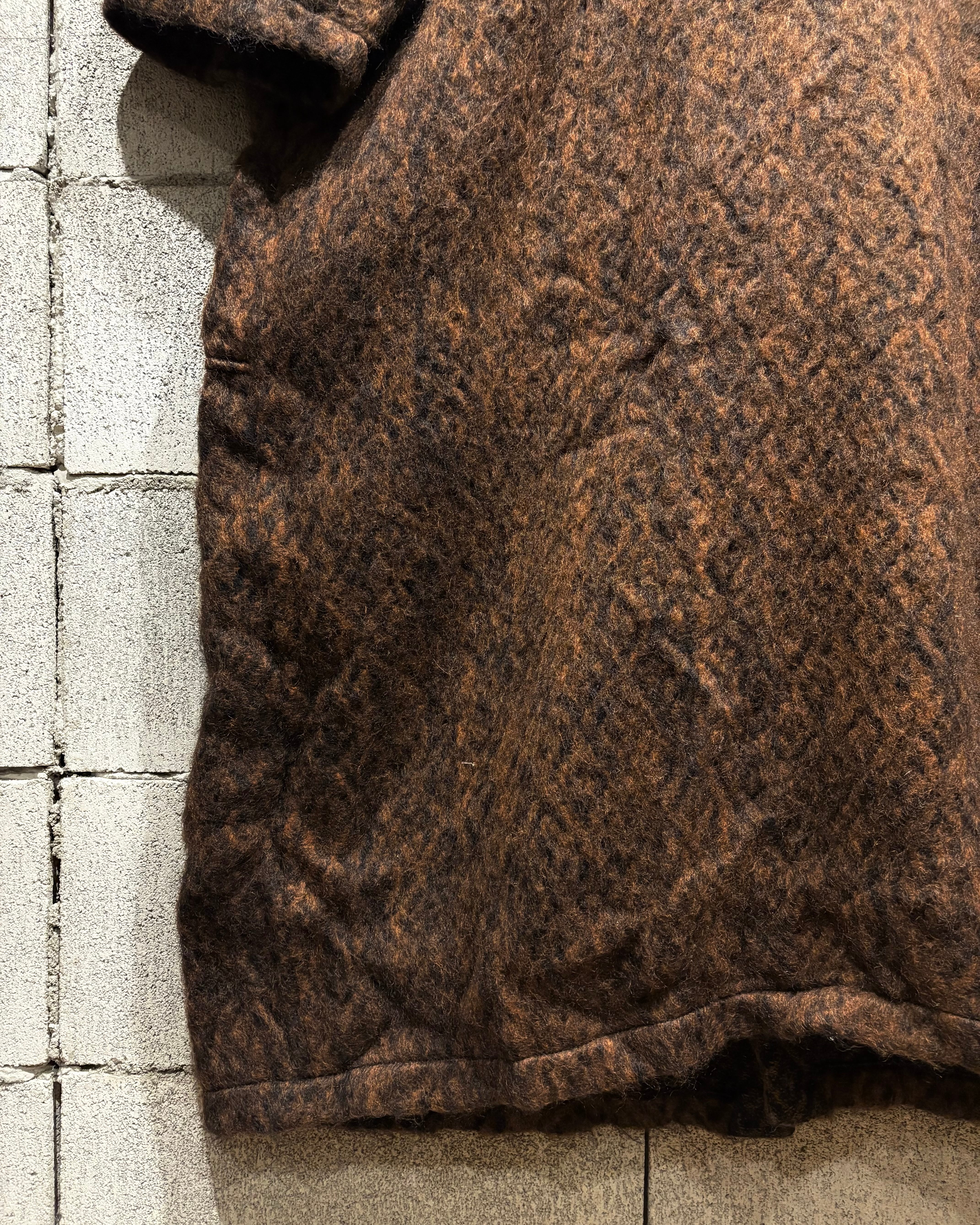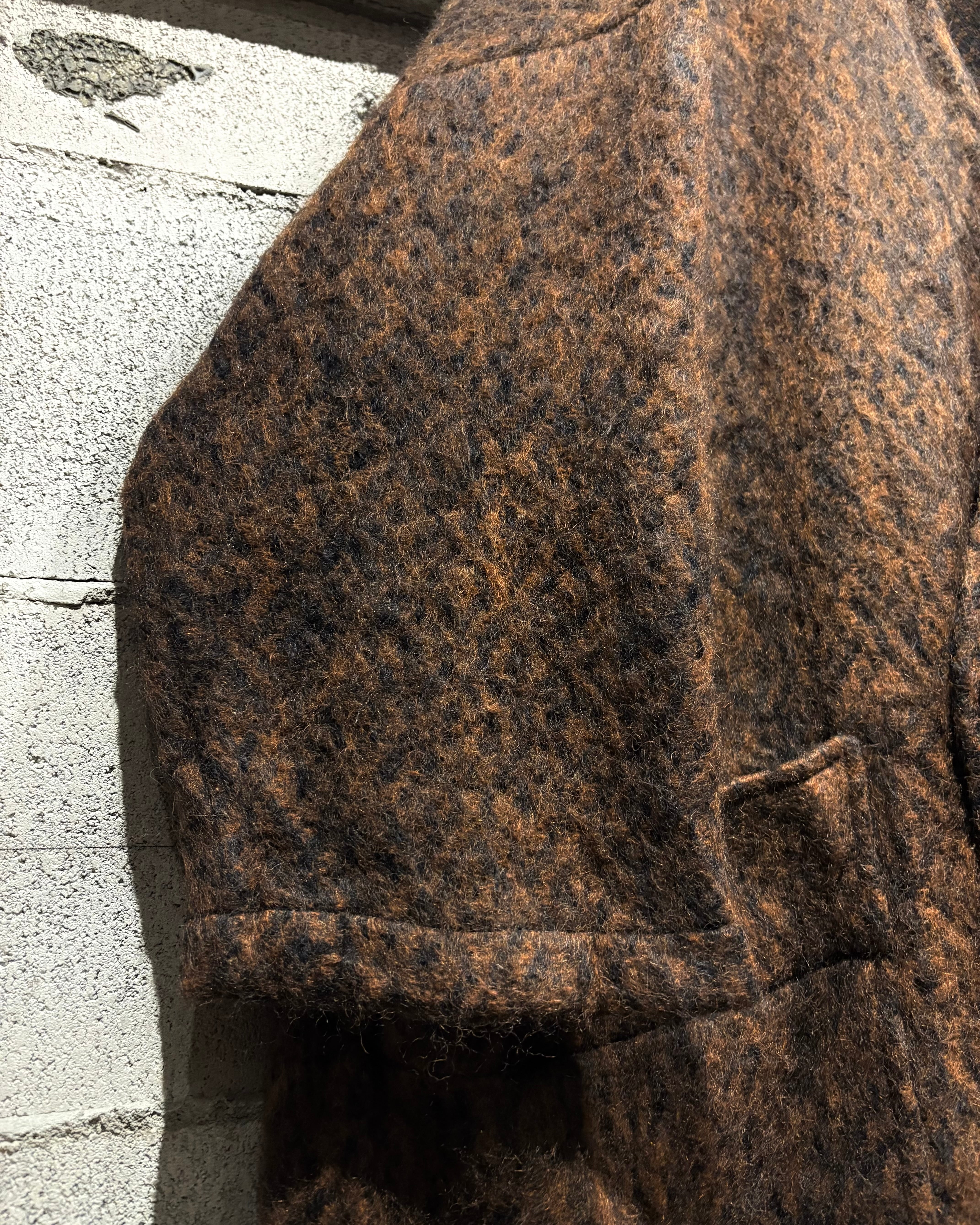 ブラウン×ブラックの色調が深く重なり合い、モヘア混の起毛感が立体的な陰影をつくり出し雰囲気を漂わせます。