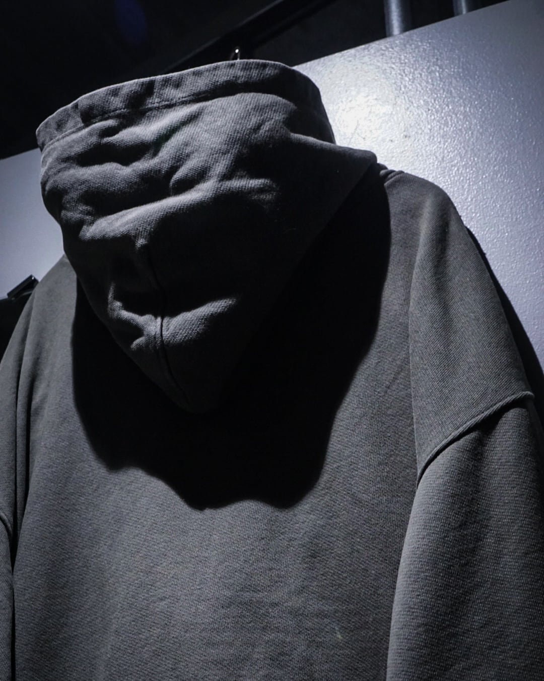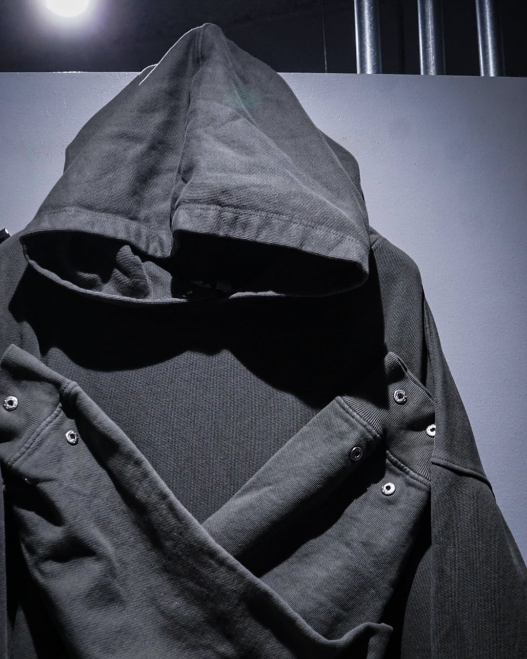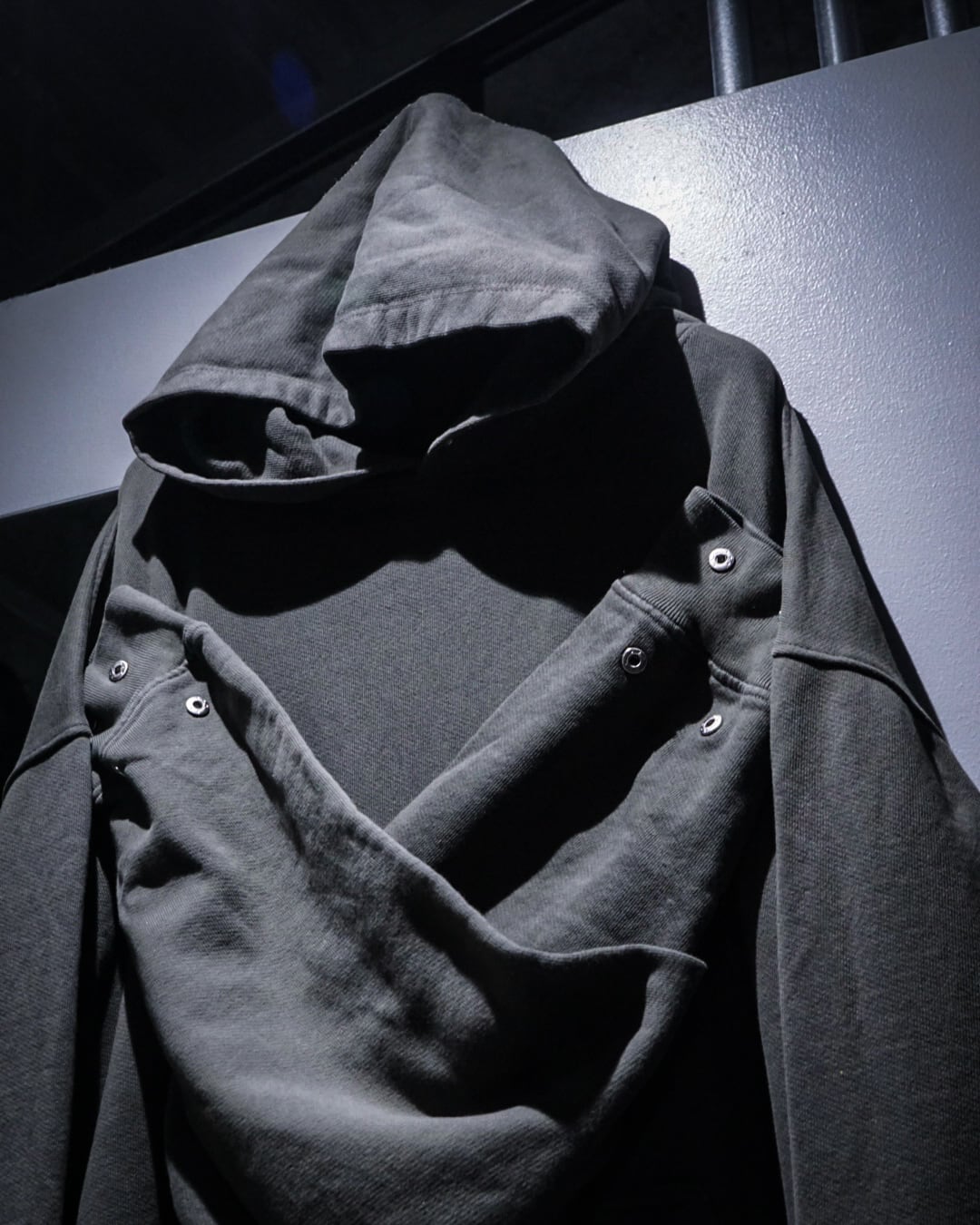 ベースは王道のスウェットフーディながら、随所のボタン使いや計算された立体感でただのパーカーで終わらないところが魅力。シンプルなボディに抑えた色味だからこそ、デザインの奇抜さが収まり、モードにもストリートにも馴染んでいきます。