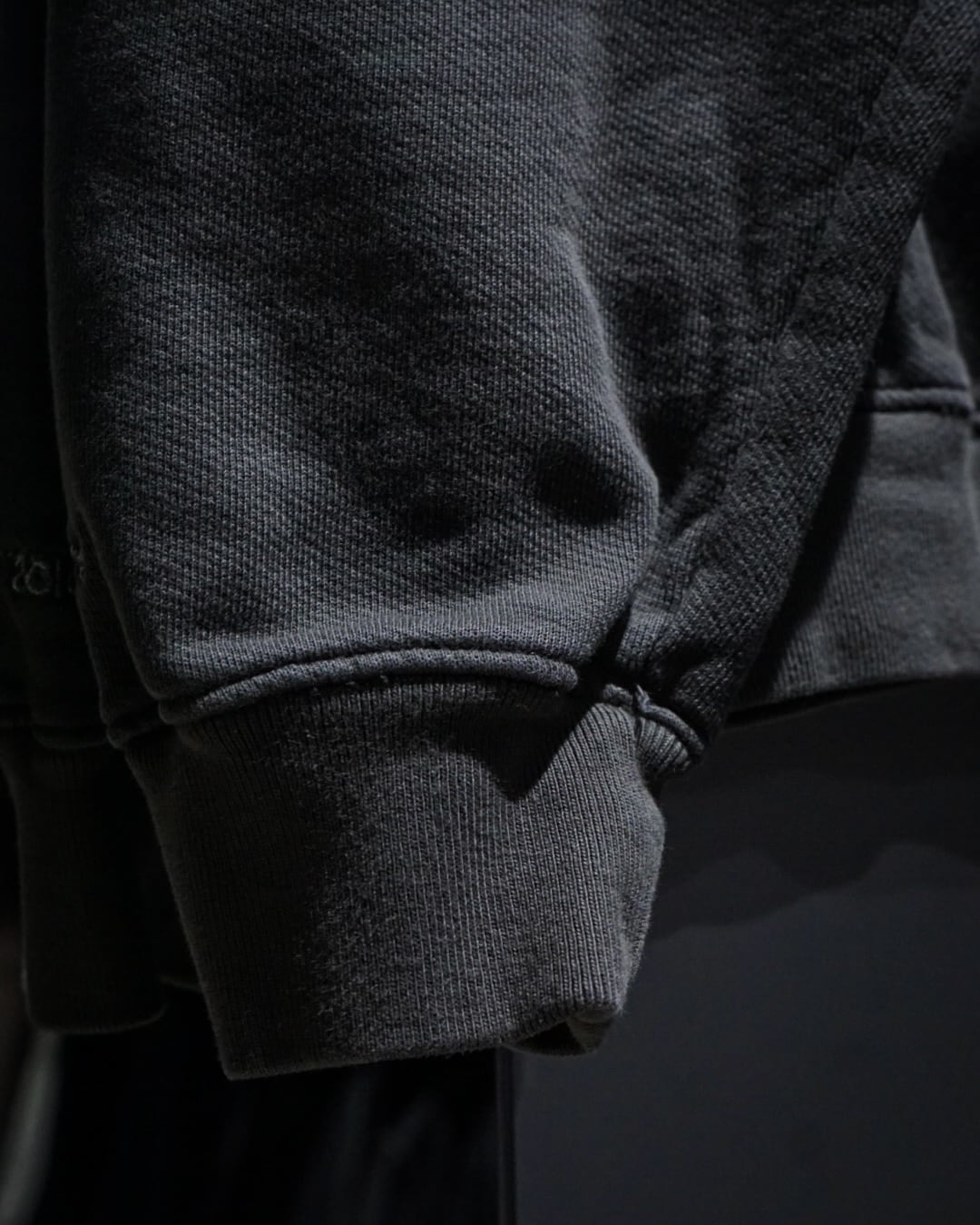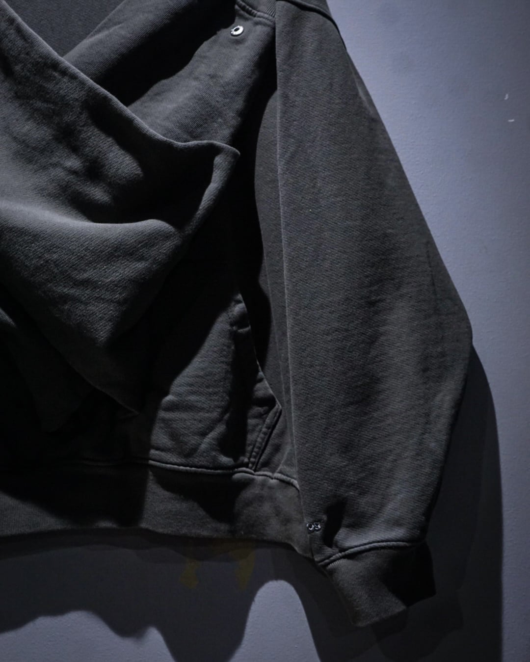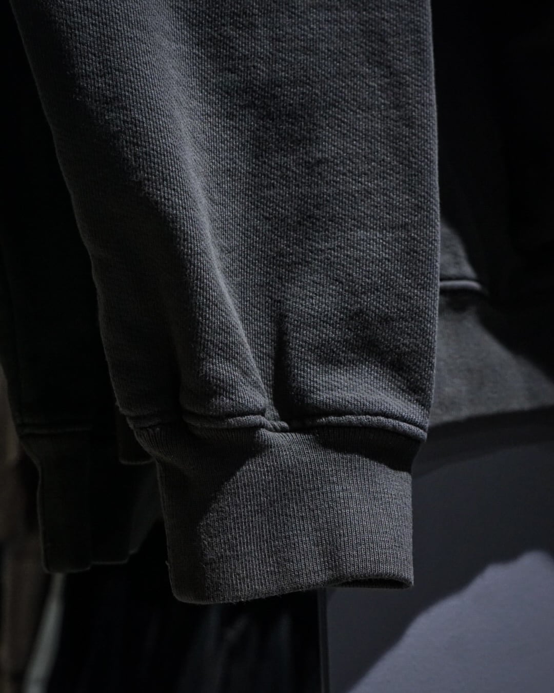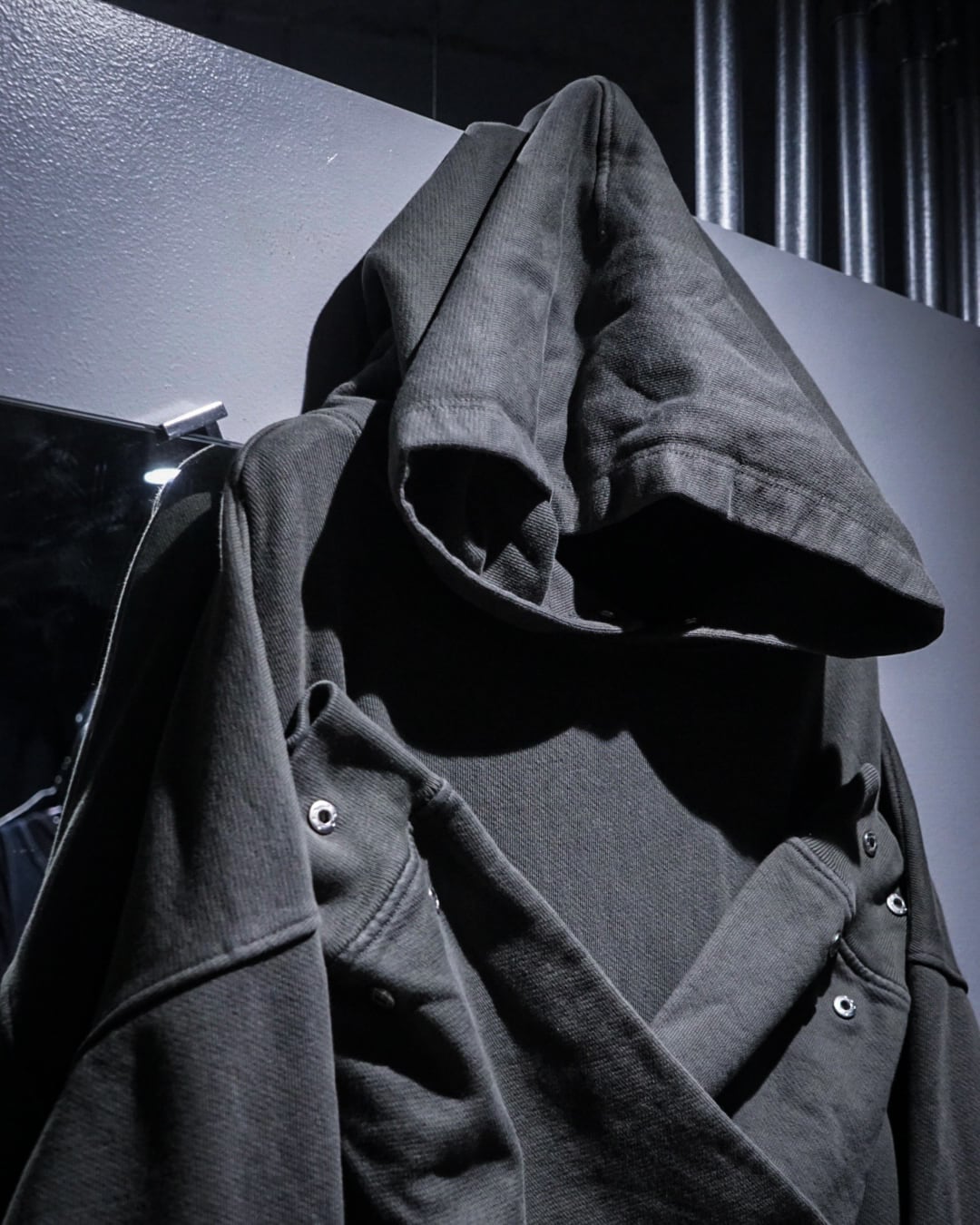ベースは王道のスウェットフーディながら、随所のボタン使いや計算された立体感でただのパーカーで終わらないところが魅力。シンプルなボディに抑えた色味だからこそ、デザインの奇抜さが収まり、モードにもストリートにも馴染んでいきます。
