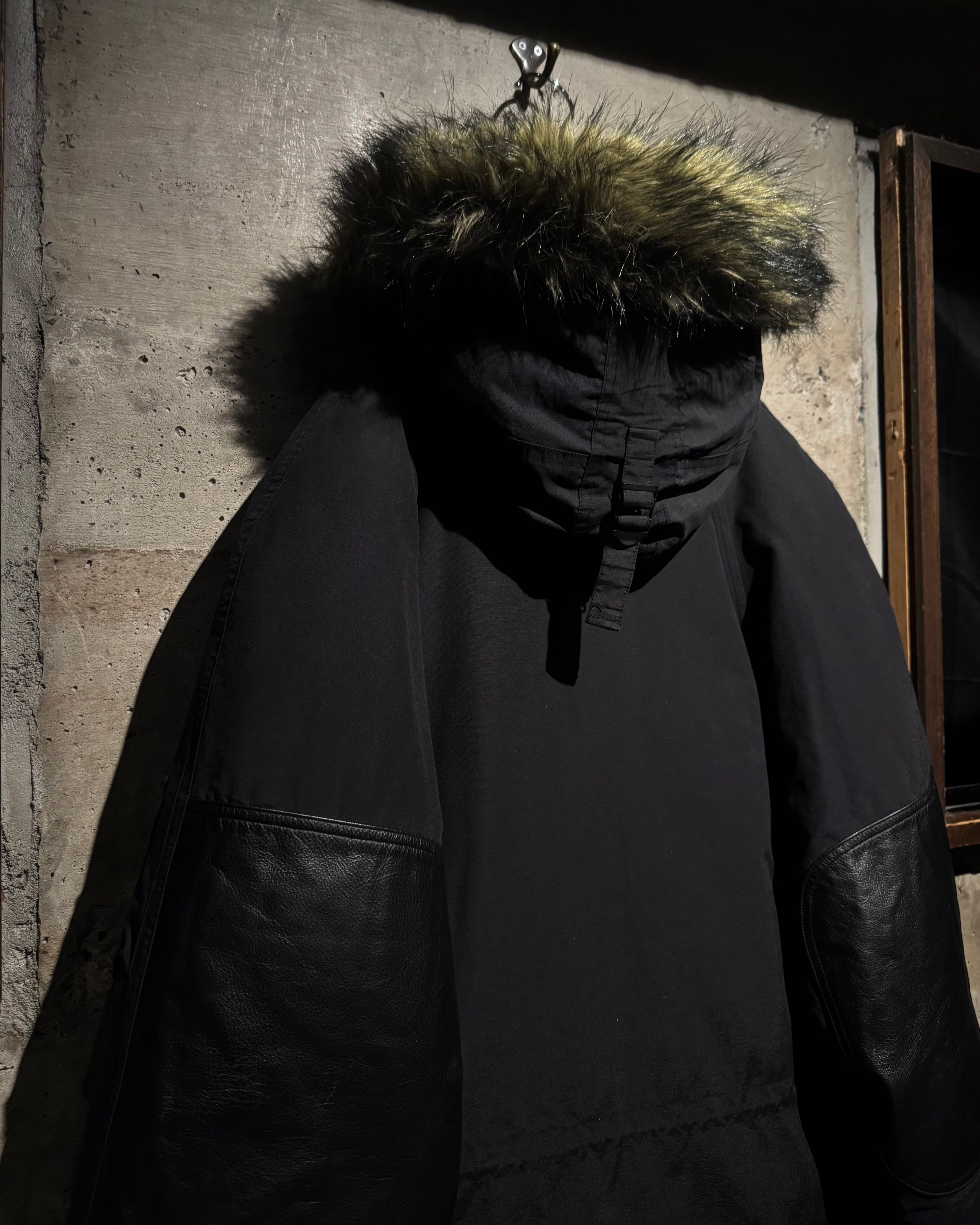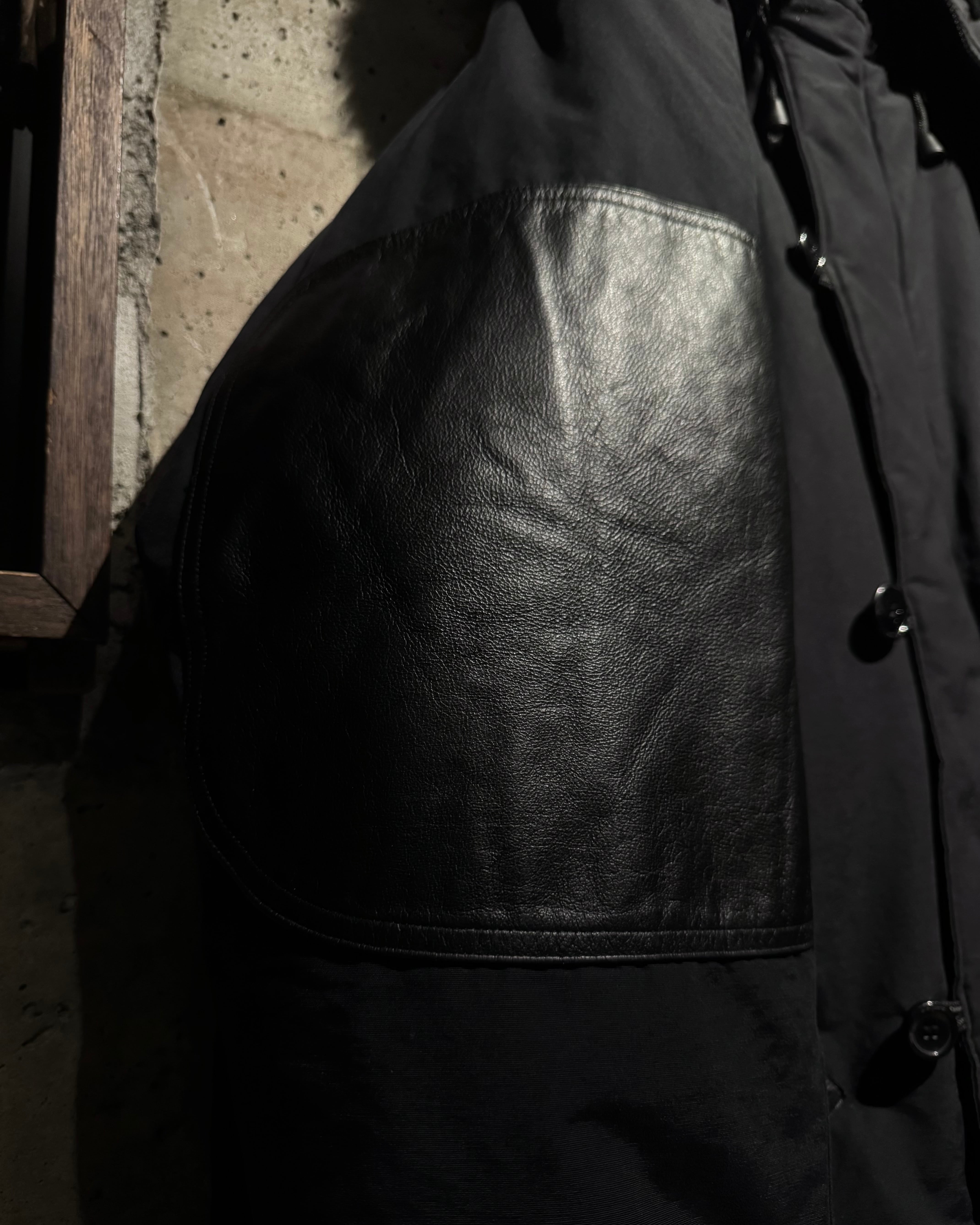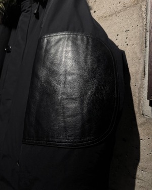 まず目を惹くのは、利便性とタフな雰囲気を併せ持つレザーの切り替え。ナイロンシェルとのコントラストが強く、アウター全体に無骨な迫力を与えています。
