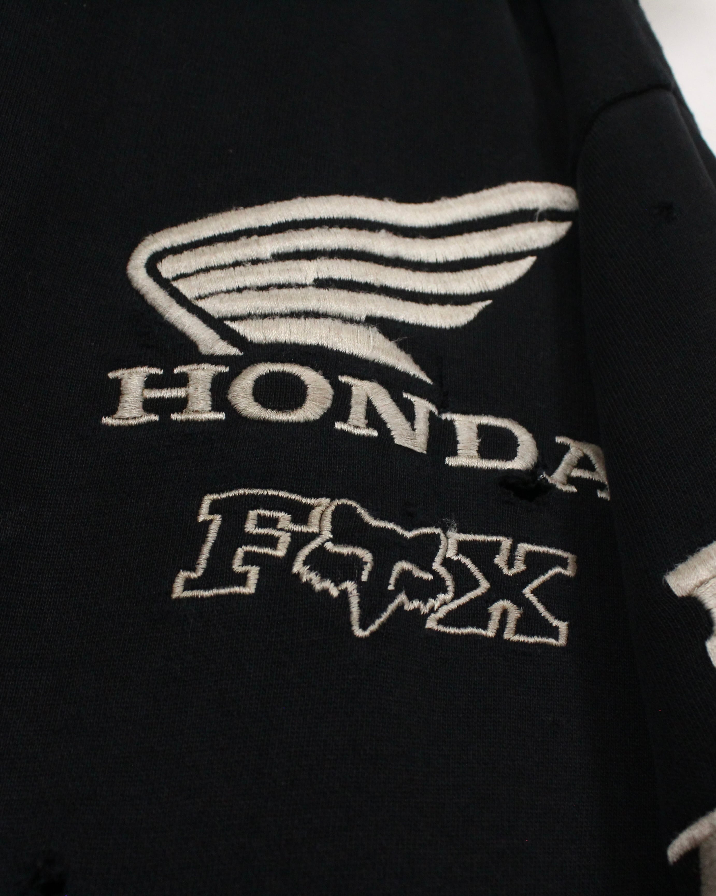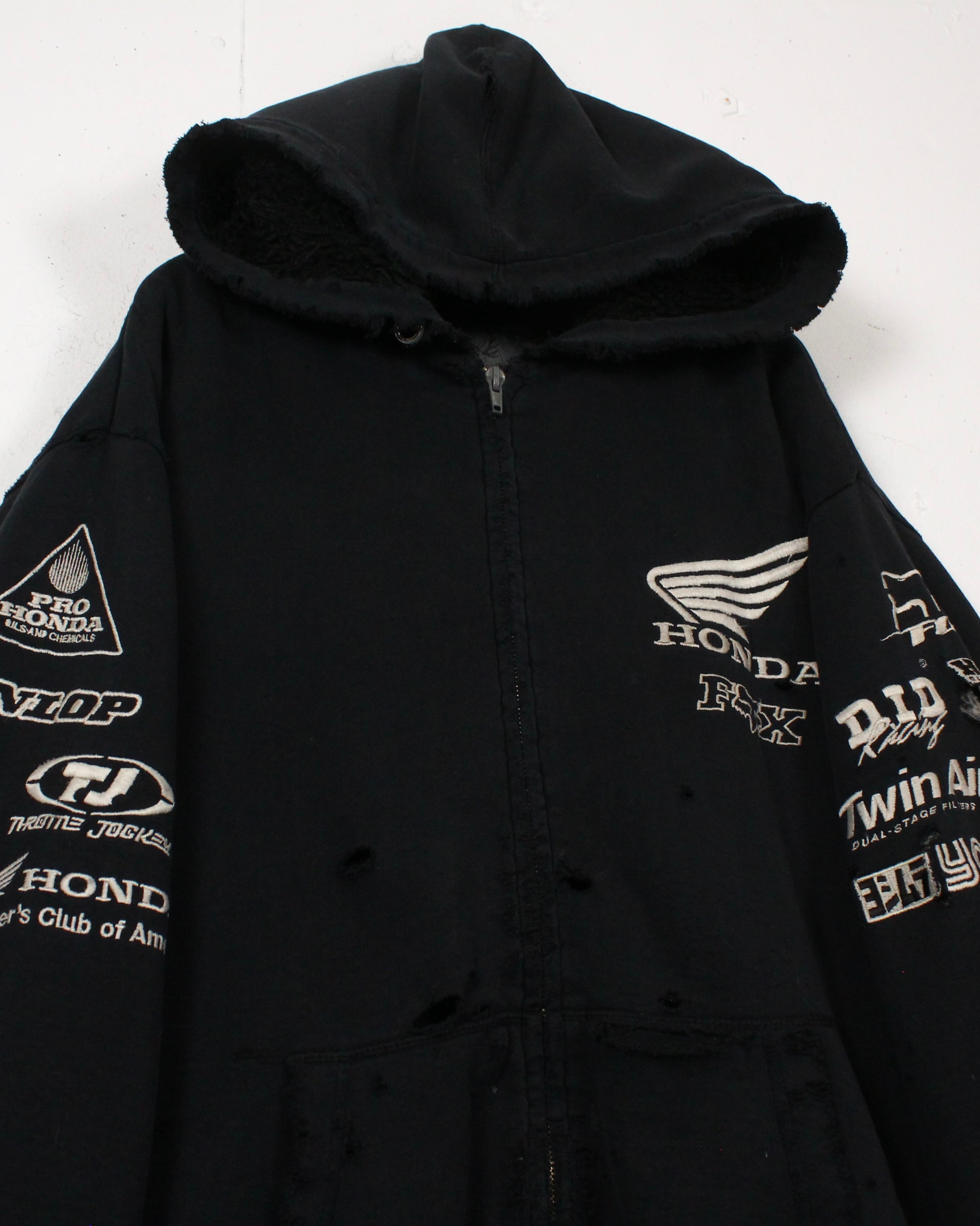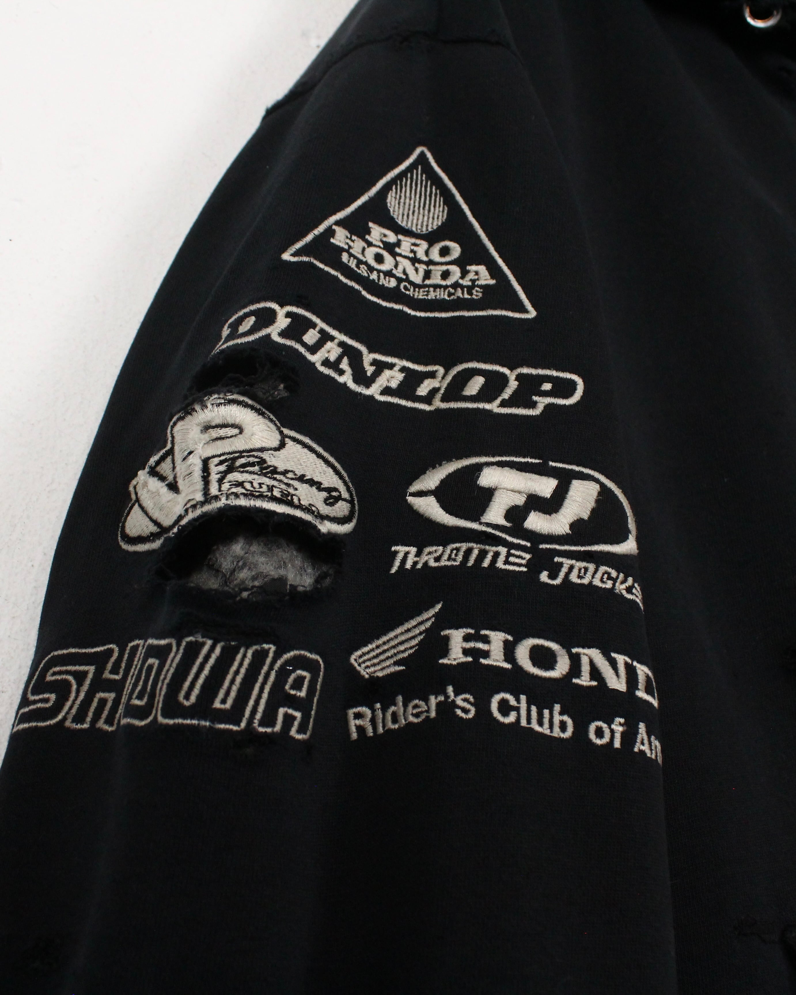 両袖に大胆に走るのは、Honda、Dunlop、Yoshimura、Renthal など企業ロゴを刺繍で落とし込んだ、圧巻のレーシング仕様の1着。