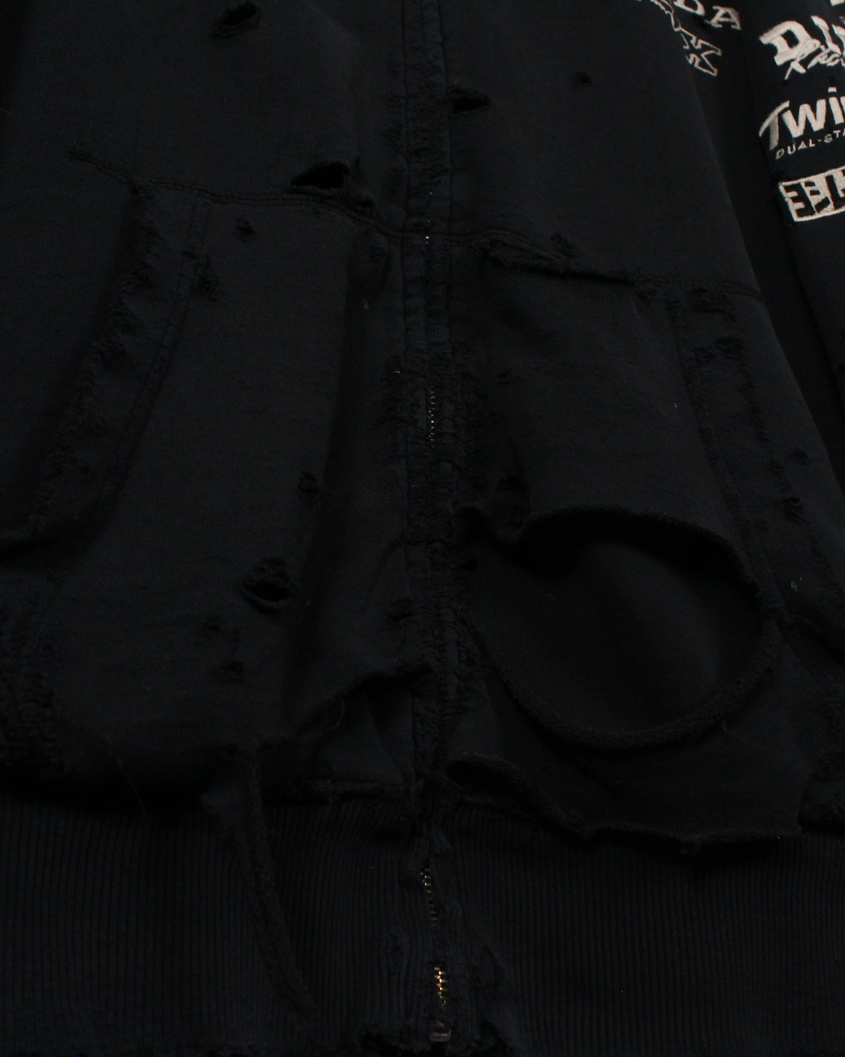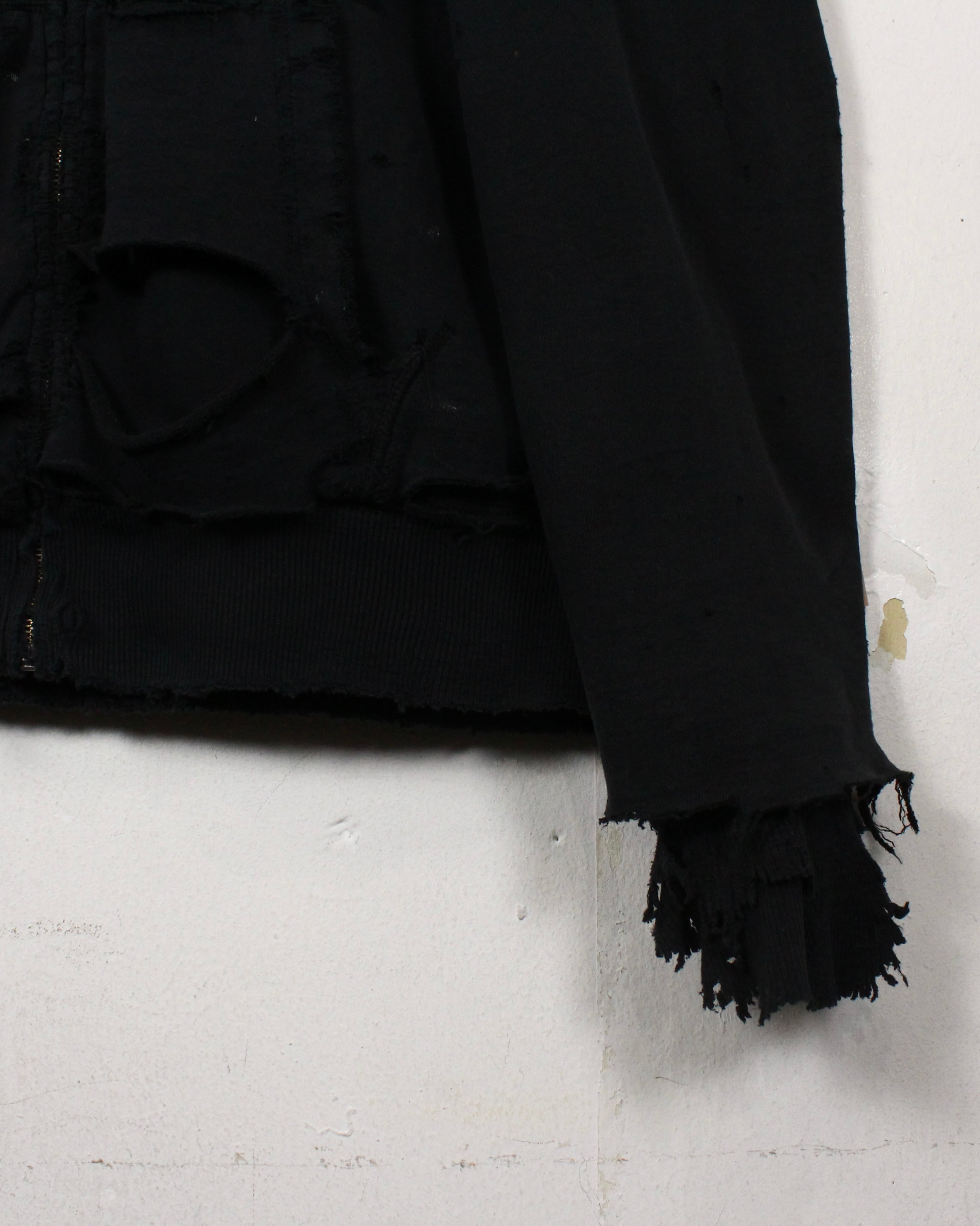 袖や裾に走るダメージも最高で、着込まれたスウェット特有のヤレ感がむしろ魅力に直結。新品では出せないリアルなボロが、ストリートのムードを一段深く引き上げます。