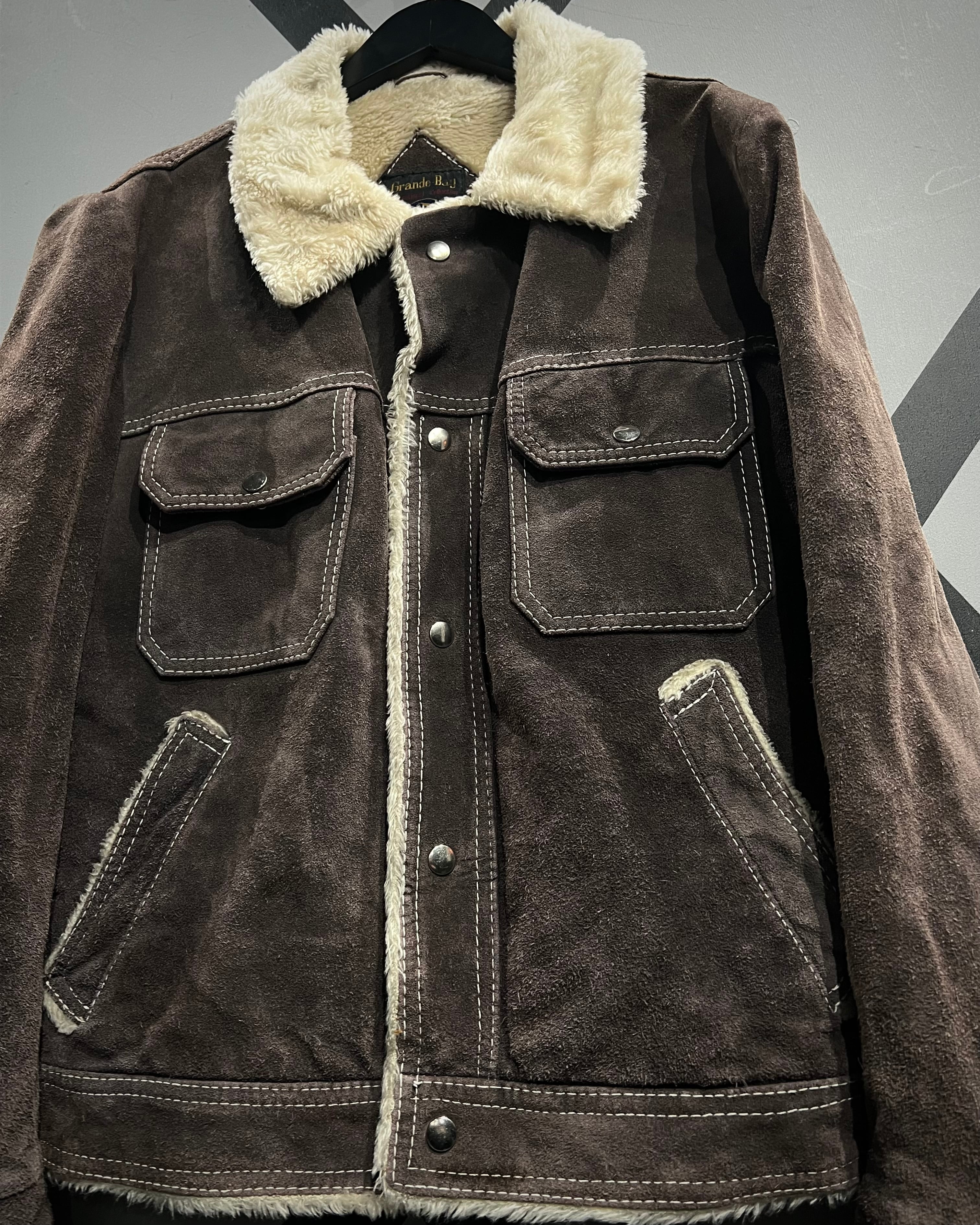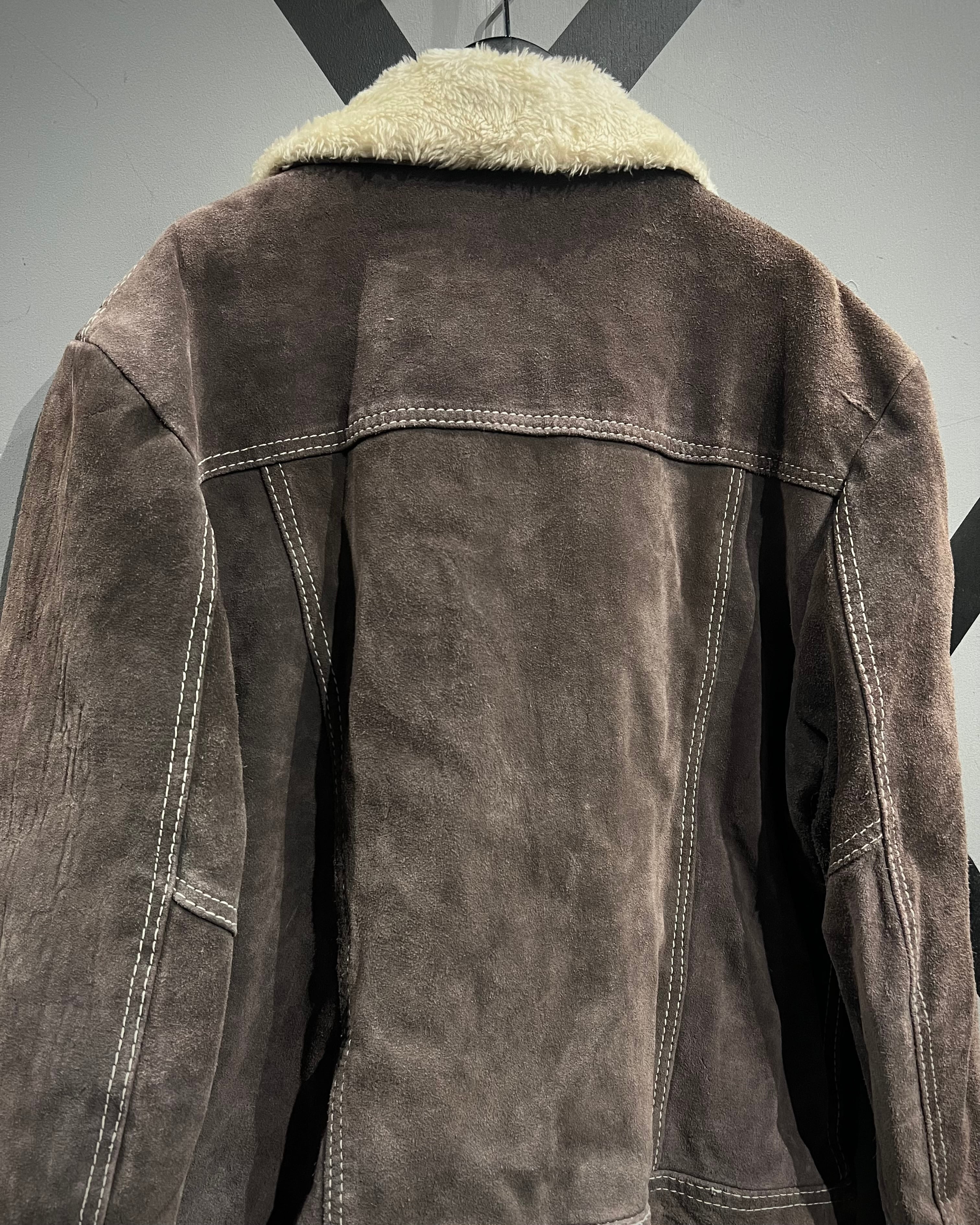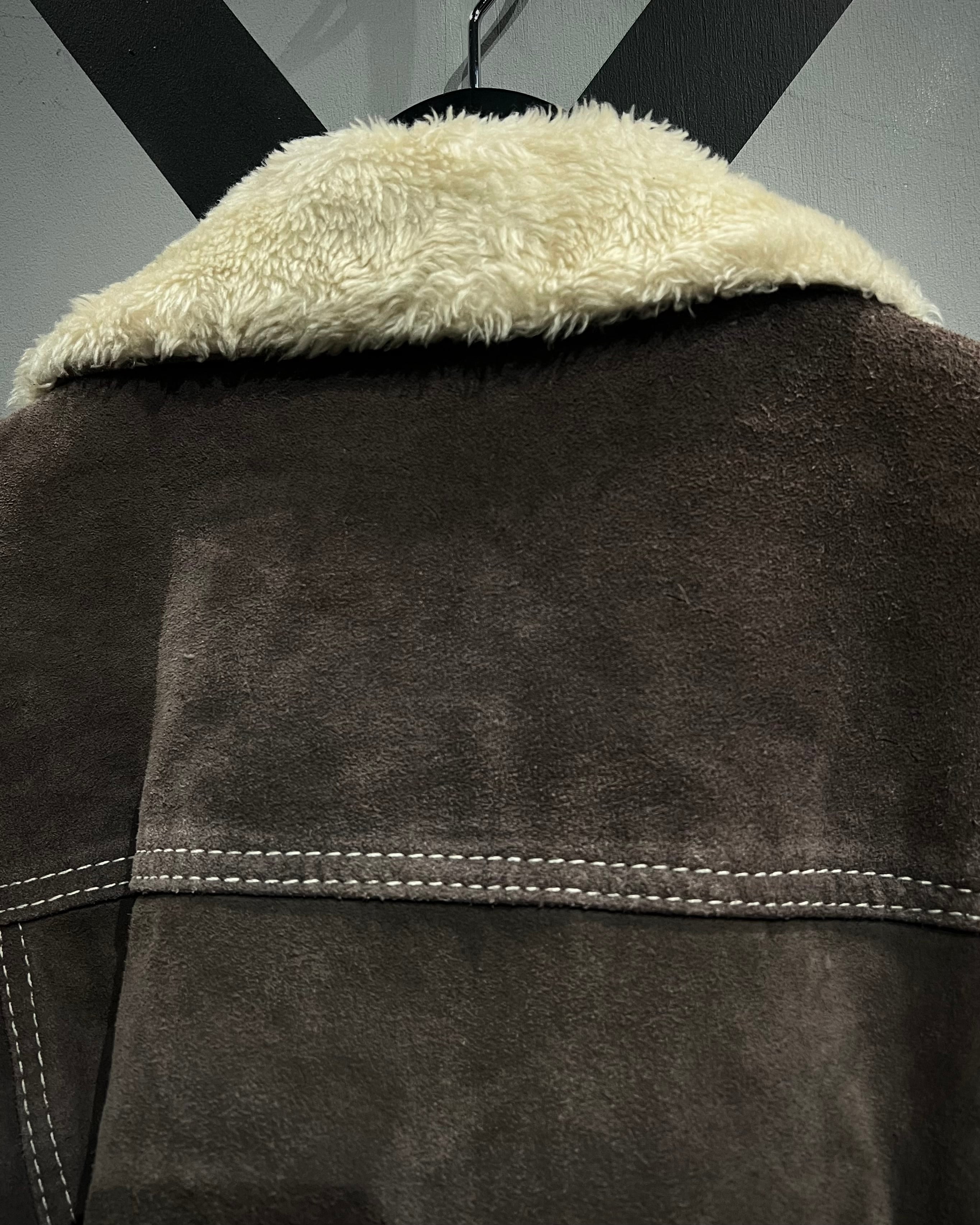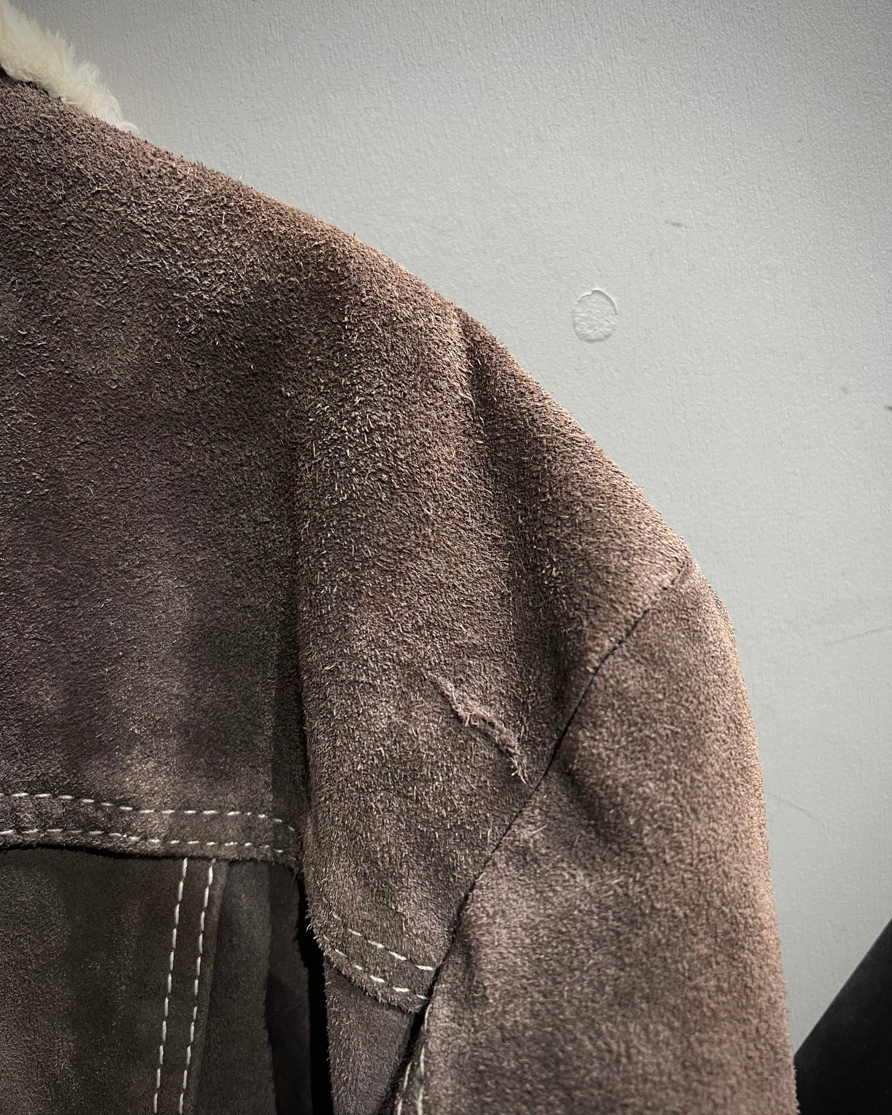 ブラウンのスエードにアイボリーのファーをあしらった、クラシックなムード漂うヴィンテージトラッカームートンジャケット。