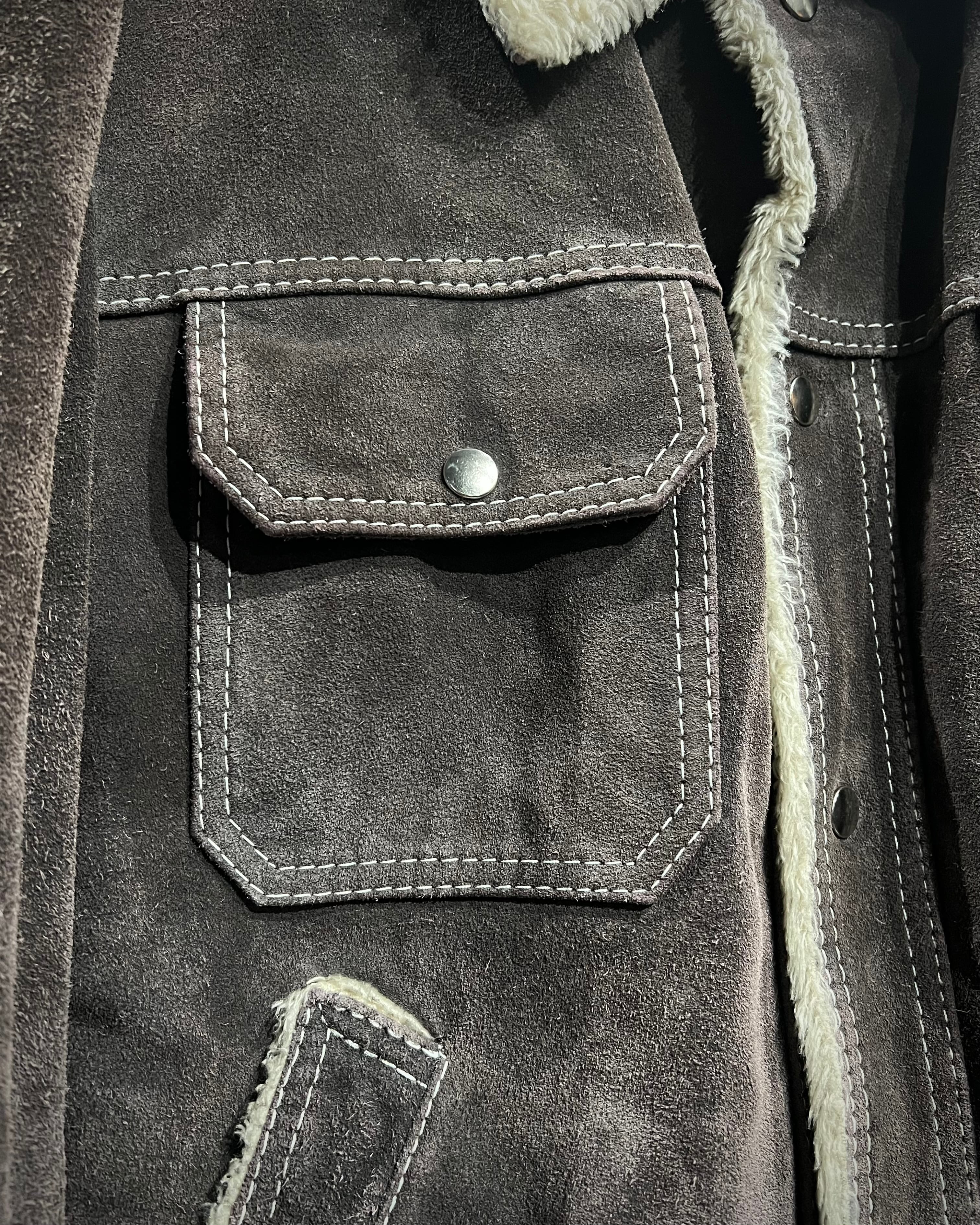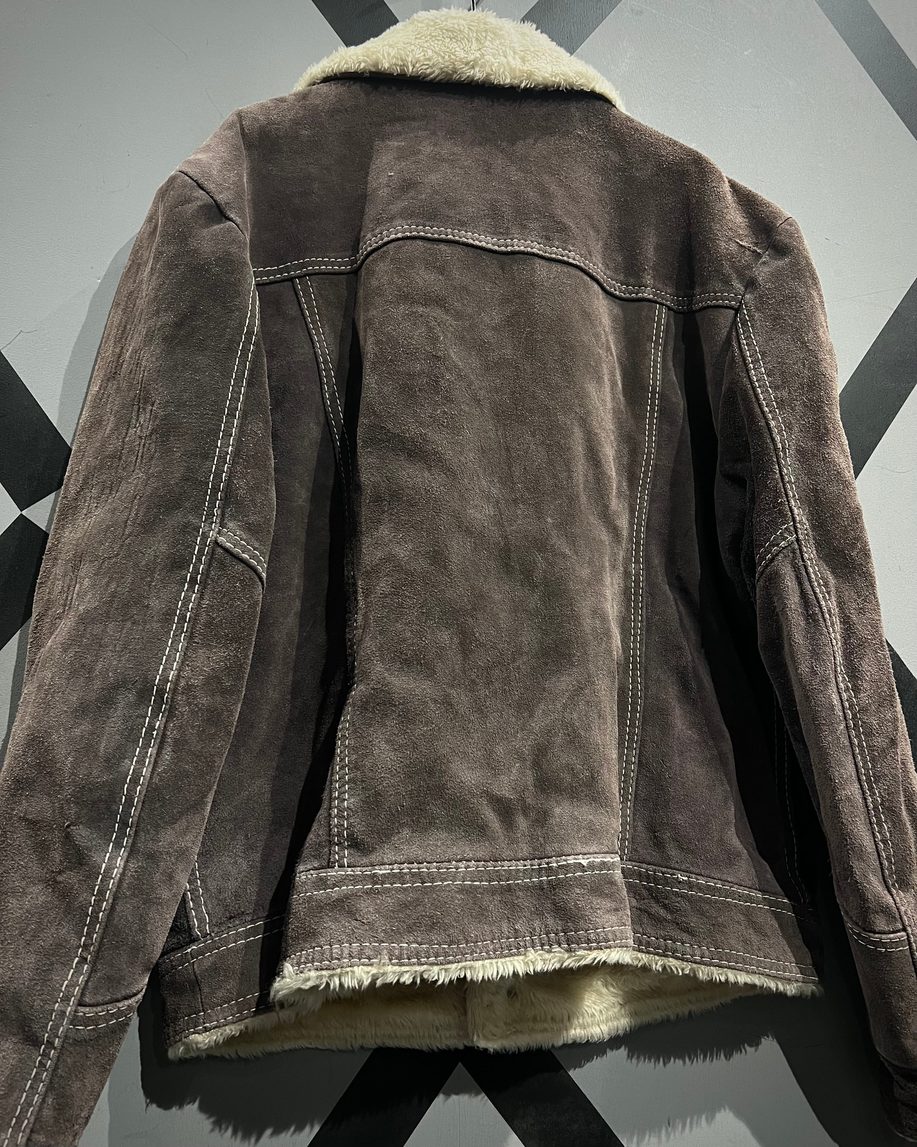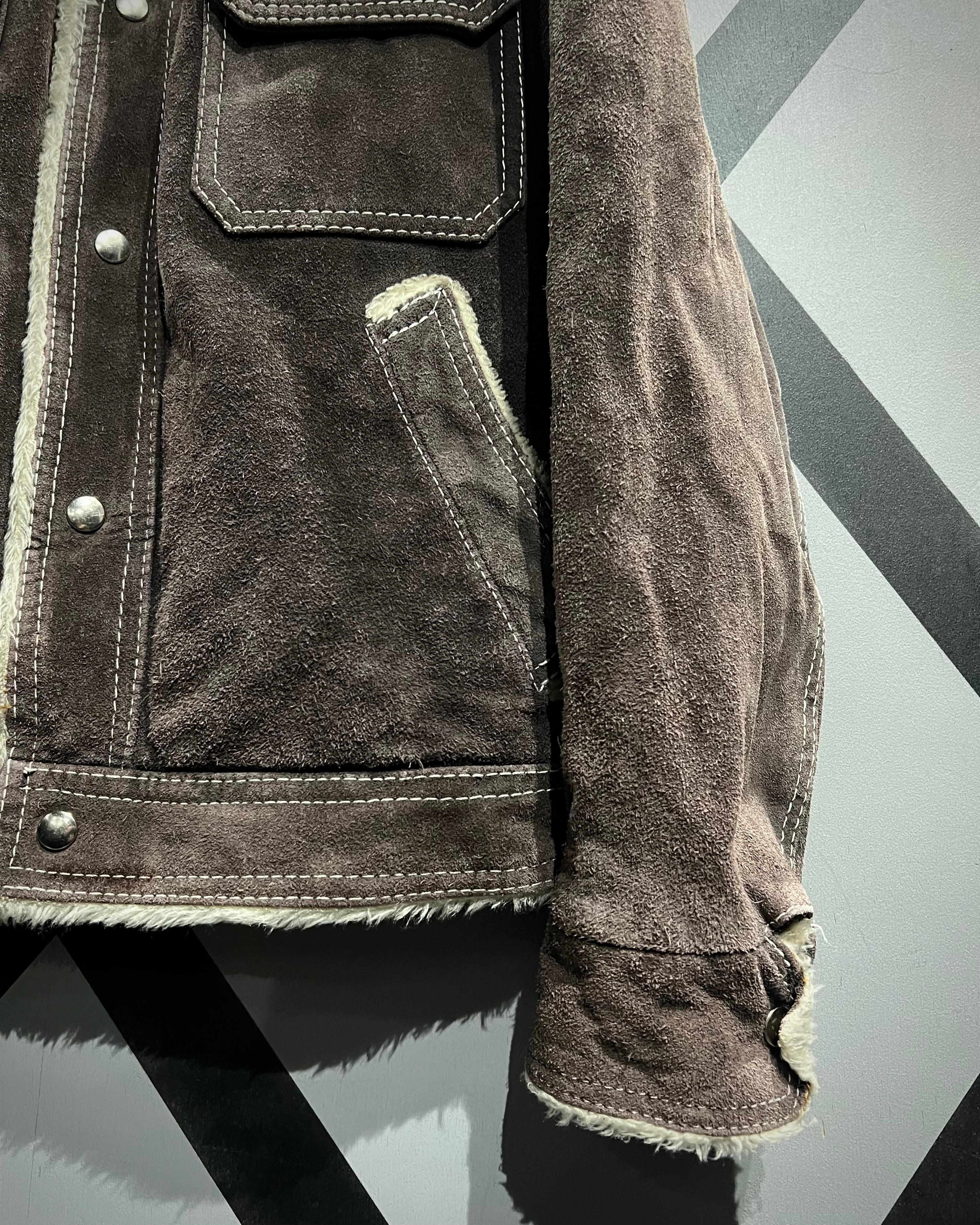 ブラウンのスエードにアイボリーのファーをあしらった、クラシックなムード漂うヴィンテージトラッカームートンジャケット。