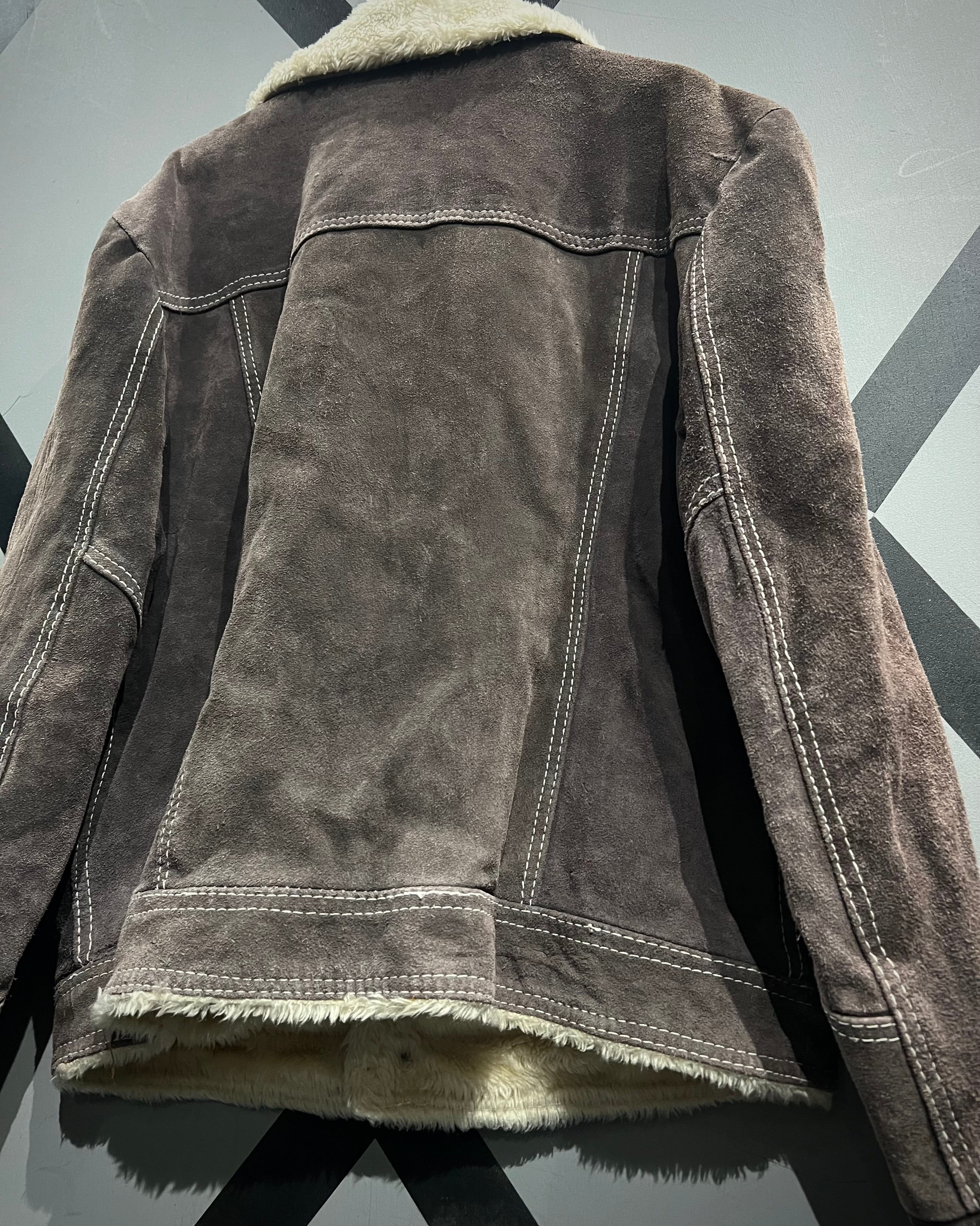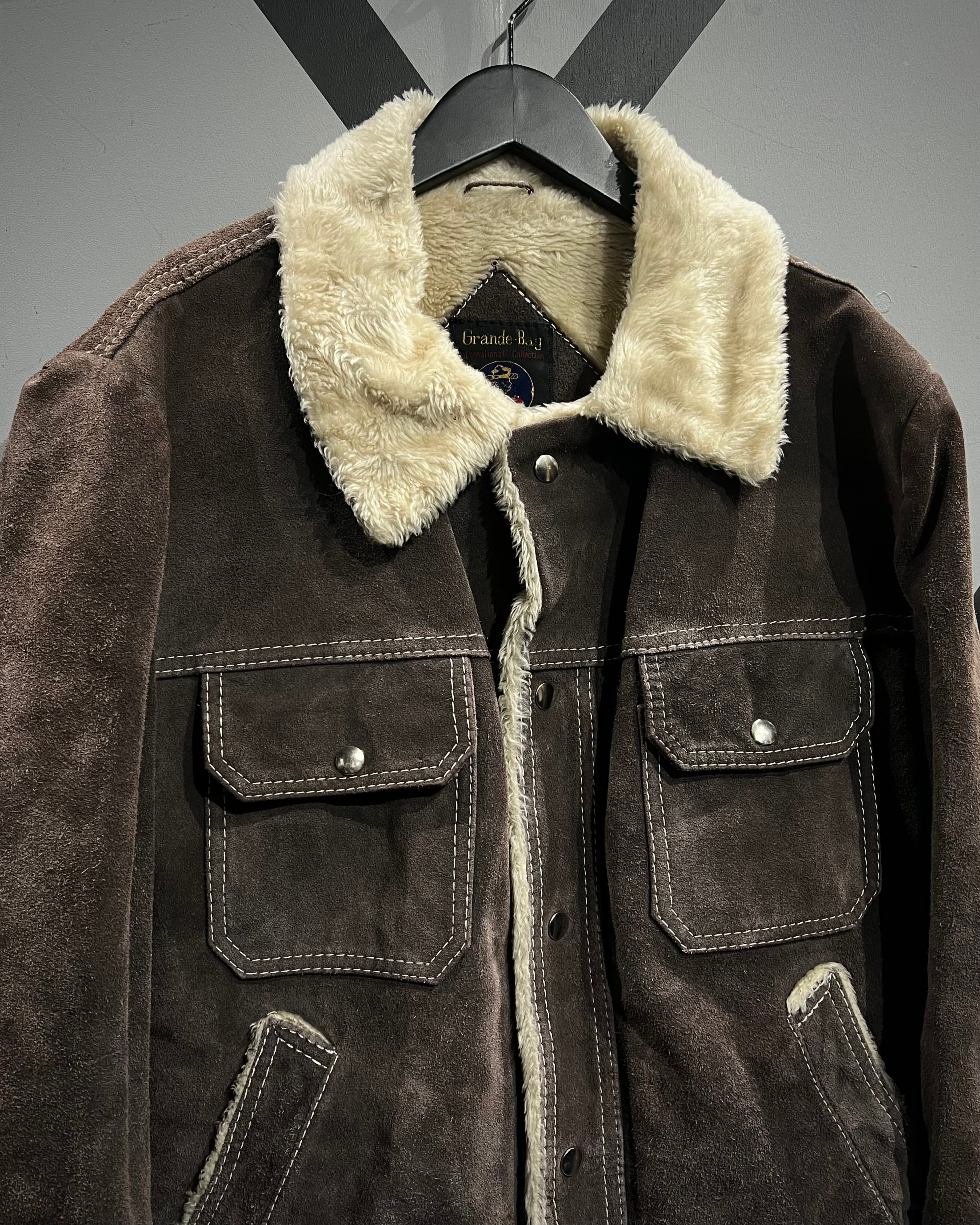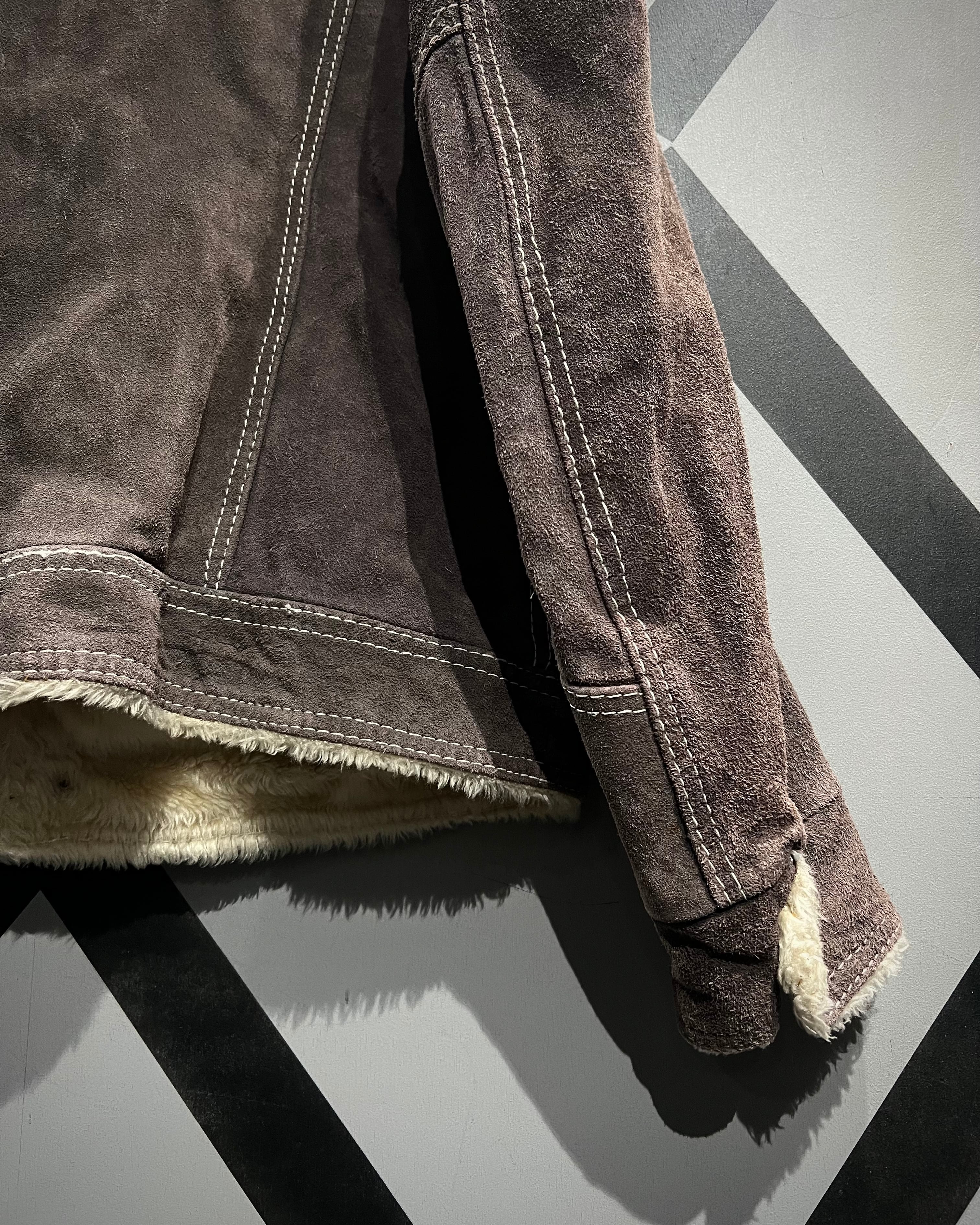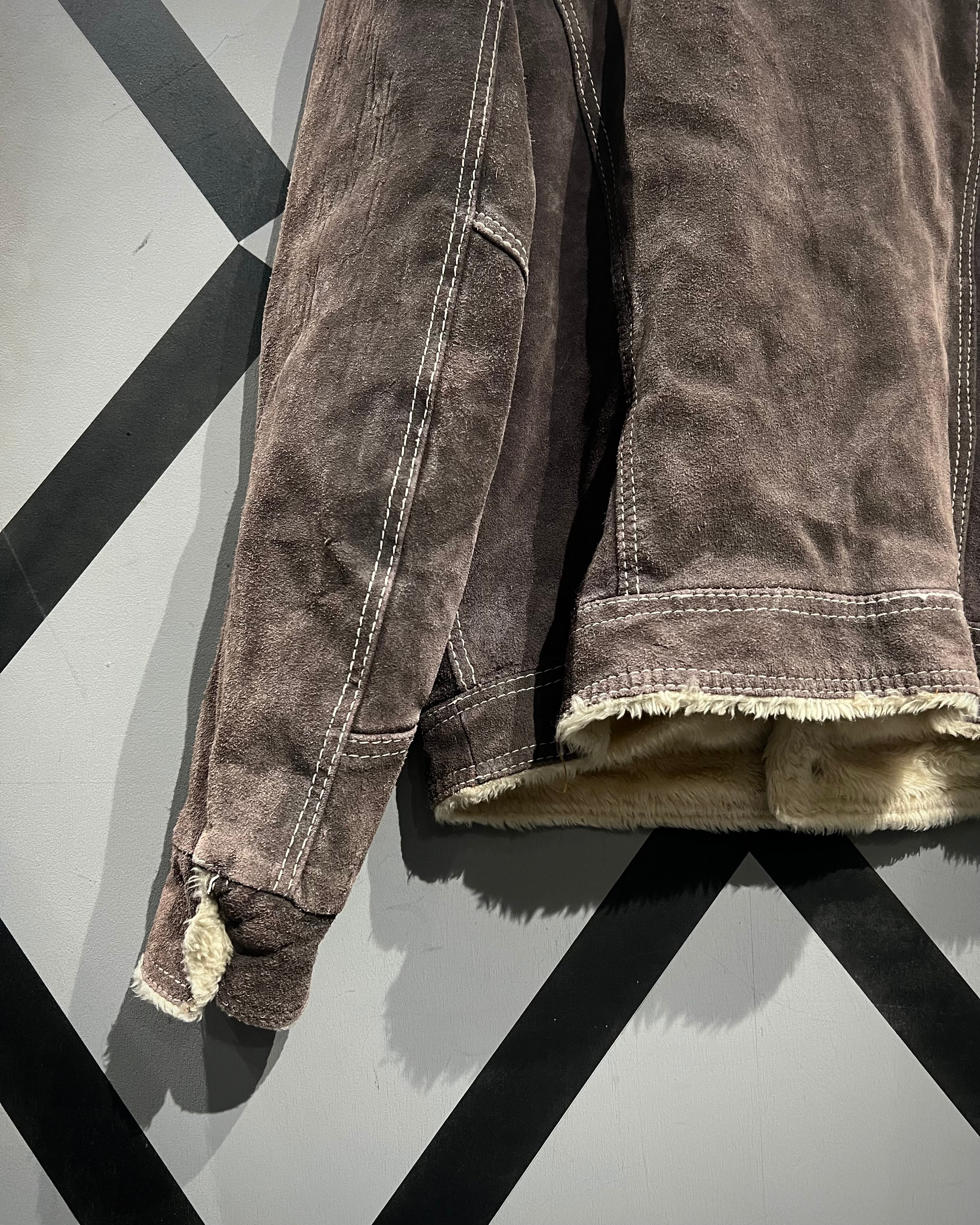 ブラウンのスエードにアイボリーのファーをあしらった、クラシックなムード漂うヴィンテージトラッカームートンジャケット。