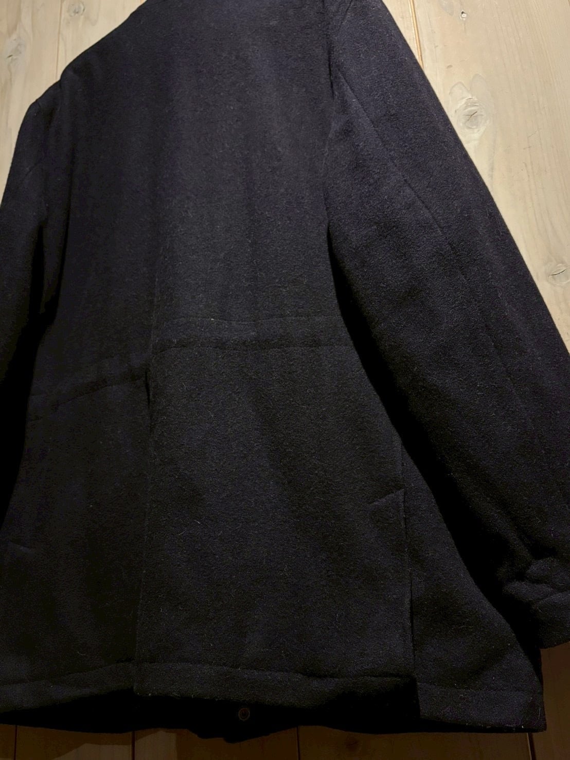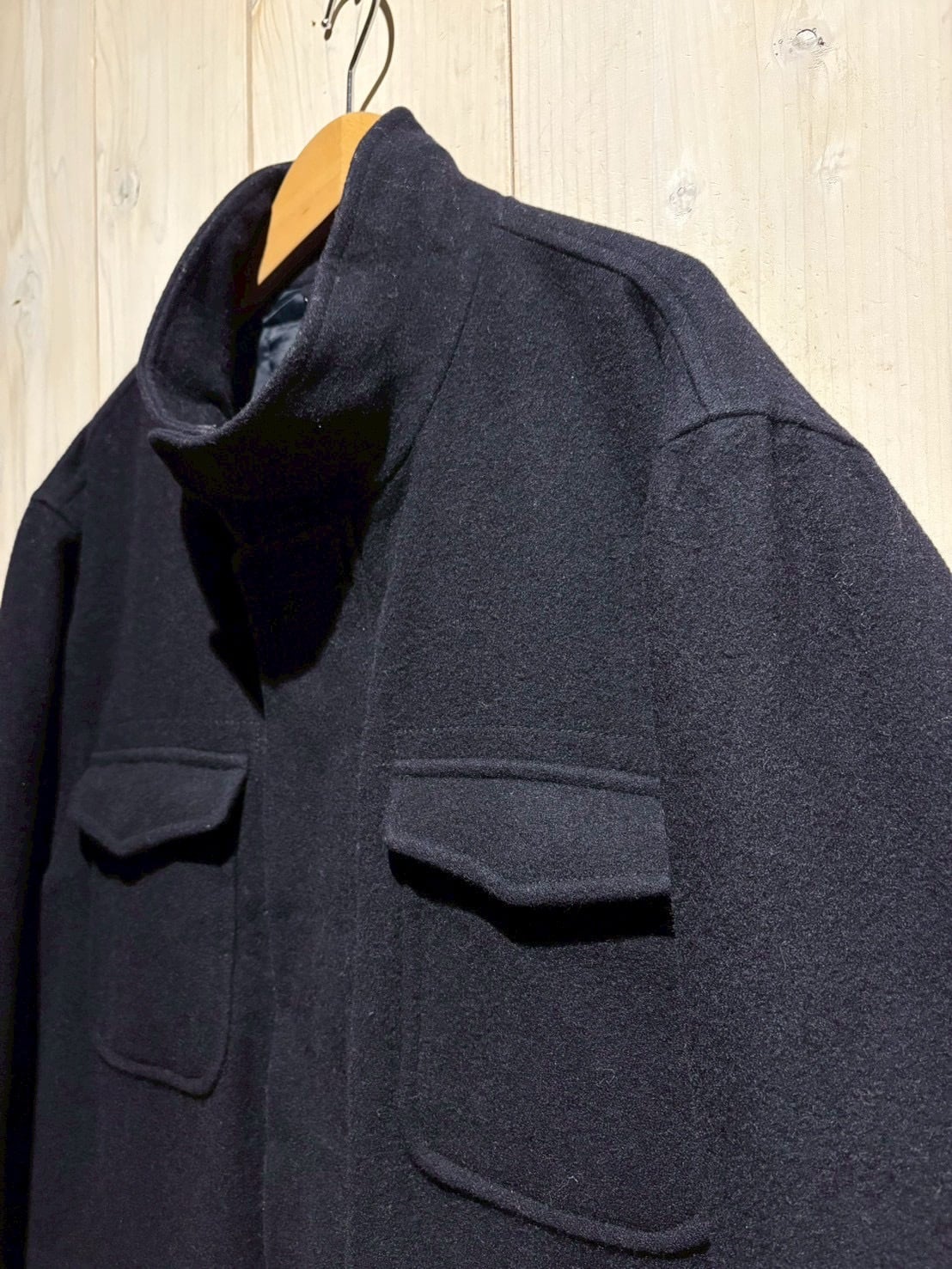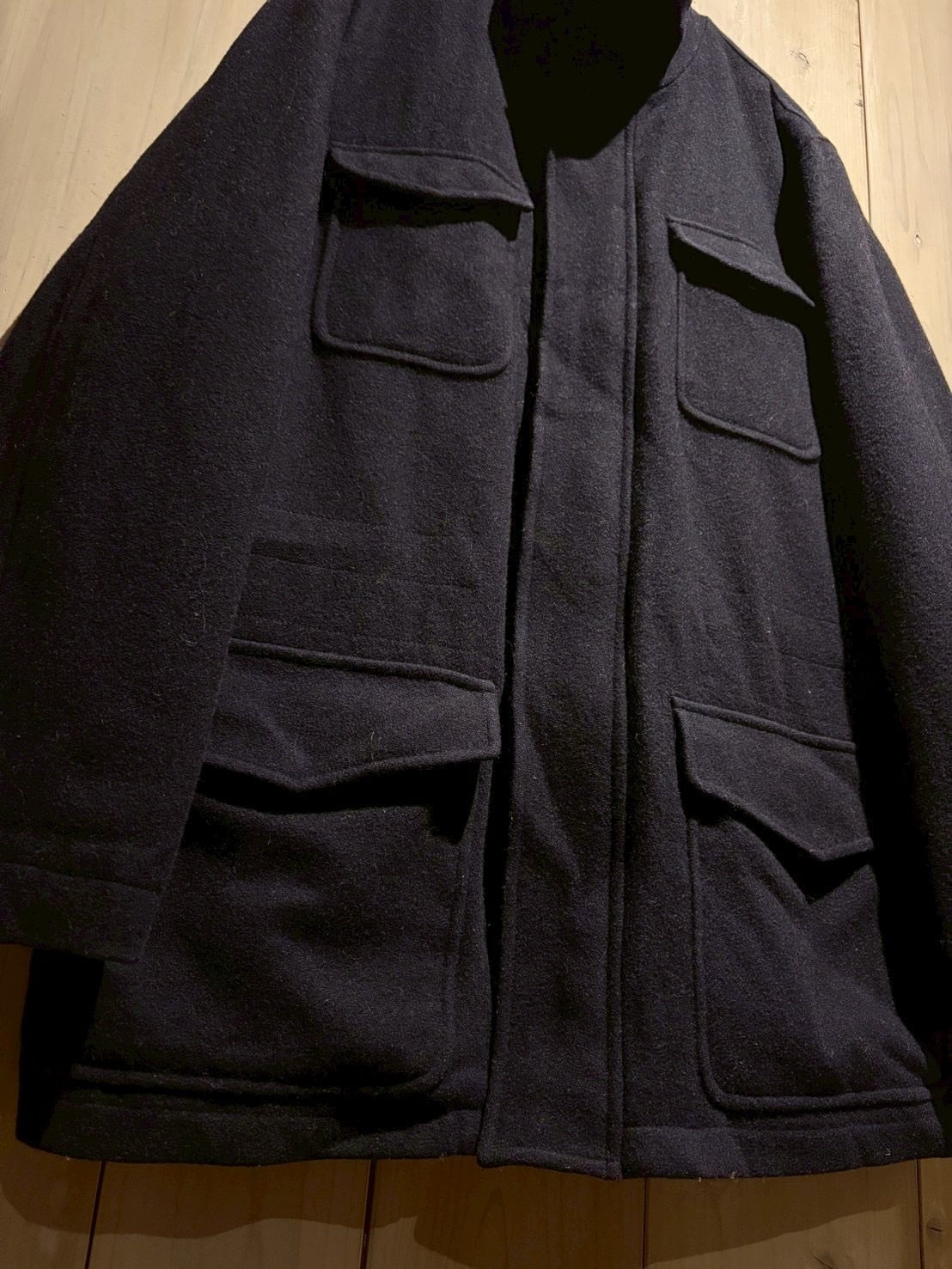 深みのあるネイビートーンのウールボディは上質な重厚感を宿しながらも、無骨な4ポケット仕様によってミリタリー的なエッセンスをプラス。前立てはスナップ+ジップの比翼仕立てでミニマルに仕上げられています。