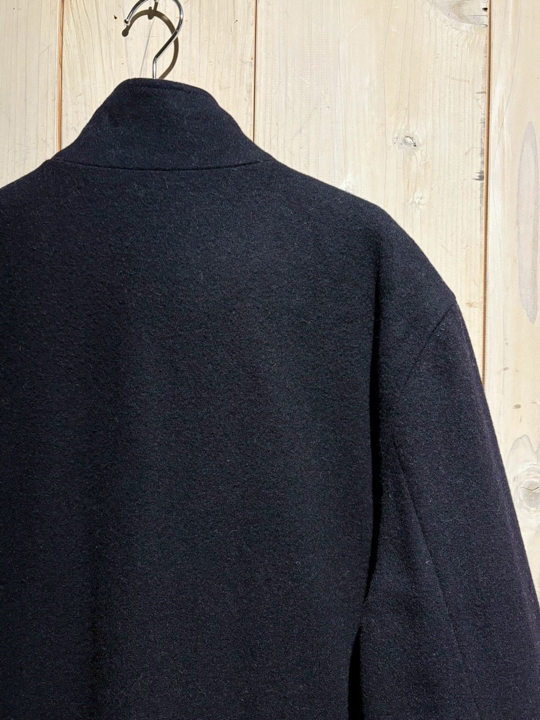 スタンドカラーの端正なライン、縦落ちするシルエット、上質なウールが生む陰影が相まって無駄のない美しい佇まいが◎