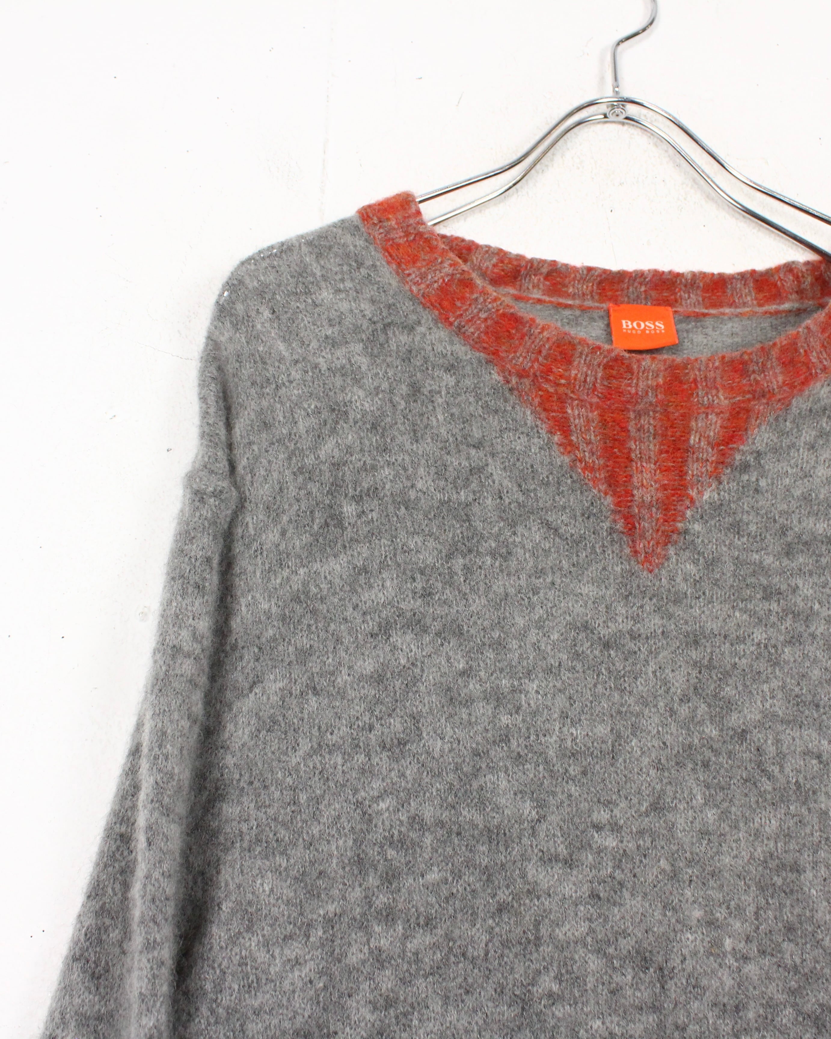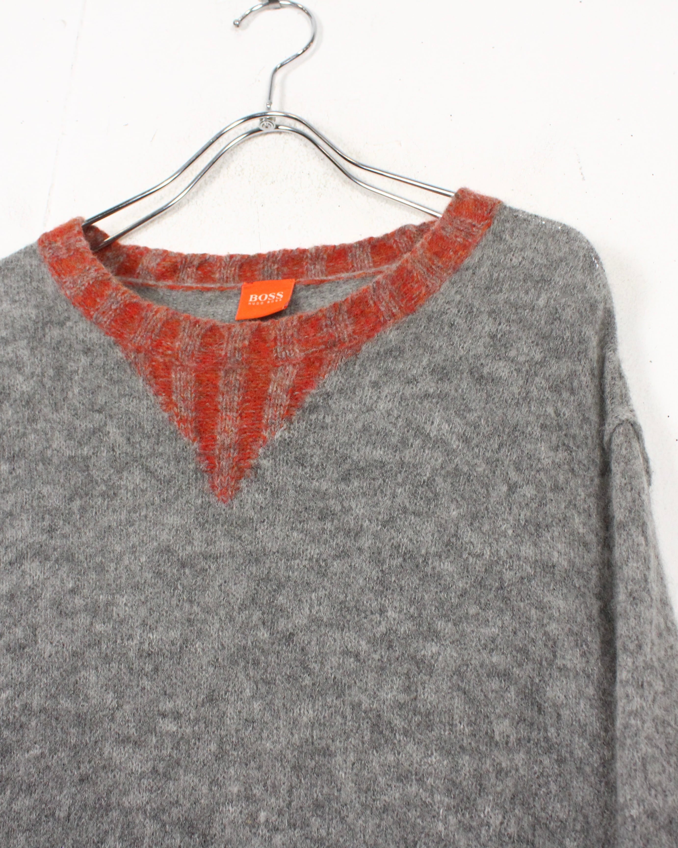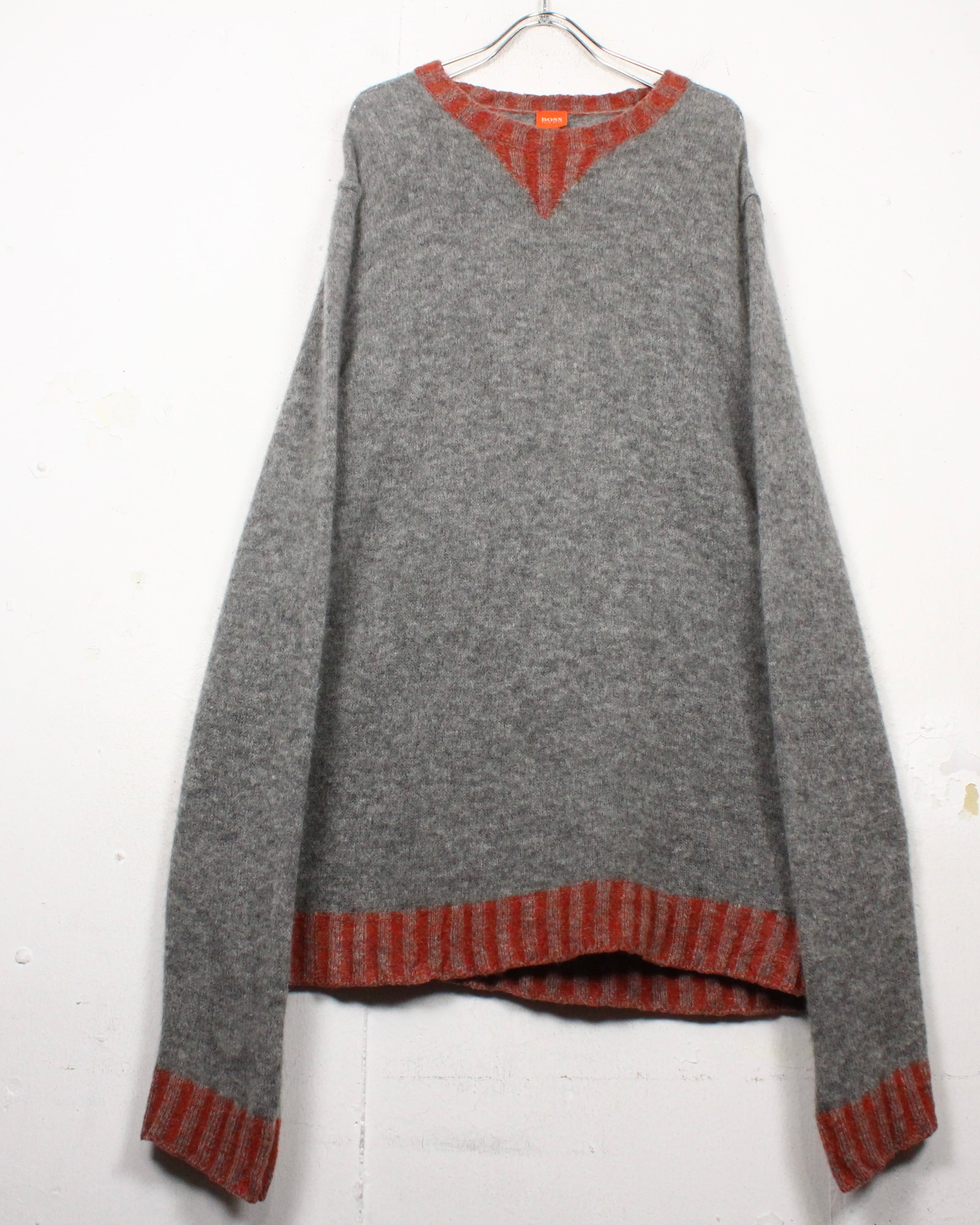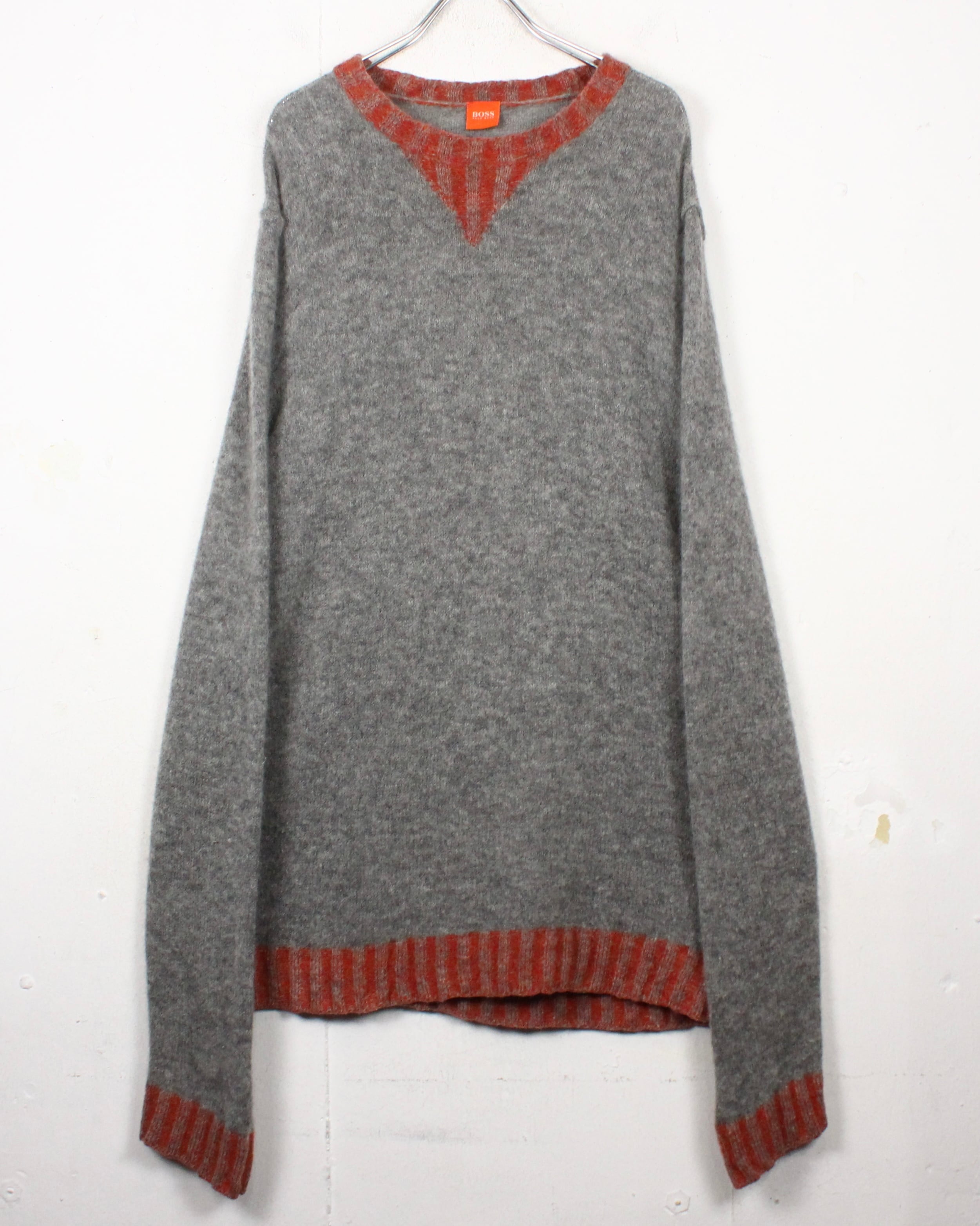 グレーベースのボディにオレンジのリブをアクセントとして差し込んだ、“HUGO BOSS らしいさり気ない洒落感のあるニット。