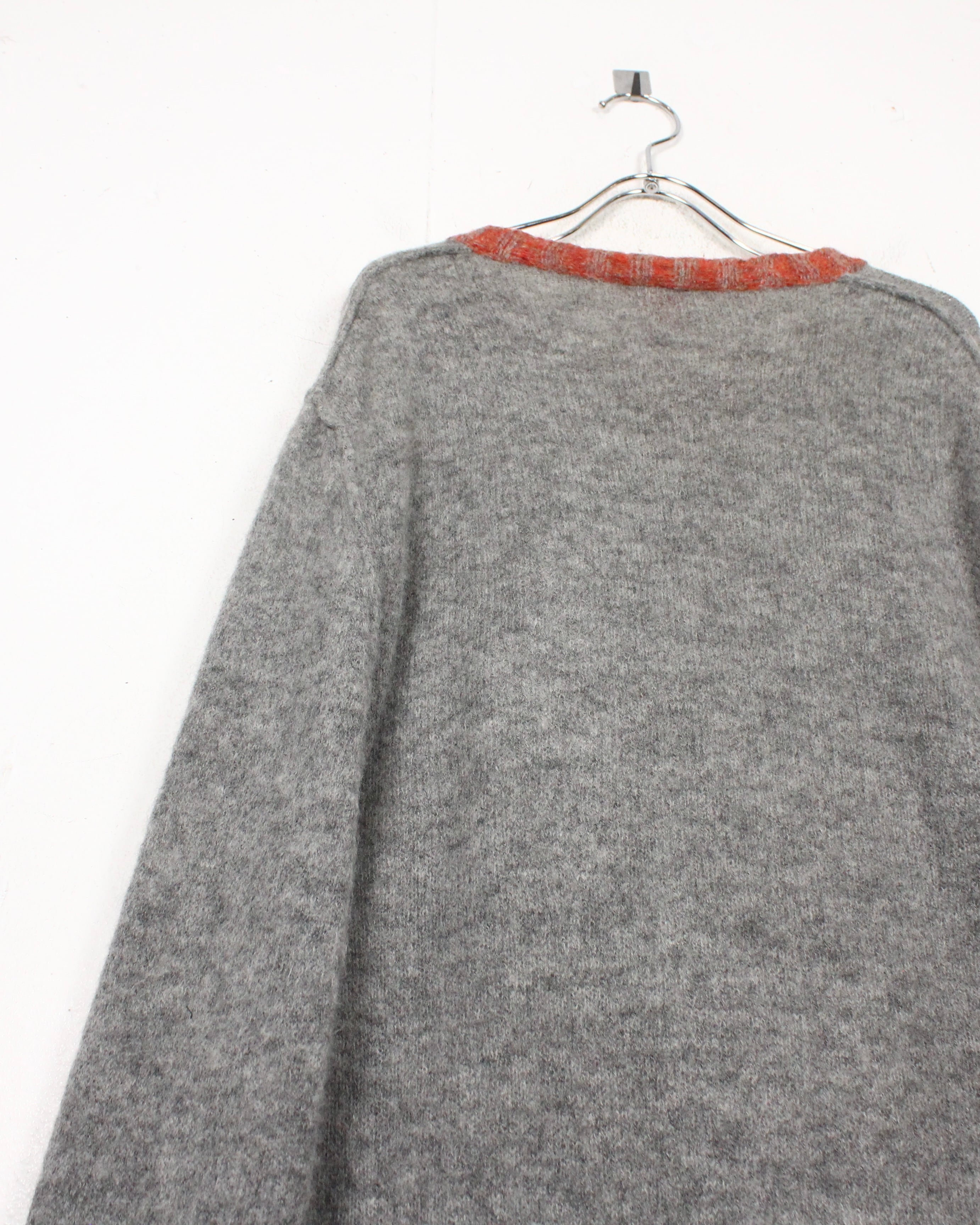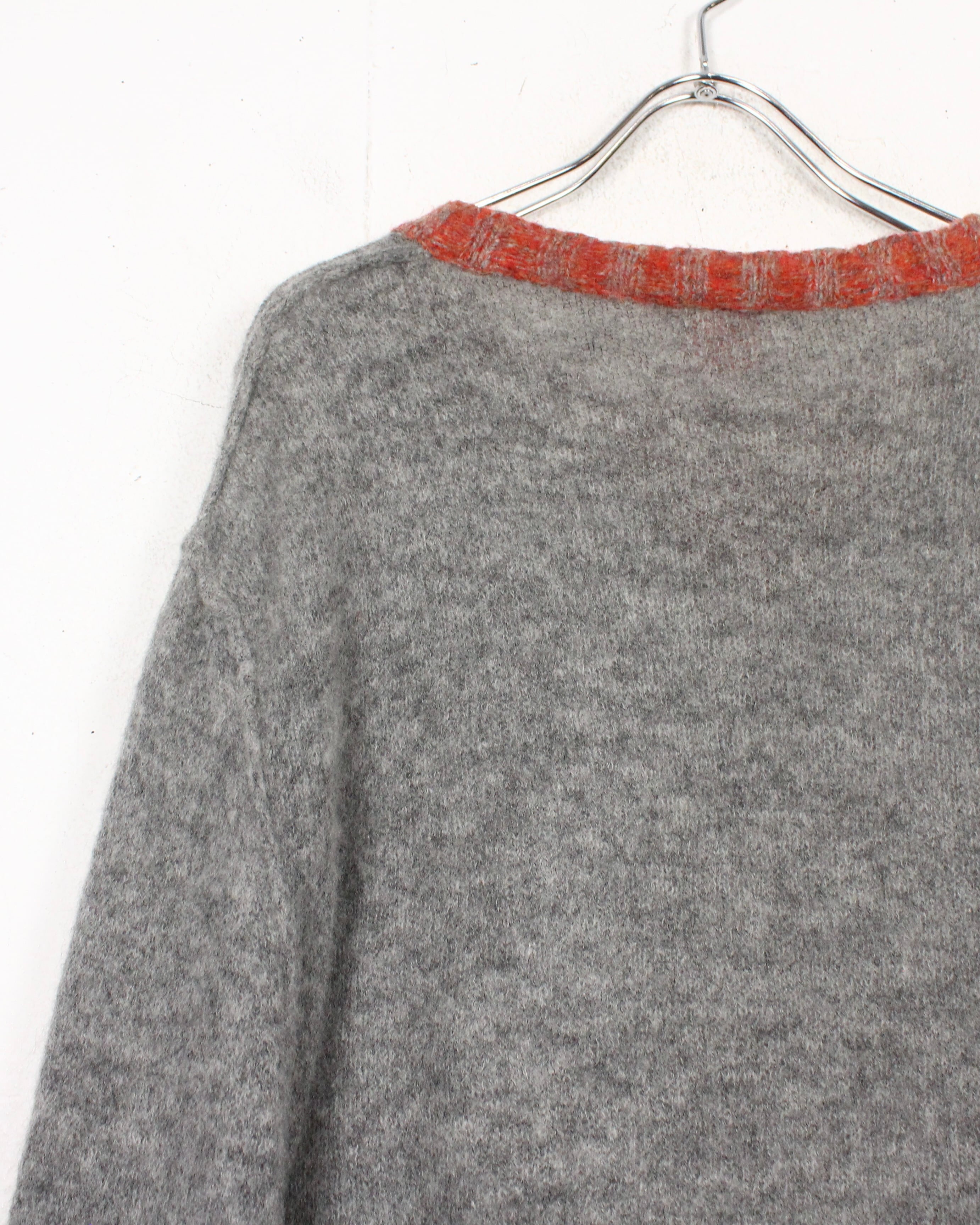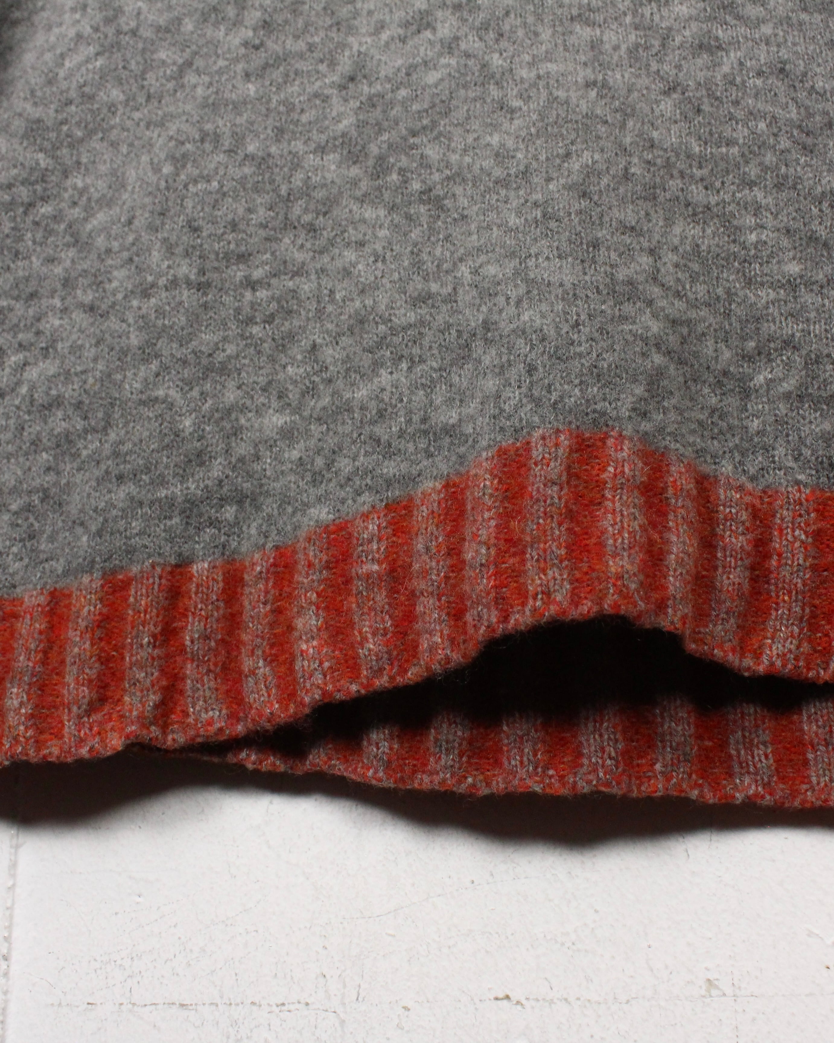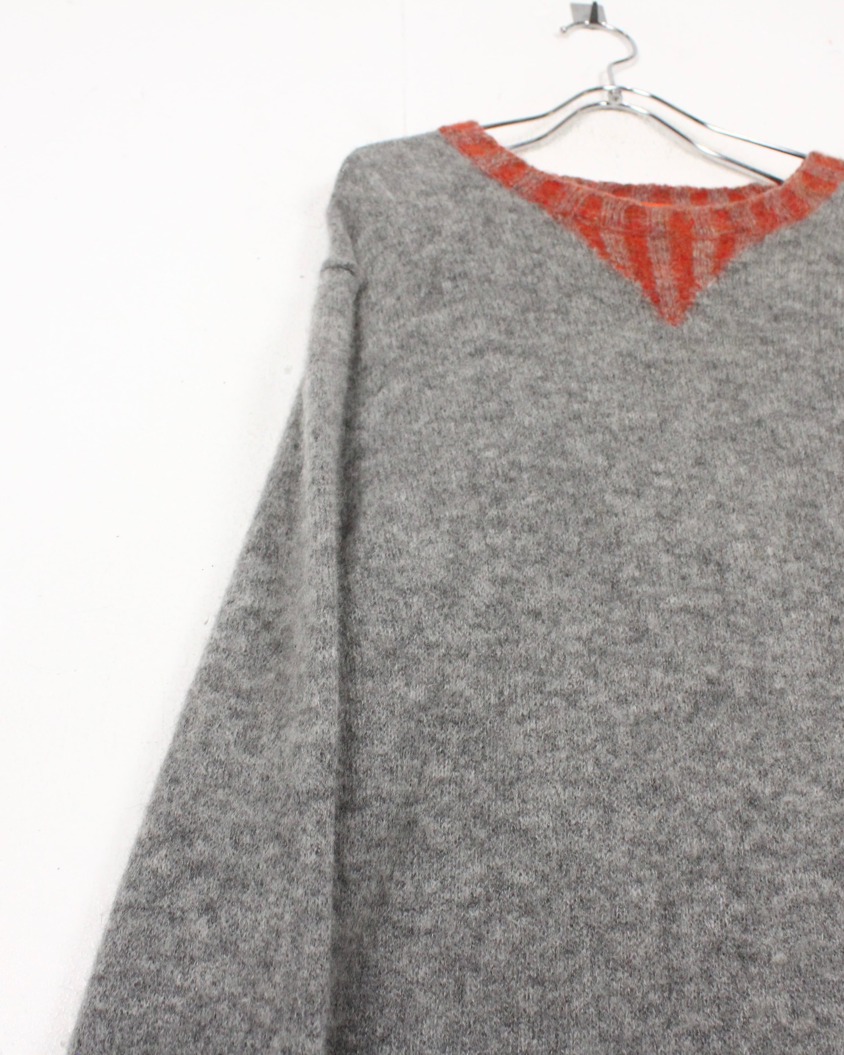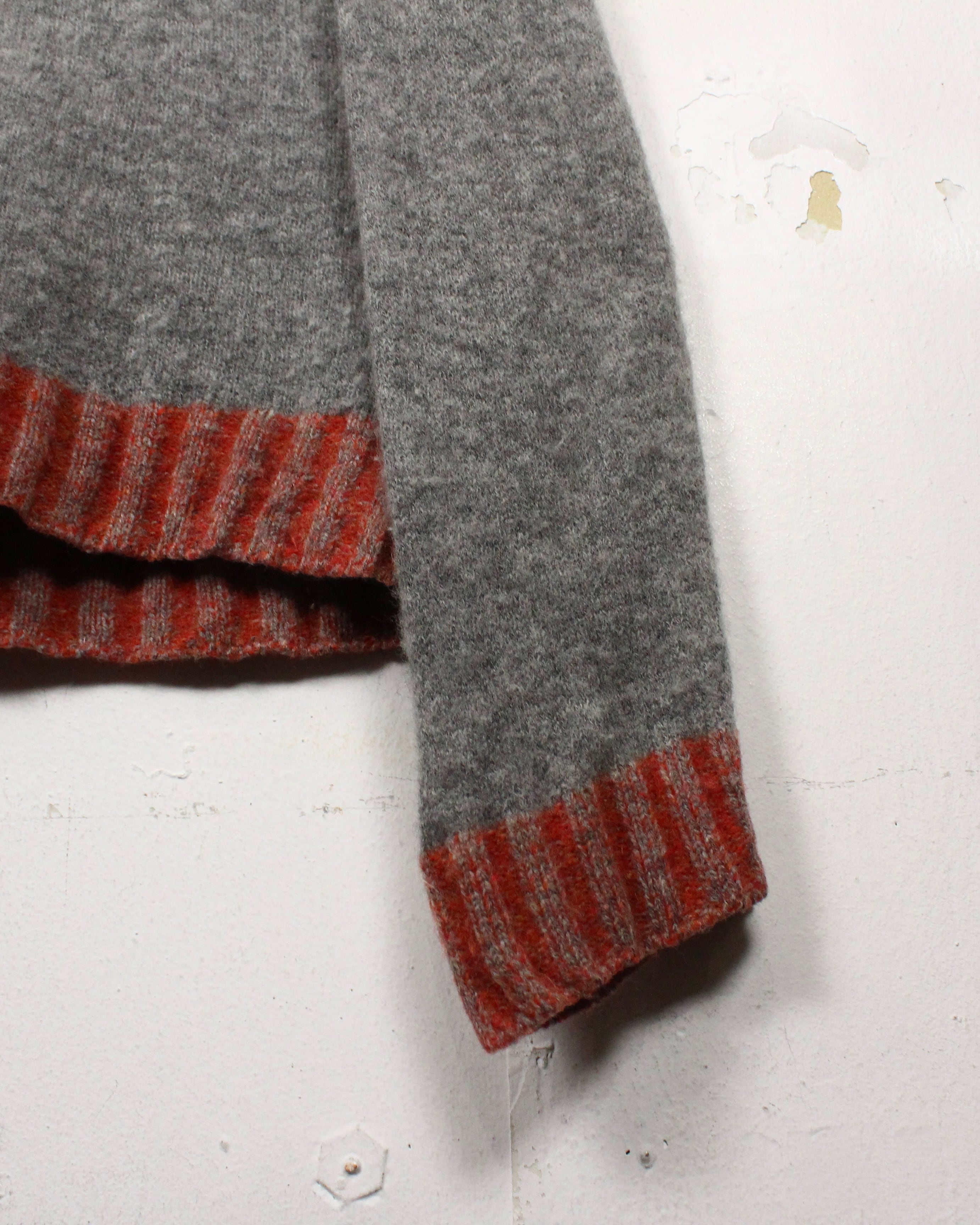 グレーベースのボディにオレンジのリブをアクセントとして差し込んだ、“HUGO BOSS らしいさり気ない洒落感のあるニット。