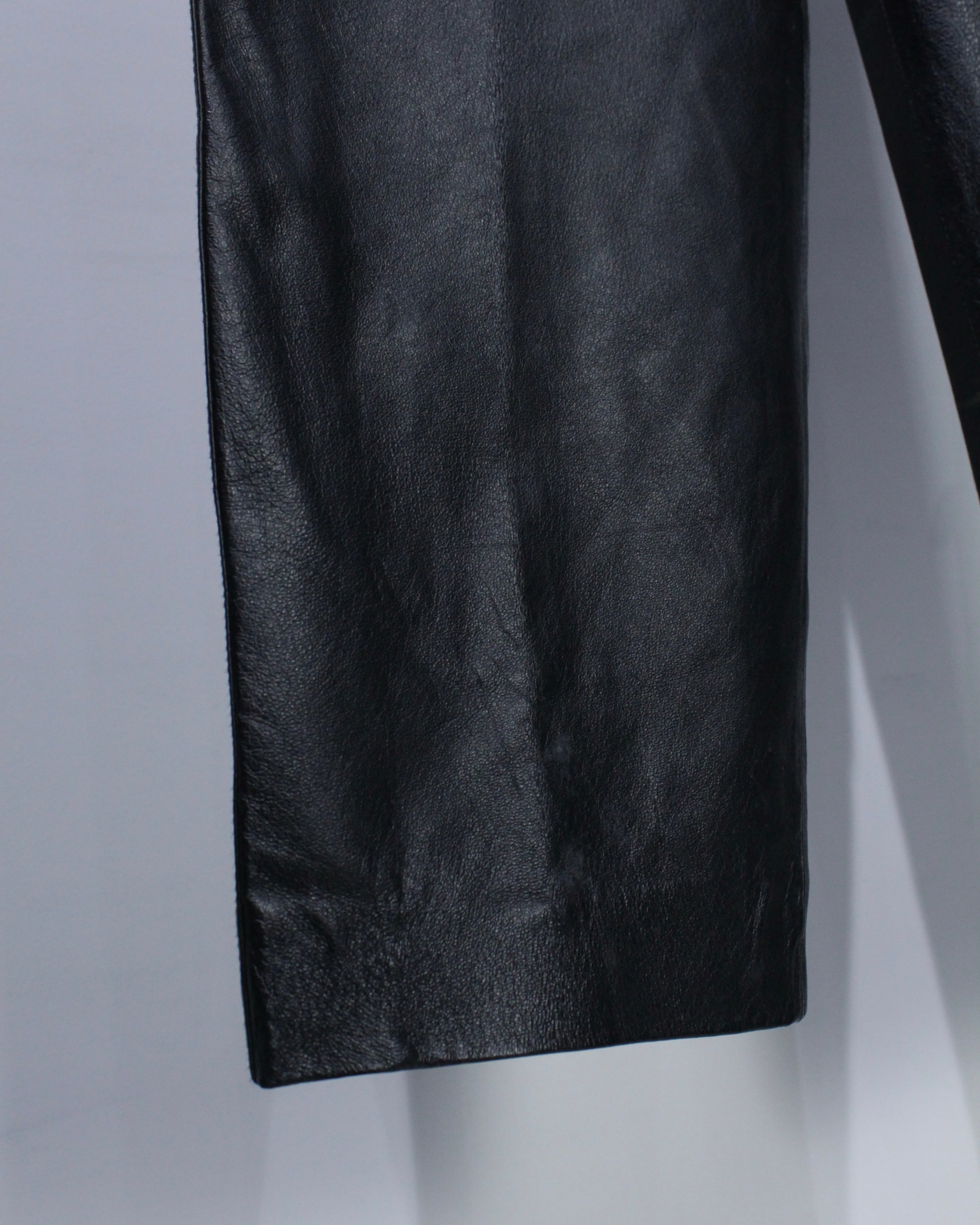 レザー特有の重厚さはありつつも、シルエットはあくまでドレス寄り。革の質感が持つ迫力と、スラックスの上品さが自然と合わさり、スタイリング全体のバランスを引き上げてくれる仕上がりです。