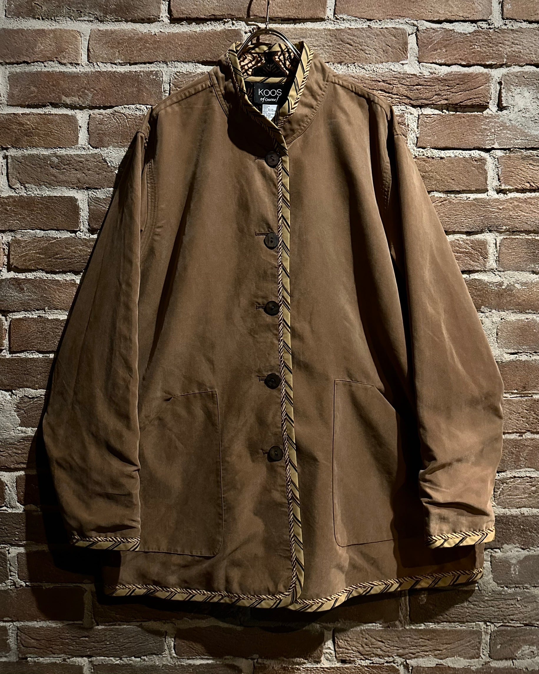 表側は落ち着いたブラウン無地、裏側は民族調の総柄が全面を彩るデザインで、スタイリングの幅が一気に広がります。