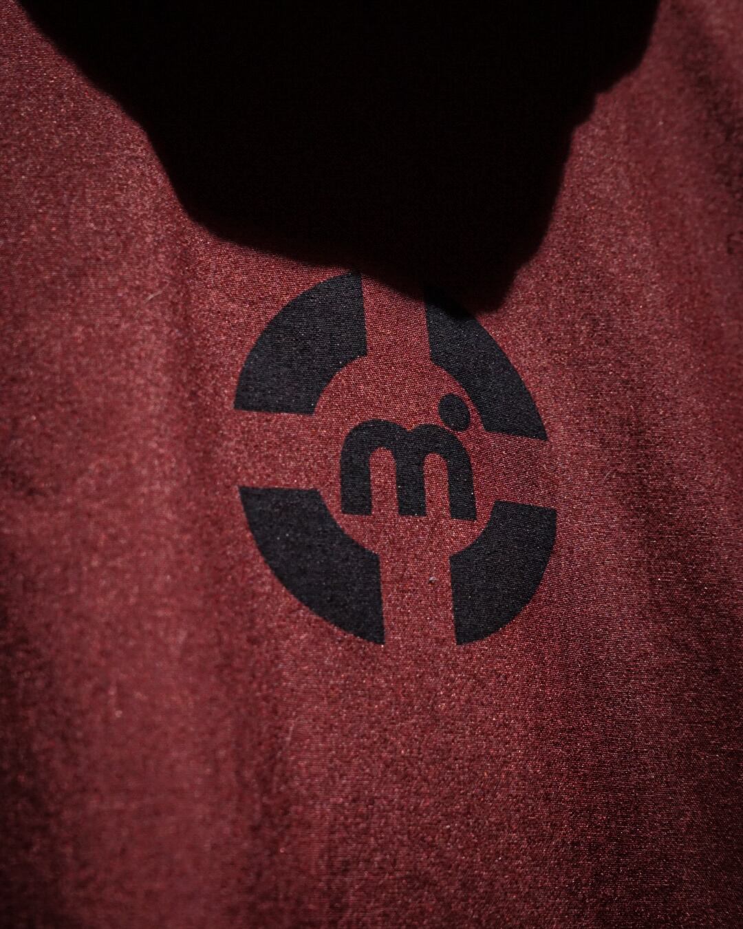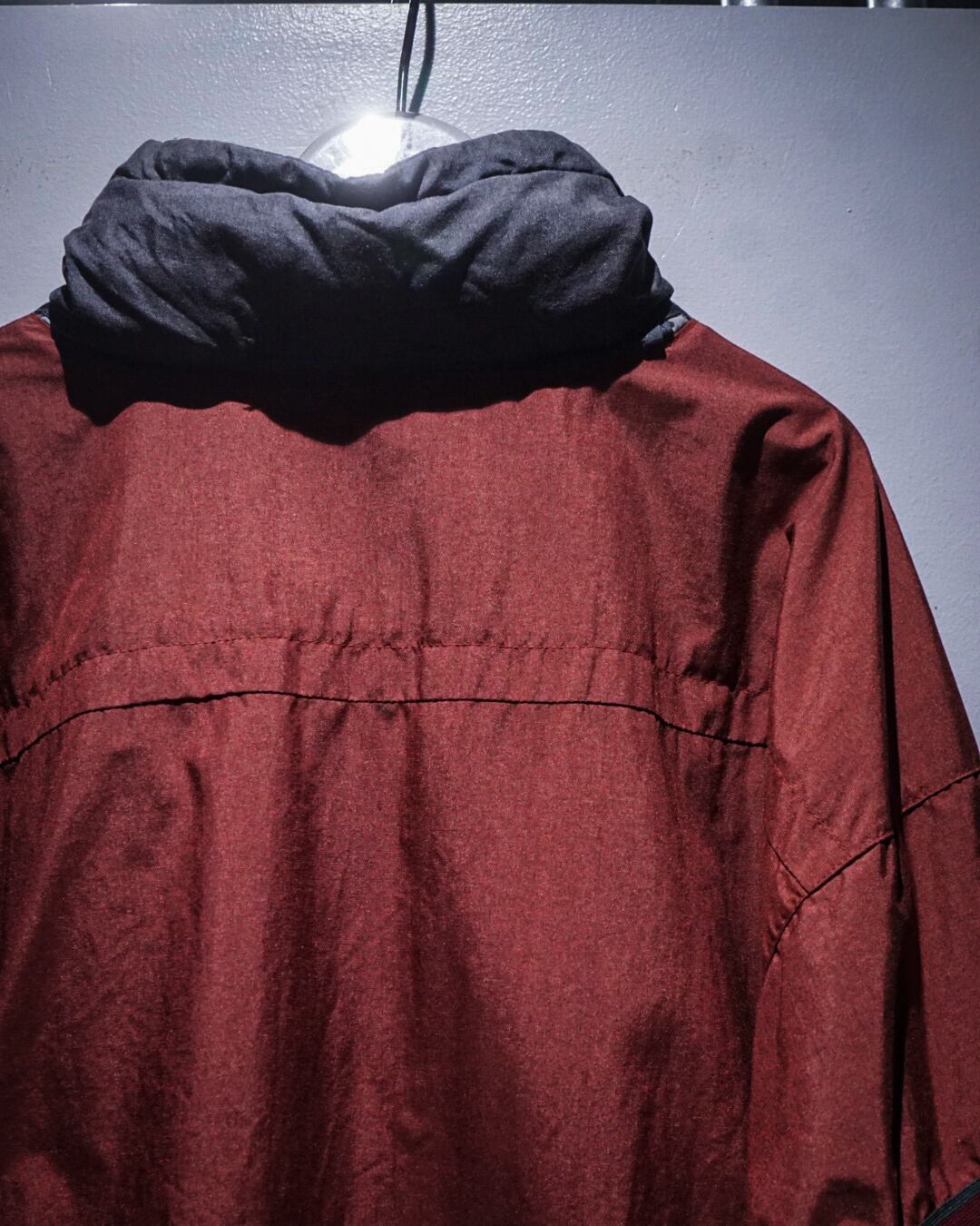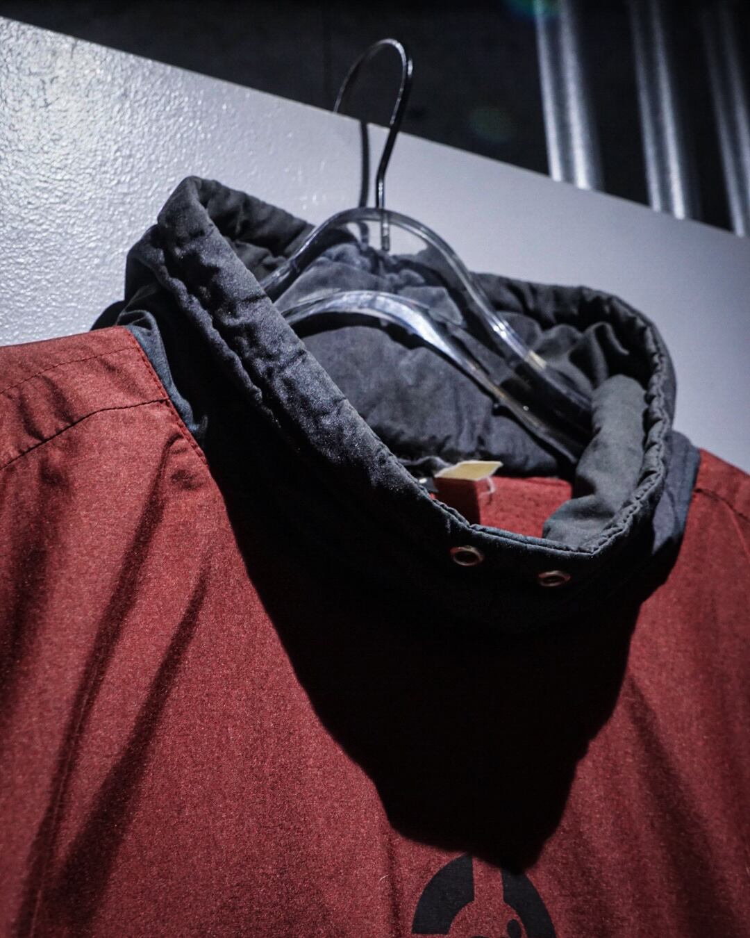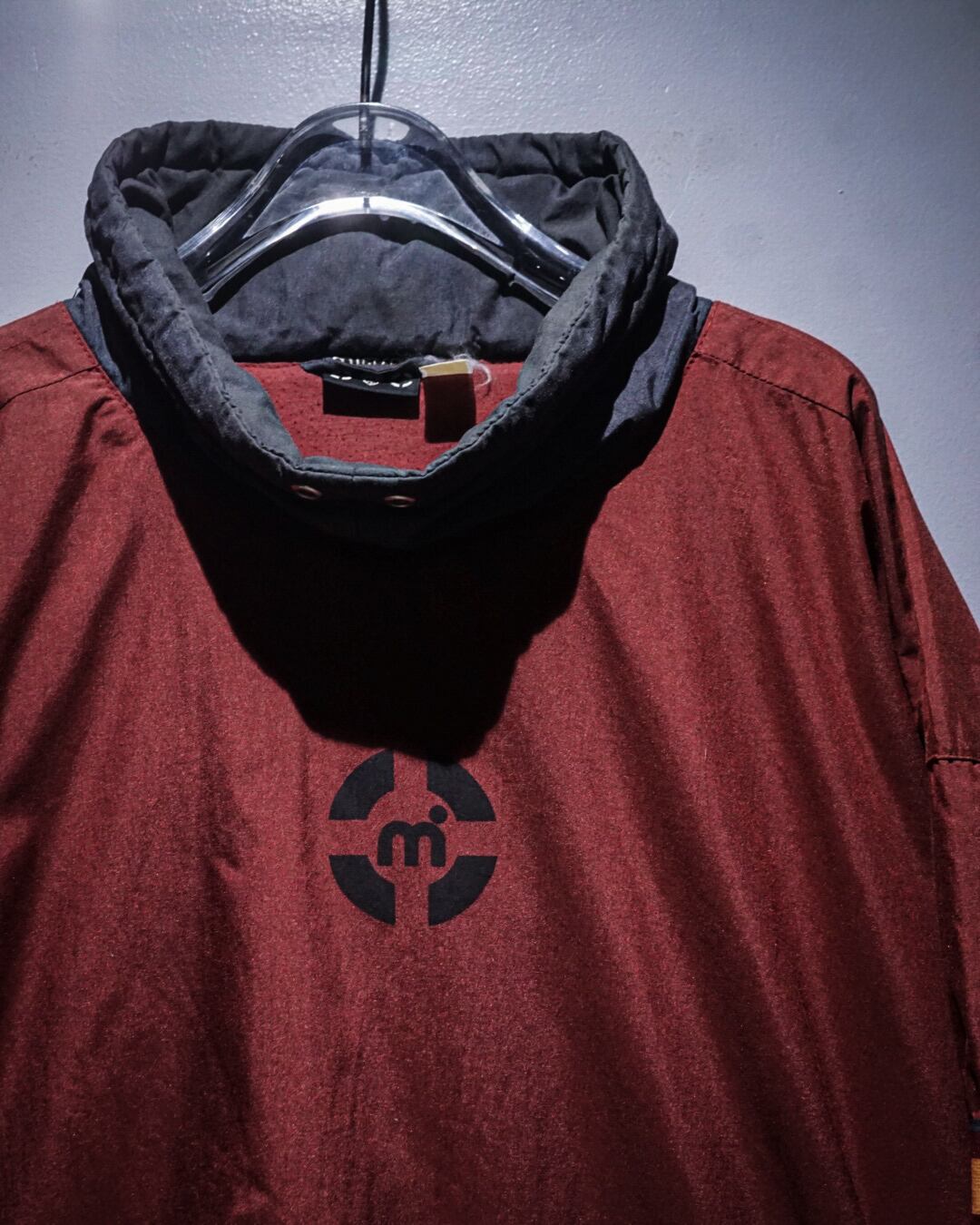 赤× ダークグレーの落ち着いた配色に、フロントのmロゴがさりげなく主張。ハイネックのボリューム感もバランスよく、ざっくり羽織るだけでシルエットが決まります。