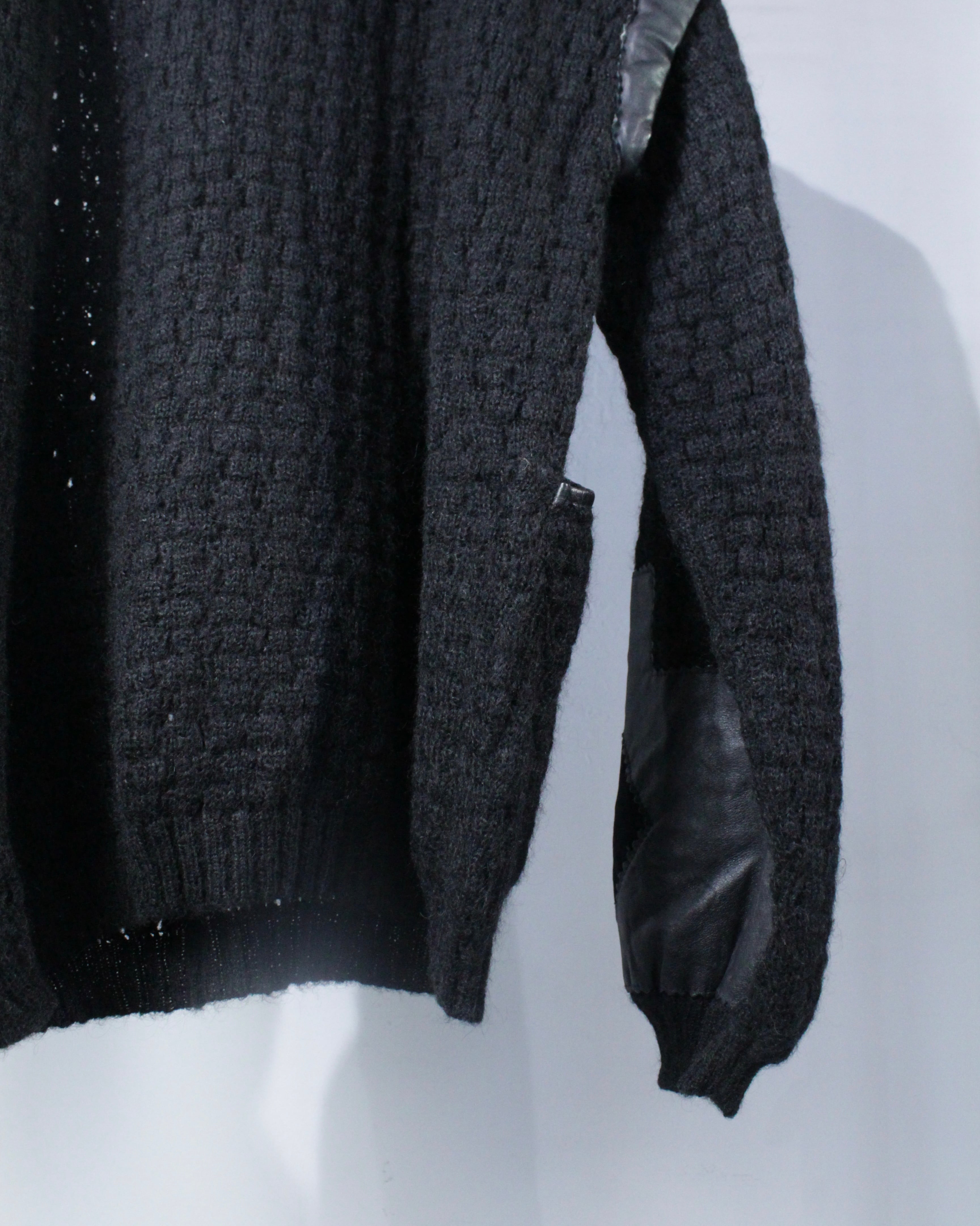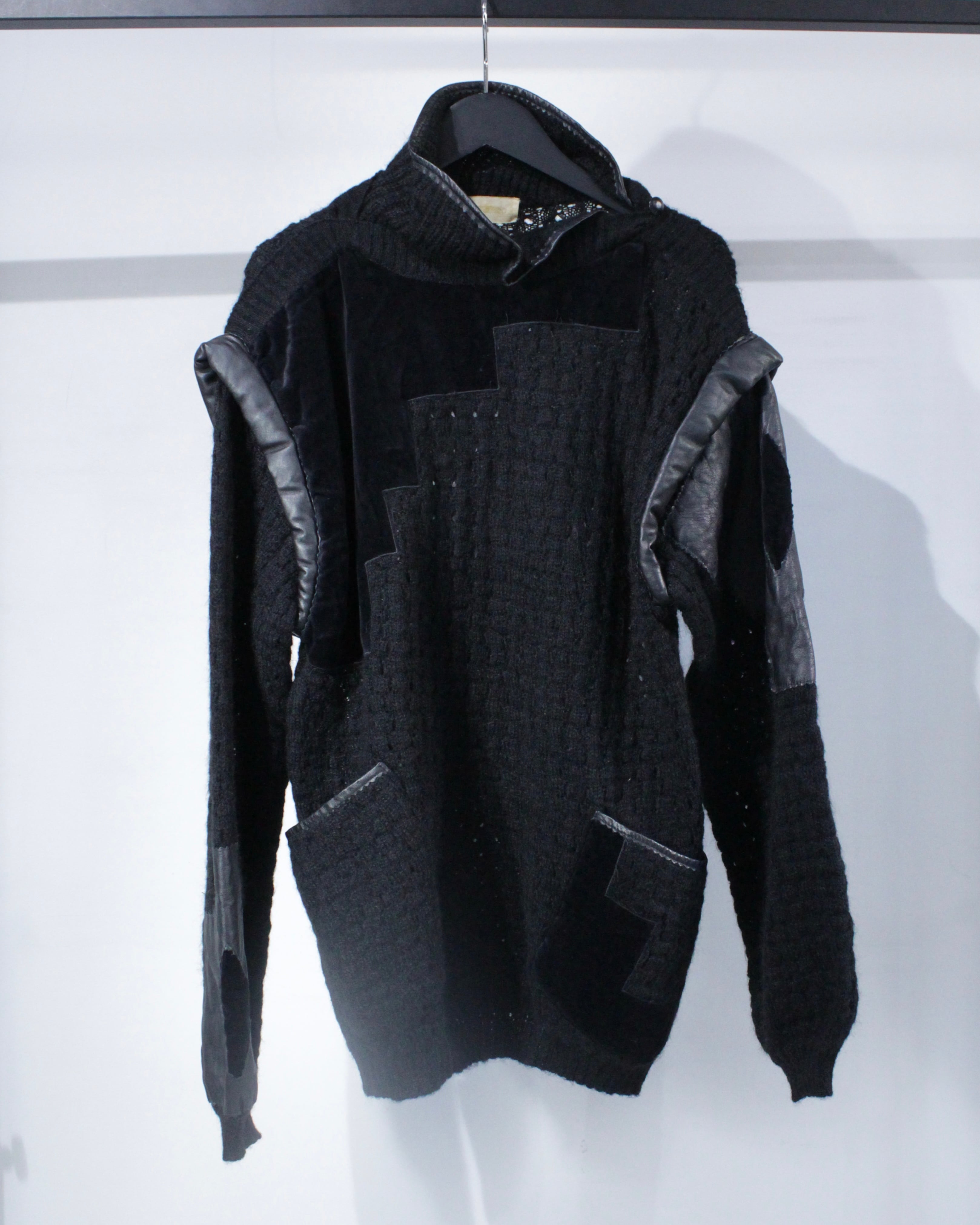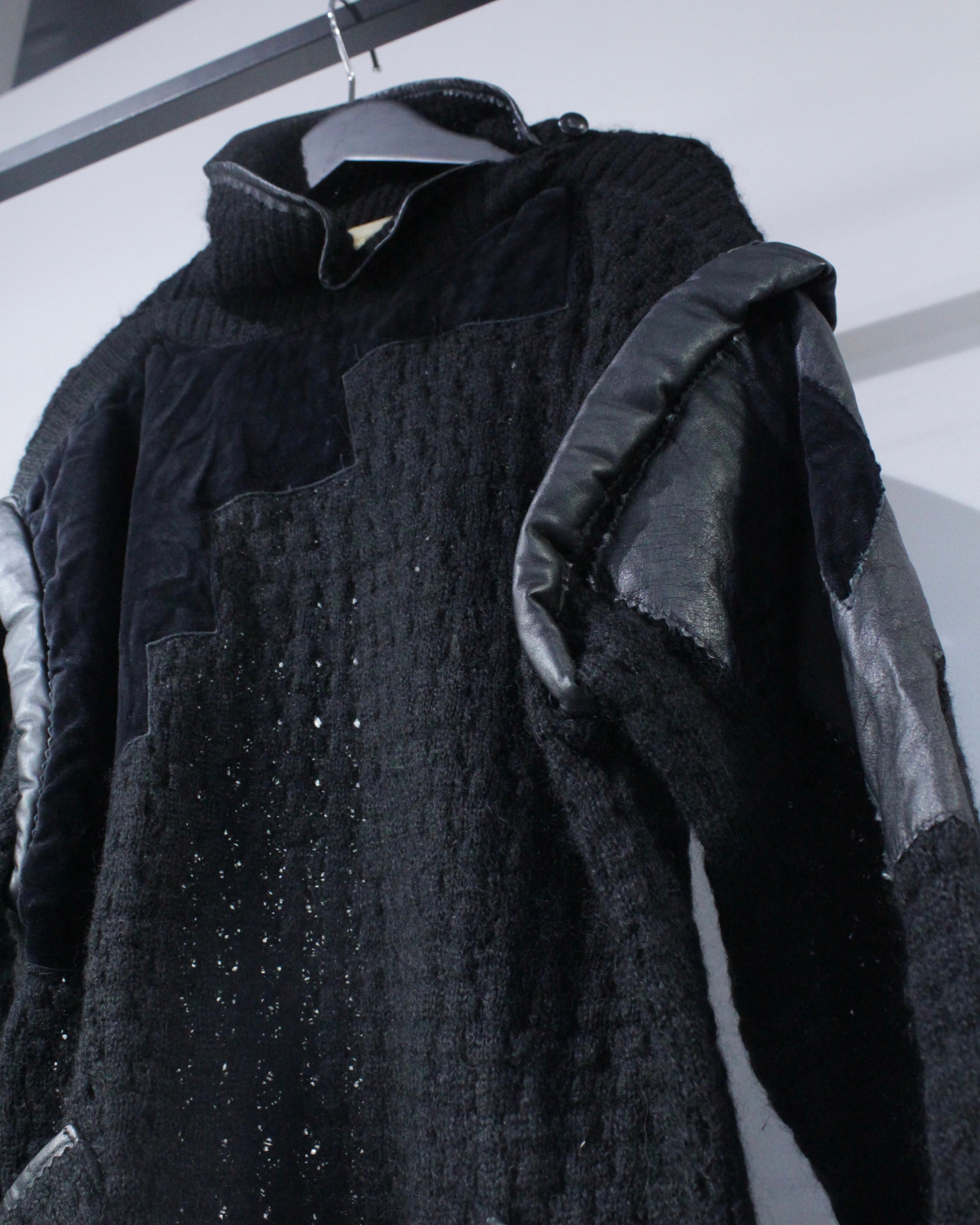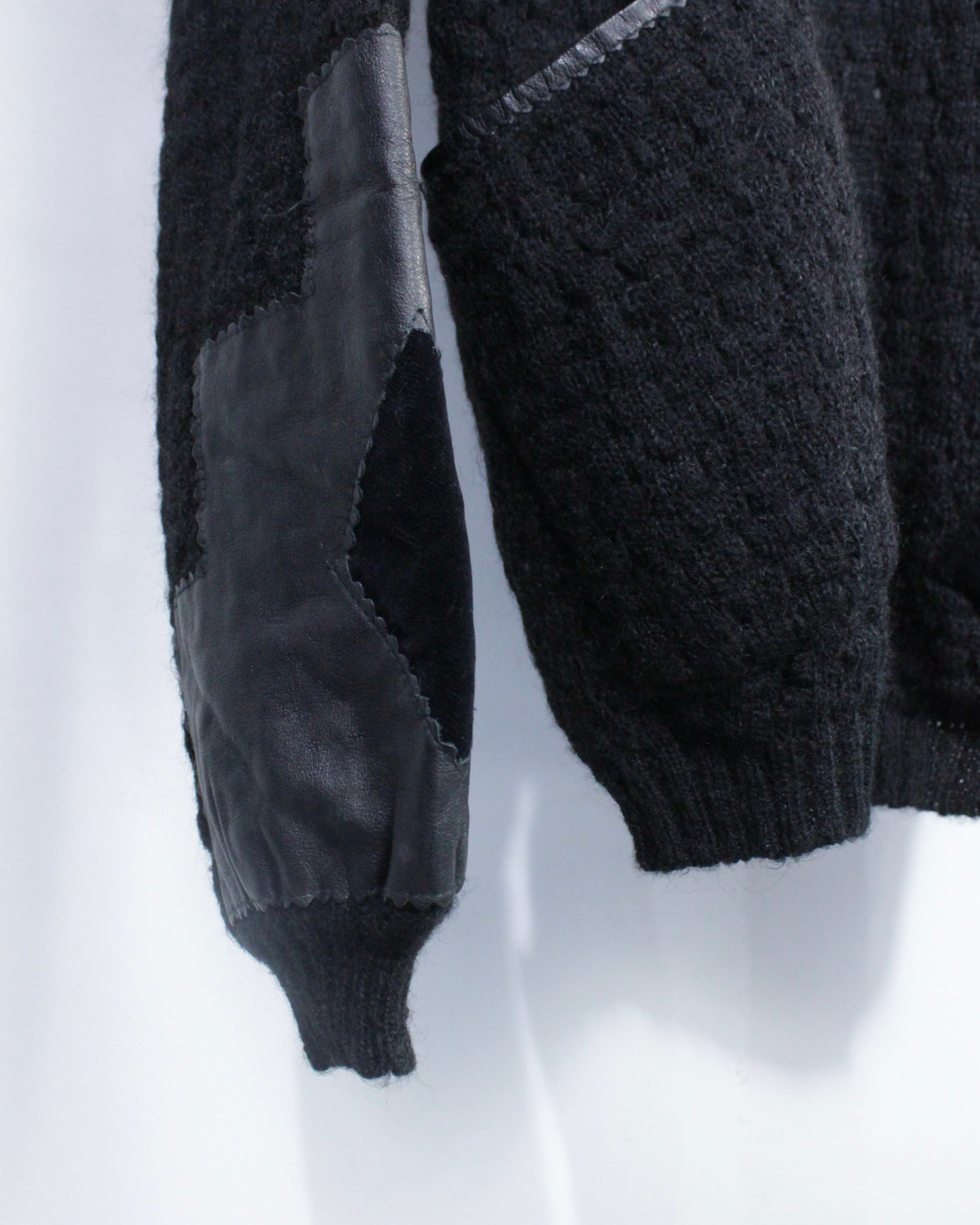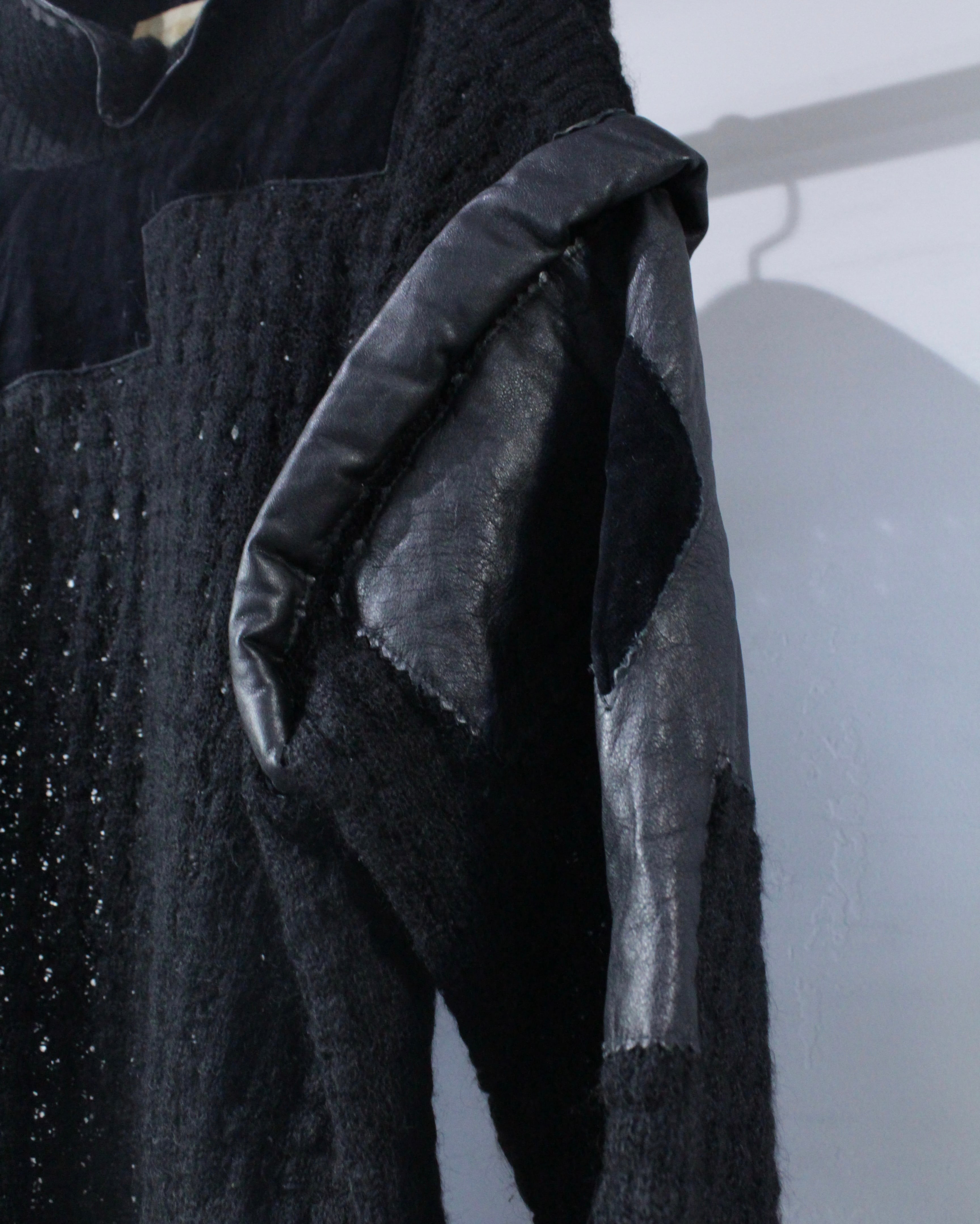 立体感のある黒のモヘア混のニットに、ベロアとレザーを大胆に切り替えたスペシャルな1着。
