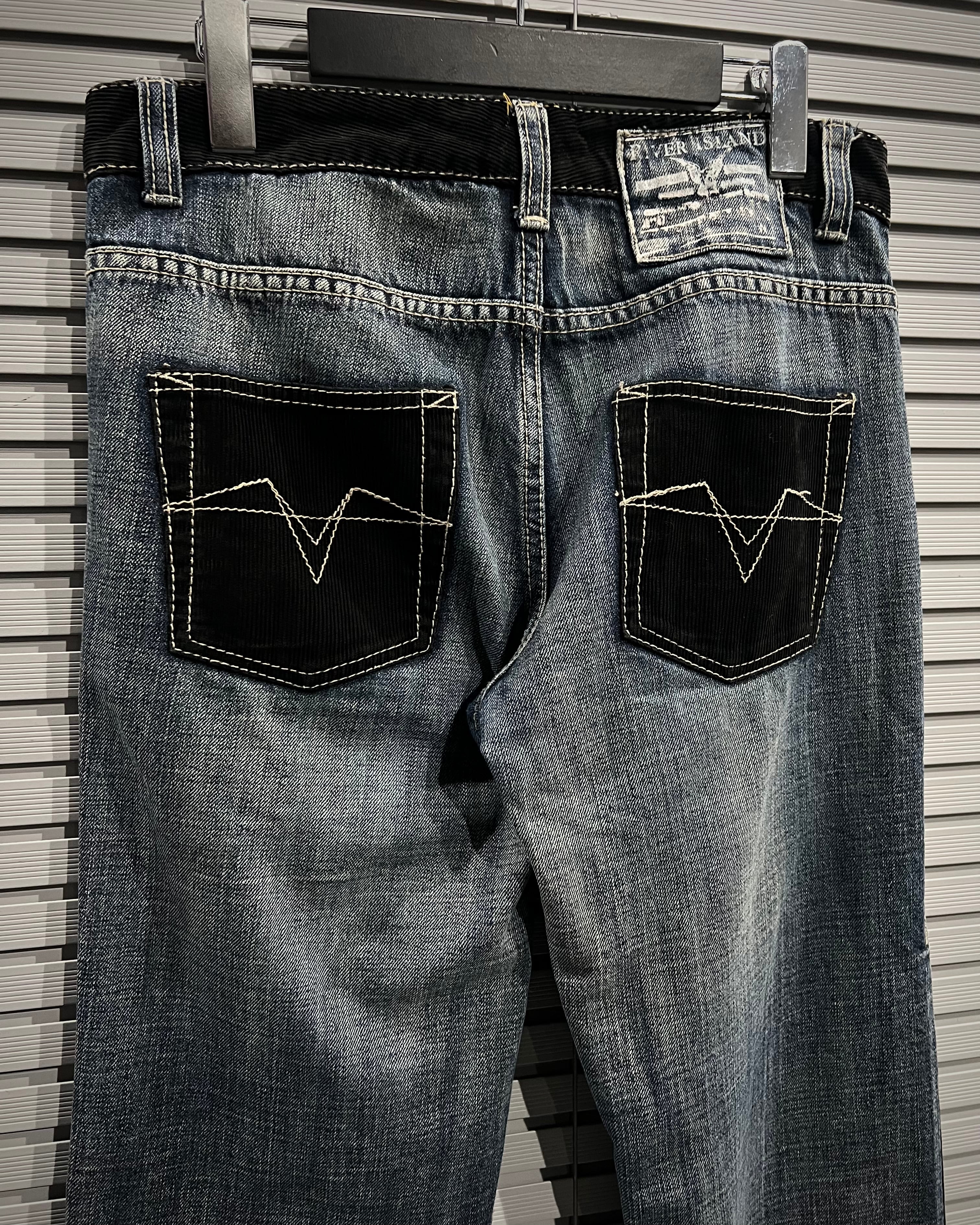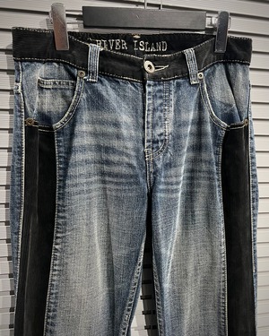 まず目に入るのは、大胆に走るブラックコーデュロイの切り替えで、デニムのフェードと異素材のコントラストが強く、まさに一点物の存在感を放っています。