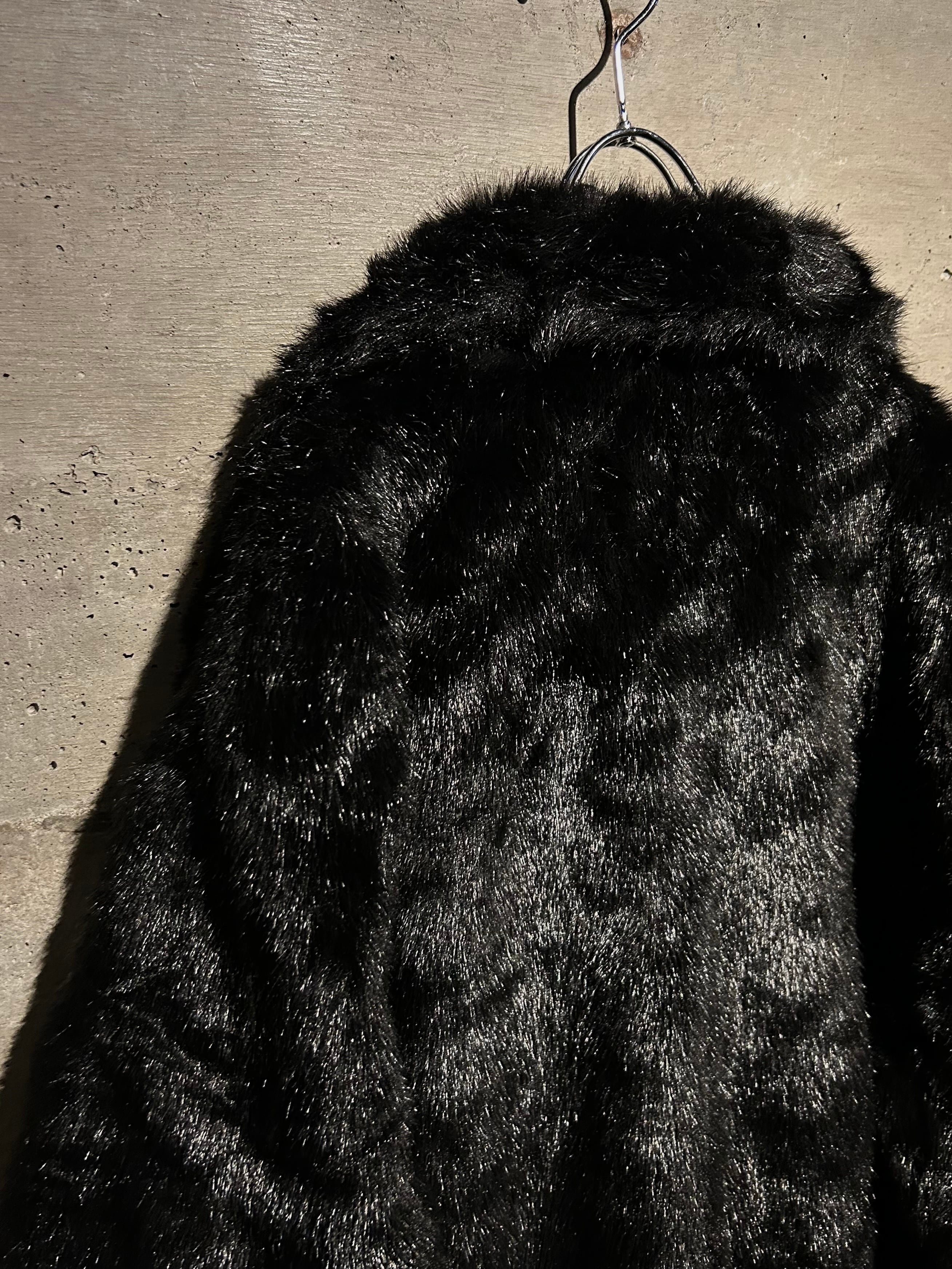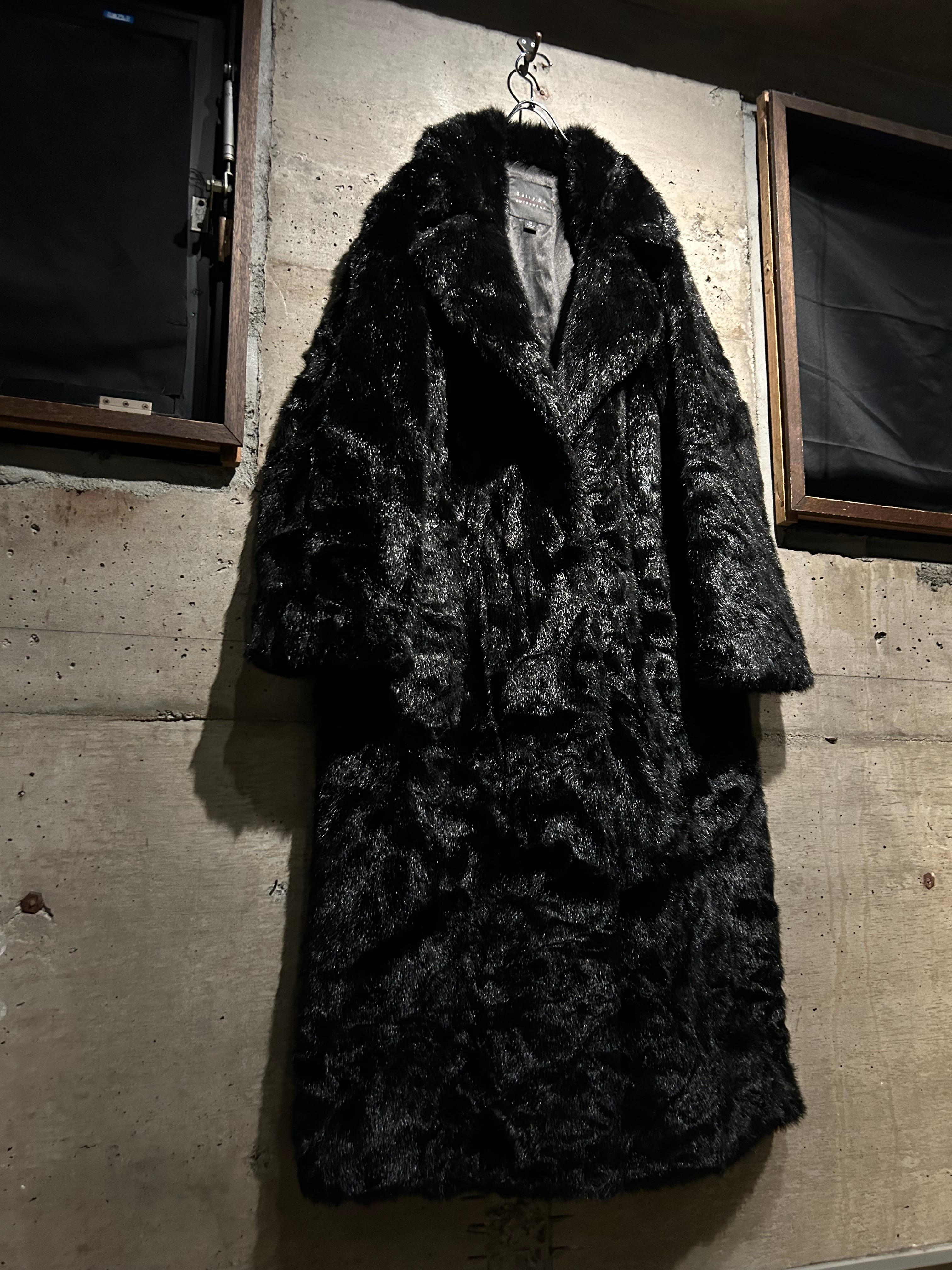 艶のあるブラックフェイクファーを贅沢に使用した、存在感抜群のスーパーロングコート。