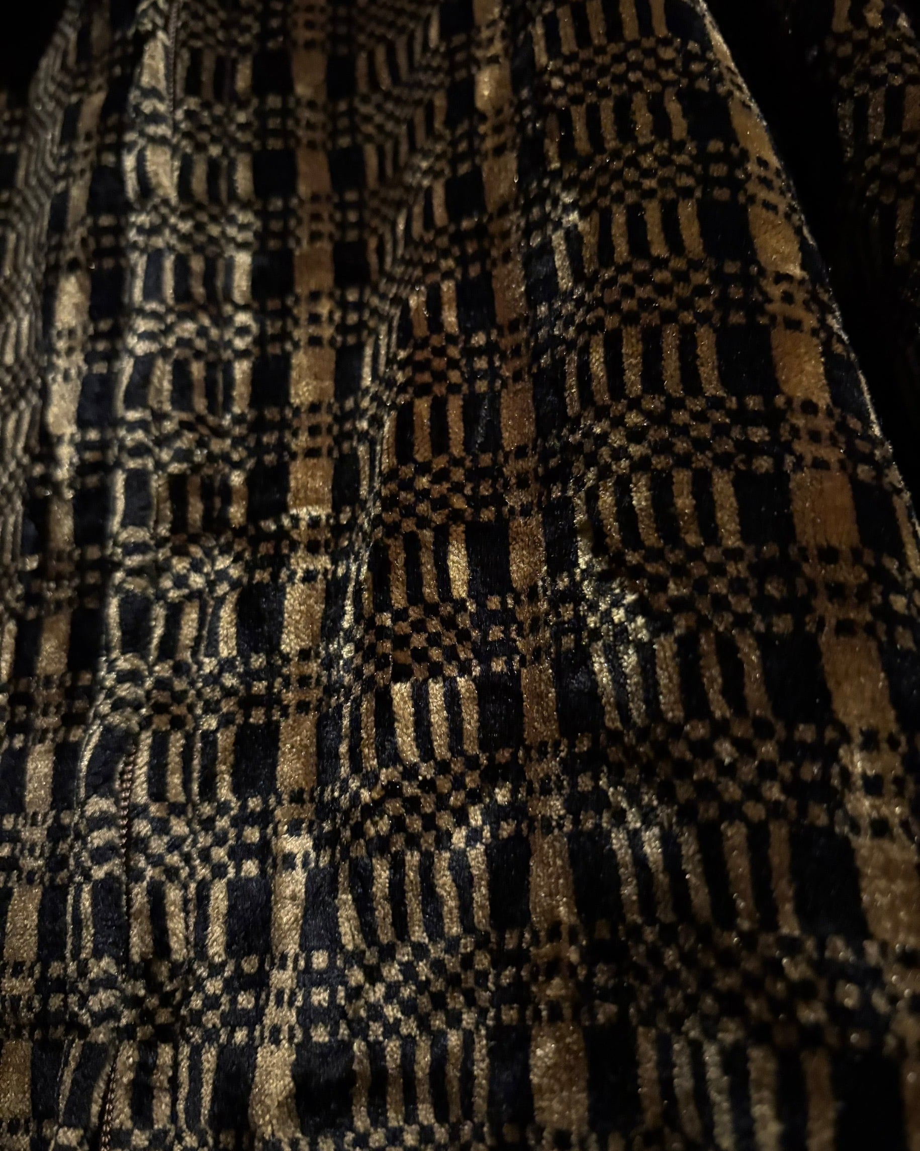 ベルベット特有の深い光沢に、緻密な幾何学柄が重なり生まれる圧倒的な立体感が魅力で、唯一無二の存在感を放つ1着です。