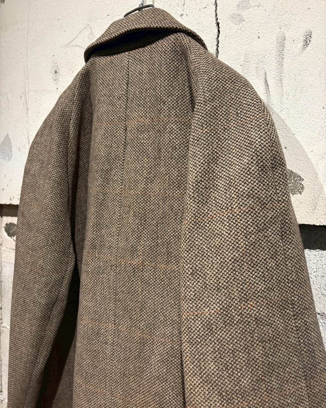 近づくと分かる細かな織り柄が美しく、ブラウン、ベージュを基調にほんの少し混ざるオレンジがツイードの豊かな表情を引き出し、無地では出せない奥行きをプラス。スコティッシュツイードならではの深みのある生地が堪りません、、、