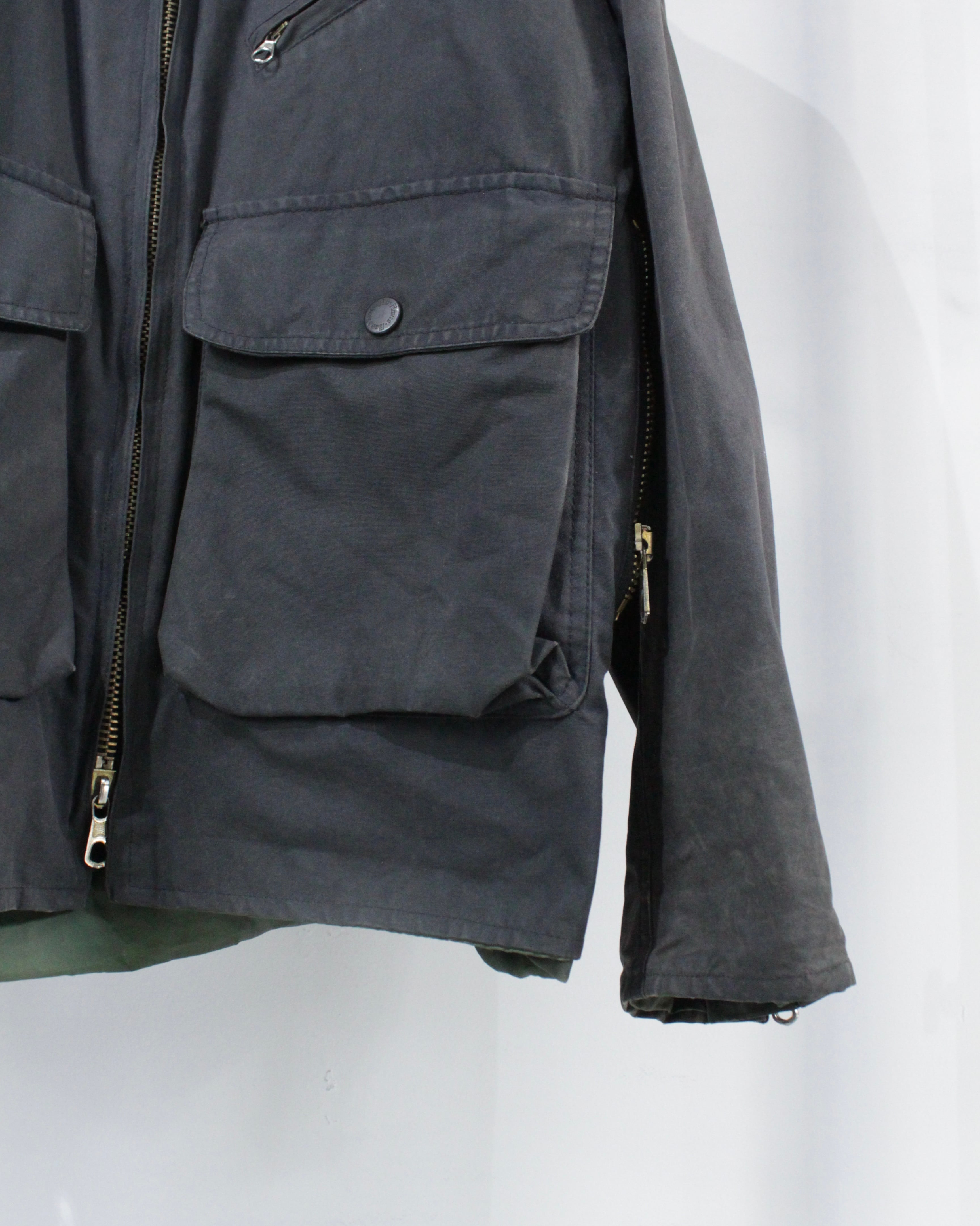 コーデュロイの襟、リングジップ、胸の斜めジップポケット、マチ付きの大型フラップポケット、チンストラップなど、ハンティング由来のディテールが随所に詰め込まれたデザインながら、タウンユースでもハマるバランス感が◎