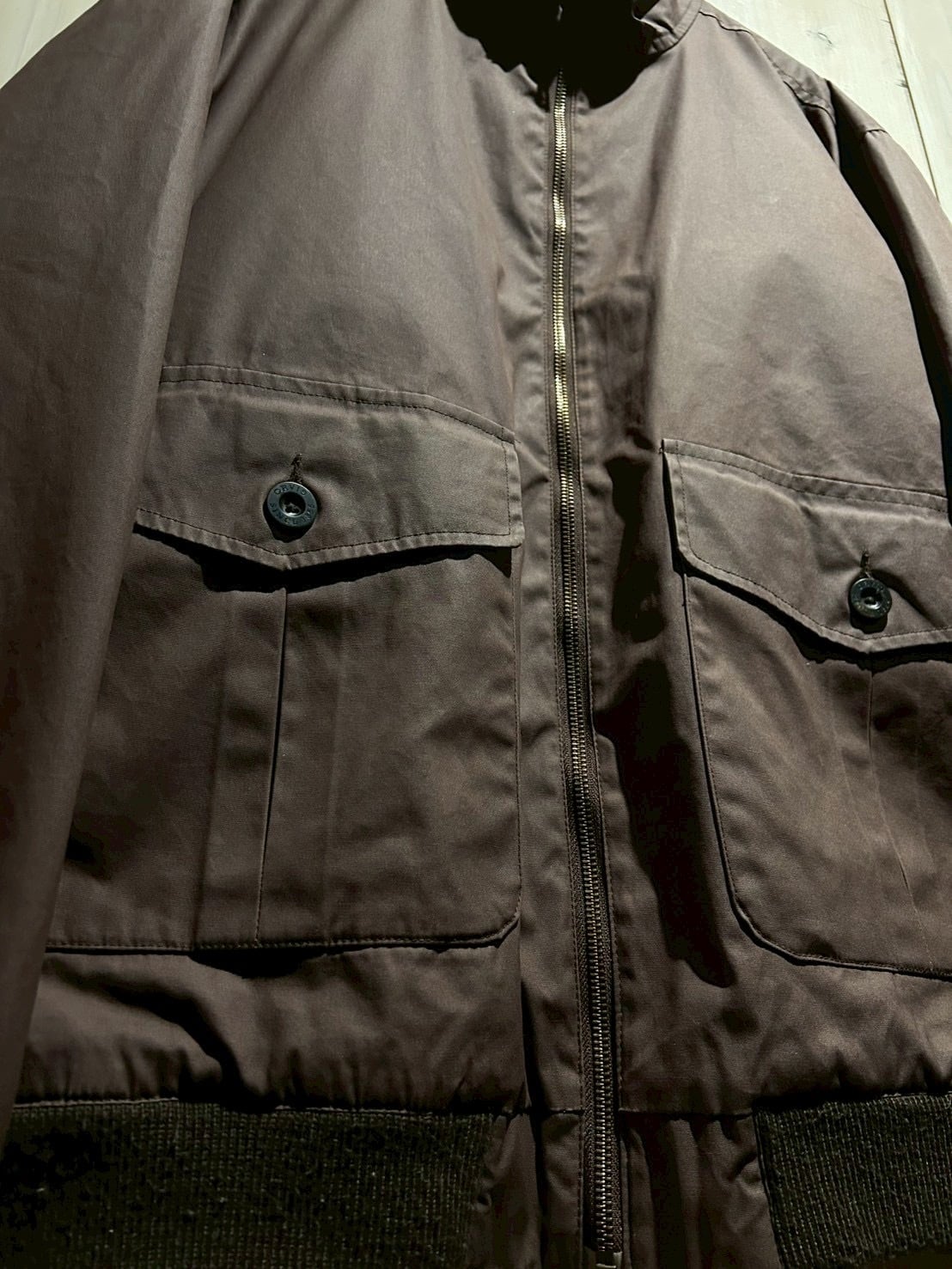 フロントには大ぶりのフラップポケットを2つ配置し、首元はスタンドカラーで仕上げた、ミニマルながら渋さ漂う1着。