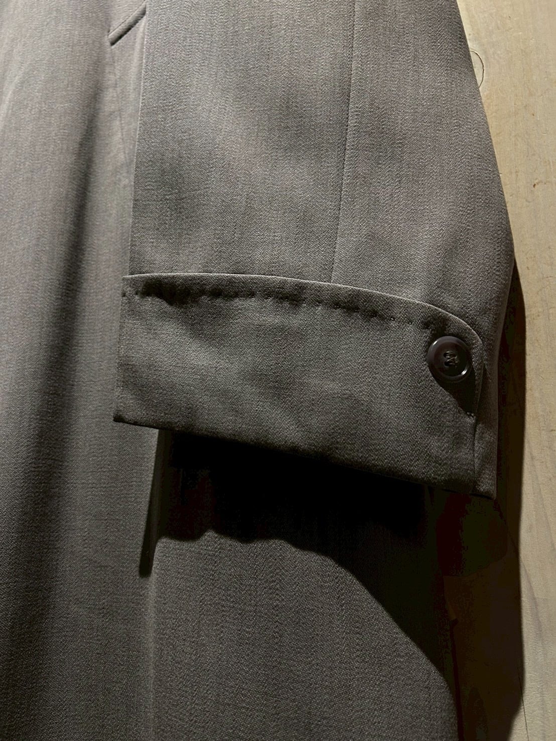 素材には当時のドレスウェアを象徴するウールギャバジンを採用。ぎゅっと高密度に織り上げられた生地特有のしっとりとした落ち感と控えめな光沢が素晴らしく、動いた瞬間に生まれる滑らかなドレープが現行とはまったく違う表情を見せてくれます。
